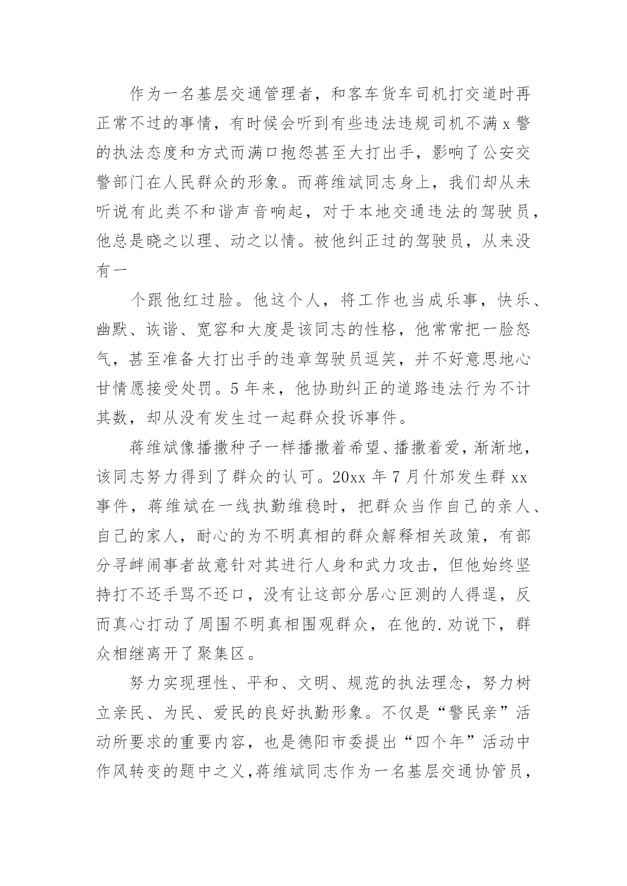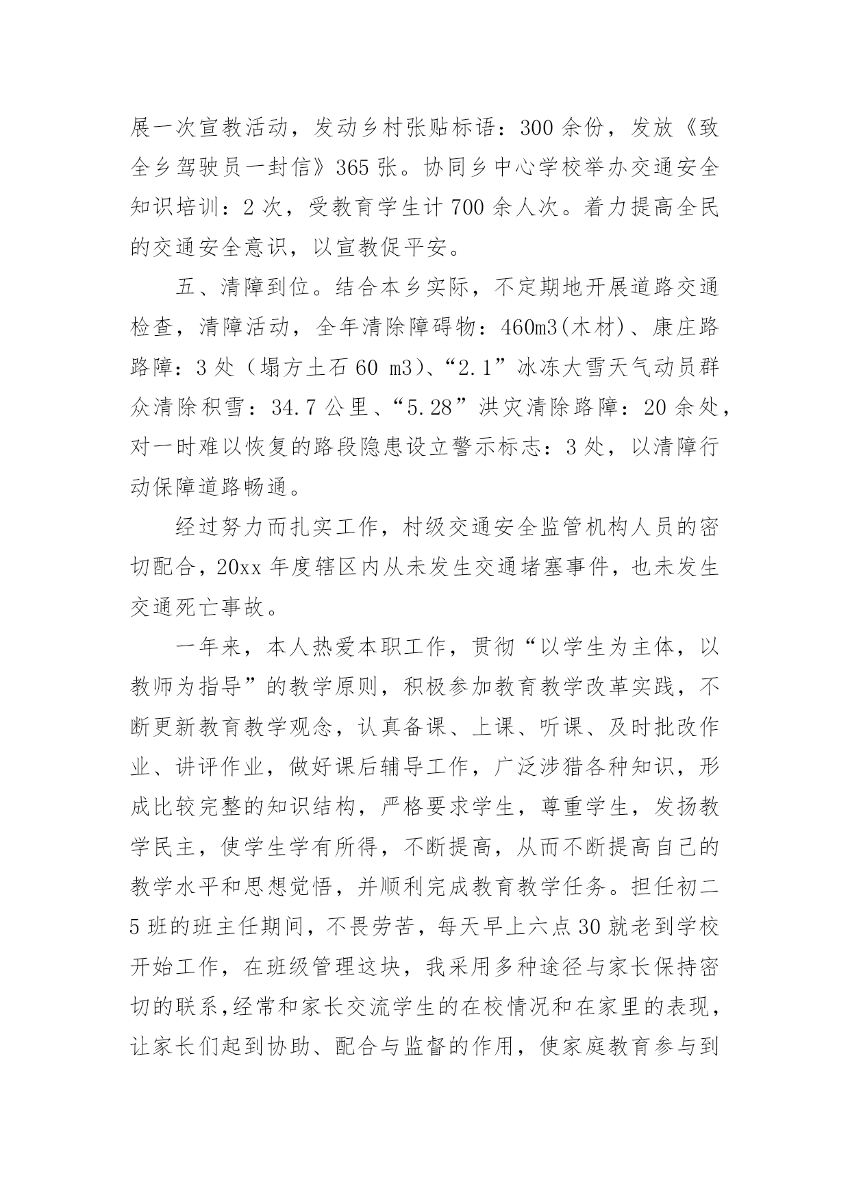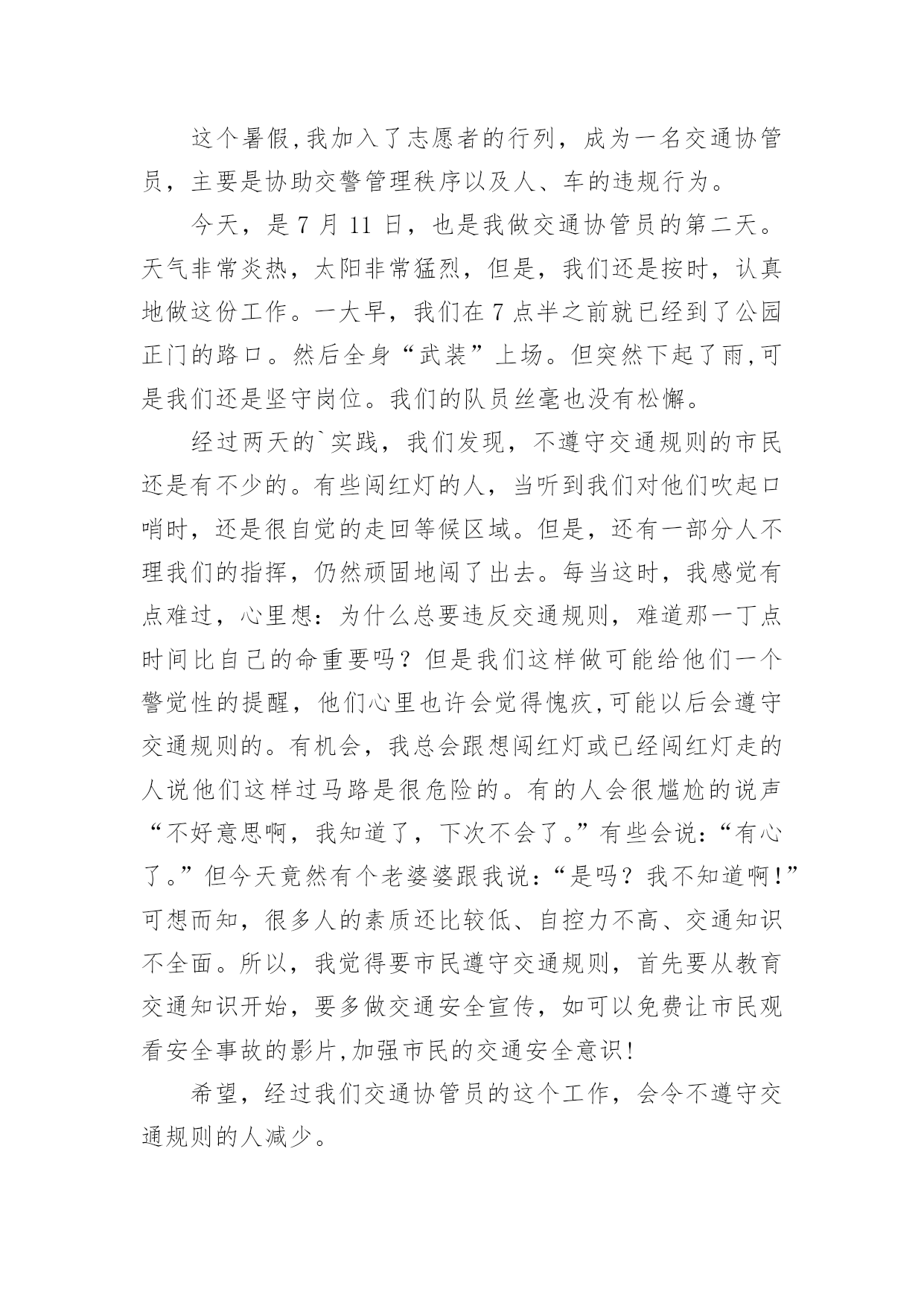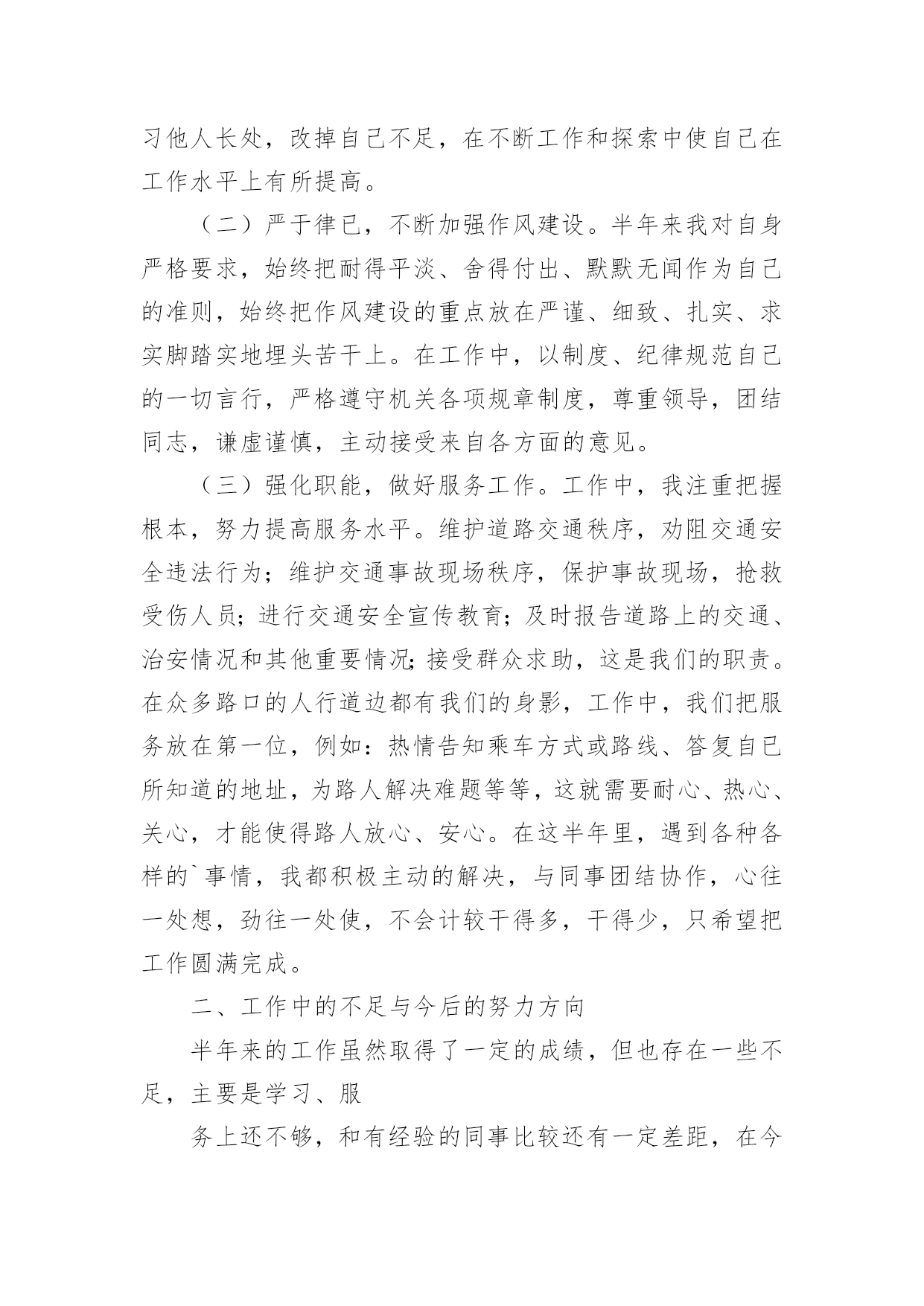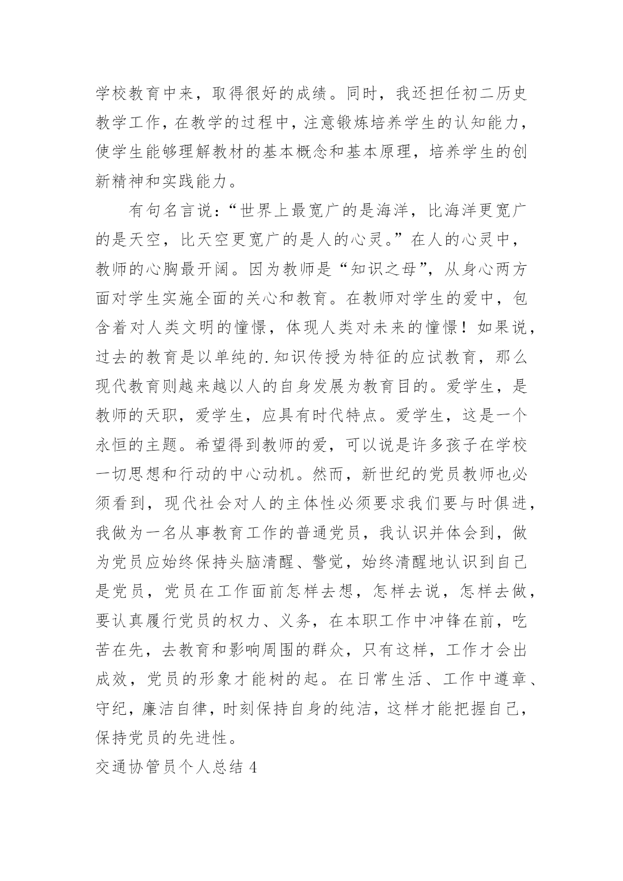 交通协管员个人总结交通协管员个人总结集合11篇总结是事后对某一时期、某一项目或某些工作进行回顾和分析,从而做出带有规律性的结论,它能使我们及时找出错误并改正,让我们抽出时间写写总结吧。那么总结有什么格式呢?以下是小编为大家整理的交通协管员个人总结,供大家参考借鉴,希望可以帮助到有需要的朋友。交通协管员个人总结1眨眼间,任职交通协管员工作已有半年。回首20xx年的工作历程,我经历了许多没有接触的事物和事情,也在实际的工作中,学习到了人与人之间的交流和沟通。这段时间里,在部门领导的带领下取得了一些成绩,具体工作汇报如下:一、工作表现(一)强化形象,提高自身素质。为做好交通协管员的工作,我坚持严格要求自己,注重以身作则,以诚待人,一是爱岗敬业讲奉献。我正确认识自身的工作和价值,正确处理苦与乐,得与失、个人利益和集体利益的关系,坚持甘于奉献、诚实敬业,二是锤炼自身讲提高。经过半年的学习和锻炼,我在岗位上能严格按照交通协管员的水平来衡量自己,遵守各项规章制度,履行好交通协管员的各项职责。细心学习他人长处,改掉自己不足,在不断工作和探索中使自己在工作水平上有所提高。(二)严于律已,不断加强作风建设。半年来我对自身严格要求,始终把耐得平淡、舍得付出、默默无闻作为自己的准则,始终把作风建设的重点放在严谨、细致、扎实、求实脚踏实地埋头苦干上。在工作中,以制度、纪律规范自己的一切言行,严格遵守机关各项规章制度,尊重领导,团结同志,谦虚谨慎,主动接受来自各方面的意见。(三)强化职能,做好服务工作。工作中,我注重把握根本,努力提高服务水平。维护道路交通秩序,劝阻交通安全违法行为;维护交通事故现场秩序,保护事故现场,抢救受伤人员;进行交通安全宣传教育;及时报告道路上的交通、治安情况和其他重要情况;接受群众求助,这是我们的职责。在众多路口的人行道边都有我们的身影,工作中,我们把服务放在第一位,例如:热情告知乘车方式或路线、答复自已所知道的地址,为路人解决难题等等,这就需要耐心、热心、关心,才能使得路人放心、安心。在这半年里,遇到各种各样的`事情,我都积极主动的解决,与同事团结协作,心往一处想,劲往一处使,不会计较干得多,干得少,只希望把工作圆满完成。二、工作中的不足与今后的努力方向半年来的工作虽然取得了一定的成绩,但也存在一些不足,主要是学习、服务上还不够,和有经验的同事比较还有一定差距,在今后工作中,我一定认真总结经验,克服不足,努力把自己交通协管员的岗位站得更好。为了我们的生命安全,为了街道交通的畅通。交通协管员虽然是一个普普通通的工作。在每个城市,都可以见到协管员的身影。在今后的工作中,我将发扬成绩,克服不足,努力工作,保持优点,改正缺点,以对工作、对事业高度负责的态度,脚踏实地,尽职尽责地做好各项工作,充分体现自己的人生价值,为社会美好的明天尽一份力。不辜负领导和同志们对我的期望。交通协管员个人总结2蒋维斌,男,28岁,汉族,中江县公安局交通警察大队二中队x警,打知事起他便立志走进警营。20xx年从陕西省汉中市武警部队退伍后,带着这样的美好憧憬,走进了中江县公安局交警大队二中队。对待工作一丝不苟、对待群众认真负责,谈起蒋维斌,大家都为他吃苦耐劳,爱岗敬业,一心为民所津津乐道。交警工作紧张繁琐、枯燥乏味,耐严寒、顶酷暑、冒风雪,而x警又是长期冲刺在第一线,一年365天,但凡有执勤任务,他总是提前到岗。交警执勤形象是城市形象的一个小缩影,从执勤的一姿一势,到服务的一言一行,蒋维斌都严格要求自己,无论严寒还是酷暑,蒋维斌同志都着装整齐,精神饱满的在自己的岗位上默默的为交通管理事业做贡献,为城市形象和公安队伍形象建设做贡献。作为一名基层交通管理者,和客车货车司机打交道时再正常不过的事情,有时候会听到有些违法违规司机不满x警的执法态度和方式而满口抱怨甚至大打出手,影响了公安交警部门在人民群众的形象。而蒋维斌同志身上,我们却从未听说有此类不和谐声音响起,对于本地交通违法的驾驶员,他总是晓之以理、动之以情。被他纠正过的驾驶员,从来没有一个跟他红过脸。他这个人,将工作也当成乐事,快乐、幽默、诙谐、宽容和大度是该同志的性格,他常常把一脸怒气,甚至准备大打出手的违章驾驶员逗笑,并不好意思地心甘情愿接受处罚。5年来,他协助纠正的道路违法行为不计其数,却从没有发生过一起群众投诉事件。蒋维斌像播撒种子一样播撒着希望、播撒着爱,渐渐地,该同志努力得到了群众的认可。20xx年7月什邡发生群xx事件,蒋维斌在一线执勤维稳时,把群众当作自己的亲人、自己的家人,耐心的为不明真相的群众解释相关政策,有部分寻衅闹事者故意针对其进行人身和武力攻击,但他始终坚持打不还手骂不还口,没有让这部分居心叵测的人得逞,反而真心打动了周围不明真相围观群众,在他的.劝说下,群众相继离开了聚集区。努力
