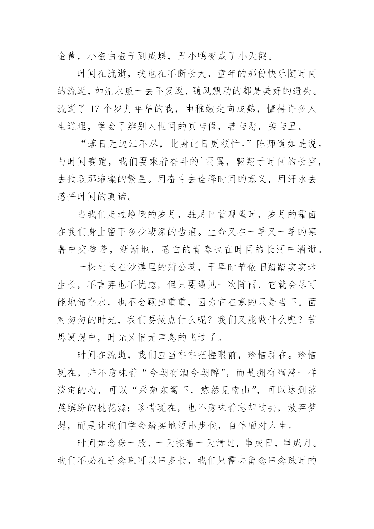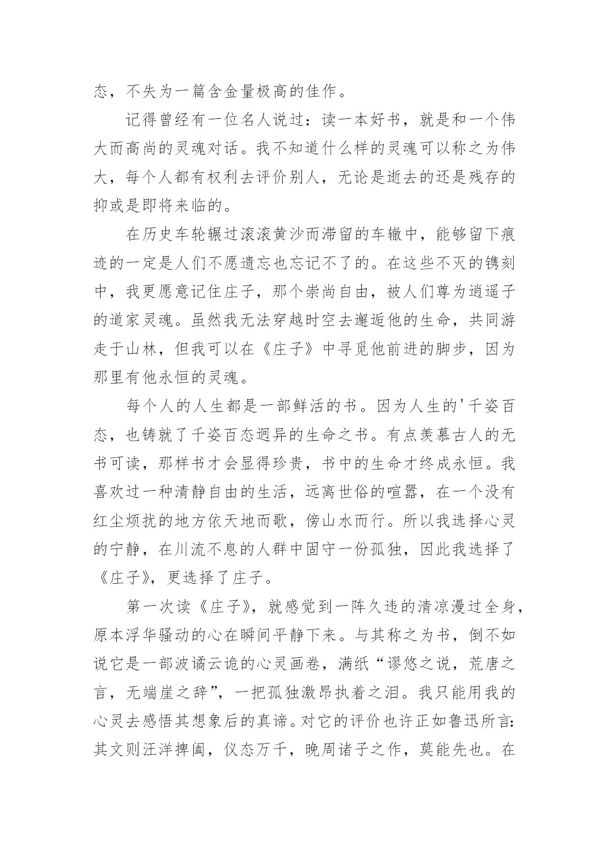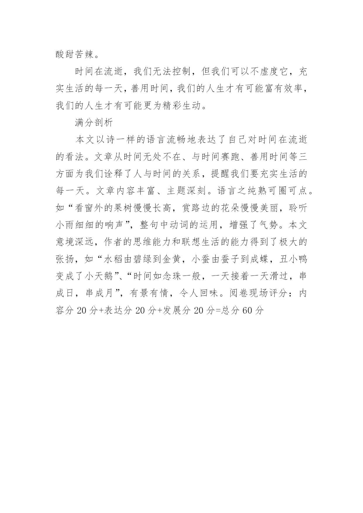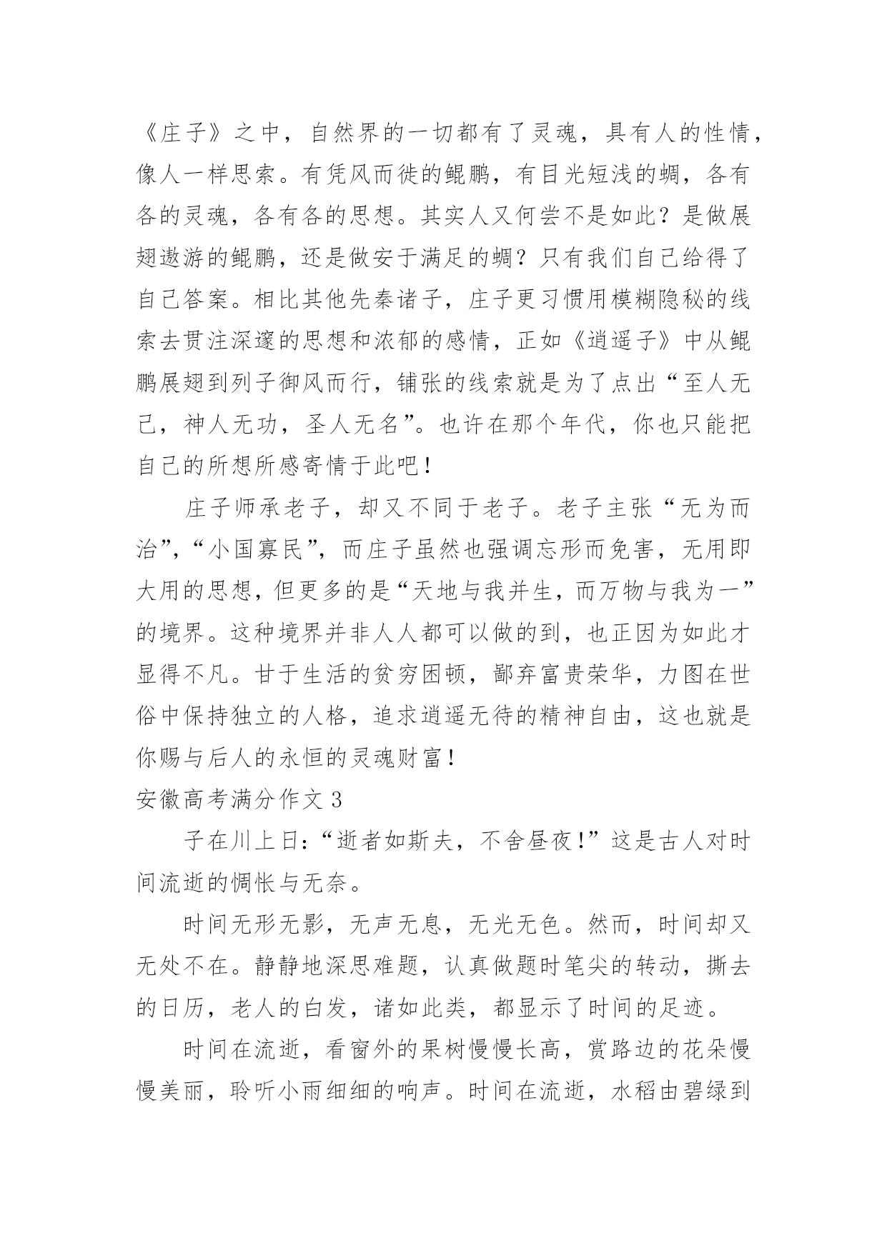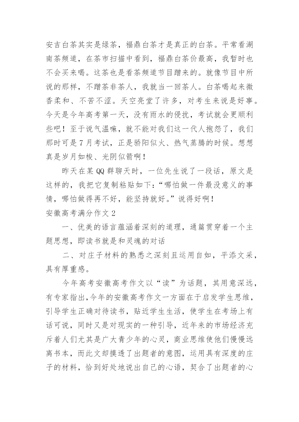 安徽高考满分作文安徽高考满分作文在平时的学习、工作或生活中,大家都有写作文的经历,对作文很是熟悉吧,作文根据写作时限的不同可以分为限时作文和非限时作文。那么一般作文是怎么写的呢?下面是小编为大家整理的安徽高考满分作文,欢迎大家分享。安徽高考满分作文1宅在家里几天了,本想下午去图书馆的。可瞧着这阴沉沉的天,心想何必呢?我的问题应该不是待在家里不出门,而似乎是没有一个深交的朋友吧!图书馆人多也是没用的。我似乎总想往人多的地方凑,上网也是如此,哪里人气旺就往哪里去,像什么微博、微信、QQ、贴吧,喜欢聊QQ群,但现在却不满足、踏实了。聊QQ群,不想说就看聊,想说了就说一句,没人聊就只有不说话了,哪能想聊就聊?聊的时候,也就是插科打诨,调口味。有个茶叶店主建的微信群里,有个大学教授(我叫他教授他没否认),没聊多久就向我卖起了茶壶。可我的问题又是因为没有深交的朋友吗?又到哪里去找深交的朋友呢?大学同学都在微信群里,每天或者早上,或者晚上,有时候就没有,群主读报,若干则经济新闻后,一段“心灵闪点”,鼓舞群友人心,抚慰同学心灵。读完报后的就是几个表情,有时候是搞笑视频,或者分享的链接。仅此而已,我每天就是去发个表情签到。也许我的问题是没有一件坚持做下去的事情。我坚持阅读有5年了,也许这还不够,也许博客要坚持写下去。想到这里,我在床上躺不下去了。吃过午饭,我要小憩一会。有时候却睡了两个小时。今天躺了不到半小时,我爬了起来,图书馆也不去了,打开电脑写博客。现在总说互联网+,可以说互联网创造了宅生活。比如这博客,就是互联网的产物,是自媒体。我在想我宅在家里都干些什么?除了看书、看电视,就是上网了。上网除了聊天就是看新闻,发帖回帖,分享链接。我曾经想,我要放弃宅生活,可我想到能去的`地方就只剩下图书馆了,于是有些日子早上吃过早饭,我带着纸笔,还有一杯茶,泡在图书馆。明天是周一,新的一周又开始了,对我来说,也是如此。那么明天我该干点什么呢?上午、下午、晚上,分为三个时段,看书占去一个时段,如果泡图书馆再占去一个时段,那还有一个时段可以让我泡在网上。泡图书馆也是看书,是不是可以干点别的?我有时候为这为那感到纠结。现在我想我该干的事应该是阅读、写作、社交。今天写了博客,明天恐怕还得来看看。而我又想和网友聊聊天,再加上看书的时间,明天竟不用出门了!如果有时间而且天气允许的话,出门也该散散步,身体健康也重要。那么,人的一生什么最重要?是他的社会关系吗?现在喝的茶是白茶,可不是安吉白茶,而是福鼎白茶。安吉白茶其实是绿茶,福鼎白茶才是真正的白茶。平常看湖南茶频道,在茶市扫描中看到,福鼎白茶价最高,我暂时也不会买来喝。这茶也是看茶频道节目蹭来的。就像节目中所说的那样,不蹭茶非茶人,我就当一回茶人。白茶喝起来微香柔和、不苦不涩。天空亮堂了许多,对考生来说是好事。今天是今年高考第一天,没有雨水的侵扰,考试就会更顺利些吧!至于说气温嘛,就不能对我们这一代人抱怨了,我们那时可是7月考试,正是骄阳似火、热气蒸腾的时候。想想真是岁月如梭、光阴似箭啊!昨天在某QQ群聊天时,一位先生说了一段话,原文是这样的,我把它复制粘贴如下:“哪怕做一件最没意义的事情,哪怕做得再不好,能坚持就好。”说得好啊!安徽高考满分作文2一、优美的语言蕴涵着深刻的道理,通篇贯穿着一个主题思想,即读书就是和灵魂的对话二、对庄子材料的熟悉之深刻且运用自如,平添文采,具有厚重感。今年高考安徽高考作文以“读”为话题,其用意深远,有专家指出,今年的安徽高考作文一方面在于启发学生思维,引导学生正确对待读书,贴近学生生活,使学生在考场上有话可说,同时又是对现实的一种引导,近年来的市场经济充斥着人们尤其是广大青少年的心灵,商业思维使他们慢慢远离书本,而此文却摸透了出题者的意图,运用具有深度的庄子的材料,恰到好处地说出自己的心语,契合了出题者的心态,不失为一篇含金量极高的佳作。记得曾经有一位名人说过:读一本好书,就是和一个伟大而高尚的灵魂对话。我不知道什么样的灵魂可以称之为伟大,每个人都有权利去评价别人,无论是逝去的还是残存的抑或是即将来临的。在历史车轮辗过滚滚黄沙而滞留的车辙中,能够留下痕迹的一定是人们不愿遗忘也忘记不了的。在这些不灭的镌刻中,我更愿意记住庄子,那个崇尚自由,被人们尊为逍遥子的道家灵魂。虽然我无法穿越时空去邂逅他的生命,共同游走于山林,但我可以在《庄子》中寻觅他前进的脚步,因为那里有他永恒的灵魂。每个人的人生都是一部鲜活的书。因为人生的'千姿百态,也铸就了千姿百态迥异的生命之书。有点羡慕古人的无书可读,那样书才会显得珍贵,书中的生命才终成永恒。我喜欢过一种清静自由的生活,远离世俗的喧嚣,在一个没有红尘烦扰的地方依天地而歌,傍山水而行。所以我选择心灵的宁静,在川流不息的人群中固守一份孤独,因此我选择了《庄