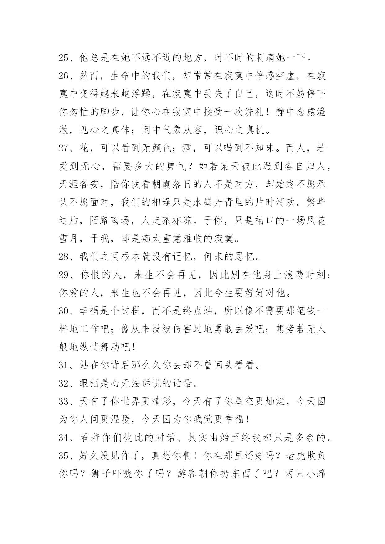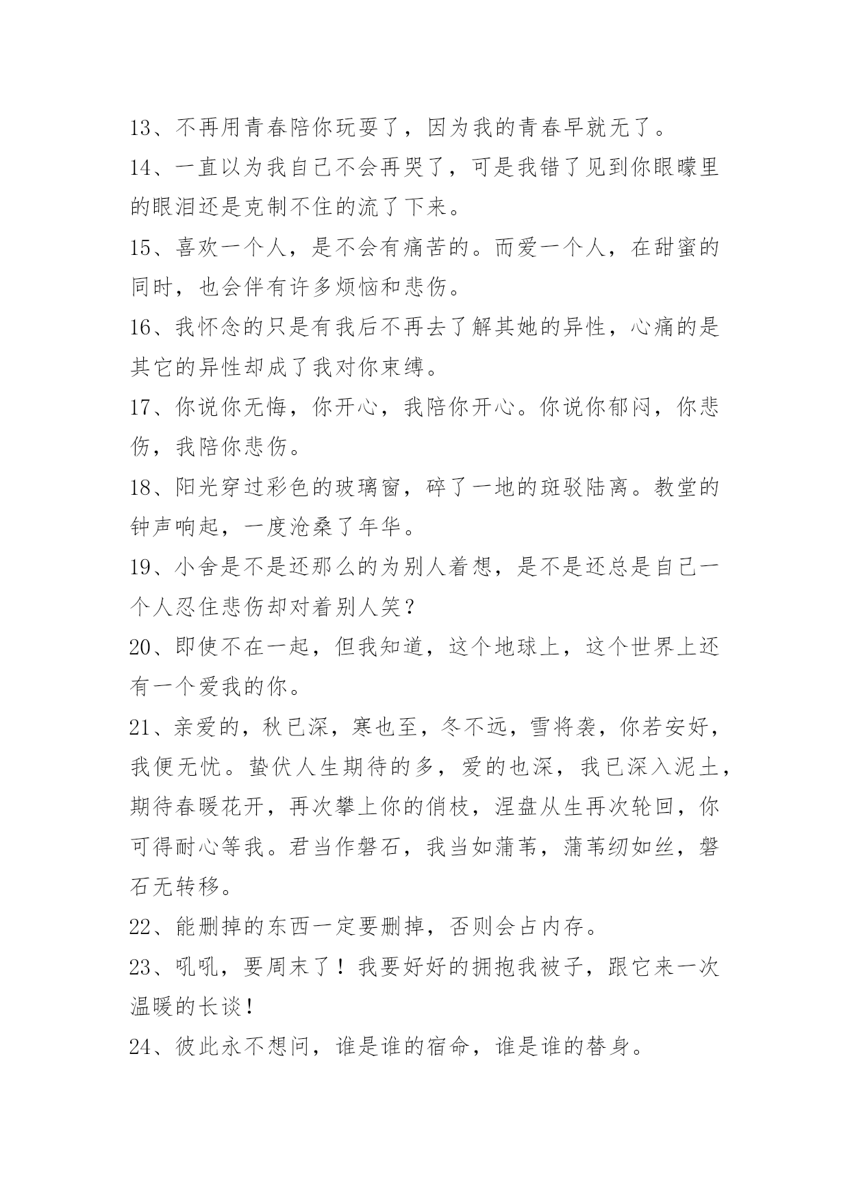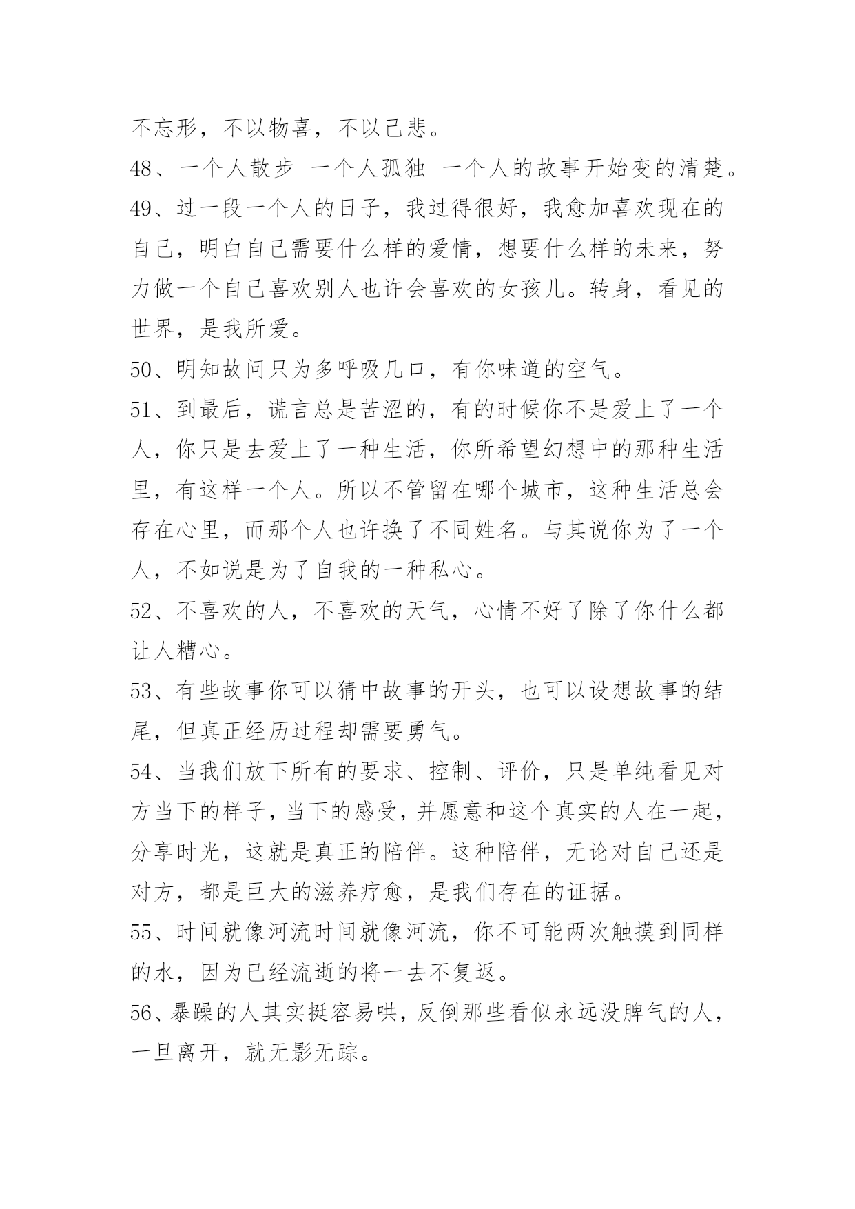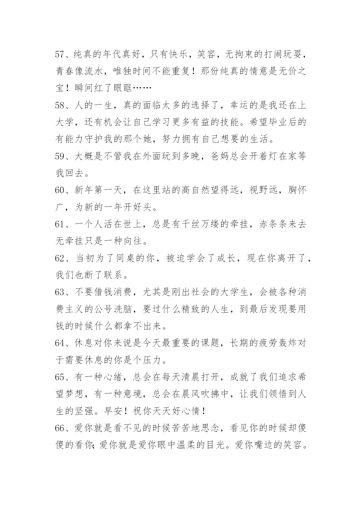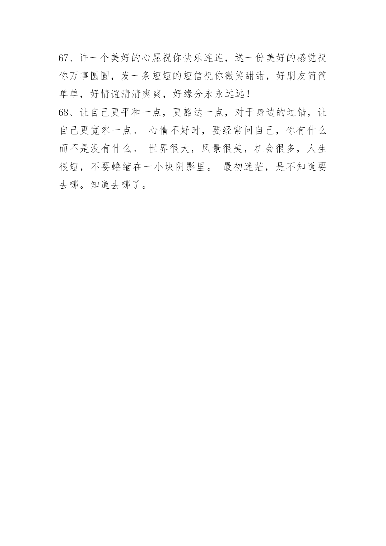 人生的心情语录68条2022年实用的人生的心情语录汇总68条或者离开喧闹的城市,回到大自然中,感受静谧的神奇。是时候告诉自己,停下来,享受一会儿生命。以下是小编为大家整理推荐的人生的心情语录68条,欢迎大家阅读。1、我们都曾有过小小的梦想,在寒冷的岁月中,或放弃,或遗忘,或相信终有一天能看到,梦想和现实交汇时的光芒。2、没有受过伤的人,才会讥笑别人身上的伤痕!3、在孤单的城市里,谁在月光下陪伴着你?我试图温暖一颗心,那冰冷旳回忆却始终是挥之不去。4、我若要走,绝不会回头,因为我深知没人会挽留。5、执着其实是一种负担,甚至是一种苦楚,计较得太多就成了一种羁绊,迷失太久便成了一种痛苦。放弃,不是放弃追求,而是让我们以豁达的心去面对生活。6、许多人爬到了梯子的顶端,发现梯子架错了墙。7、如果我是你的罪,你会与我殊途还是同归。8、刚开始喜欢到不行,后来只剩下不行。9、我不是天上的太阳,没有永恒的光芒照耀你灿烂,我只愿做你身边的一盏灯,熬尽心血,伴你一生!10、如果你们因为异地恋就轻易分手了,千万不要把罪过怪在距离上。11、没有人看不起你,只有你自己抬不起头来。12、我想做你的太阳,可你已经有了整片星空。13、不再用青春陪你玩耍了,因为我的青春早就无了。14、一直以为我自己不会再哭了,可是我错了见到你眼曚里的眼泪还是克制不住的流了下来。15、喜欢一个人,是不会有痛苦的。而爱一个人,在甜蜜的同时,也会伴有许多烦恼和悲伤。16、我怀念的只是有我后不再去了解其她的异性,心痛的是其它的异性却成了我对你束缚。17、你说你无悔,你开心,我陪你开心。你说你郁闷,你悲伤,我陪你悲伤。18、阳光穿过彩色的玻璃窗,碎了一地的斑驳陆离。教堂的钟声响起,一度沧桑了年华。19、小舍是不是还那么的为别人着想,是不是还总是自己一个人忍住悲伤却对着别人笑?20、即使不在一起,但我知道,这个地球上,这个世界上还有一个爱我的你。21、亲爱的,秋已深,寒也至,冬不远,雪将袭,你若安好,我便无忧。蛰伏人生期待的多,爱的也深,我已深入泥土,期待春暖花开,再次攀上你的俏枝,涅盘从生再次轮回,你可得耐心等我。君当作磐石,我当如蒲苇,蒲苇纫如丝,磐石无转移。22、能删掉的东西一定要删掉,否则会占内存。23、吼吼,要周末了!我要好好的拥抱我被子,跟它来一次温暖的长谈!24、彼此永不想问,谁是谁的宿命,谁是谁的替身。25、他总是在她不远不近的地方,时不时的刺痛她一下。26、然而,生命中的我们,却常常在寂寞中倍感空虚,在寂寞中变得越来越浮躁,在寂寞中丢失了自己,这时不妨停下你匆忙的脚步,让你心在寂寞中接受一次洗礼!静中念虑澄澈,见心之真体;闲中气象从容,识心之真机。27、花,可以看到无颜色;酒,可以喝到不知味。而人,若爱到无心,需要多大的勇气?如若某天彼此遇到各自归人,天涯各安,陪你我看朝霞落日的人不是对方,却始终不愿承认不愿面对,我们的相逢只是水墨丹青里的片时清欢。繁华过后,陌路离场,人走茶亦凉。于你,只是袖口的一场风花雪月,于我,却是痴太重意难收的寂寞。28、我们之间根本就没有记忆,何来的思忆。29、你恨的人,来生不会再见,因此别在他身上浪费时刻;你爱的人,来生也不会再见,因此今生要好好对他。30、幸福是个过程,而不是终点站,所以像不需要那笔钱一样地工作吧;像从来没被伤害过地勇敢去爱吧;想旁若无人般地纵情舞动吧!31、站在你背后那么久你去却不曾回头看看。32、眼泪是心无法诉说的话语。33、天有了你世界更精彩,今天有了你星空更灿烂,今天因为你人间更温暖,今天因为你我觉更幸福!34、看着你们彼此的对话、其实由始至终我都只是多余的。35、好久没见你了,真想你啊!你在那里还好吗?老虎欺负你吗?狮子吓唬你了吗?游客朝你扔东西了吧?两只小蹄抓着手机看短信习惯吗?36、我知道我不如你的她,可是我真的很爱你。37、记忆就像铅笔、虽然会渐渐模糊,但并不是没有痕迹……38、对我来说,能够在黑夜里代替阳光的东西,就是信念。39、学会冷血,学会不在乎,该滚滚,不会在乎你们这些人。40、明天就是五一啦,好激动,好不容易放假了,我觉得还是出门游玩游玩比较好吧,出去散散心情,放松放松,等假期结束之后再重新投入到工作当中,如果时间有限的话,可以选择在离家近的地方游玩,总之自己有个愉快的假期。41、你的泪水谁为你擦干?谁帮你打伞安慰你心?烦恼失眠的夜你最怕孤单,你的心事还有谁明白?为什么放手为什么离开,不是说好吗要一辈子相爱世界上其实根本没有感同深受这回事,针不刺到别人身上,他们就不知道有多痛。42、或好或坏的心情,台灯之下,一支笔,一份心情,一杯飘香的咖啡,一颗平静安宁的心——或许这才是生活。43、每天醒来,阳光和你都在,就是我最想要的未来。44、所谓的成长,就是越来越能接受自己本来的样子,但也会努力让自己成为更