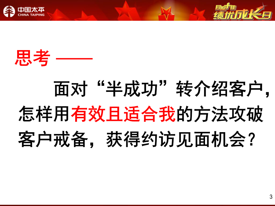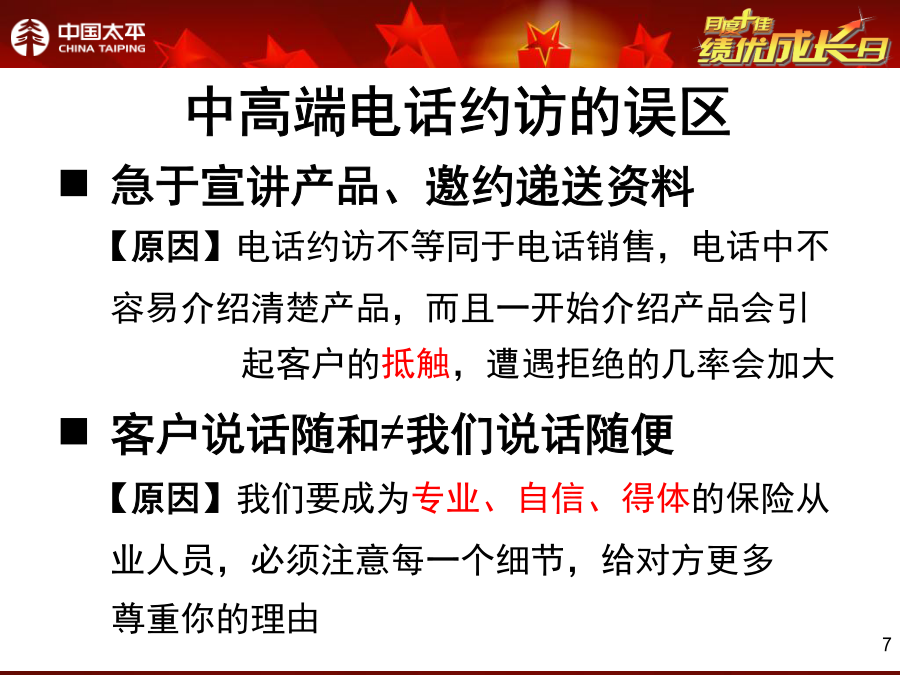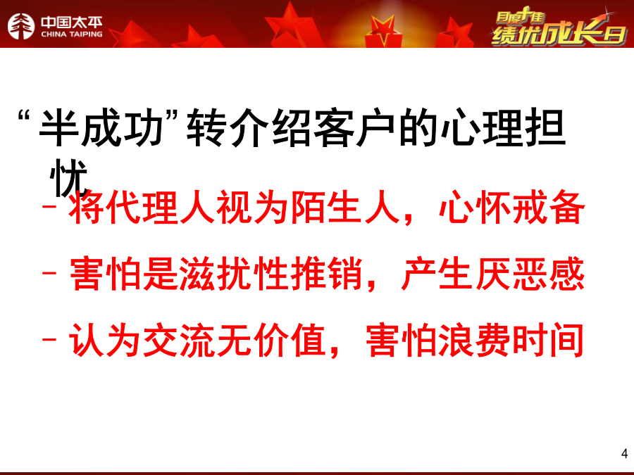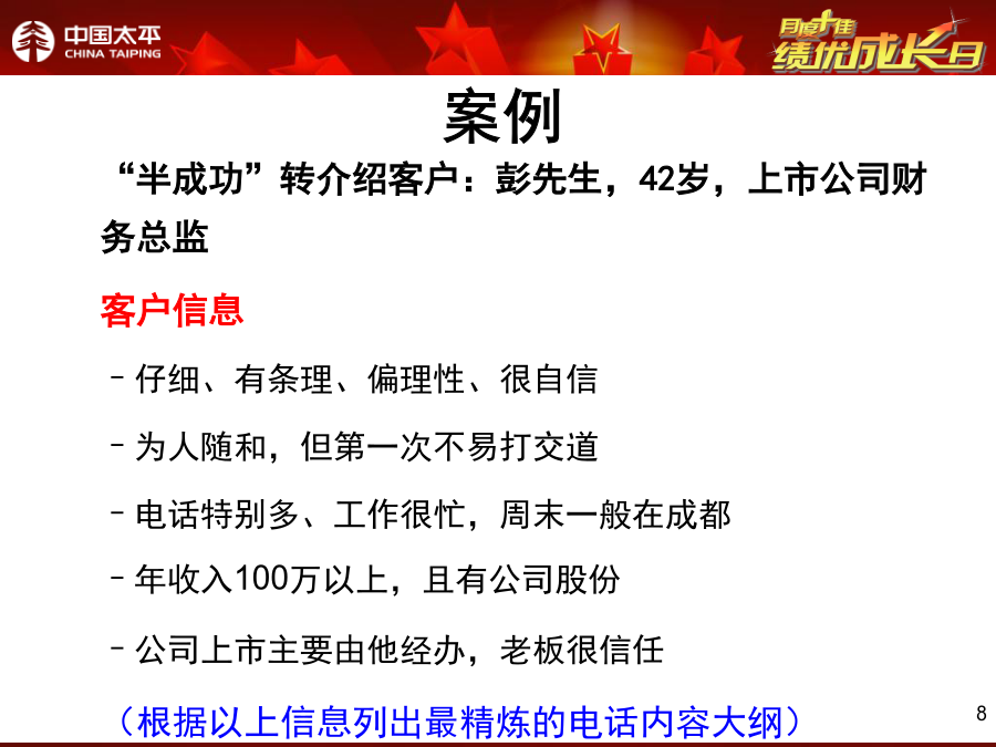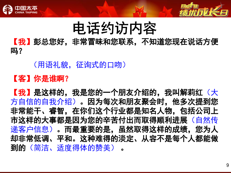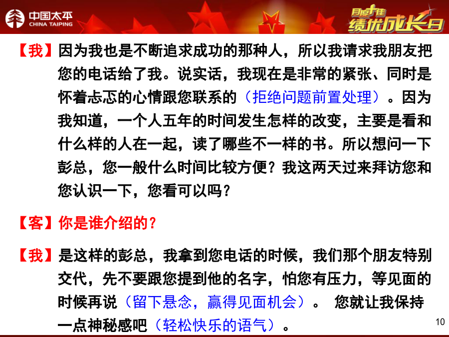 什么是“半成功”转介绍?思考——“半成功”转介绍客户的心理担忧用亲和力营造轻松、愉快的氛围,是打破客户疑虑,拉近距离的有效方法中高端电话约访的要点中高端电话约访的误区案例电话约访内容【我】因为我也是不断追求成功的那种人,所以我请求我朋友把您的电话给了我。说实话,我现在是非常的紧张、同时是怀着忐忑的心情跟您联系的(拒绝问题前置处理)。因为我知道,一个人五年的时间发生怎样的改变,主要是看和什么样的人在一起,读了哪些不一样的书。所以想问一下彭总,您一般什么时间比较方便?我这两天过来拜访您和您认识一下,您看可以吗?【客】你是谁介绍的?【我】是这样的彭总,我拿到您电话的时候,我们那个朋友特别交代,先不要跟您提到他的名字,怕您有压力,等见面的时候再说(留下悬念,赢得见面机会)。您就让我保持一点神秘感吧(轻松快乐的语气)。【客】你是做什么的?【我】我是太平人寿高级理财顾问解莉红。您听说过太平人寿吗?【客】我对保险没有兴趣。【我】太正常了,如果您现在说有兴趣,还会吓我一跳。但是我跟您打电话的前提不是向您卖保险,主要是想跟您认识一下(拒绝问题前置处理),多一个朋友多一条路。不会因为您会不会考虑保险而影响到我们成不成为朋友。而且像您这么聪明能干的人,对您不重要的东西您也不会去考虑,当然未来如果您愿意考虑那另说(拒绝问题前置处理,为将来的销售留下伏笔)。所以我的前提主要还是想和您认识一下,相信我在这个行业从业9年,一定会给您带来价值的。个人感悟