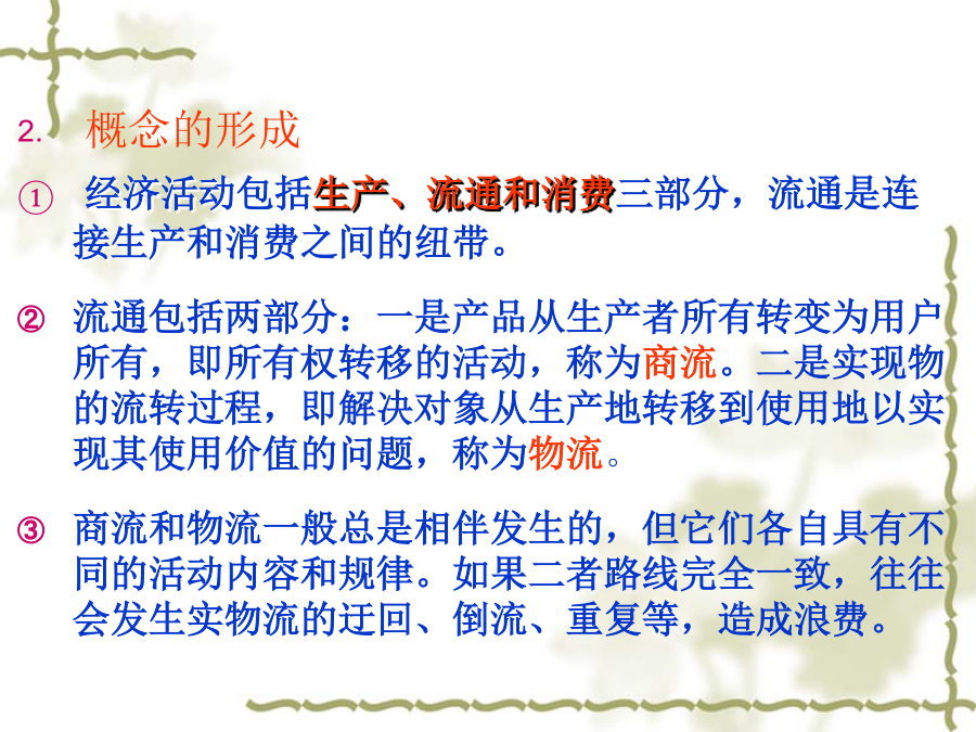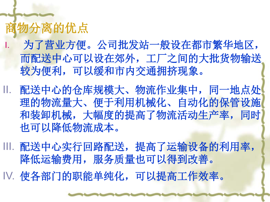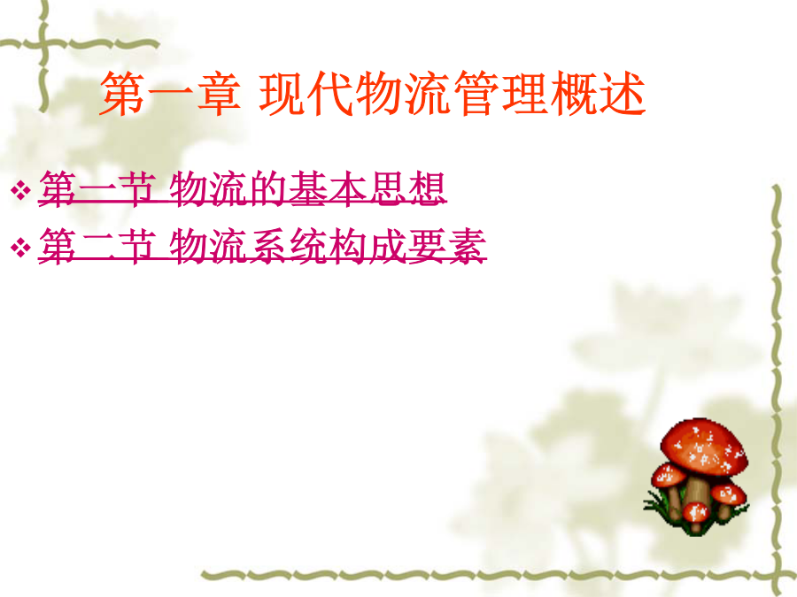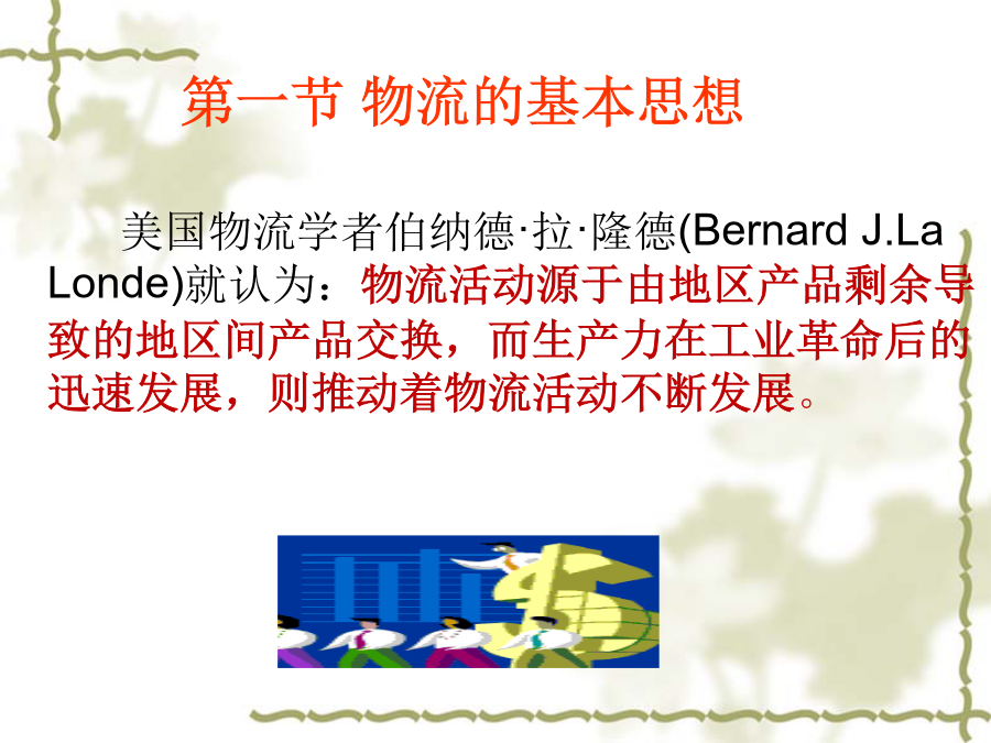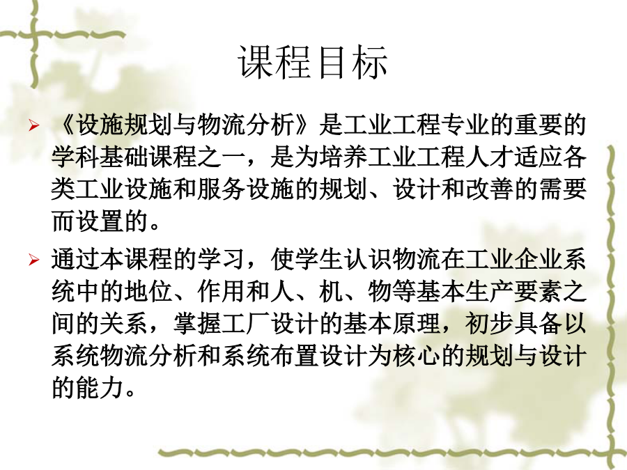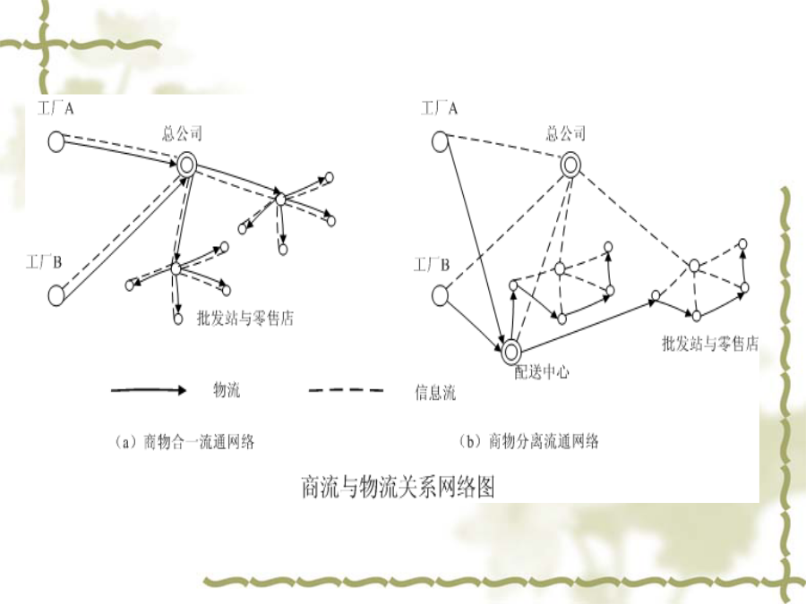 设施规划与物流分析Question课程目标第一章现代物流管理概述第一节物流的基本思想一、物流的定义及分类概念的形成经济活动包括生产、流通和消费三部分,流通是连接生产和消费之间的纽带。流通包括两部分:一是产品从生产者所有转变为用户所有,即所有权转移的活动,称为商流。二是实现物的流转过程,即解决对象从生产地转移到使用地以实现其使用价值的问题,称为物流。商流和物流一般总是相伴发生的,但它们各自具有不同的活动内容和规律。如果二者路线完全一致,往往会发生实物流的迂回、倒流、重复等,造成浪费。商流与物流的互相分离,一般地说有以下几种情况:商流在前,物流在后;物流是在商流之后完成的。(商品的预购)物流在前,商流在后。商品的赊销就属于这种情况。。商流迂回,物流直达。例如在商流中,产品的所有权多次易手,但产品实体可能从最初的售卖者直接送达最终的购买者。只有商流,没有物流。一种是建筑物、房产的买卖。第二种情况是商品的投机活动。只有物流而没有商流。例如在图书馆借书。商物分离的优点为了营业方便。公司批发站一般设在都市繁华地区,而配送中心可以设在郊外,工厂之间的大批货物输送较为便利,可以缓和市内交通拥挤现象。二、第三方物流三、现代物流的重要性四、现代物流发展趋势第二节物流系统构成要素基本运输方式简述3.航空运输优势:运送速度极快,适于中长距离的运输,运输条件好,货物很少损伤、变质,所需包装简单,很适合新鲜易腐和季节性商品地运送。二、保管1.保管的作用和功效:保管的存储作用;保管在供需之间的时间调整作用,如粮食,水库;保管地价格调节作用,如水果,空调;保管地整合配送作用。2.仓库保管作业原则:面向通道进行保管,为使物品出入库方便、容易在仓库内移动;尽可能的向高处码放,有效利用库内容积;根据出库频率选定位置,出货和进货频率高地物品放在靠近入口、易于作业地地方,流动性差地物品放在距离出入口稍远的地方,季节性物品则依其季节特性选定放置地场所;同一品种在同一地方保管;根据物品重量安排保管地位置;根据先进先出地原则。三、包装1.包装的作用:保护作用;定量作用,包装地过程是将物资整理成为基本单元,整理成为适合搬运、运输地单元;标识作用,易于识别物质商品;提高工作效率的作用,包装地大小、形状、重量都便于运输、搬运、保管。达到创造商品形象促进销售的作用。2.包装材料:纸包装材料,应用广泛,用量最多,耐摩擦,耐冲击,易粘合,无味,无毒,价格相对较低,回收后可再生利用;木制包装材料,一般用于外包装,具有抗压、抗震、抗挤、抗冲撞能力;金属包装材料,如饮料、煤气;塑料包装材料;玻璃、陶瓷包装材料,制成瓶、罐、坛子,用来盛装食品、饮料、酒类、药品。四、搬运1.搬运在物流中的地位和作用:装卸搬运是衔接运输、储存、流通加工、配送等各个物流环节所必不可少的活动,从原材料供应到商品送至消费者手里,乃至废弃物回收,再生利用等整个循环过程中,装卸搬运出现的频度最多,作业技巧最复杂,科技含量最高,时间和空间移动最短,但费用比例最大。装卸搬运作业因货物破损、散失、混杂、损耗所造成的损失,比运输、保管、包装等其它物流作业环节要大得多,所以装卸搬运在整个物流领域中占有十分重要的地位。解决好装卸搬运环节的技术和管理问题可以大幅度降低物流成本,提高效率,加快商品流通速度。3.搬运作业原则:尽量减少多余的作业,尽可能减少搬运次数,避免破坏、损伤、损失;搬运要提高机械化程度;应大力提倡托盘和集装箱运输,便于搬运,提高活性。五、流通加工流通加工可以理解为是在流通过程中的加工,是商品在流通过程中,为了增加附加值、满足客户需求、促进销售而进行的简单的组装、剪切、套裁、贴标签、刷标志、分装、检量、弯管、打孔等加工作业,这些流通加工作业在配送中心、流通仓库、卡车终端等物流场所进行。流通加工的作用可以适应消费者多样化的需求;可以改变物质、商品的附加值;对食品、药品等行业物质的流通加工,可起到保质、保鲜、保供应的作用。