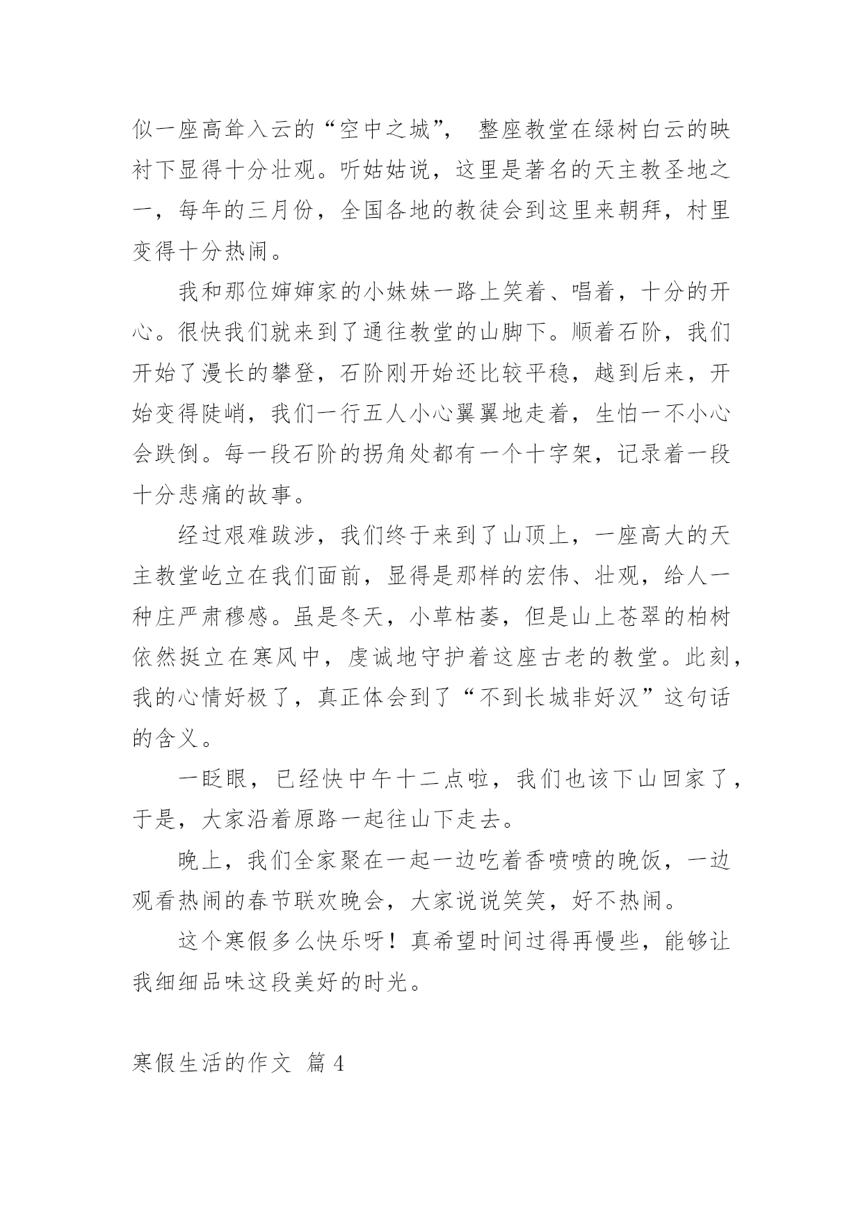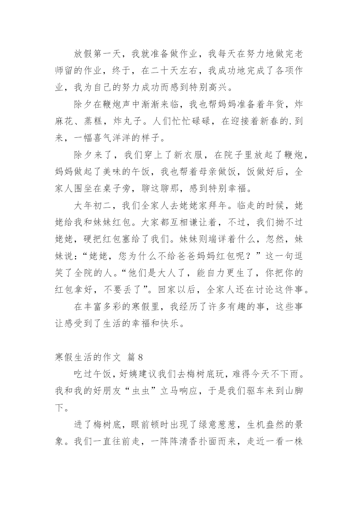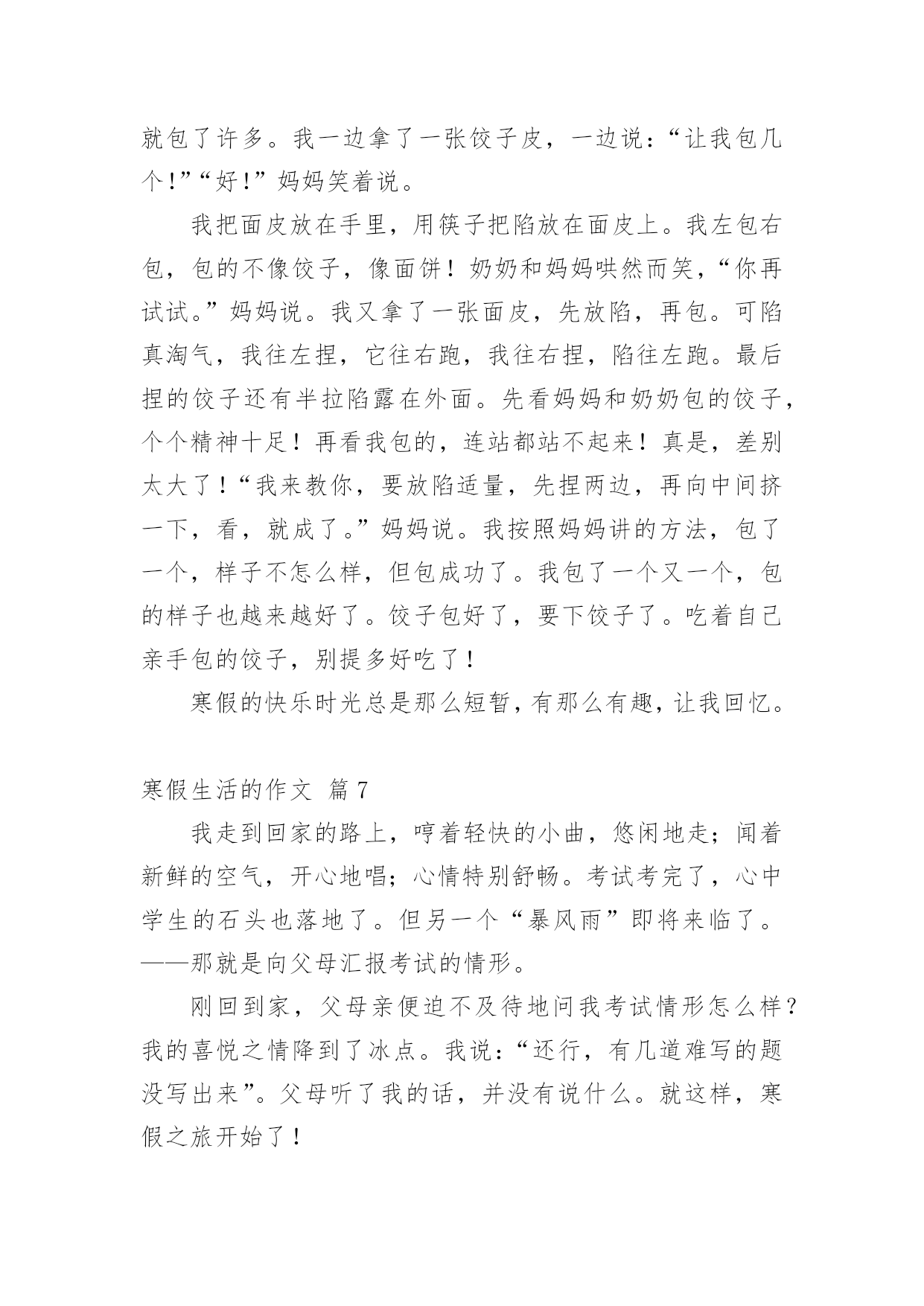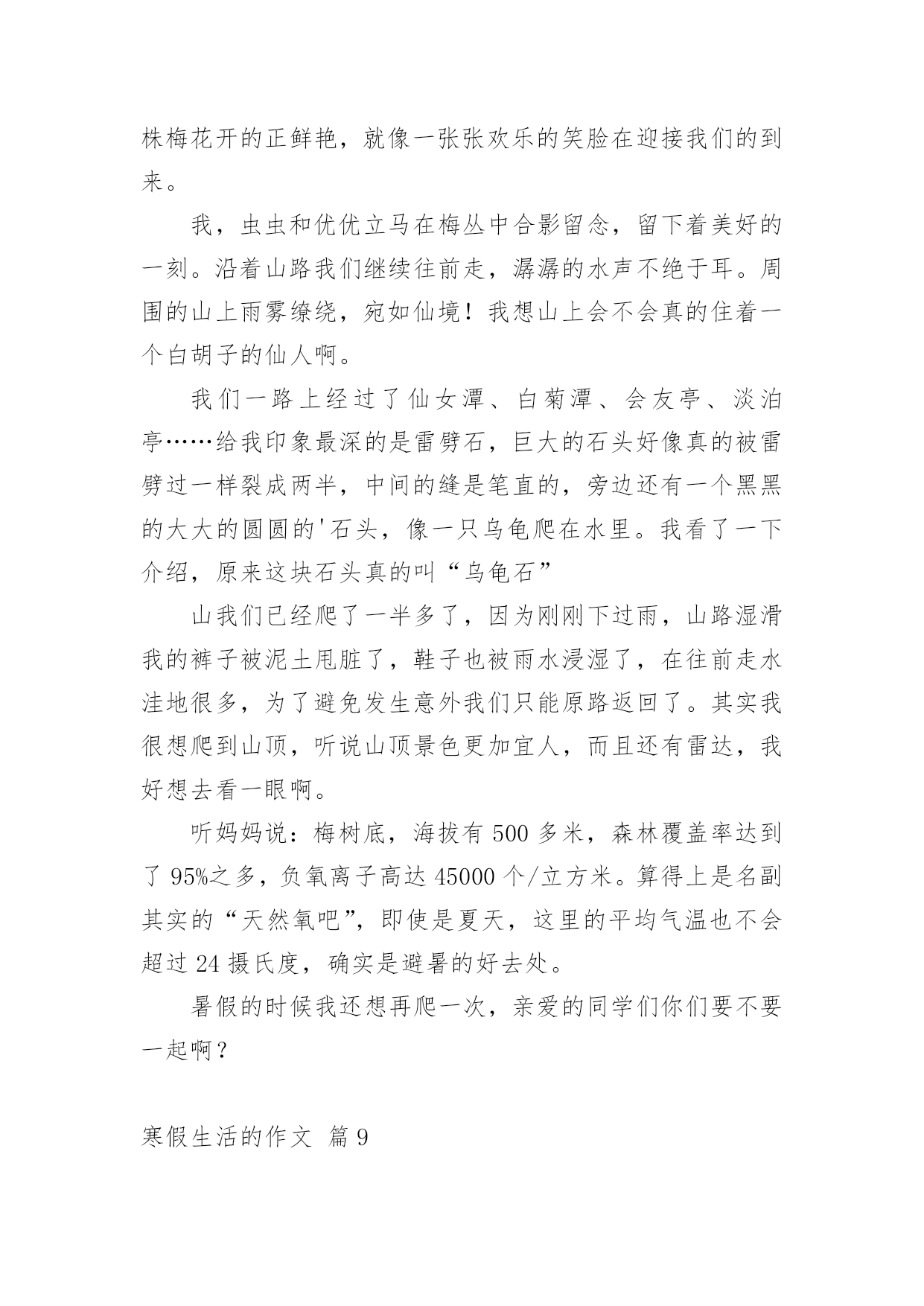 寒假生活的作文【实用】寒假生活的作文合集十篇在日常学习、工作抑或是生活中,大家或多或少都会接触过作文吧,作文是一种言语活动,具有高度的综合性和创造性。那么,怎么去写作文呢?以下是小编为大家收集的寒假生活的作文10篇,希望能够帮助到大家。寒假生活的作文篇1终于放寒假了,我和姐姐高兴的不得了。爸爸妈妈带着我和姐姐到乡下的爷爷奶奶家过春节。我们收拾了行李准备启程,这也就是说我的寒假生活正式开始了。在寒假里,我看了各种各样的书,有童话书、科普图书、还有笑话,有的书还看了好几遍,其中『父与子』是我最喜欢的书,讲述的是父亲与儿子一起经历的种种事情,充分体现了父子情深。我还会和爸爸、妈妈、姐姐、还有大伯家的哥哥一起到村子南边的山上玩。山上有松树,山下有小河,河上有一座用石头做成的小桥。虽然是冬天,但是枯黄的野草一片一片的像铺了一层金黄色的地毯,漂亮极了!我们小心地走过小桥,开始比赛爬山,我和哥哥不一会儿就爬到了山顶。山顶上有一个人工造成的大水池,我和爸爸在比赛打水漂,我们的笑声传遍了山顶,真的太好玩了!最重要的.事情,当然是不能把学习忘了。除了完成老师布置的作业,还要背背古诗,读读英语,记记数学公式,多做练习题才能记得更清楚。我的寒假生活结束了,这个寒假快乐而有意义,过年还收到了很多红包,真是一个难忘的寒假啊!寒假生活的作文篇2寒假!你什么时候再乘着那同学们期盼的声音来到我们身边?对于那时面临考试的我们来说,整天盼望着你的来临。可现在真正浸在寒假这罐儿甜蜜中时,却没有了当初的香甜。“叮…叮…叮~~”这是什么时候定的闹钟啊!!寒假的第一天早晨就被这烦人的闹钟声吵醒了。无奈,只好埋头再睡,但怎么也睡不着了,便像往常一样起了床。望着窗外的天,仿佛在漆黑的夜里不知被谁撕开一道裂痕,涌出了一丝光芒。我伸了伸懒腰,看着滴滴嗒嗒还没六点的表,便拖着疲惫的身子扎进那作业堆里,就像我以前说的,在这浩大的知识的海洋里遨游,这一游就是一个早上。家里除了我没有了其他人,人呢?该上班的.上班,还有该上辅导班的上辅导班,而我就是该发呆的发呆……·现在,我正在面临一个重大的问题,到底还做不做饭?做吧,太麻烦,不做吧,“闹铃”却一直一直响个不停。经过一番深思熟虑后,唉……还是去吧。于是,我便开启了在厨房来回穿梭的模式,不一会,锅里的油已经炸开了一朵朵金黄色的小花,一切准备就绪,只欠东风,我便把已经打好的鸡蛋倒入锅中,“渍渍渍…·”随着一声声欢快的乐章,鸡蛋也在锅里跳着欢快的舞蹈,时不时还唱着“渍渍渍”的歌曲。一切看起来多么美好,但不料油太热,“嘣!”的一声,油在锅里溅开,滚烫的油嘣到了手上,我顿时感到无助与难过。蹲在墙角抹起了眼泪………这样的寒假,日复一日,每天的无聊,让我怀念上学的时光,怀念同学们的一张张充满笑容的脸,怀念在教室里的琅琅书声……·唉~寒假真无聊啊!寒假生活的作文篇3光阴似箭,日月如梭,时间过的飞快,这让我不仅想起了孔子曾经说过的一句话:逝者如斯夫,不舍昼夜。一个快乐而且充实的寒假马上就要过去了,回想这大约三十天的生活,多么快乐呀!多么有意义呀!腊月三十早上,我很早就起床了。奶奶也刚刚起床,准备做饭。我穿上衣服,拿出手机,开始给朋友们发新年祝福,“在新的一年里发发发……”等等。不一会儿,爸爸和叔叔他们也都起床了,奶奶已经生好炉子,正忙着做香喷喷的早餐呢。很快,丰盛的早饭做好了,我们全家人开心地坐在一起吃饭,多么和谐,多么快乐呀!吃过早饭,大约八九点钟,我和姑姑一起到附近的'山上去玩,正巧碰上邻居家的婶婶一家三口,于是我们结伴同行。翻过山,远远看去,有一座高大的教堂建在山顶上,好似一座高耸入云的“空中之城”,整座教堂在绿树白云的映衬下显得十分壮观。听姑姑说,这里是著名的天主教圣地之一,每年的三月份,全国各地的教徒会到这里来朝拜,村里变得十分热闹。我和那位婶婶家的小妹妹一路上笑着、唱着,十分的开心。很快我们就来到了通往教堂的山脚下。顺着石阶,我们开始了漫长的攀登,石阶刚开始还比较平稳,越到后来,开始变得陡峭,我们一行五人小心翼翼地走着,生怕一不小心会跌倒。每一段石阶的拐角处都有一个十字架,记录着一段十分悲痛的故事。经过艰难跋涉,我们终于来到了山顶上,一座高大的天主教堂屹立在我们面前,显得是那样的宏伟、壮观,给人一种庄严肃穆感。虽是冬天,小草枯萎,但是山上苍翠的柏树依然挺立在寒风中,虔诚地守护着这座古老的教堂。此刻,我的心情好极了,真正体会到了“不到长城非好汉”这句话的含义。一眨眼,已经快中午十二点啦,我们也该下山回家了,于是,大家沿着原路一起往山下走去。晚上,我们全家聚在一起一边吃着香喷喷的晚饭,一边观看热闹的春节联欢晚会,大家说说笑笑,好不热闹。这个寒假多么快乐呀!真希望时间过得再慢些,能够让我细细品味这段美好的时光。寒假生活的作文篇4在新年来临之际,包