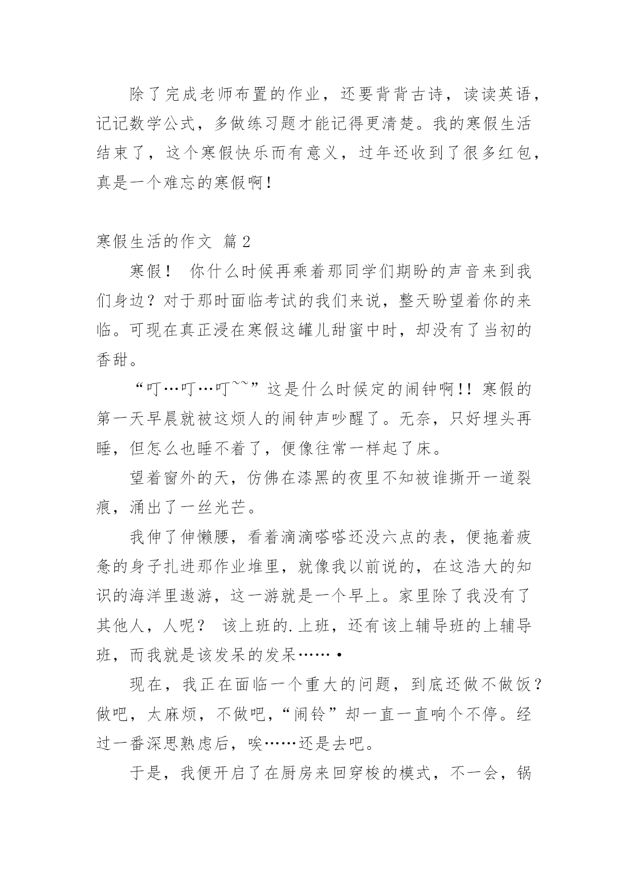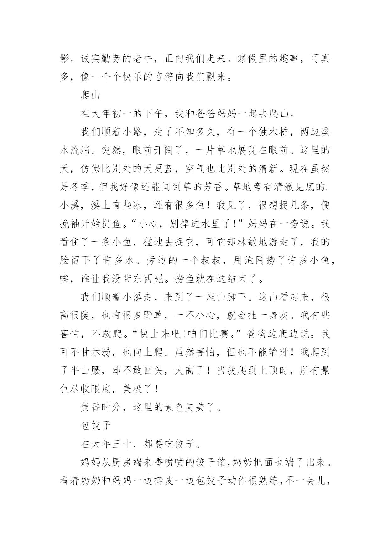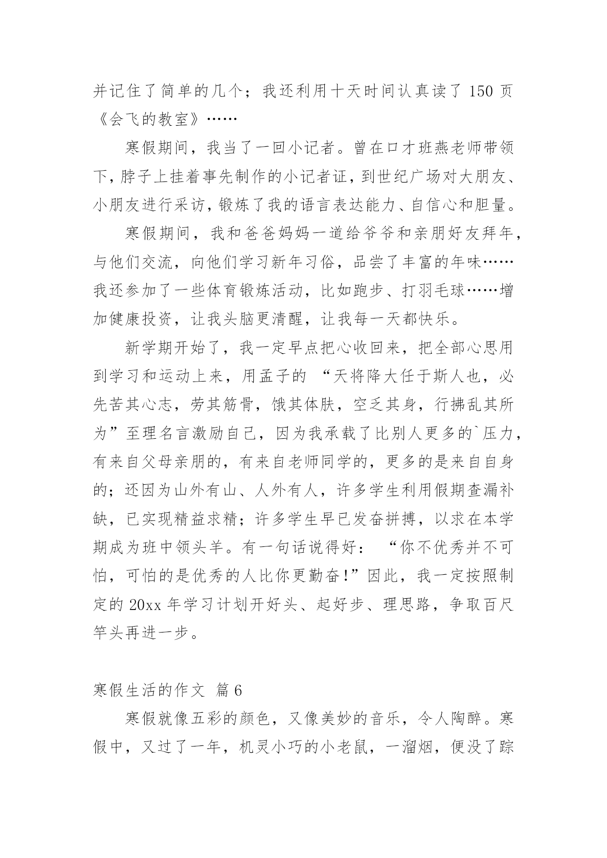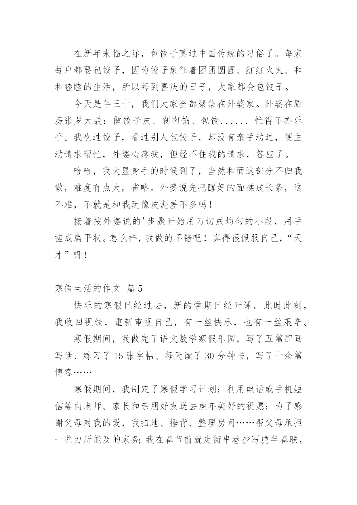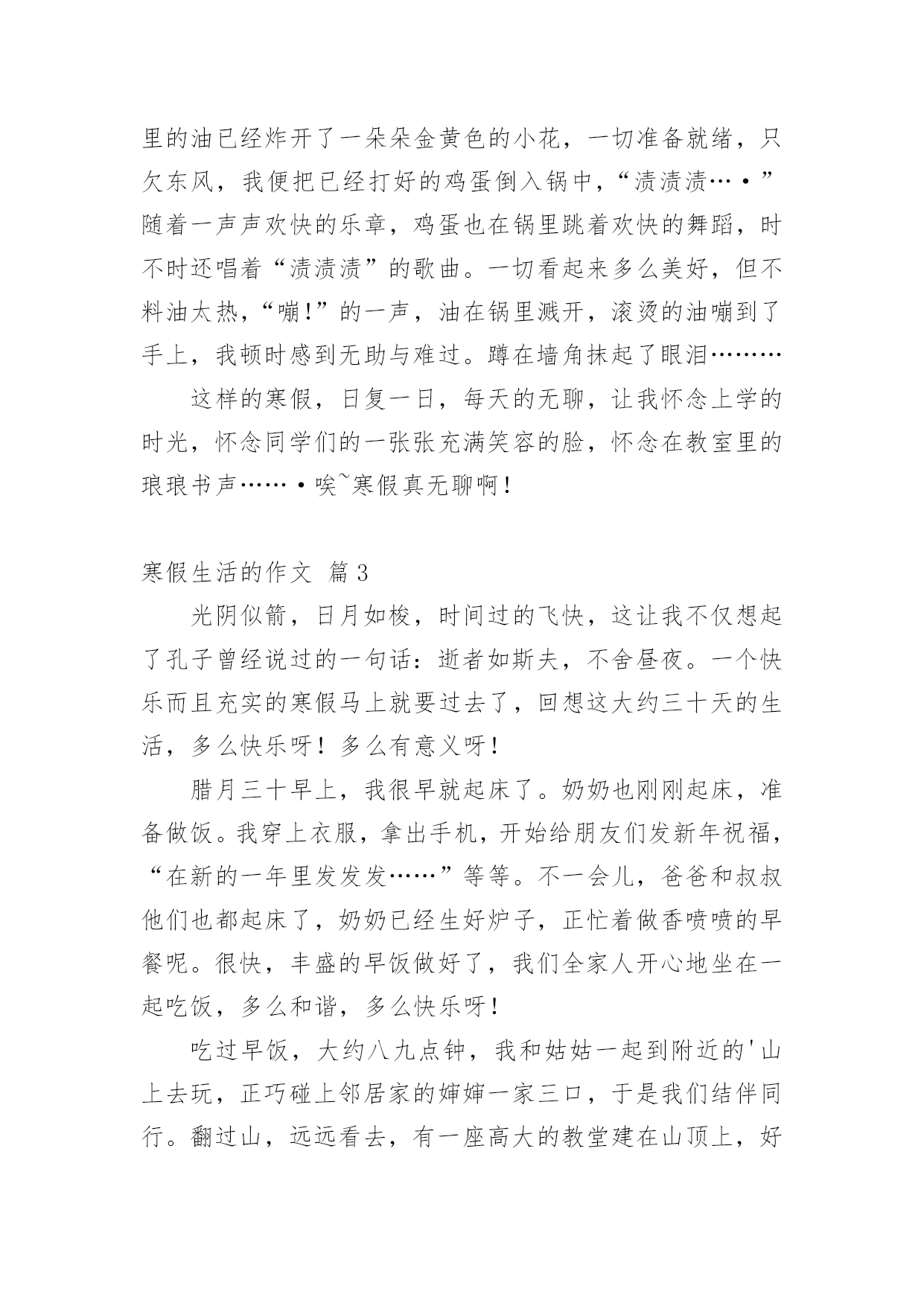 寒假生活的作文【实用】寒假生活的作文合集十篇在日常学习、工作抑或是生活中,大家或多或少都会接触过作文吧,作文是一种言语活动,具有高度的综合性和创造性。那么,怎么去写作文呢?以下是小编为大家收集的寒假生活的作文10篇,希望能够帮助到大家。寒假生活的作文篇1终于放寒假了,我和姐姐高兴的不得了。爸爸妈妈带着我和姐姐到乡下的爷爷奶奶家过春节。我们收拾了行李准备启程,这也就是说我的寒假生活正式开始了。在寒假里,我看了各种各样的书,有童话书、科普图书、还有笑话,有的书还看了好几遍,其中『父与子』是我最喜欢的书,讲述的是父亲与儿子一起经历的种种事情,充分体现了父子情深。我还会和爸爸、妈妈、姐姐、还有大伯家的哥哥一起到村子南边的山上玩。山上有松树,山下有小河,河上有一座用石头做成的小桥。虽然是冬天,但是枯黄的野草一片一片的像铺了一层金黄色的地毯,漂亮极了!我们小心地走过小桥,开始比赛爬山,我和哥哥不一会儿就爬到了山顶。山顶上有一个人工造成的大水池,我和爸爸在比赛打水漂,我们的笑声传遍了山顶,真的太好玩了!最重要的.事情,当然是不能把学习忘了。除了完成老师布置的作业,还要背背古诗,读读英语,记记数学公式,多做练习题才能记得更清楚。我的寒假生活结束了,这个寒假快乐而有意义,过年还收到了很多红包,真是一个难忘的寒假啊!寒假生活的作文篇2寒假!你什么时候再乘着那同学们期盼的声音来到我们身边?对于那时面临考试的我们来说,整天盼望着你的来临。可现在真正浸在寒假这罐儿甜蜜中时,却没有了当初的香甜。“叮…叮…叮~~”这是什么时候定的闹钟啊!!寒假的第一天早晨就被这烦人的闹钟声吵醒了。无奈,只好埋头再睡,但怎么也睡不着了,便像往常一样起了床。望着窗外的天,仿佛在漆黑的夜里不知被谁撕开一道裂痕,涌出了一丝光芒。我伸了伸懒腰,看着滴滴嗒嗒还没六点的表,便拖着疲惫的身子扎进那作业堆里,就像我以前说的,在这浩大的知识的海洋里遨游,这一游就是一个早上。家里除了我没有了其他人,人呢?该上班的.上班,还有该上辅导班的上辅导班,而我就是该发呆的发呆……·现在,我正在面临一个重大的问题,到底还做不做饭?做吧,太麻烦,不做吧,“闹铃”却一直一直响个不停。经过一番深思熟虑后,唉……还是去吧。于是,我便开启了在厨房来回穿梭的模式,不一会,锅里的油已经炸开了一朵朵金黄色的小花,一切准备就绪,只欠东风,我便把已经打好的鸡蛋倒入锅中,“渍渍渍…·”随着一声声欢快的乐章,鸡蛋也在锅里跳着欢快的舞蹈,时不时还唱着“渍渍渍”的歌曲。一切看起来多么美好,但不料油太热,“嘣!”的一声,油在锅里溅开,滚烫的油嘣到了手上,我顿时感到无助与难过。蹲在墙角抹起了眼泪………这样的寒假,日复一日,每天的无聊,让我怀念上学的时光,怀念同学们的一张张充满笑容的脸,怀念在教室里的琅琅书声……·唉~寒假真无聊啊!寒假生活的作文篇3光阴似箭,日月如梭,时间过的飞快,这让我不仅想起了孔子曾经说过的一句话:逝者如斯夫,不舍昼夜。一个快乐而且充实的寒假马上就要过去了,回想这大约三十天的生活,多么快乐呀!多么有意义呀!腊月三十早上,我很早就起床了。奶奶也刚刚起床,准备做饭。我穿上衣服,拿出手机,开始给朋友们发新年祝福,“在新的一年里发发发……”等等。不一会儿,爸爸和叔叔他们也都起床了,奶奶已经生好炉子,正忙着做香喷喷的早餐呢。很快,丰盛的早饭做好了,我们全家人开心地坐在一起吃饭,多么和谐,多么快乐呀!吃过早饭,大约八九点钟,我和姑姑一起到附近的'山上去玩,正巧碰上邻居家的婶婶一家三口,于是我们结伴同行。翻过山,远远看去,有一座高大的教堂建在山顶上,好似一座高耸入云的“空中之城”,整座教堂在绿树白云的映衬下显得十分壮观。听姑姑说,这里是著名的天主教圣地之一,每年的三月份,全国各地的教徒会到这里来朝拜,村里变得十分热闹。我和那位婶婶家的小妹妹一路上笑着、唱着,十分的开心。很快我们就来到了通往教堂的山脚下。顺着石阶,我们开始了漫长的攀登,石阶刚开始还比较平稳,越到后来,开始变得陡峭,我们一行五人小心翼翼地走着,生怕一不小心会跌倒。每一段石阶的拐角处都有一个十字架,记录着一段十分悲痛的故事。经过艰难跋涉,我们终于来到了山顶上,一座高大的天主教堂屹立在我们面前,显得是那样的宏伟、壮观,给人一种庄严肃穆感。虽是冬天,小草枯萎,但是山上苍翠的柏树依然挺立在寒风中,虔诚地守护着这座古老的教堂。此刻,我的心情好极了,真正体会到了“不到长城非好汉”这句话的含义。一眨眼,已经快中午十二点啦,我们也该下山回家了,于是,大家沿着原路一起往山下走去。晚上,我们全家聚在一起一边吃着香喷喷的晚饭,一边观看热闹的春节联欢晚会,大家说说笑笑,好不热闹。这个寒假多么快乐呀!真希望时间过得再慢些,能够让我细细品味这段美好的时光。寒假生活的作文篇4在新年来临之际,包
