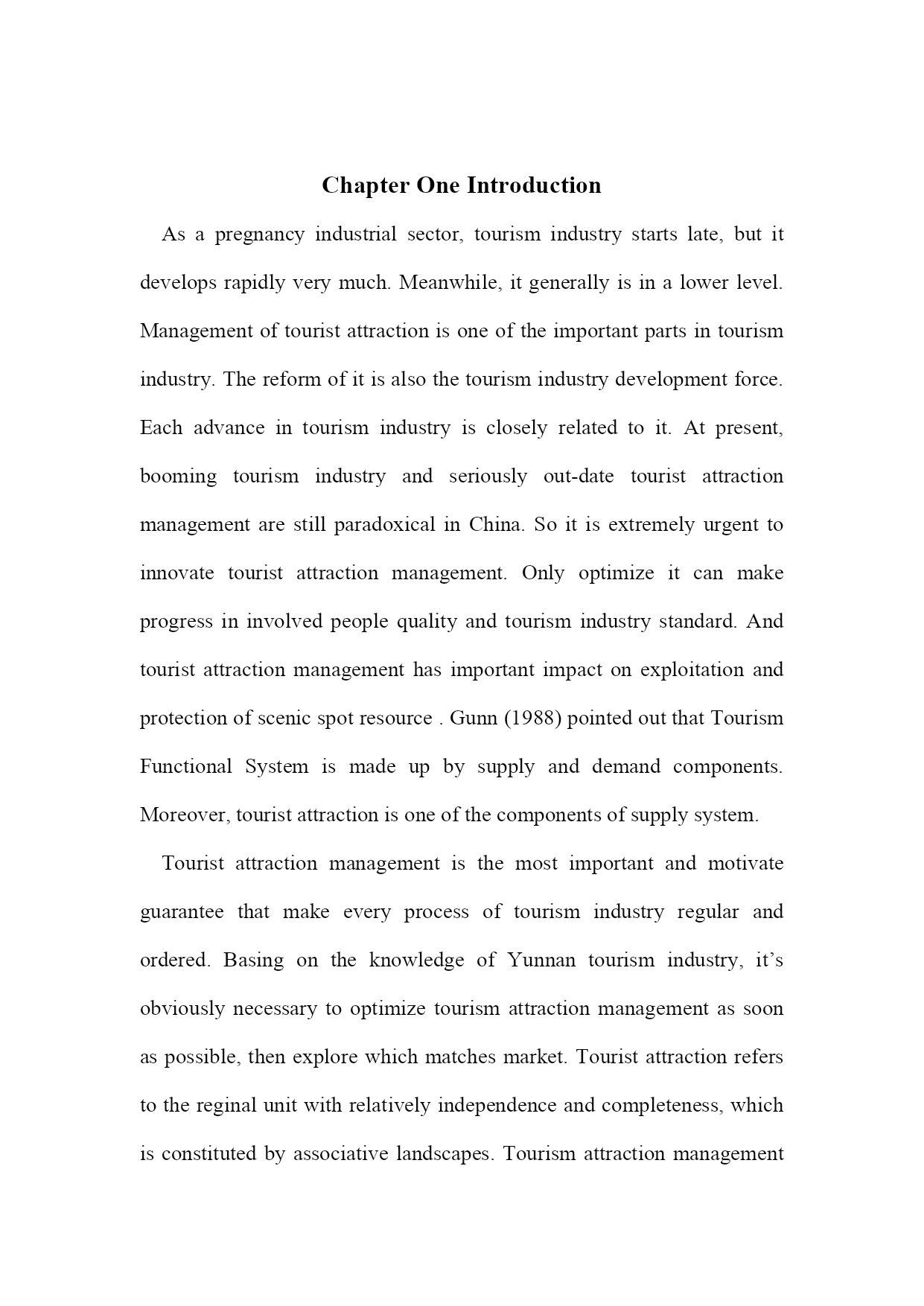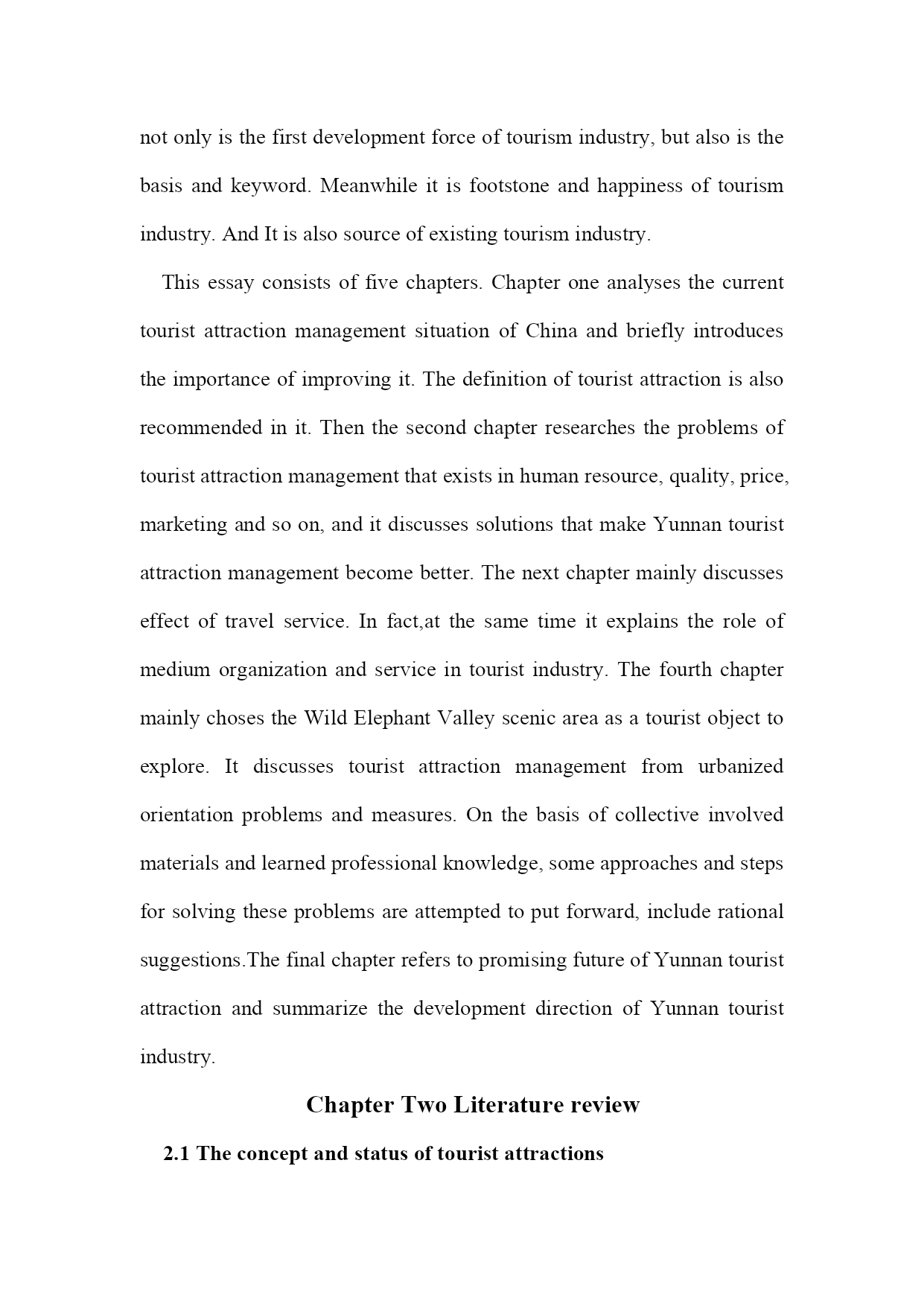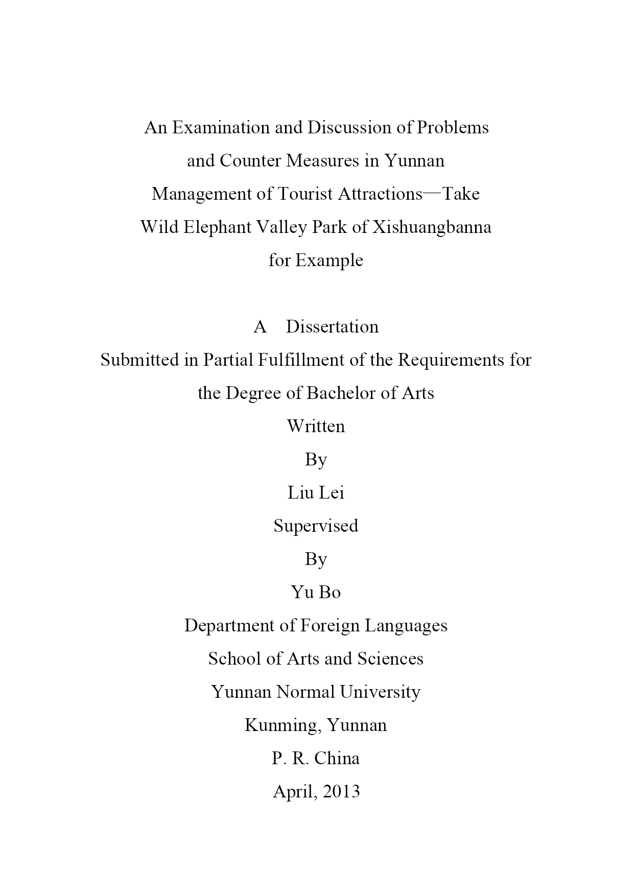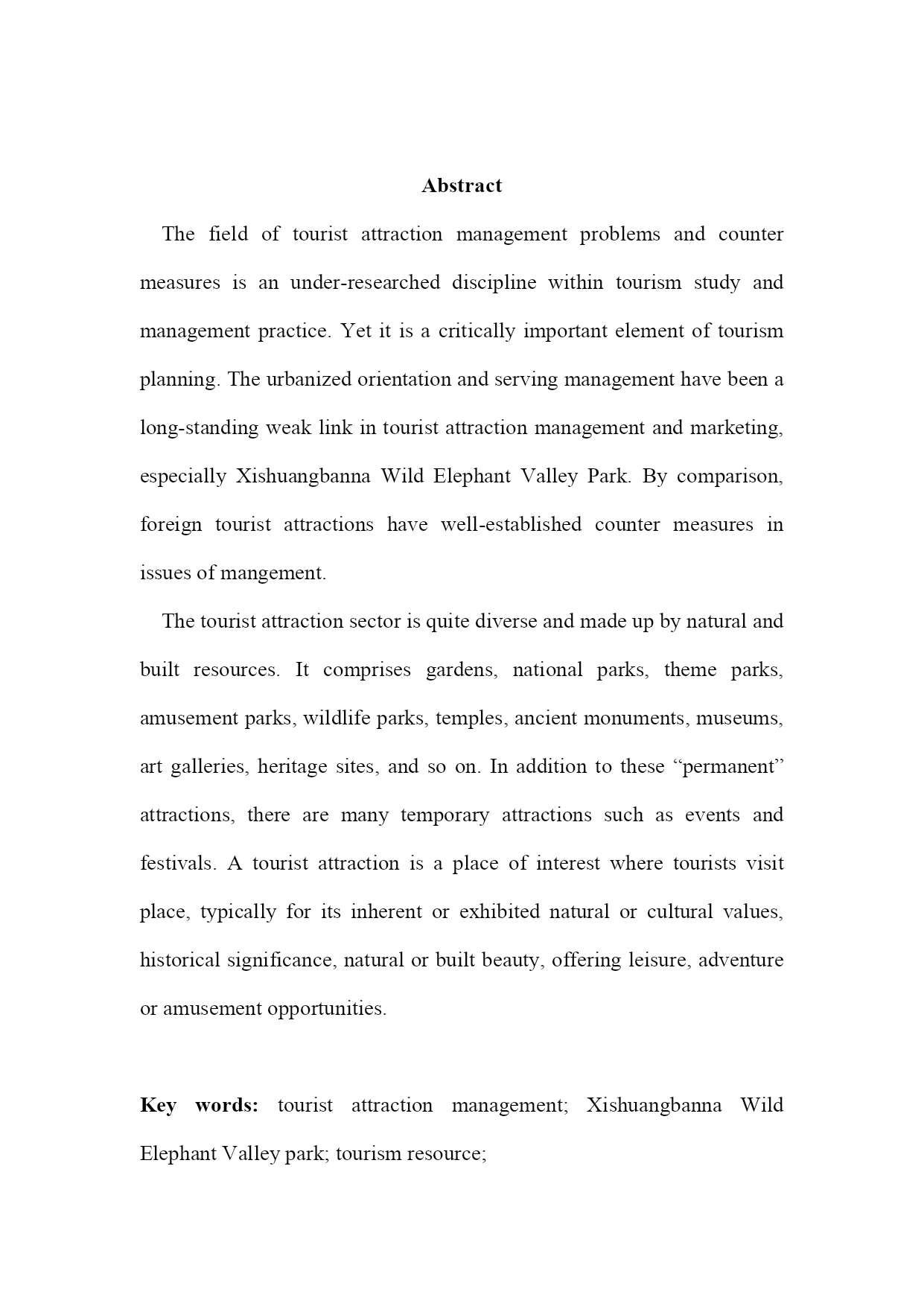 本科学士学位论文AnExaminationandDiscussionofProblemsandCounterMeasuresinYunnanManagementofTouristAttractions—TakeWildElephantValleyParkofXishuangbannaforExample姓名刘蕾学号201041001院系外语学院专业英语教育指导教师余波职称2013年3月AnExaminationandDiscussionofProblemsandCounterMeasuresinYunnanManagementofTouristAttractions—TakeWildElephantValleyParkofXishuangbannaforExampleADissertationSubmittedinPartialFulfillmentoftheRequirementsfortheDegreeofBachelorofArtsWrittenByLiuLeiSupervisedByYuBoDepartmentofForeignLanguagesSchoolofArtsandSciencesYunnanNormalUniversityKunming,YunnanP.R.ChinaApril,2013AcknowledgementsFirstandforemostIamgratefultomysupervisorYuBo.Withoutherprofessionalandselflessguidance,Icouldn’tcompletethispaperwell.Shealwayspatientlyhelpsandcaresforme.ThenIextremelywillappreciatemyclassmates.Theyareallmysecondteachers.WhenIgetintotrouble,theywillactivelyandproactivelygivemeahand.Theyencouragemeallthetime.Theyalsoteachmeonething:Nevergiveup,believeyourself!NextIcan’tthankenoughmycollege.Itoffersmeacomfortableandexcellentenvironmenttostudy.Underthecomprehensiveeducation,Ilearnedhowtoconductmyselfandstudywellthroughfouryears.Intheend,thanksmyfamilyforeverythingyou’vedoneforme.Yougivemegreatsupportandrespectmychoice.ContentsAbstract(Englishversion)Abstract(Chineseversion)ChapterOneIntroductionChapterTwoLiteratureReview2.1TheConceptandStatusofTouristAttractions2.2ManagementofTouristAttraction2.2.1ManpowerResource2.2.2QualityandCompetitiveness2.2.3Price2.2.4TouristCapacity2.2.5StrategicPlanning2.2.6Marketing2.3PerceptionandChoice2.4ChallengeandFutureChapterThreeServingManagement3.1TouristGoods3.1.1GreatInternationally-knownFirst-classBrand3.1.2FeaturesofPeoplesandRegion3.1.3MemorialCharacteristicandArtistry3.1.4Theme,Variety,StandardandLevel3.1.5BranchandAdvertising3.2ServingChapterFourTheManagementProblemsinXishuangbannaWildElephantValleyPark4.1TypesofTouristAttraction4.2TheBriefIntroductionofTheXishuangbannaWildElephan
