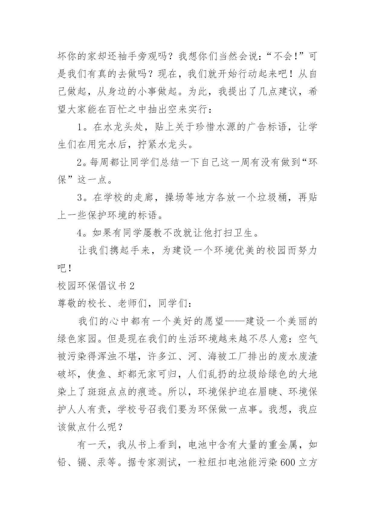 校园环保倡议书校园环保倡议书必备2篇在当今社会生活中,倡议书对我们的作用越来越大,倡议书具有响应者不确定性的特征。来参考自己需要的倡议书吧!以下是小编帮大家整理的校园环保倡议书,欢迎大家分享。校园环保倡议书1尊敬的校长、老师们,同学们:你们好!我是六年级一班的xx第三小学是我的母校是我学习生活已有六年之久的地方;是充满大家欢声笑语的天地。这里有郁郁葱葱的.小树林,有绿如碧毯的足球场,还有干干净净的走廊……但是却总有一些同学会做一些不文明的举动,例如:1。在校园中,纸片,垃圾袋随处可见,但却没有人愿意去捡起来。2。某些同学喜欢在水房里洒水玩,有时还忘记关水龙头。3。有些同学,他们写错字以后不用橡皮擦擦掉重写,而是很干脆地撕下整页纸。像这样浪费资源,破坏环境的现象还有很多,同学们,学校是我们第二个家,你会破坏你的家吗?你会看见别人破坏你的家却还袖手旁观吗?我想你们当然会说:“不会!”可是我们有真的去做吗?现在,我们就开始行动起来吧!从自己做起,从身边的小事做起。为此,我提出了几点建议,希望大家能在百忙之中抽出空来实行:1。在水龙头处,贴上关于珍惜水源的广告标语,让学生们在用完水后,拧紧水龙头。2。每周都让同学们总结一下自己这一周有没有做到“环保”这一点。3。在学校的走廊,操场等地方各放一个垃圾桶,再贴上一些保护环境的标语。4。如果有同学屡教不改就让他打扫卫生。让我们携起手来,为建设一个环境优美的校园而努力吧!校园环保倡议书2尊敬的校长、老师们,同学们:我们的心中都有一个美好的愿望——建设一个美丽的绿色家园。但是现在我们的生活环境越来越不尽人意:空气被污染得浑浊不堪,许多江、河、海被工厂排出的废水废渣破坏,使鱼、虾都无家可归,人们乱扔的垃圾给绿色的大地染上了斑斑点点的痕迹。所以,环境保护迫在眉睫、环境保护人人有责,学校号召我们要为环保做一点事。我想,我应该做点什么呢?有一天,我从书上看到,电池中含有大量的重金属,如铅、镉、汞等。据专家测试,一粒纽扣电池能污染600立方米水。一节一号电池烂在地里,能使一平方米的土地失去利用价值,你们看看,乱扔电池的危害竟有这么大!废旧电池如果与生活垃圾混合处理,电池腐烂后,其中的'汞、镉、铅等重金属溶出去会污染地下水和土壤,再渗透进入鱼类,农作物中,破坏人类的生存环境,威胁人类的健康。废旧电池中的镉元素则被定为致癌物质。我真没想到乱扔电池危害这么大!别说我们小孩子了,就连大人们都把废电池随手乱扔到垃圾桶里。目前,我们钦州还没有置办一个“废旧电池回收点”,这时,我心中萌发出了一个想法,给废旧电池安排一个“家”。于是,说干就干。我从家里使了好大劲才找出了一个硬纸箱,我还把胶水、红纸、笔、等物品拿下楼,打算在小区最显眼的地方,设一个废旧电池回收点。首先,我在红纸上写下“废旧电池回收箱”这几个字,然后把红纸的背面涂上胶水,稳稳当当地贴在了箱子的正面,接着把胶水涂在箱子背面,使劲地粘在了墙上。最后,我把那张写有“乱扔废旧电池的危害”的纸粘在了“废旧电池回收箱”的旁边。做完以后,我心里美滋滋的,就像吃了蜂蜜一样甜。一个星期过去了,我怀着兴奋的心情到了“废旧电池回收箱”看了看,发现里面有着大小不一的电池。我为我的做法得到大家的认可而自豪。虽然这只是一件微不足道的小事,但是对环境保护却起到了一定的作用。我相信,只要每个人从我做起,从身边的小事做起,我们将拥有一个美丽的绿色家园。