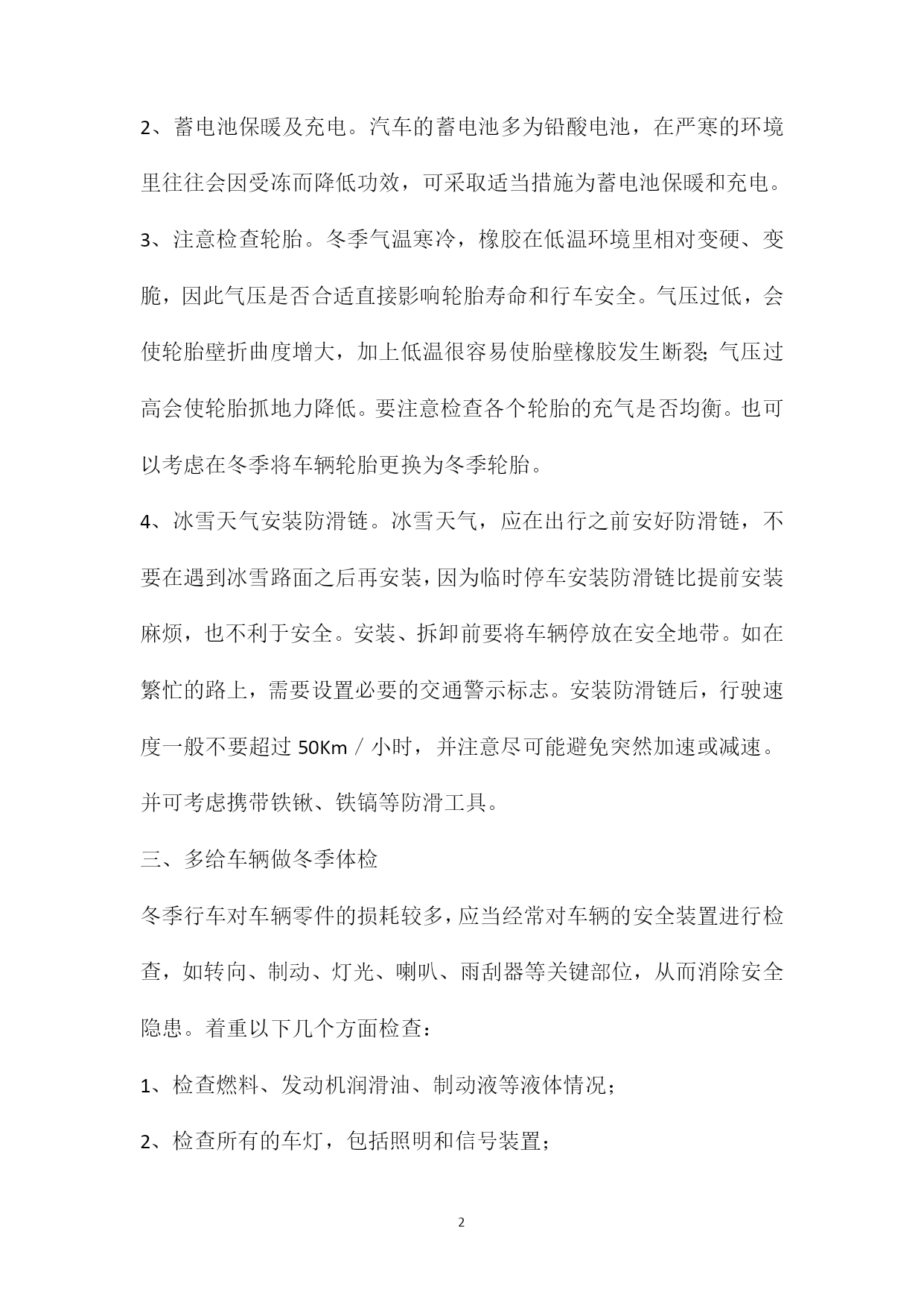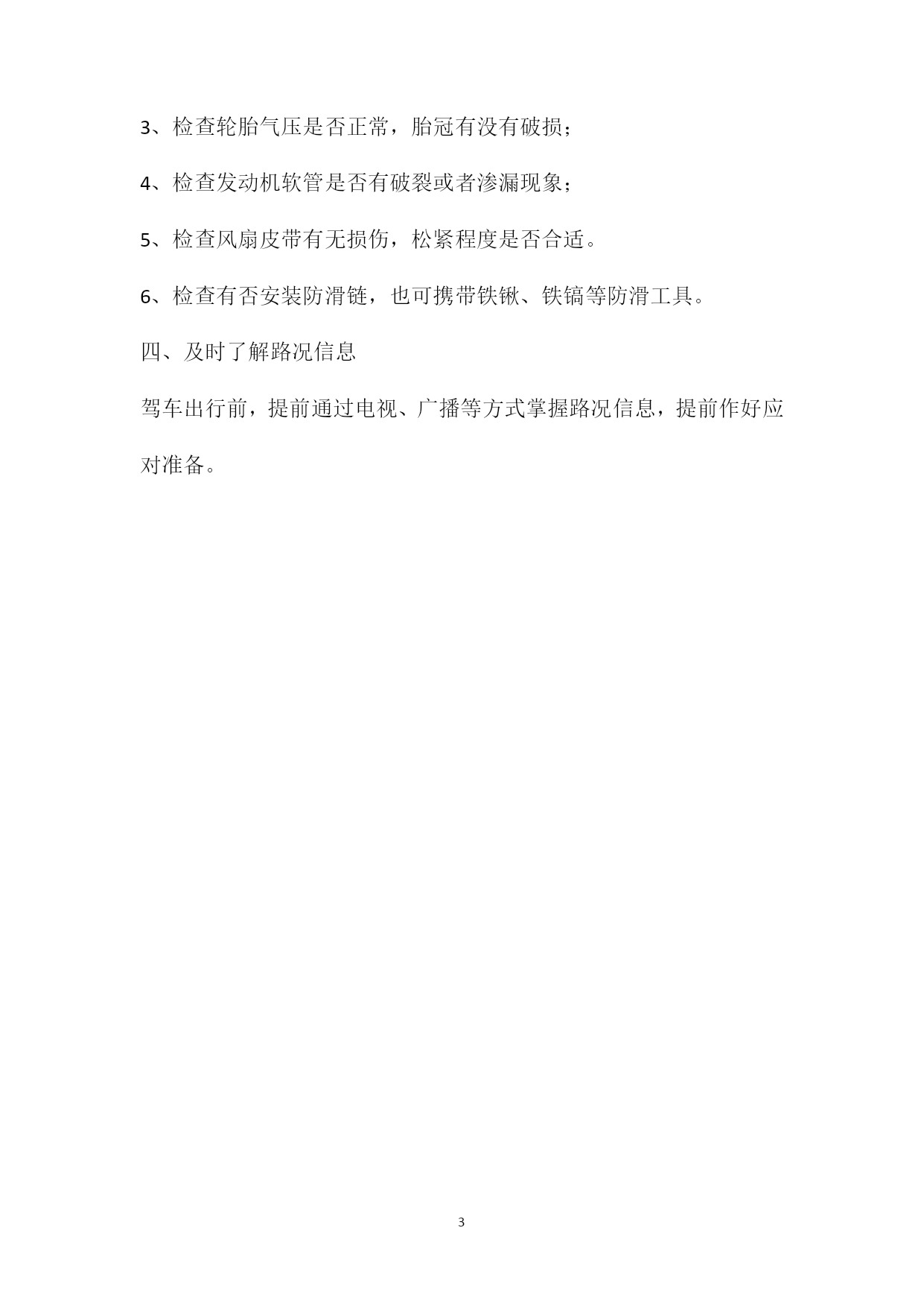 PAGEPAGE3春运交通安全知识春运期间,车流、物流、人流高度集中,雨、雪、雾天气增多,机动车驾驶人要提高安全意识,确保平安出行。一、增强冬季行车安全意识冬季霜多、雾多、雨雪多、气温低,环境复杂,对行车安全有较大影响。驾驶人员应提高对冬季安全驾驶的认识,加强冬季驾驶的知识和技能的学习,做到防冻、防滑、防事故,掌握处理冬季驾驶过程中常见问题的方法。切忌在冬季仍以其他季节的驾驶习惯行车。二、车辆换季保养要做好车辆的换季保养工作,对车辆制动、转向、行驶系及气路管道、水路管道、油路管道等各部件进行全面检查保养,为车辆装备必要的防冻装置,按规定添加机油、齿轮油。1、防冻液。车辆在日常维护过程中,有可能在防冻液中加入过普通水,则必须更换防冻液。冷却液不足的要补足,否则会使发动机水温过高,导致发动机机件的损坏。更换防冻液要严格按产品使用方法操作,关键是要注意尽可能地放干净水,尽可能地排完气,不要产生气阻,要尽可能地加足,待发动车辆运转一会后观察情况,适量补足。要做到勤检查,勤补充。2、蓄电池保暖及充电。汽车的蓄电池多为铅酸电池,在严寒的环境里往往会因受冻而降低功效,可采取适当措施为蓄电池保暖和充电。3、注意检查轮胎。冬季气温寒冷,橡胶在低温环境里相对变硬、变脆,因此气压是否合适直接影响轮胎寿命和行车安全。气压过低,会使轮胎壁折曲度增大,加上低温很容易使胎壁橡胶发生断裂;气压过高会使轮胎抓地力降低。要注意检查各个轮胎的充气是否均衡。也可以考虑在冬季将车辆轮胎更换为冬季轮胎。4、冰雪天气安装防滑链。冰雪天气,应在出行之前安好防滑链,不要在遇到冰雪路面之后再安装,因为临时停车安装防滑链比提前安装麻烦,也不利于安全。安装、拆卸前要将车辆停放在安全地带。如在繁忙的路上,需要设置必要的交通警示标志。安装防滑链后,行驶速度一般不要超过50Km/小时,并注意尽可能避免突然加速或减速。并可考虑携带铁锹、铁镐等防滑工具。三、多给车辆做冬季体检冬季行车对车辆零件的损耗较多,应当经常对车辆的安全装置进行检查,如转向、制动、灯光、喇叭、雨刮器等关键部位,从而消除安全隐患。着重以下几个方面检查:1、检查燃料、发动机润滑油、制动液等液体情况;2、检查所有的车灯,包括照明和信号装置;3、检查轮胎气压是否正常,胎冠有没有破损;4、检查发动机软管是否有破裂或者渗漏现象;5、检查风扇皮带有无损伤,松紧程度是否合适。6、检查有否安装防滑链,也可携带铁锹、铁镐等防滑工具。四、及时了解路况信息驾车出行前,提前通过电视、广播等方式掌握路况信息,提前作好应对准备。