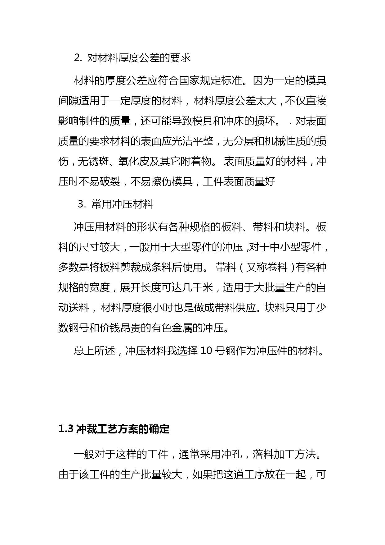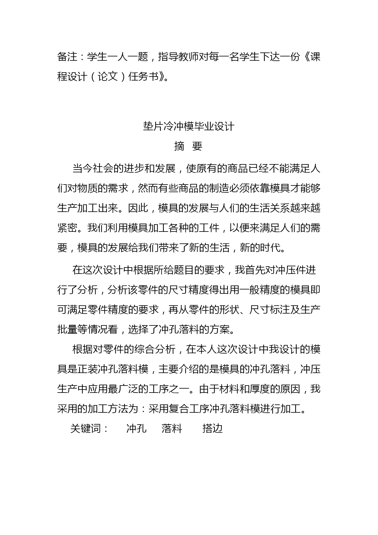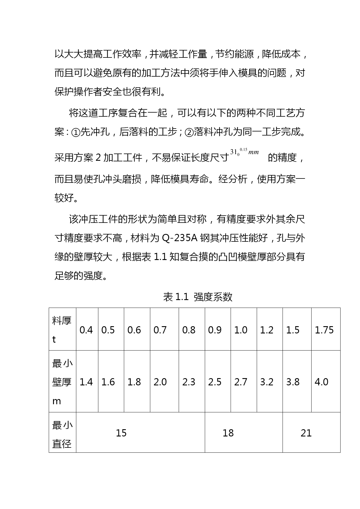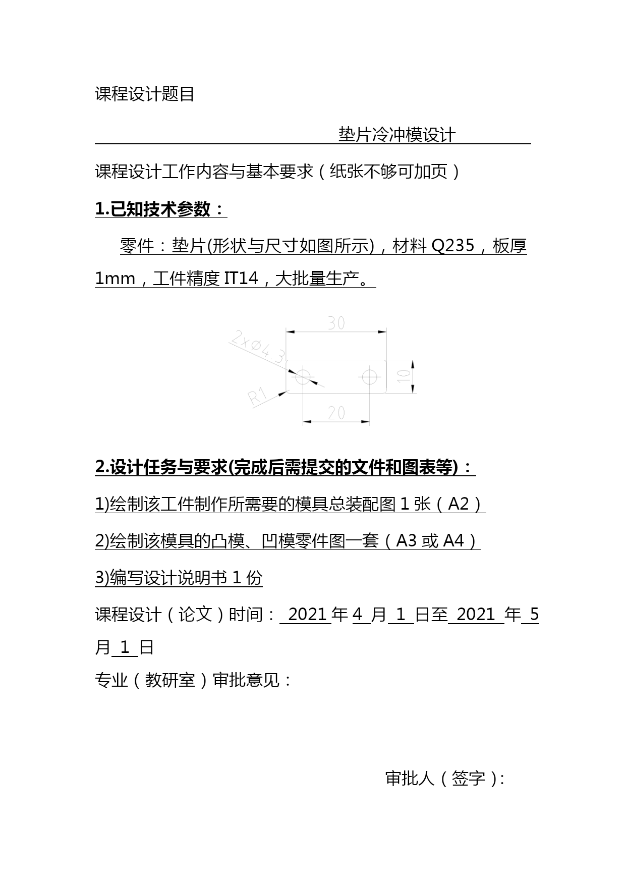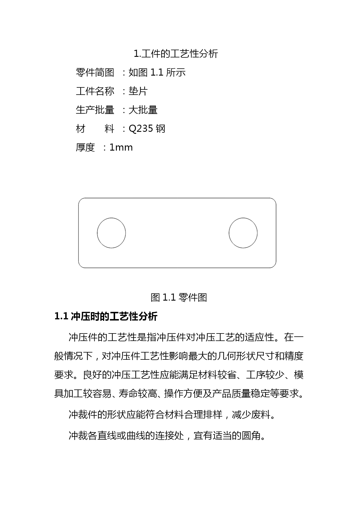 垫片冷冲模设计毕业设计名师资料合集(完整版)资料(可以直接使用,可编辑优秀版资料,欢迎下载)毕业设计(论文)垫片冷冲模毕业设计院(系)名称工学院机械系专业名称机械制造及其自动化学生姓名指导教师2021年5月1日毕业设计任务书工学院机械系机械设计与制造专业2021级机械2班学号090605131学生指导教师课程设计题目垫片冷冲模设计课程设计工作内容与基本要求(纸张不够可加页)1.已知技术参数:零件:垫片(形状与尺寸如图所示),材料Q235,板厚1mm,工件精度IT14,大批量生产。2.设计任务与要求(完成后需提交的文件和图表等):1)绘制该工件制作所需要的模具总装配图1张(A2)2)绘制该模具的凸模、凹模零件图一套(A3或A4)3)编写设计说明书1份课程设计(论文)时间:2021年4月1日至2021年5月1日专业(教研室)审批意见:审批人(签字):备注:学生一人一题,指导教师对每一名学生下达一份《课程设计(论文)任务书》。垫片冷冲模毕业设计摘要当今社会的进步和发展,使原有的商品已经不能满足人们对物质的需求,然而有些商品的制造必须依靠模具才能够生产加工出来。因此,模具的发展与人们的生活关系越来越紧密。我们利用模具加工各种的工件,以便来满足人们的需要,模具的发展给我们带来了新的生活,新的时代。在这次设计中根据所给题目的要求,我首先对冲压件进行了分析,分析该零件的尺寸精度得出用一般精度的模具即可满足零件精度的要求,再从零件的形状、尺寸标注及生产批量等情况看,选择了冲孔落料的方案。根据对零件的综合分析,在本人这次设计中我设计的模具是正装冲孔落料模,主要介绍的是模具的冲孔落料,冲压生产中应用最广泛的工序之一。由于材料和厚度的原因,我采用的加工方法为:采用复合工序冲孔落料模进行加工。关键词:冲孔落料搭边目录TOC\o"1-3"\h\z\uHYPERLINK\l"_Toc155277622"1.工件的工艺性分析3HYPERLINK\l"_Toc155277623"1.1冲压时的工艺性分析3HYPERLINK\l"_Toc155277624"1.2冲压材料选用4HYPERLINK\l"_Toc155277625"1.3冲裁工艺方案的确定4HYPERLINK\l"_Toc155277626"2模具设计计算6HYPERLINK\l"_Toc155277627"2.1排样方案的确定及计算6HYPERLINK\l"_Toc155277628"2.2冲压力的计算8HYPERLINK\l"_Toc155277629"2.3模具压力中心的确定10HYPERLINK\l"_Toc155277630"2.4冲模刃口尺寸及公差的计算11HYPERLINK\l"_Toc155277631"2.5零件结构尺寸的确定14HYPERLINK\l"_Toc155277632"2.6模具总装图17HYPERLINK\l"_Toc155277633"3.模具材料的选用18HYPERLINK\l"_Toc155277634"4冲压设备的选择19HYPERLINK\l"_Toc155277635"5.模具的装卸21HYPERLINK\l"_Toc155277636"5.1模具的装配21HYPERLINK\l"_Toc155277637"5.2卸料装置的确定21HYPERLINK\l"_Toc155277638"6.模具检测23HYPERLINK\l"_Toc155277639"结论24HYPERLINK\l"_Toc155277640"致谢25HYPERLINK\l"_Toc155277641"参考文献261.工件的工艺性分析零件简图:如图1.1所示工件名称:垫片生产批量:大批量材料:Q235钢厚度:1mm图1.1零件图1.1冲压时的工艺性分析冲压件的工艺性是指冲压件对冲压工艺的适应性。在一般情况下,对冲压件工艺性影响最大的几何形状尺寸和精度要求。良好的冲压工艺性应能满足材料较省、工序较少、模具加工较容易、寿命较高、操作方便及产品质量稳定等要求。冲裁件的形状应能符合材料合理排样,减少废料。冲裁各直线或曲线的连接处,宜有适当的圆角。冲裁件凸出或凹入部分宽度不宜太小,并应避免过长的悬臂与窄槽。腰圆形冲裁件,如允许圆弧半径,则R应大于料宽的一半,即能采用少废料排样;如限定圆弧半径等于工