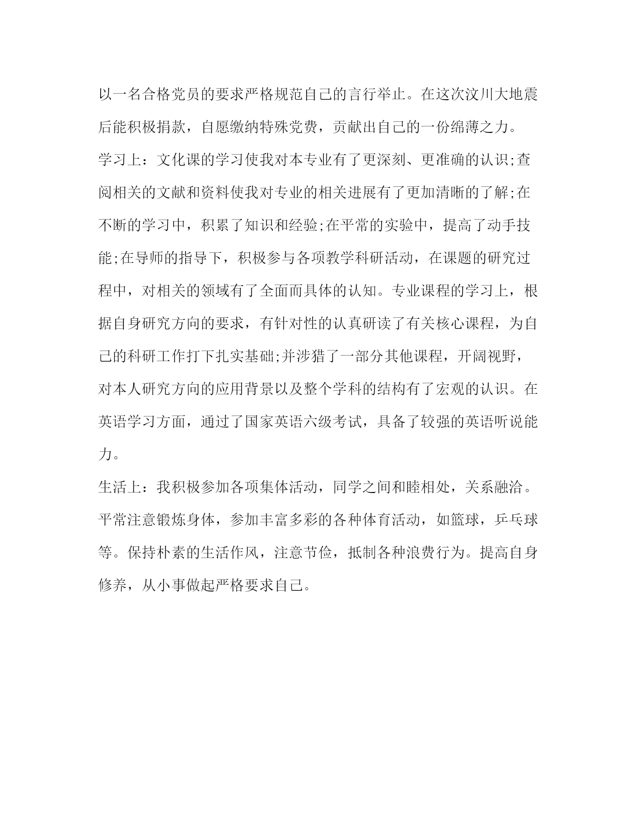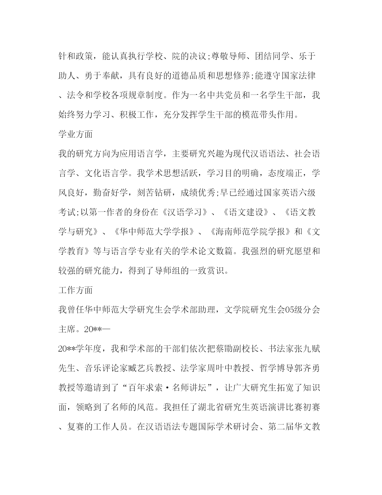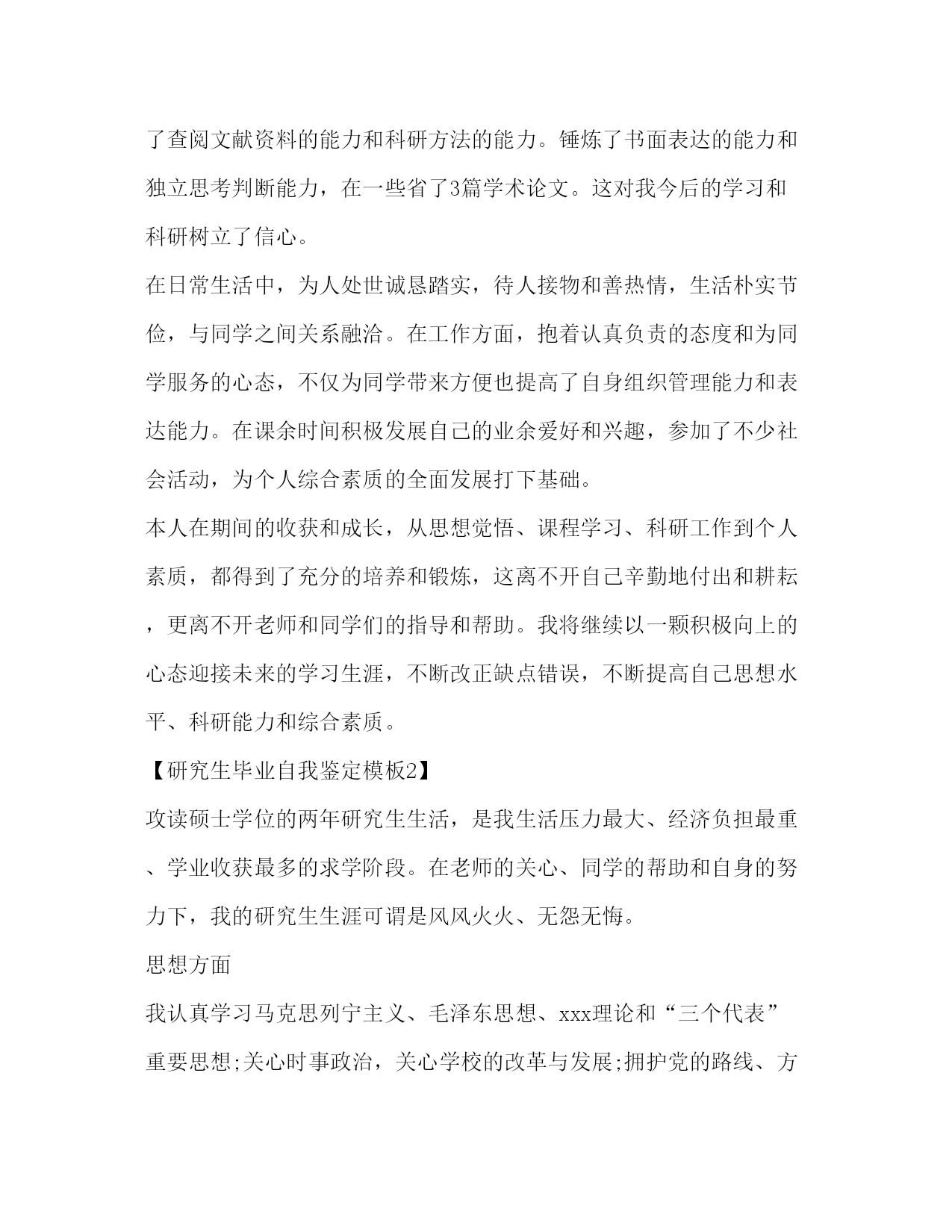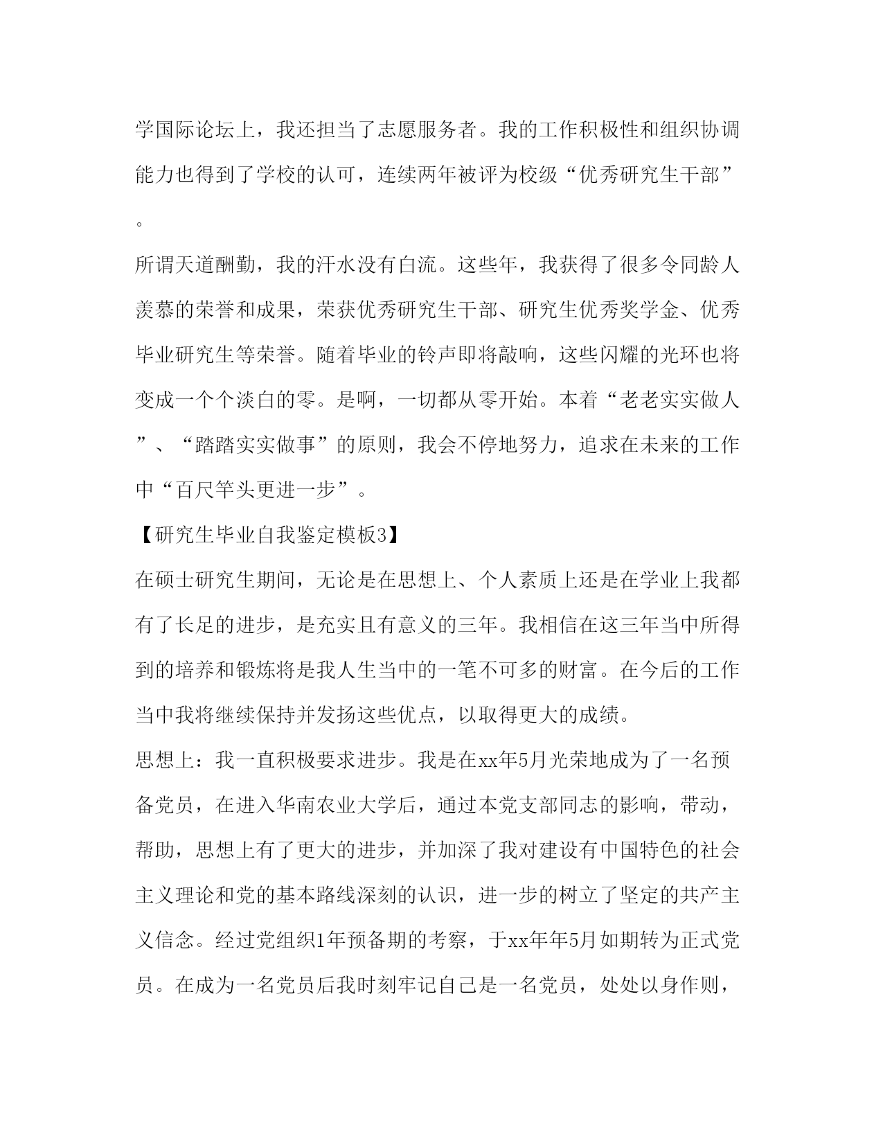 PAGE此资料由网络收集而来,如有侵权请告知上传者立即删除。资料共分享,我们负责传递知识。研究生毕业自我鉴定模板时间,以同样的速度在我们身边来回奔跑,给予了人们同样的时间去创造人生。下面是小编收集的研究生毕业自我鉴定模板,希望对大家有所帮助!【研究生毕业自我鉴定模板1】经过两年的成长,使我在思想、学习、工作以及生活等各方都有了较大的进步:在思想觉悟上,自从踏进校门那一刻起,我就对自己提出了明确的的要求。坚持用科学的思想来认识社会,进行教育探索和研究。并清醒地意识到自己身上所担负的责任,明确了新时期自己的人生理想和发展目标,并持有坚定的信心和勇气。在专业课程的学习上,结合原来的学科背景和研究兴趣,我很快地确定了自己的研究方向和领域,并有针对性的认真研读了有关书籍杂志,学习了相关的必修与选修课程。为自己的科研工作打下扎实基础,在此期间,各门课程都取得了优异的成绩。在期末综合成绩排名中名列前茅。与此同时,我还利用课余时间参阅了其他人文学科的书籍,开阔了研究的视野,弥补了自己知识上的不足。在科研能力上,尽管涉入教育领域的时间很短,但凭着一颗积极向上心和严谨求实的态度。在导师的指导下,通过自身不断的努力,以及与师长同学间的探讨交流,我还是取得了一些比较满意的成果。提高了查阅文献资料的能力和科研方法的能力。锤炼了书面表达的能力和独立思考判断能力,在一些省了3篇学术论文。这对我今后的学习和科研树立了信心。在日常生活中,为人处世诚恳踏实,待人接物和善热情,生活朴实节俭,与同学之间关系融洽。在工作方面,抱着认真负责的态度和为同学服务的心态,不仅为同学带来方便也提高了自身组织管理能力和表达能力。在课余时间积极发展自己的业余爱好和兴趣,参加了不少社会活动,为个人综合素质的全面发展打下基础。本人在期间的收获和成长,从思想觉悟、课程学习、科研工作到个人素质,都得到了充分的培养和锻炼,这离不开自己辛勤地付出和耕耘,更离不开老师和同学们的指导和帮助。我将继续以一颗积极向上的心态迎接未来的学习生涯,不断改正缺点错误,不断提高自己思想水平、科研能力和综合素质。【研究生毕业自我鉴定模板2】攻读硕士学位的两年研究生生活,是我生活压力最大、经济负担最重、学业收获最多的求学阶段。在老师的关心、同学的帮助和自身的努力下,我的研究生生涯可谓是风风火火、无怨无悔。思想方面我认真学习马克思列宁主义、毛泽东思想、xxx理论和“三个代表”重要思想;关心时事政治,关心学校的改革与发展;拥护党的路线、方针和政策,能认真执行学校、院的决议;尊敬导师、团结同学、乐于助人、勇于奉献,具有良好的道德品质和思想修养;能遵守国家法律、法令和学校各项规章制度。作为一名中共党员和一名学生干部,我始终努力学习、积极工作,充分发挥学生干部的模范带头作用。学业方面我的研究方向为应用语言学,主要研究兴趣为现代汉语语法、社会语言学、文化语言学。我学术思想活跃,学习目的明确,态度端正,学风良好,勤奋好学,刻苦钻研,成绩优秀;早已经通过国家英语六级考试;以第一作者的身份在《汉语学习》、《语文建设》、《语文教学与研究》、《华中师范大学学报》、《海南师范学院学报》和《文学教育》等与语言学专业有关的学术论文数篇。我强烈的研究愿望和较强的研究能力,得到了导师组的一致赏识。工作方面我曾任华中师范大学研究生会学术部助理,文学院研究生会05级分会主席。20**—20**学年度,我和学术部的干部们依次把蔡勖副校长、书法家张九赋先生、音乐评论家臧艺兵教授、法学家周叶中教授、哲学博导郭齐勇教授等邀请到了“百年求索·名师讲坛”,让广大研究生拓宽了知识面,领略到了名师的风范。我担任了湖北省研究生英语演讲比赛初赛、复赛的工作人员。在汉语语法专题国际学术研讨会、第二届华文教学国际论坛上,我还担当了志愿服务者。我的工作积极性和组织协调能力也得到了学校的认可,连续两年被评为校级“优秀研究生干部”。所谓天道酬勤,我的汗水没有白流。这些年,我获得了很多令同龄人羡慕的荣誉和成果,荣获优秀研究生干部、研究生优秀奖学金、优秀毕业研究生等荣誉。随着毕业的铃声即将敲响,这些闪耀的光环也将变成一个个淡白的零。是啊,一切都从零开始。本着“老老实实做人”、“踏踏实实做事”的原则,我会不停地努力,追求在未来的工作中“百尺竿头更进一步”。【研究生毕业自我鉴定模板3】在硕士研究生期间,无论是在思想上、个人素质上还是在学业上我都有了长足的进步,是充实且有意义的三年。我相信在这三年当中所得到的培养和锻炼将是我人生当中的一笔不可多的财富。在今后的工作当中我将继续保持并发扬这些优点,以取得更大的成绩。思想上:我一直积极要求进步。我是在xx年5月光荣地成为了一名预备党员,在进入华南农业大学后,通过本党支部同志的影响,带动,帮助,思想