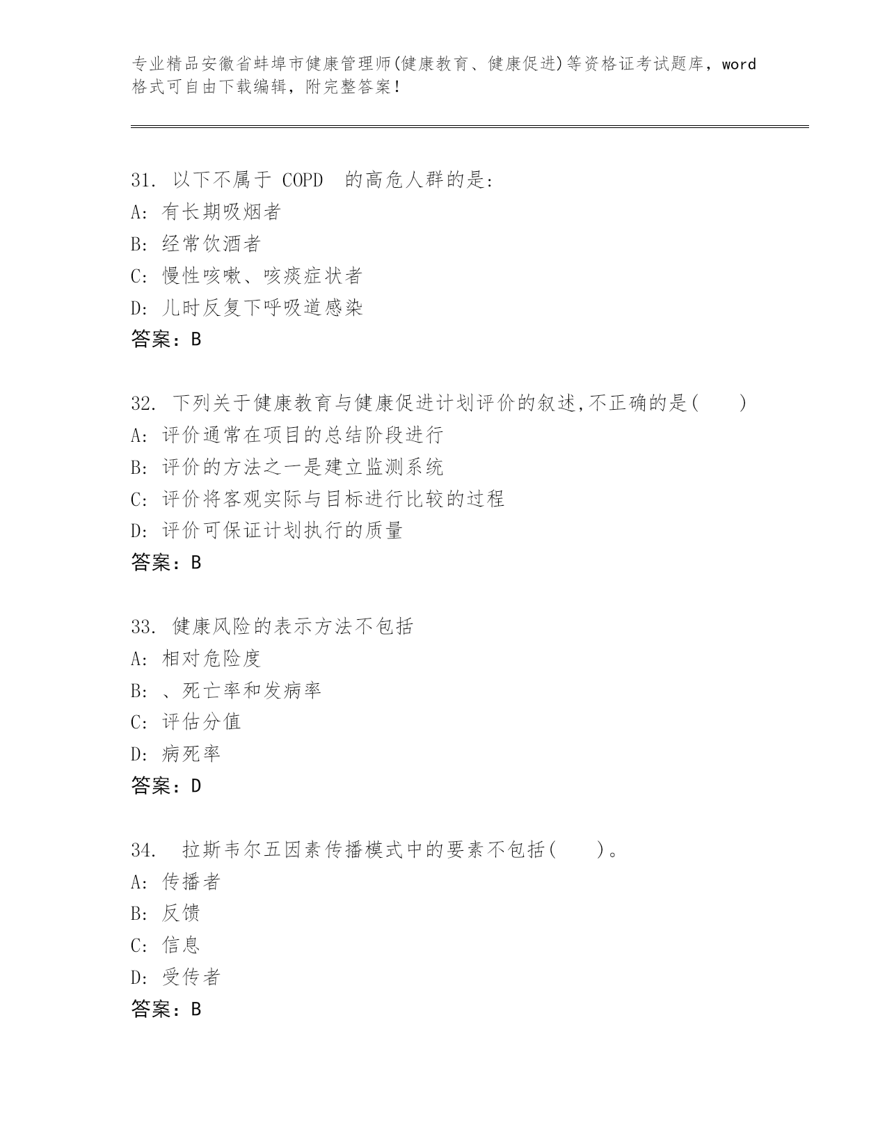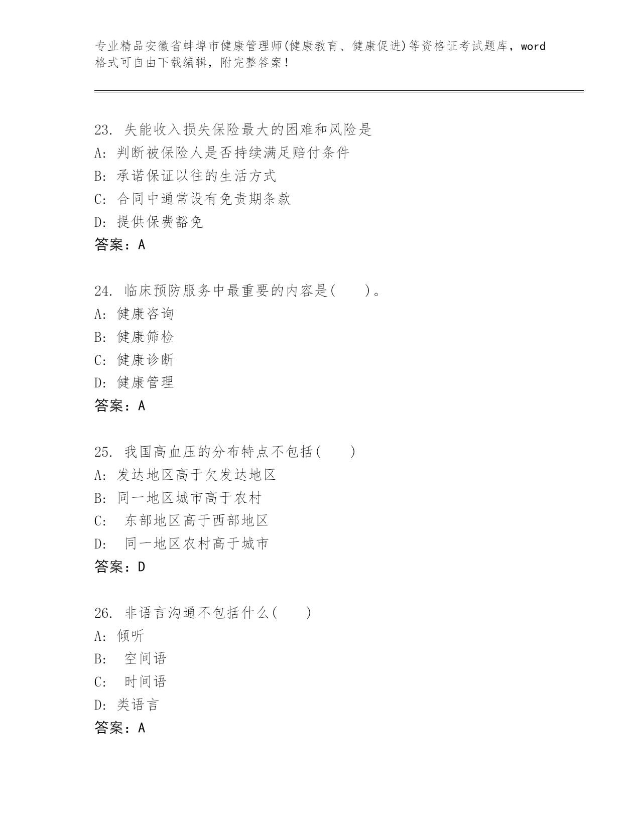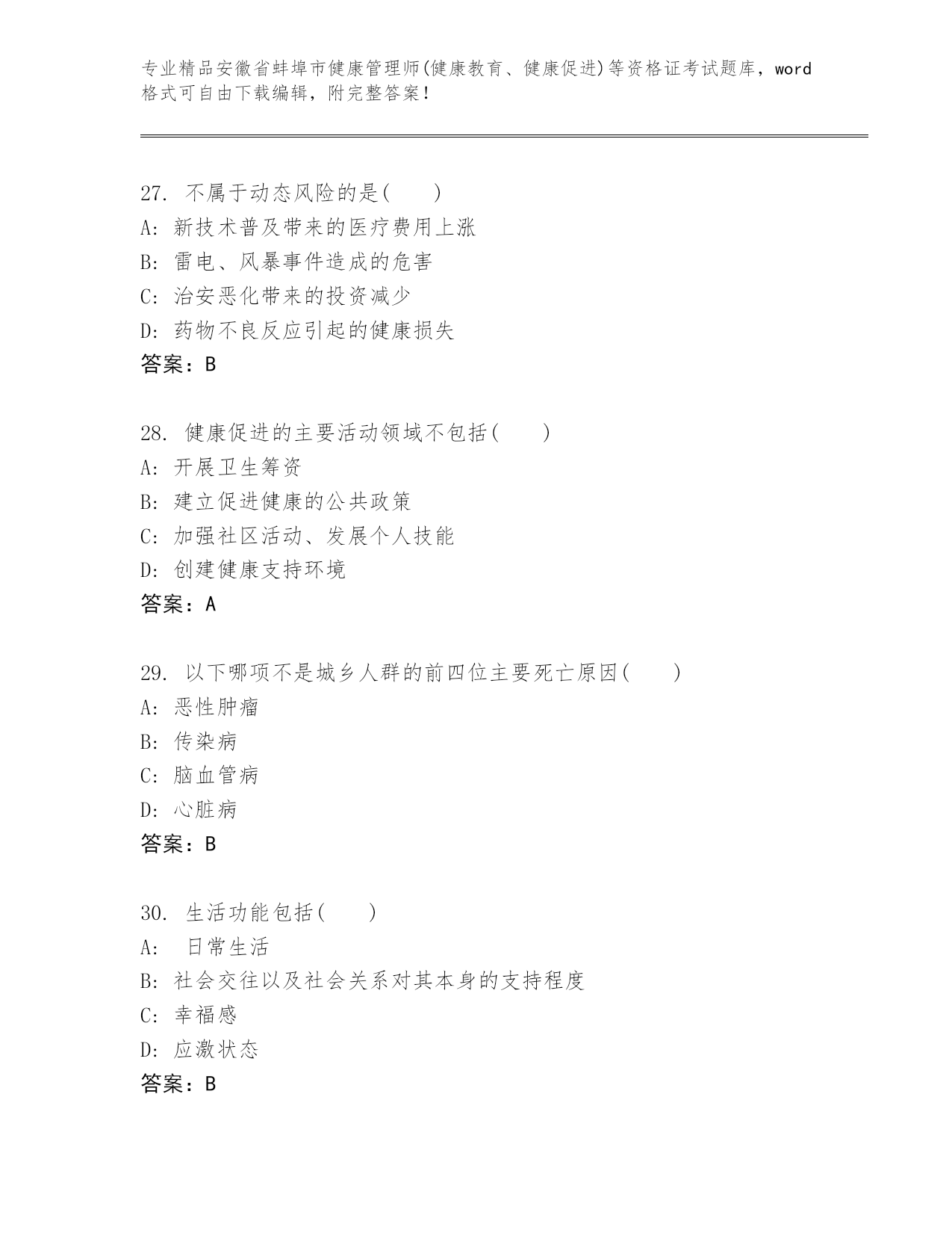 内部培训安徽省蚌埠市健康管理师(健康教育、健康促进)等资格证考试真题(实用)
