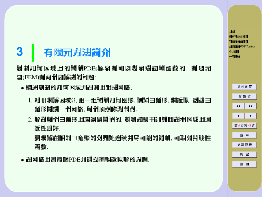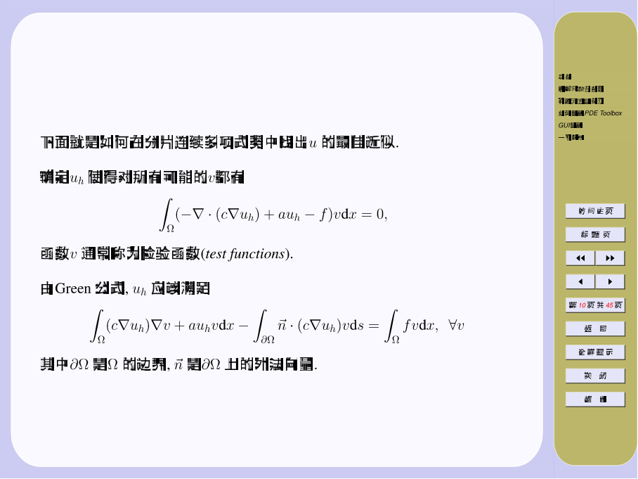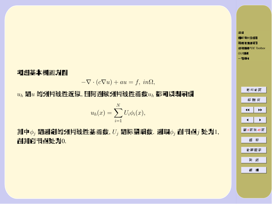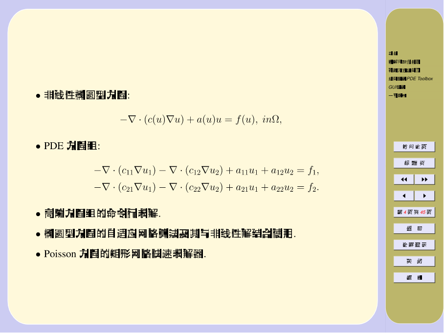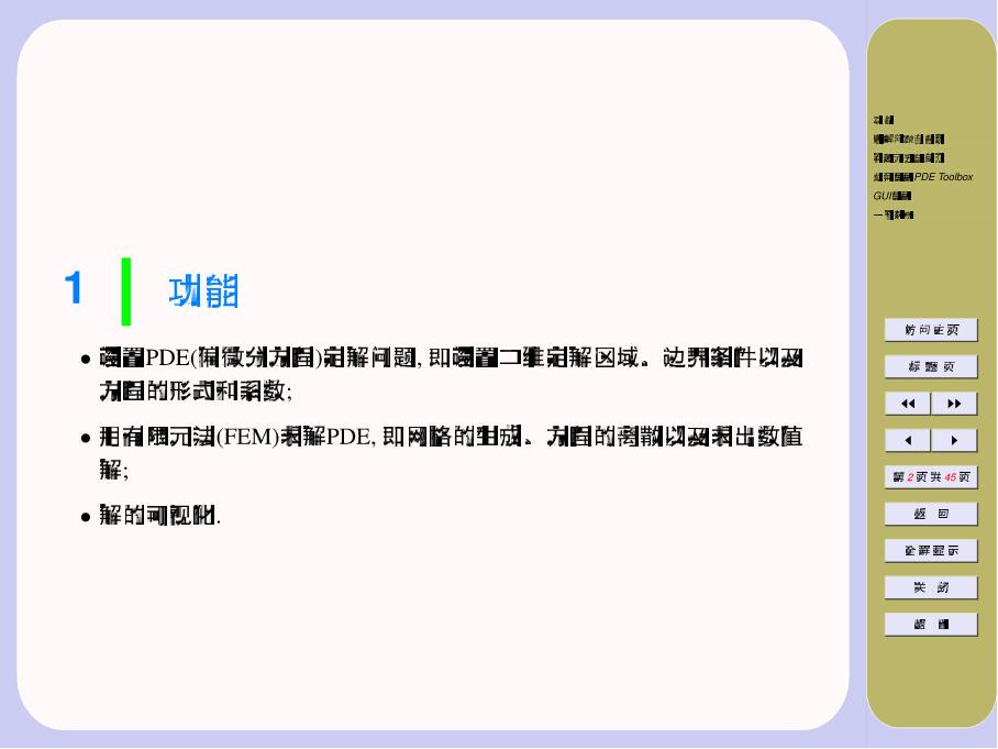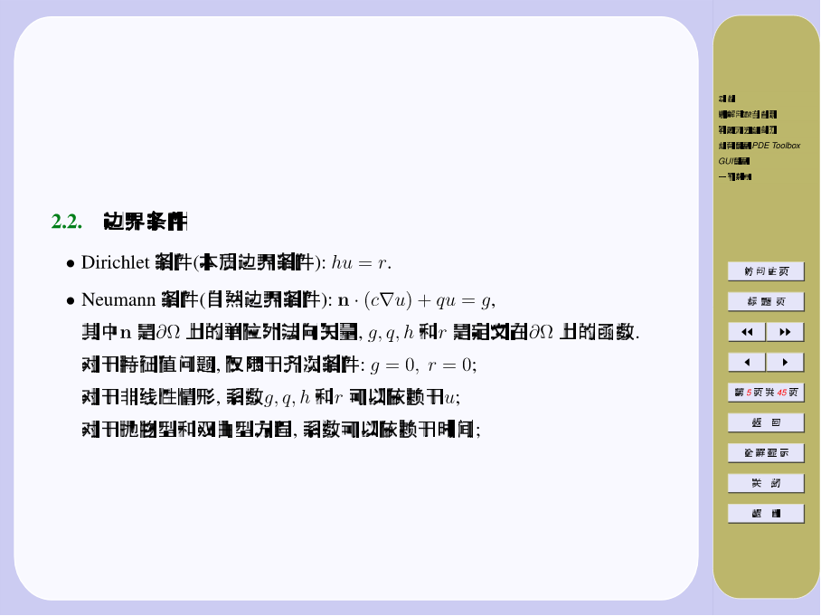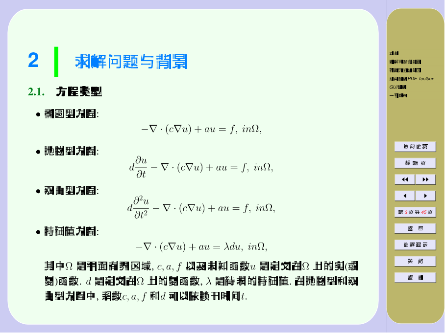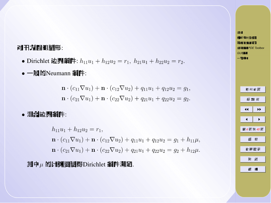 PDEóäõU¦)¯Kµk£{{0XÛ¦^PDEToolboxGUI¦^~f1nùk£{0PDEóäVã¯ÌIKJJIIJIû¤S11¡45£êÆÆ¶w«'4jlunigcc@sina.com.cnòÑõU¦)¯Kµk£{{0XÛ¦^PDEToolboxGUI¦^~f1õU¯Ì•PDE(©§)½)¯K,=½)«!>.^±9IK§/ªÚXê;JJII^k£{¦)=)¤!§lѱ9¦Ñê•(FEM)PDE,JI);12¡45•)Àz.£¶w«'4òÑõU2¦)¯Kµ¦)¯Kµk£{{0XÛ¦^PDEToolboxGUI¦^2.1.§§§aaa...~f•ý.§:−∇·(c∇u)+au=f,inΩ,¯Ì•Ô.§:∂uIKd−∇·(c∇u)+au=f,inΩ,∂tJJII•V.§:∂2uJId−∇·(c∇u)+au=f,inΩ,∂t213¡45•A§:£−∇·(c∇u)+au=λdu,inΩ,¶w«'4Ù¥Ω´²¡k.«,c,a,f±9¼êu´½Â3Ωþ¢(½E)¼ê.d´½Â3ΩþE¼ê,λ´¦A.3Ô.ÚVòÑ.§¥,Xêc,a,fÚd±6umt.õU¦)¯Kµk£{{0XÛ¦^PDEToolboxGUI¦^•5ý.§:~f−∇·(c(u)∇u)+a(u)u=f(u),inΩ,•PDE§|:¯ÌIK−∇·(c11∇u1)−∇·(c12∇u2)+a11u1+a12u2=f1,JJII−∇·(c21∇u1)−∇·(c22∇u2)+a21u1+a22u2=f2.JI•p§|·-1¦).14¡45£•ý.§g·A{9Ù5)(ܦ^.¶w«•Poisson§Ý/¯¦)ì.'4òÑõU¦)¯Kµk£{{0XÛ¦^PDEToolboxGUI¦^~f2.2.>>>...^^^^>.^•Dirichlet():hu=r.¯Ì•Neumann^(g,>.^):n·(c∇u)+qu=g,IKÙ¥n´∂Ωþü©{¥þ,g,q,hÚr´½Â3∂Ωþ¼ê.JJIIéuA¯K,=uàg^:g=0,r=0;JIéu5/,Xêg,q,hÚr±6uu;15¡45éuÔ.ÚV.§,Xê±6um;£¶w«'4òÑõU¦)¯Kµk£{{0éu§|/:XÛ¦^PDEToolboxGUI¦^~f•Dirichlet>.^:h11u1+h12u2=r1,h21u1+h22u2=r2.•Neumann^:n·(c11∇u1)+n·(c12∇u2)+q11u1+q12u2=g1,¯Ìn·(c21∇u1)+n·(c22∇u2)+q21u1+q22u2=g2.IKJJII•·Ü>.^:JIh11u1+h12u2=r1,16¡45£n·(c11∇u1)+n·(c12∇u2)+q11u1+q12u2=g1+h11µ,¶w«n·(c21∇u1)+n·(c22∇u2)+q21u1+q22u2=g2+h12µ.'4Ù¥µO¦Dirichlet^÷v.òÑõU¦)¯Kµk£{{0XÛ¦^PDEToolboxGUI¦^2.3.PDE...µµµ~f5gó§ÚÆNõ©|,Þ~Xe:•ý.ÚÔ.§5g½~Ú½~DѯK¯Ì•õ06ÄÚ*ѯKIK•ýÚNá·>|¯KJJII•³6JI•V.§5g6ÚÅ3(ÑÚ>^|¥DÂ17¡45£•î¨Ä¶w«A¯K5g~X¦)Ú(¨åÆk¨Ä¯K•'4òÑõU¦)¯Kµk£{{0XÛ¦^PDEToolboxk£{{0GUI¦^3~fE,AÛ«þ{üPDEs)¾k±L«¤Ð¼ê.k£{(FEM)kü)û¯K:•£ãE,AÛ«¿3Ùþ)¤;¯ÌIK1.éu¦)«Ω,^|{üAÛã/,~Xn/,5Cq.ùn/¨¤,zº:¡!:.J