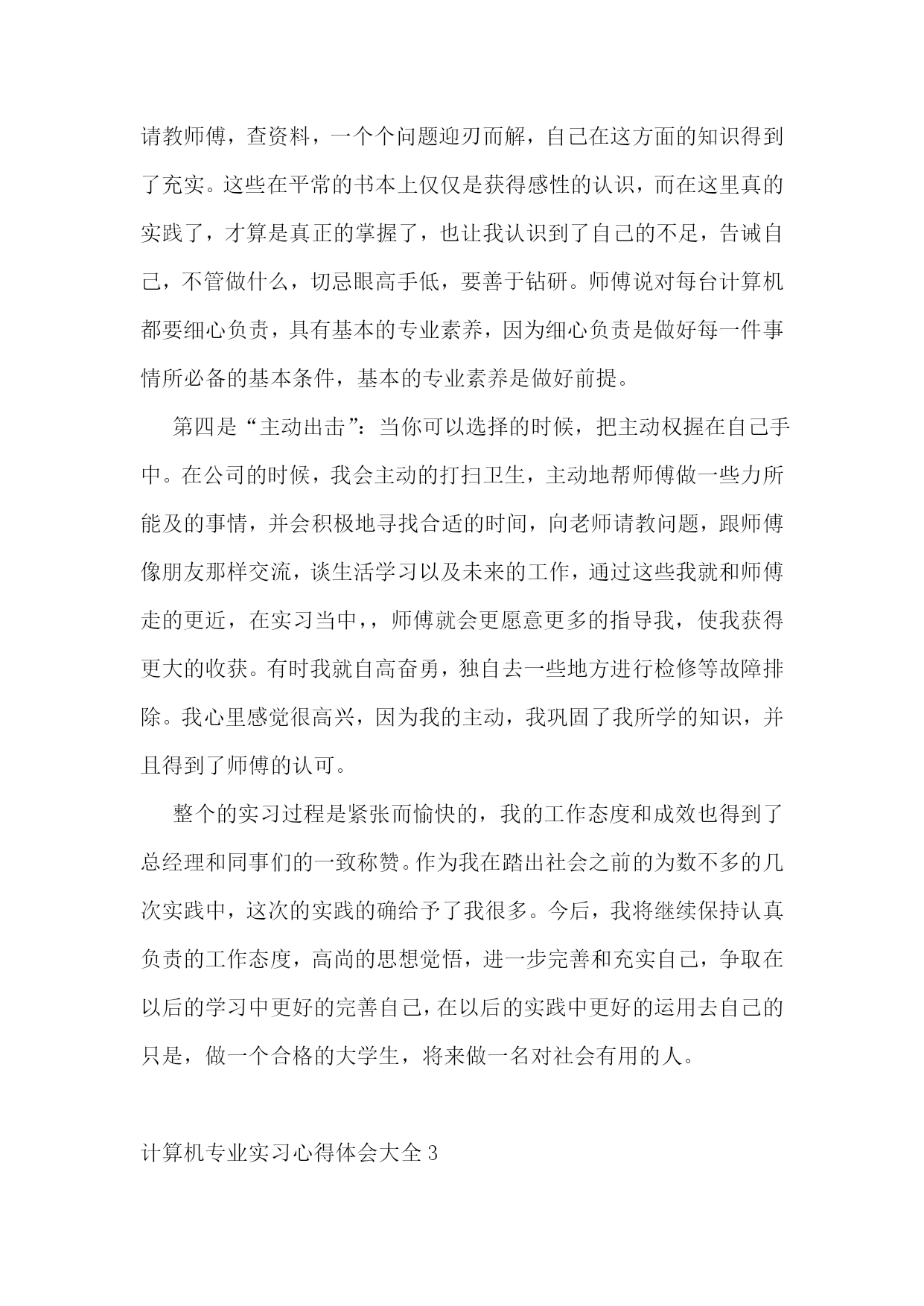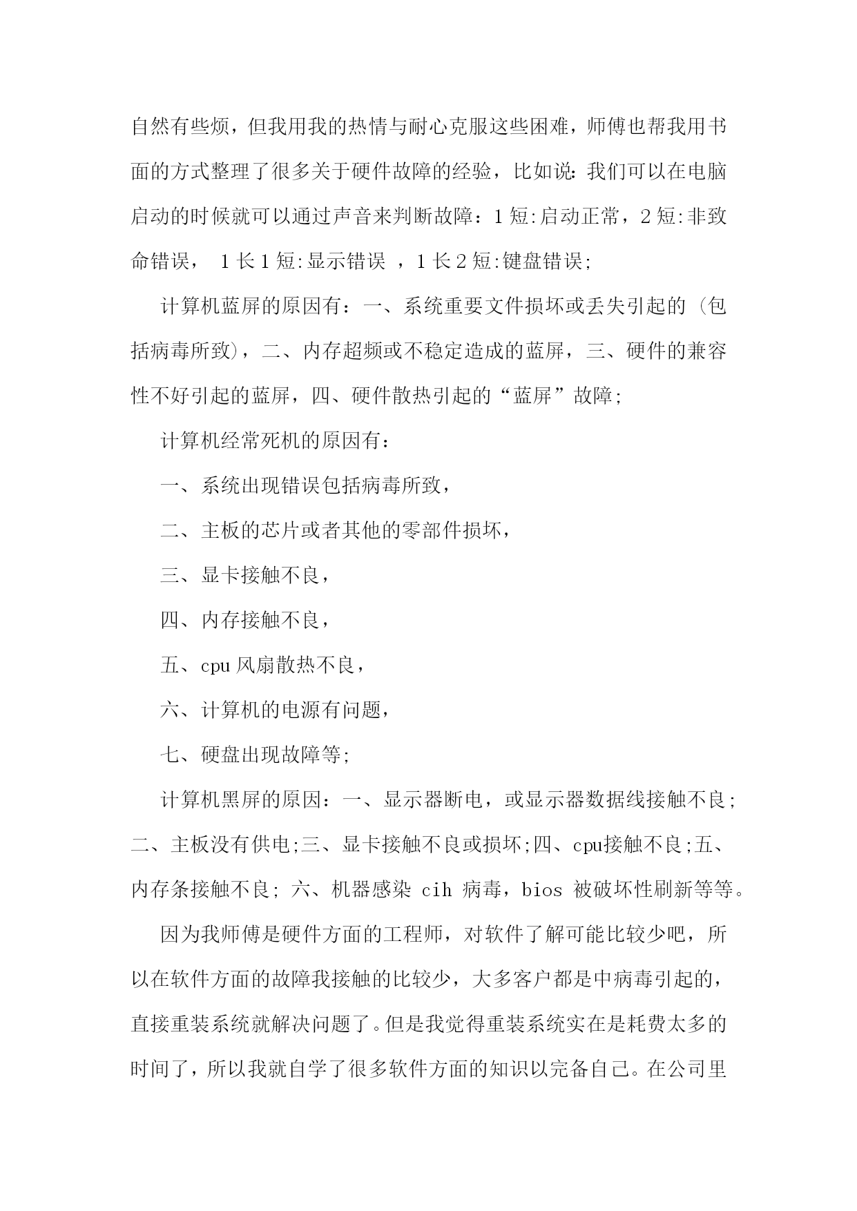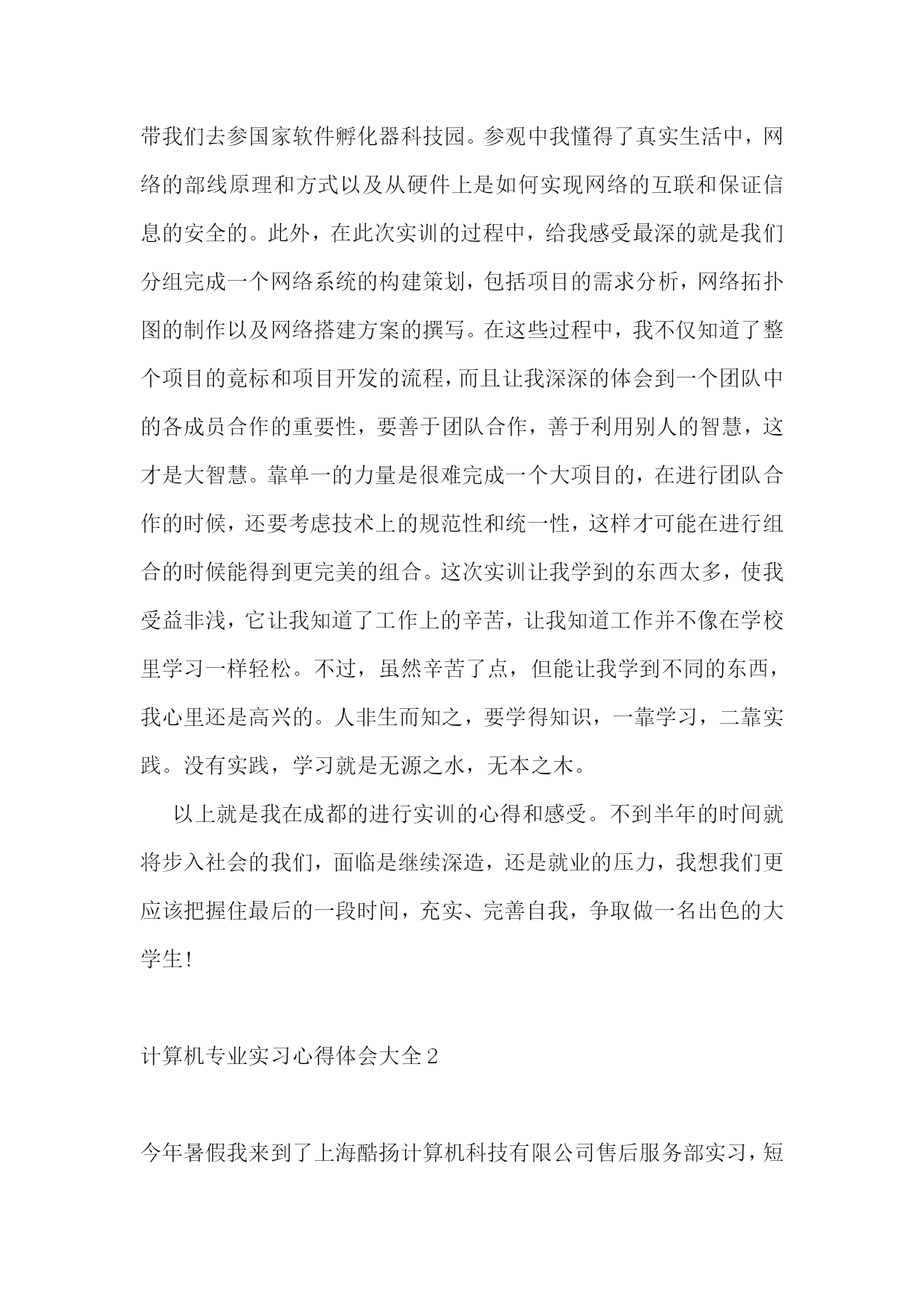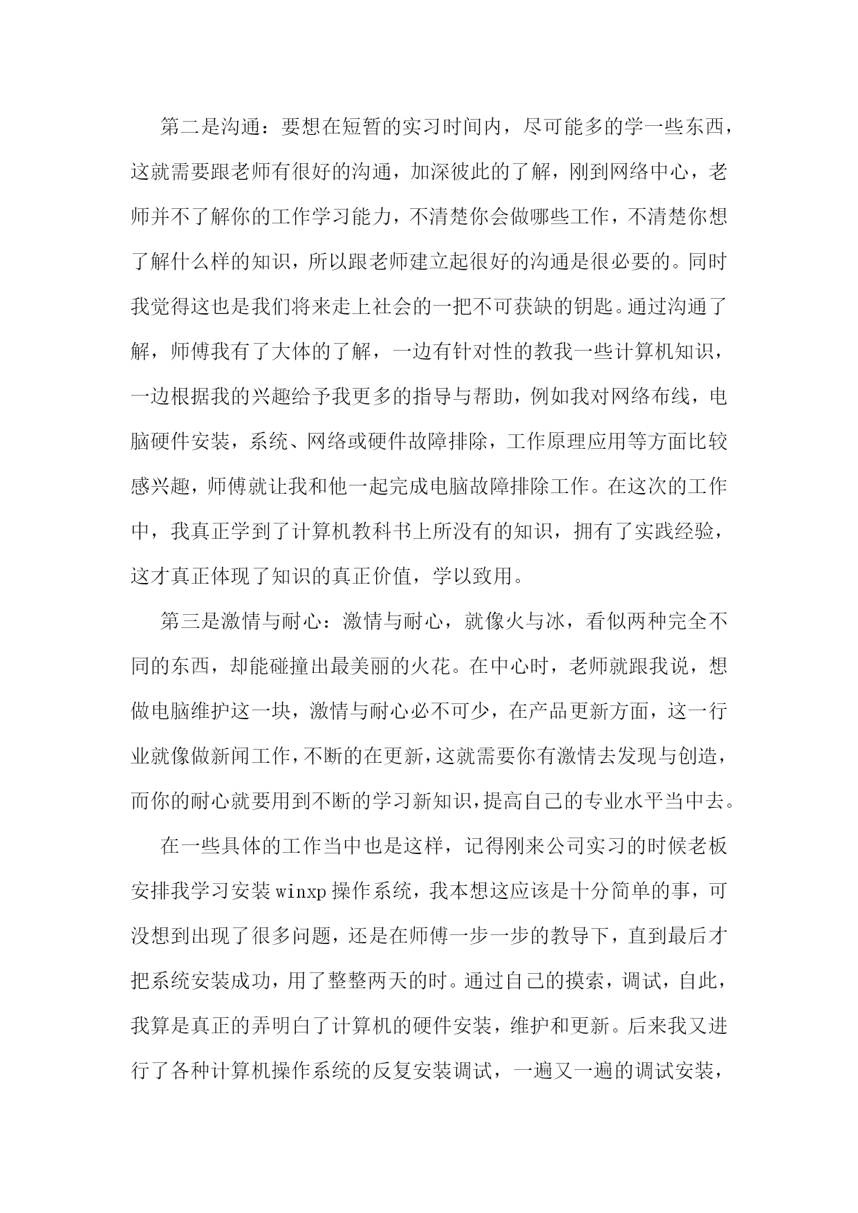 计算机专业实习心得体会大全计算机专业实习心得体会大全1这个暑假,学校安排了我们三、四班学生到四川省国信安信息安全培训基地进行实训,虽然时间不是很长,仅仅为期五天,但是我受益匪浅,这次实训,让我对网络工程及信息安全有了更深的了解,对此次实训,颇有体会。本次实习主要任务是学会局域网的设计与应用,网络互连技术,以及网络应用中如何保证信息的安全,通过理论与实践相结合,进一步加深我们的理论知识。要想在短暂的实训时间内,尽可能能多的学一些东西,这就需要我们跟老师有很好的沟通,加深彼此的了解。刚到培训基地,老师并不了解我们的工作和学习能力,不清楚我们会做那些工作,所以跟老师进行沟通是很必要的。通过沟通了解,老师对我们有了大体了解,便有针对性的教我们一些网络信息安全方面的知识。“纸上得来终觉浅,绝知此事要躬行!”在短暂的实习过程中,让我深深的感觉到自己在实际运用中的专业知识的匮乏。让我们真正领悟到“学无止境”的含义。在实训的课程中,老师给我们讲解了如何进行网络拓扑结构的设计,如何进行网络的部线,路由器及交换机的配置,防火墙和网络检测器IDS的安装和配置等等。在进行实训的过程中,我真正学到了计算机教科书上所没有或者真正用到了课本上的知识,这样,既巩固了旧知识,又掌握了新知识。此外,老师还特地带我们去参国家软件孵化器科技园。参观中我懂得了真实生活中,网络的部线原理和方式以及从硬件上是如何实现网络的互联和保证信息的安全的。此外,在此次实训的过程中,给我感受最深的就是我们分组完成一个网络系统的构建策划,包括项目的需求分析,网络拓扑图的制作以及网络搭建方案的撰写。在这些过程中,我不仅知道了整个项目的竟标和项目开发的流程,而且让我深深的体会到一个团队中的各成员合作的重要性,要善于团队合作,善于利用别人的智慧,这才是大智慧。靠单一的力量是很难完成一个大项目的,在进行团队合作的时候,还要考虑技术上的规范性和统一性,这样才可能在进行组合的时候能得到更完美的组合。这次实训让我学到的东西太多,使我受益非浅,它让我知道了工作上的辛苦,让我知道工作并不像在学校里学习一样轻松。不过,虽然辛苦了点,但能让我学到不同的东西,我心里还是高兴的。人非生而知之,要学得知识,一靠学习,二靠实践。没有实践,学习就是无源之水,无本之木。以上就是我在成都的进行实训的心得和感受。不到半年的时间就将步入社会的我们,面临是继续深造,还是就业的压力,我想我们更应该把握住最后的一段时间,充实、完善自我,争取做一名出色的大学生!计算机专业实习心得体会大全2今年暑假我来到了上海酷扬计算机科技有限公司售后服务部实习,短短1个月的工作过程使我受益匪浅。不仅计算机专业知识增长了,最主要是懂得了如何更好的为人处事。当今社会一直处在加速的发展变化中,所以对人才的要求也越来越高,我们要用发展的眼光看问题,就要不断提高思想认识,完善自我。师傅说作为一名it从业者,所受的社会压力将比其他行业更加沉重,要学会创新求变,以适应社会的需要。如果是在单位,那就更需要掌握全面的计算机知识,因为小到计算机的组装维修,大到服务器的维护与测试,都需要一个人独立完成。可以说,近1个月的工作使我成长了很多,从中有很多感悟,下面就是我的一点体会:第一是要真诚:你可以伪装你的面孔你的心,但绝不可以忽略真诚的力量。第一天去服务部实习,心里不可避免的有些疑惑:不知道师傅怎么样,应该去怎么做啊,要去干些什么等等!踏进公司的办公室,只见几个陌生的脸孔用莫名而疑惑的眼神看着我。我微笑着和他们打招呼,尴尬的局面立刻得到了缓解,大家多很友善的微笑欢迎我的到来。从那天起,我养成了一个习惯,每天早上见到他们都要微笑的说声:“师傅早”,那是我心底真诚的问候。我总觉得,经常有一些细微的东西容易被我们忽略,比如轻轻的一声问候,但它却表达了对老师同事对朋友的尊重关心,也让他人感觉到被重视与被关心。仅仅几天的时间,我就和师傅们打成一片,很好的跟他们交流沟通学习,我想,应该是我的真诚,换得了老师的信任。他们把我当朋友也愿意指导我,愿意分配给我任务。第二是沟通:要想在短暂的实习时间内,尽可能多的学一些东西,这就需要跟老师有很好的沟通,加深彼此的了解,刚到网络中心,老师并不了解你的工作学习能力,不清楚你会做哪些工作,不清楚你想了解什么样的知识,所以跟老师建立起很好的沟通是很必要的。同时我觉得这也是我们将来走上社会的一把不可获缺的钥匙。通过沟通了解,师傅我有了大体的了解,一边有针对性的教我一些计算机知识,一边根据我的兴趣给予我更多的指导与帮助,例如我对网络布线,电脑硬件安装,系统、网络或硬件故障排除,工作原理应用等方面比较感兴趣,师傅就让我和他一起完成电脑故障排除工作。在这次的工作中,我真正学到了计算机教科书上所没有的知识,拥有了实践经验,这才真正体