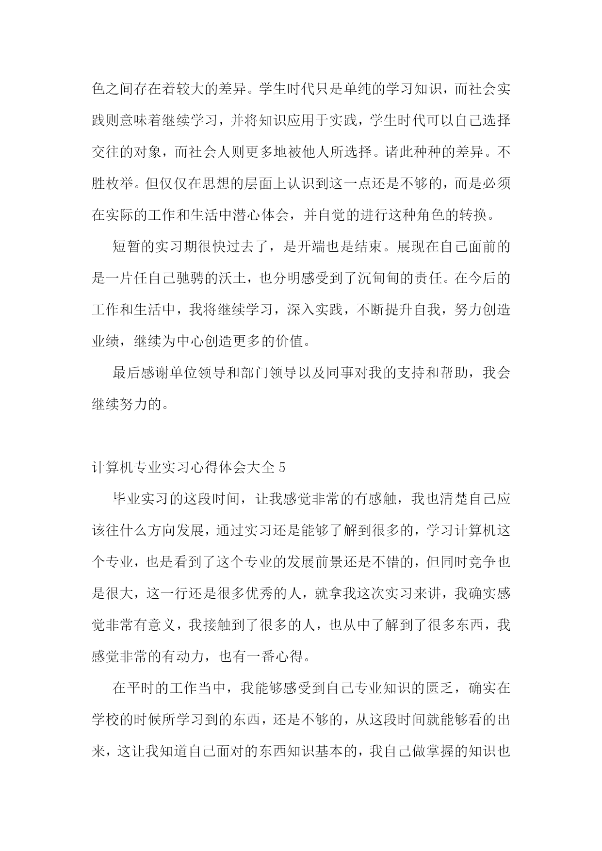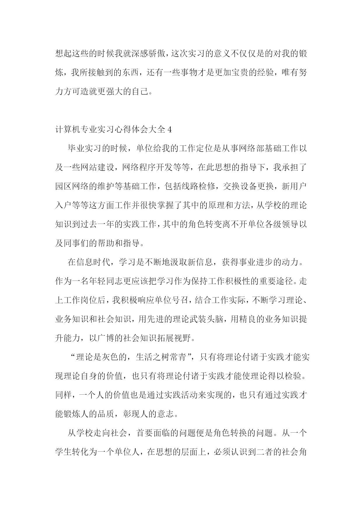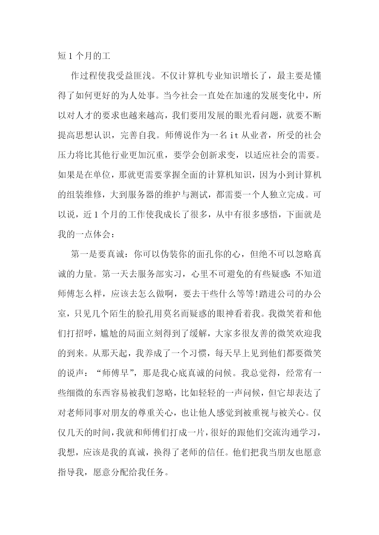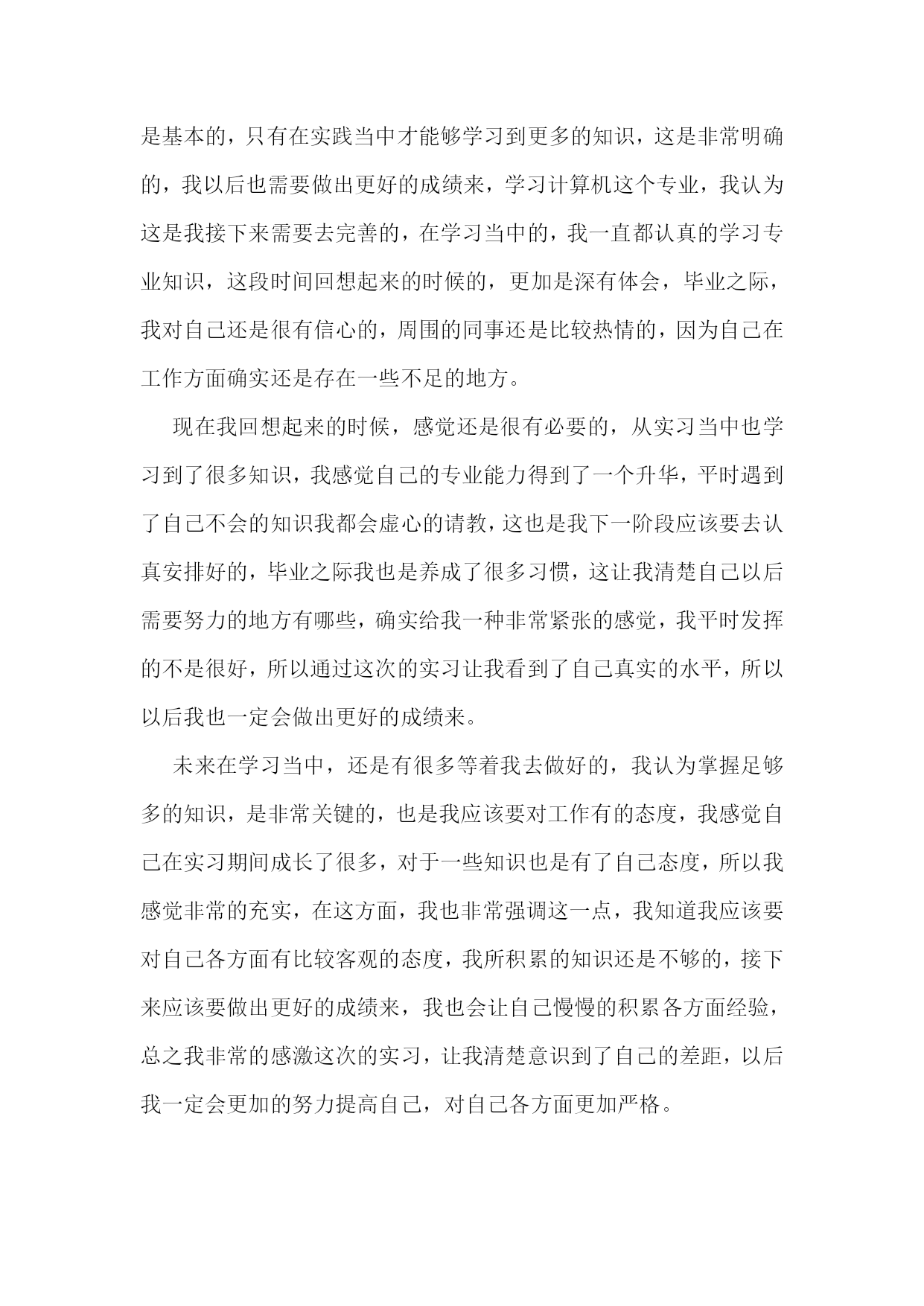 计算机专业实习心得体会大全计算机专业实习心得体会大全1这个暑假,学校安排了我们三、四班学生到四川省国信安信息安全培训基地进行实训,虽然时间不是很长,仅仅为期五天,但是我受益匪浅,这次实训,让我对网络工程及信息安全有了更深的了解,对此次实训,颇有体会。本次实习主要任务是学会局域网的设计与应用,网络互连技术,以及网络应用中如何保证信息的安全,通过理论与实践相结合,进一步加深我们的理论知识。要想在短暂的实训时间内,尽可能能多的学一些东西,这就需要我们跟老师有很好的沟通,加深彼此的了解。刚到培训基地,老师并不了解我们的工作和学习能力,不清楚我们会做那些工作,所以跟老师进行沟通是很必要的。通过沟通了解,老师对我们有了大体了解,便有针对性的教我们一些网络信息安全方面的知识。“纸上得来终觉浅,绝知此事要躬行!”在短暂的实习过程中,让我深深的感觉到自己在实际运用中的专业知识的匮乏。让我们真正领悟到“学无止境”的含义。在实训的课程中,老师给我们讲解了如何进行网络拓扑结构的设计,如何进行网络的部线,路由器及交换机的配置,防火墙和网络检测器IDS的安装和配置等等。在进行实训的过程中,我真正学到了计算机教科书上所没有或者真正用到了课本上的知识,这样,既巩固了旧知识,又掌握了新知识。此外,老师还特地带我们去参国家软件孵化器科技园。参观中我懂得了真实生活中,网络的部线原理和方式以及从硬件上是如何实现网络的互联和保证信息的安全的。此外,在此次实训的过程中,给我感受最深的就是我们分组完成一个网络系统的构建策划,包括项目的需求分析,网络拓扑图的制作以及网络搭建方案的撰写。在这些过程中,我不仅知道了整个项目的竟标和项目开发的流程,而且让我深深的体会到一个团队中的各成员合作的重要性,要善于团队合作,善于利用别人的智慧,这才是大智慧。靠单一的力量是很难完成一个大项目的,在进行团队合作的时候,还要考虑技术上的规范性和统一性,这样才可能在进行组合的时候能得到更完美的组合。这次实训让我学到的东西太多,使我受益非浅,它让我知道了工作上的辛苦,让我知道工作并不像在学校里学习一样轻松。不过,虽然辛苦了点,但能让我学到不同的东西,我心里还是高兴的。人非生而知之,要学得知识,一靠学习,二靠实践。没有实践,学习就是无源之水,无本之木。以上就是我在成都的进行实训的心得和感受。不到半年的时间就将步入社会的我们,面临是继续深造,还是就业的压力,我想我们更应该把握住最后的一段时间,充实、完善自我,争取做一名出色的大学生!计算机专业实习心得体会大全2今年暑假我来到了上海酷扬计算机科技有限公司售后服务部实习,短短1个月的工作过程使我受益匪浅。不仅计算机专业知识增长了,最主要是懂得了如何更好的为人处事。当今社会一直处在加速的发展变化中,所以对人才的要求也越来越高,我们要用发展的眼光看问题,就要不断提高思想认识,完善自我。师傅说作为一名it从业者,所受的社会压力将比其他行业更加沉重,要学会创新求变,以适应社会的需要。如果是在单位,那就更需要掌握全面的计算机知识,因为小到计算机的组装维修,大到服务器的维护与测试,都需要一个人独立完成。可以说,近1个月的工作使我成长了很多,从中有很多感悟,下面就是我的一点体会:第一是要真诚:你可以伪装你的面孔你的心,但绝不可以忽略真诚的力量。第一天去服务部实习,心里不可避免的有些疑惑:不知道师傅怎么样,应该去怎么做啊,要去干些什么等等!踏进公司的办公室,只见几个陌生的脸孔用莫名而疑惑的眼神看着我。我微笑着和他们打招呼,尴尬的局面立刻得到了缓解,大家多很友善的微笑欢迎我的到来。从那天起,我养成了一个习惯,每天早上见到他们都要微笑的说声:“师傅早”,那是我心底真诚的问候。我总觉得,经常有一些细微的东西容易被我们忽略,比如轻轻的一声问候,但它却表达了对老师同事对朋友的尊重关心,也让他人感觉到被重视与被关心。仅仅几天的时间,我就和师傅们打成一片,很好的跟他们交流沟通学习,我想,应该是我的真诚,换得了老师的信任。他们把我当朋友也愿意指导我,愿意分配给我任务。第二是沟通:要想在短暂的实习时间内,尽可能多的学一些东西,这就需要跟老师有很好的沟通,加深彼此的了解,刚到网络中心,老师并不了解你的工作学习能力,不清楚你会做哪些工作,不清楚你想了解什么样的知识,所以跟老师建立起很好的沟通是很必要的。同时我觉得这也是我们将来走上社会的一把不可获缺的钥匙。通过沟通了解,师傅我有了大体的了解,一边有针对性的教我一些计算机知识,一边根据我的兴趣给予我更多的指导与帮助,例如我对网络布线,电脑硬件安装,系统、网络或硬件故障排除,工作原理应用等方面比较感兴趣,师傅就让我和他一起完成电脑故障排除工作。在这次的工作中,我真正学到了计算机教科书上所没有的知识,拥有了实践经验,这才真正体