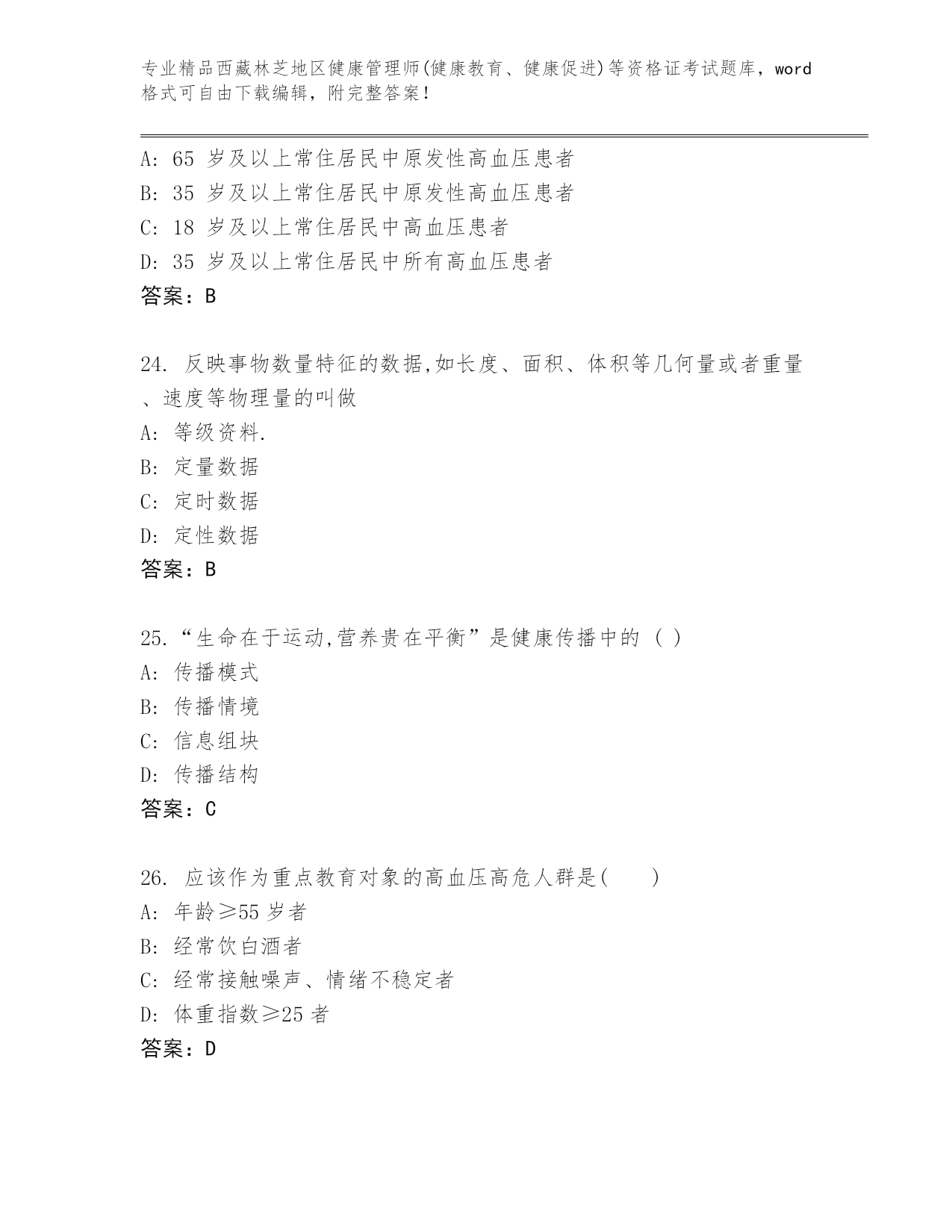 最新西藏林芝地区健康管理师(健康教育、健康促进)等资格证考试优选题库附答案(达标题).docx