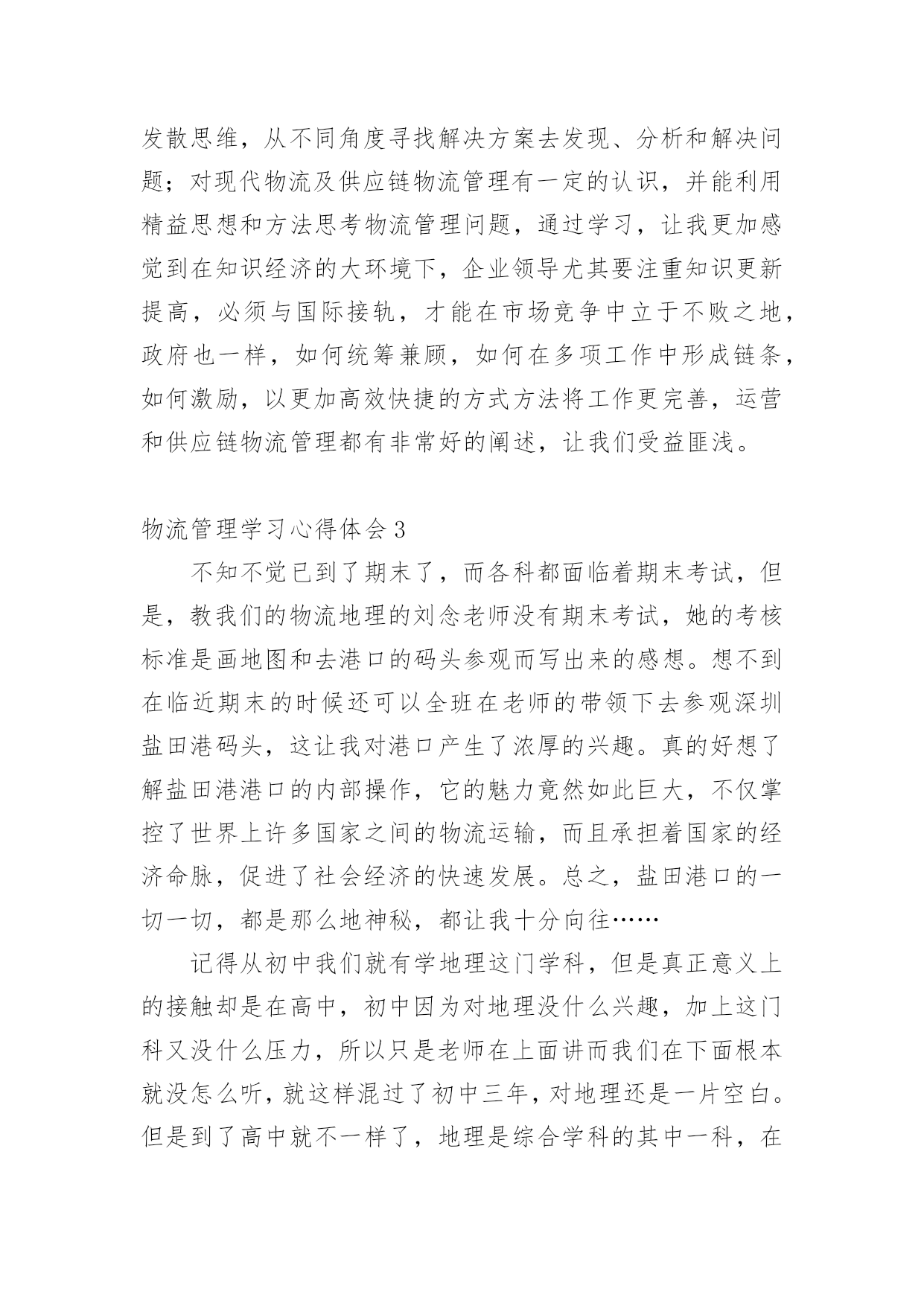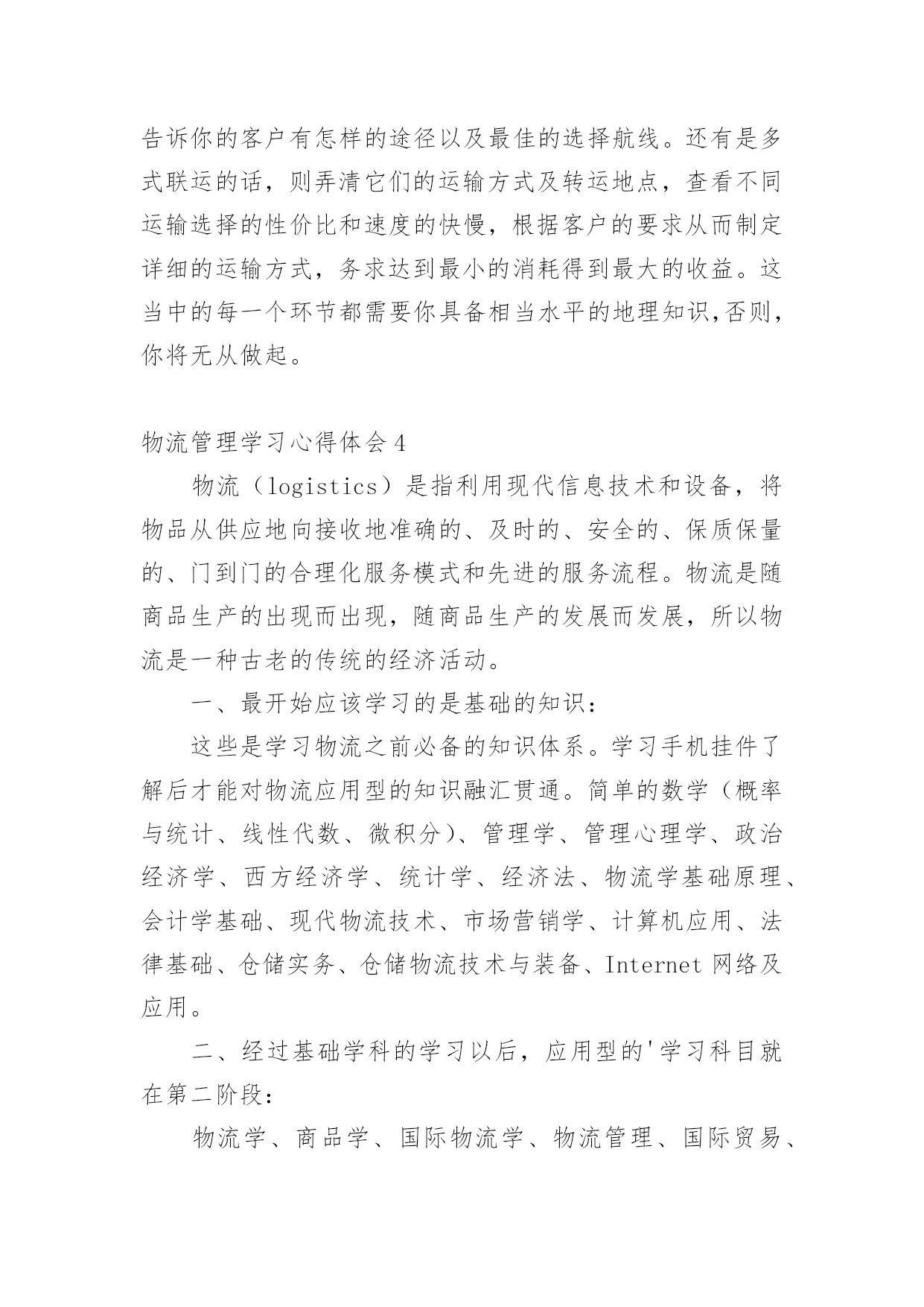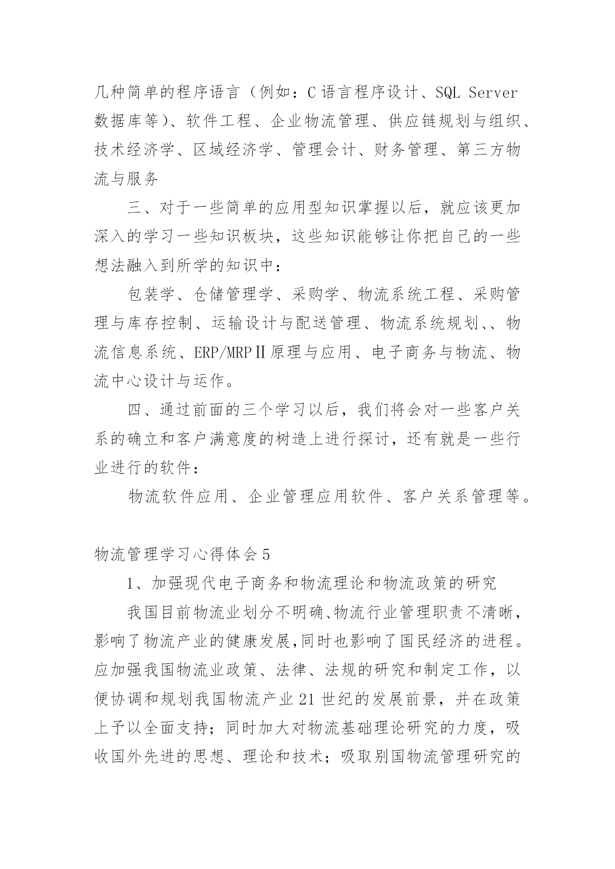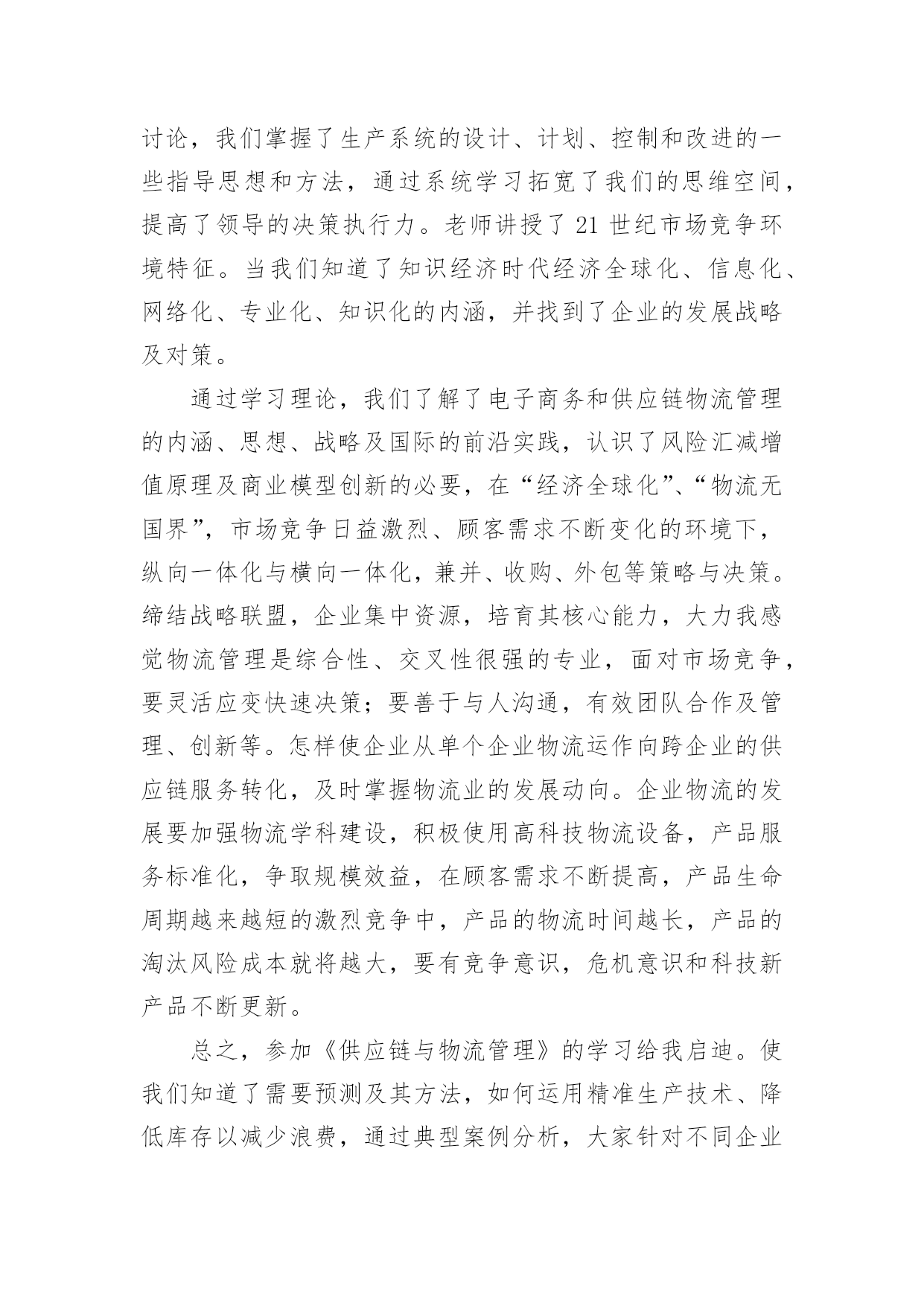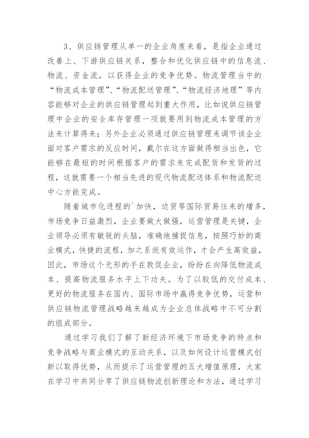 物流管理学习心得体会当我们积累了新的体会时,有这样的时机,要好好记录下来,这样可以不断更新自己的想法。相信许多人会觉得心得体会很难写吧,以下是小编精心整理的物流管理学习心得体会,仅供参考,希望能够帮助到大家。物流管理学习心得体会1随着学习的深入和对物流专业的了解,我发现学习物流是我明智的选择。因为物流是经济活动的桥梁,物流专业是时代发展的'需要,也给了我提供了一个向上发展的契机。物流专业是行业自考的新尝试,最大的受益者就是我们自考生,学校的规范管理和中交协的行业经验是我成长的沃土,而且我们不仅可以拿到学历文凭同时还可以拿到职业资格证书。当通过老师得知我国在这个领域里还处于摸索阶段时,我暗下决心,要努力成为一个优秀的物流人才,为这一空白涂上绚丽的色彩。3年的学习中,我最大的收获是掌握了物流方面的基本知识,并在“物流基础”考试中取得了××分的好成绩。“课前预习,课上认真听,课后复习”字虽不多,但这是我学习的秘诀。我的体会,要选择自考,就要选择勤奋和坚强,就要始终保持一颗永不言败的心,一股永不磨灭的斗志!每一次取得了好成绩,我不会洋洋得意,因为我知道还有其他的课程等着我,学习虽苦,但我会坚持,在自考这座高峰前面,我就是想看日出的人,为着这个梦想,我发誓走到底!物流管理学习心得体会2通过参加《供应链与物流管理》的学习,从对物流概念的模糊不清到如今有了初步的了解,对物流的运输、存储、装卸、搬运、包装、流通加工、配送、信息处理等基本概念有了基本的理解,也形成了自己对物流业的一些看法。也深刻感受到物流业已经成为我国经济发展的瓶颈,物流业的发展对我国经济的健康发展有着关键的影响。我学习了物流管理与供应链管理各自的概念以及他们之间的关系和他们在生产制造和流通及销售环节中各自的重要性。无论是在物流企业还是在生产制造企业,物流活动都是企业生产运作的重要内容之一,而且在生产水平不断完善的今天,物流成本的控制已经成为了第三利润源。1、现代物流指的是将信息、运输、仓储、库存、装卸搬运以及包装等物流活动综合起来的一种新型的集成式管理,其任务是尽可能降低物流的总成本,为顾客提供最好的服务。2、电子商务方面用淘宝举例:在淘宝上买东西,只有商流和资金流在淘宝网站上完成,而交易的完成则需要物流的支持,没有各个快递公司来完成物流活动,只有商流和资金流的流动是没有办法完成电子商务过程的。所以物流对电子商务应该起到一个支持的作用,是电子商务必不可少的一个环节。3、供应链管理从单一的企业角度来看,是指企业通过改善上、下游供应链关系,整合和优化供应链中的信息流、物流、资金流,以获得企业的竞争优势。物流管理当中的“物流成本管理”、“物流配送管理”、“物流经济地理”等内容能够对企业的供应链管理起到重大作用,比如说供应链管理中企业的安全库存管理一项就要用到物流成本管理的方法来计算得来;另外企业必须通过供应链管理来调节该企业面对客户需求的反应时间,戴尔在这方面做得相当出色,它能够在最短的时间根据客户的需求来完成配货和发货的过程,这就需要一个相当先进的现代物流配送体系和物流配送中心方能完成。随着城市化进程的`加快,边贸等国际贸易往来的增多,市场竞争日益激烈,企业要做大做强,运营管理是关键,企业领导必须有敏锐的头脑,准确地捕捉信息,按照巧妙的商业模式,快捷的流程,加之系统有效运作,才会产生高效益,因此,市场这个无形的手在敦促企业,纷纷在向降低物流成本、提高物流服务水平上下功夫。为了以较低的交付成本、更好的物流服务在国内、国际市场中赢得竞争优势,运营和供应链物流管理战略越来越成为企业总体战略中不可分割的组成部分。通过学习我们了解了新经济环境下市场竞争的特点和竞争战略与商业模式的互动关系,以及如何设计运营模式创新以取得优势,从而提示了运营管理的五大增值原理,大家在学习中共同分享了供应链物流创新理论和方法,通过学习讨论,我们掌握了生产系统的设计、计划、控制和改进的一些指导思想和方法,通过系统学习拓宽了我们的思维空间,提高了领导的决策执行力。老师讲授了21世纪市场竞争环境特征。当我们知道了知识经济时代经济全球化、信息化、网络化、专业化、知识化的内涵,并找到了企业的发展战略及对策。通过学习理论,我们了解了电子商务和供应链物流管理的内涵、思想、战略及国际的前沿实践,认识了风险汇减增值原理及商业模型创新的必要,在“经济全球化”、“物流无国界”,市场竞争日益激烈、顾客需求不断变化的环境下,纵向一体化与横向一体化,兼并、收购、外包等策略与决策。缔结战略联盟,企业集中资源,培育其核心能力,大力我感觉物流管理是综合性、交叉性很强的专业,面对市场竞争,要灵活应变快速决策;要善于与人沟通,有效团队合作及管理、创新等。怎样使企业从单个企业物流运作向跨企业的供应链服务转化,及时掌握物流业的发展动向。企业物流的发