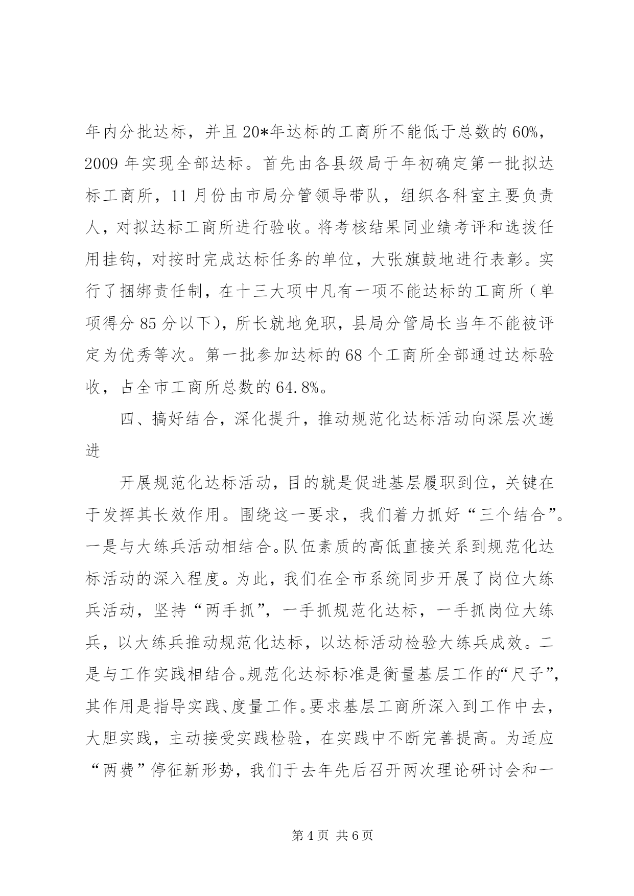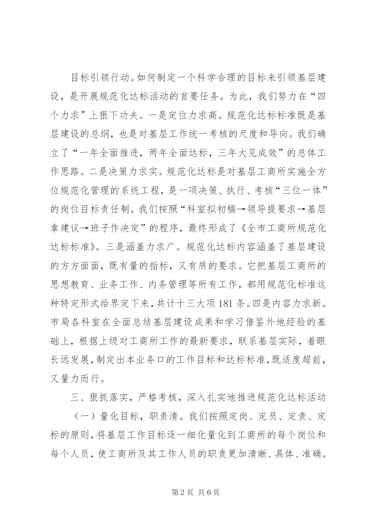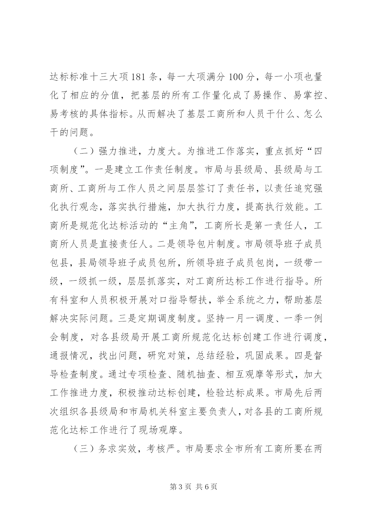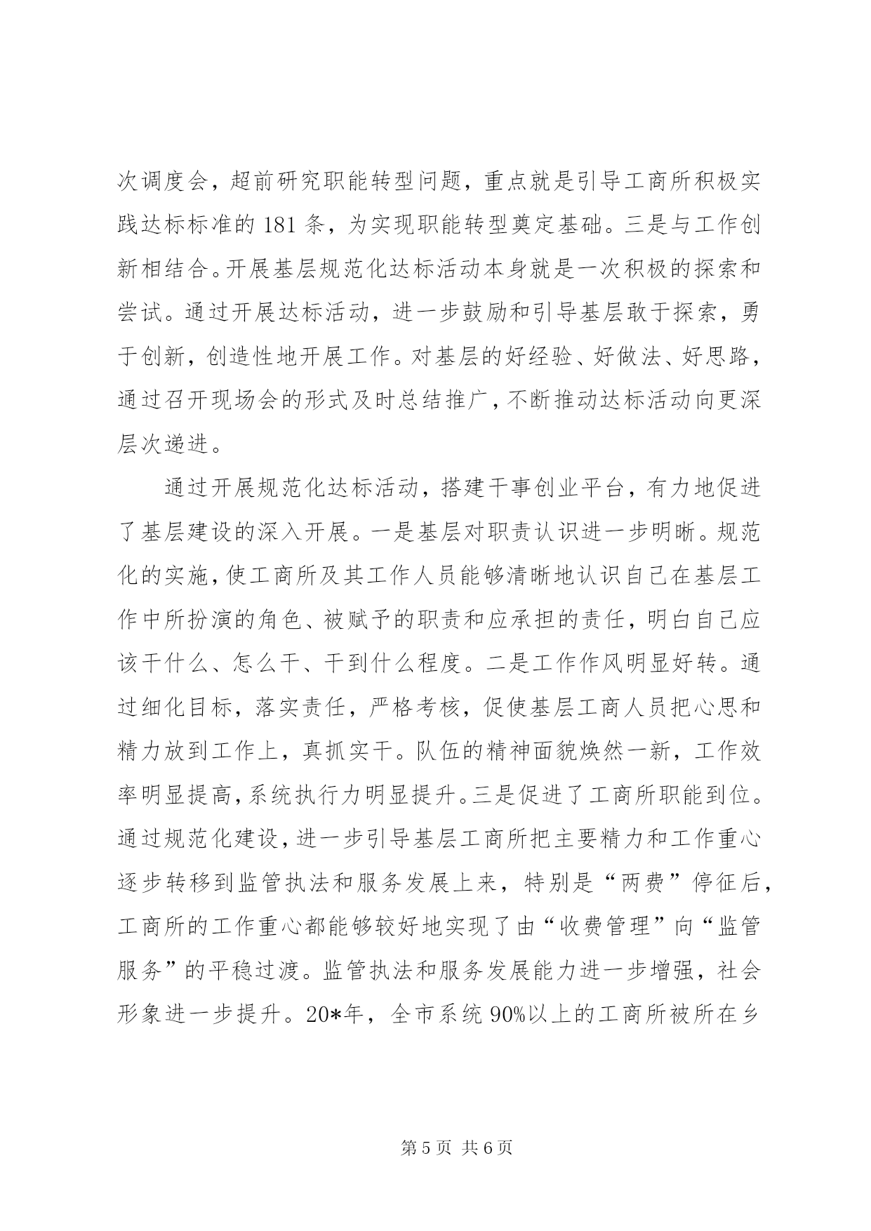 第PAGE\*Arabic\*MERGEFORMAT6页共NUMPAGES\*MERGEFORMAT6页工商局基层建设方案20*年,*市工商局为适应不断变化的新形势,立足系统实际,着眼长远发展,明确目标,强力推进,扎实有效地开展了“基层规范化达标”活动,有力地促进了系统基层建设整体水平的进一步提升。一、顺应大势,积极主动,以规范化引领基层工商工作随着形势发展,特别是“两费”停征后,工商部门需要把更多的精力放到加强和改进监管执法上来,切实履好职、尽好责。而实现履职到位的关键是基层工商所建设,有效方式是落实属地监管责任制。目前基层工商部门存在的职能不明、职责不清、监管不到位的问题,迫切需要我们建立一套目标明确、职责清晰、科学合理、系统完整、便于操作的机制来规范基层建设工作。鉴于此,我们在深入调研的基础上,在全市工商所广泛开展了“基层规范化达标”活动,把基层工商所的思想教育、业务工作、内务管理等工作量化、细化,统一标准,将规范化的管理理念、科学标准、规范程序融入到工作中的每个细节。其核心内容就是引入规范化管理的理念,促进工作规范、行为规范和装备规范,使各项工作都有章可循、有章必循,变指令“派工式”工作模式为按岗位职责运作的工作模式,逐步实现从“人管人”向“制度管人”、从“要我做”向“我要做”的转变。二、立足实际,着眼长远,科学合理地确立规范化达标目标目标引领行动。如何制定一个科学合理的目标来引领基层建设,是开展规范化达标活动的首要任务。为此,我们努力在“四个力求”上狠下功夫。一是定位力求高。规范化达标标准既是基层建设的总纲,也是对基层工作统一考核的尺度和导向。我们确立了“一年全面推进,两年全面达标,三年大见成效”的总体工作思路。二是决策力求实。规范化达标是对基层工商所实施全方位规范化管理的系统工程,是一项决策、执行、考核“三位一体”的岗位目标责任制。我们按照“科室拟初稿→领导提要求→基层拿建议→班子作决定”的程序,最终形成了《全市工商所规范化达标标准》。三是涵盖力求广。规范化达标内容涵盖了基层建设的方方面面,既有量的指标,又有质的要求。它把基层工商所的思想教育、业务工作、内务管理等所有工作,都用规范化标准这种特定形式给界定下来,共计十三大项181条。四是内容力求新。市局各科室在全面总结基层建设成果和学习借鉴外地经验的基础上,根据上级对工商所工作的最新要求,联系基层实际,着眼长远发展,制定出本业务口的工作目标和达标标准,既适度超前,又量力而行。三、狠抓落实,严格考核,深入扎实地推进规范化达标活动(一)量化目标,职责清。我们按照定岗、定员、定责、定标的原则,将基层工作目标逐一细化量化到工商所的每个岗位和每个人员,使工商所及其工作人员的职责更加清晰、具体、准确。达标标准十三大项181条,每一大项满分100分,每一小项也量化了相应的分值,把基层的所有工作量化成了易操作、易掌控、易考核的具体指标。从而解决了基层工商所和人员干什么、怎么干的问题。(二)强力推进,力度大。为推进工作落实,重点抓好“四项制度”。一是建立工作责任制度。市局与县级局、县级局与工商所、工商所与工作人员之间层层签订了责任书,以责任追究强化执行观念,落实执行措施,加大执行力度,提高执行效能。工商所是规范化达标活动的“主角”,工商所长是第一责任人,工商所人员是直接责任人。二是领导包片制度。市局领导班子成员包县,县局领导班子成员包所,所领导班子成员包岗,一级带一级,一级抓一级,层层抓落实,对工商所达标工作进行指导。所有科室和人员积极开展对口指导帮扶,举全系统之力,帮助基层解决实际问题。三是定期调度制度。坚持一月一调度、一季一例会制度,对各县级局开展工商所规范化达标创建工作进行调度,通报情况,找出问题,研究对策,总结经验,巩固成果。四是督导检查制度。通过专项检查、随机抽查、相互观摩等形式,加大工作推进力度,积极推动达标创建,检验达标成果。市局先后两次组织各县级局和市局机关科室主要负责人,对各县的工商所规范化达标工作进行了现场观摩。(三)务求实效,考核严。市局要求全市所有工商所要在两年内分批达标,并且20*年达标的工商所不能低于总数的60%,2009年实现全部达标。首先由各县级局于年初确定第一批拟达标工商所,11月份由市局分管领导带队,组织各科室主要负责人,对拟达标工商所进行验收。将考核结果同业绩考评和选拔任用挂钩,对按时完成达标任务的单位,大张旗鼓地进行表彰。实行了捆绑责任制,在十三大项中凡有一项不能达标的工商所(单项得分85分以下),所长就地免职,县局分管局长当年不能被评定为优秀等次。第一批参加达标的68个工商所全部通过达标验收,占全市工商所总数的64.8%。四、搞好结合,深化提升,推动规范化达标活动向深层次递进开展规范化达标活动,目的就是促进基层履职到