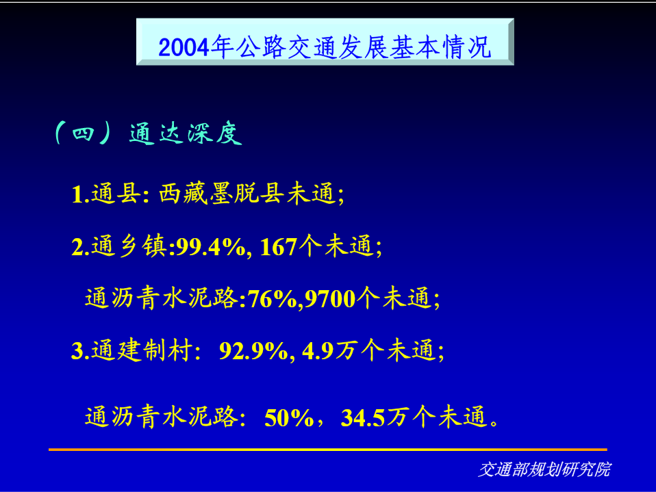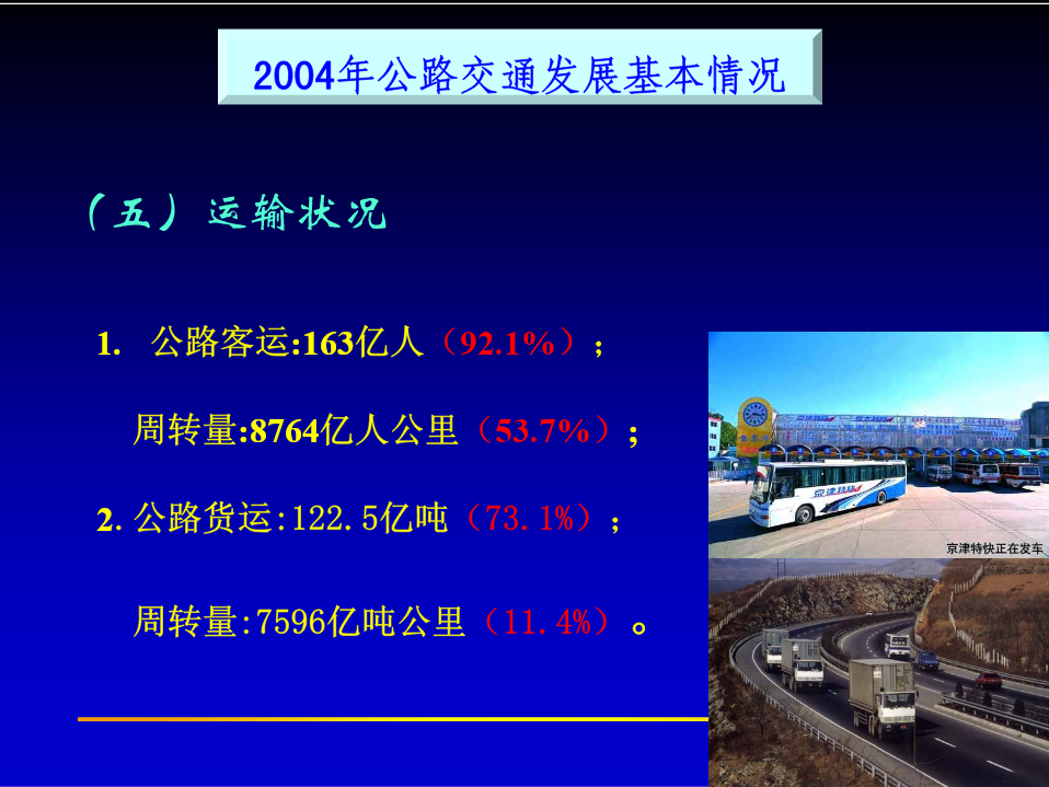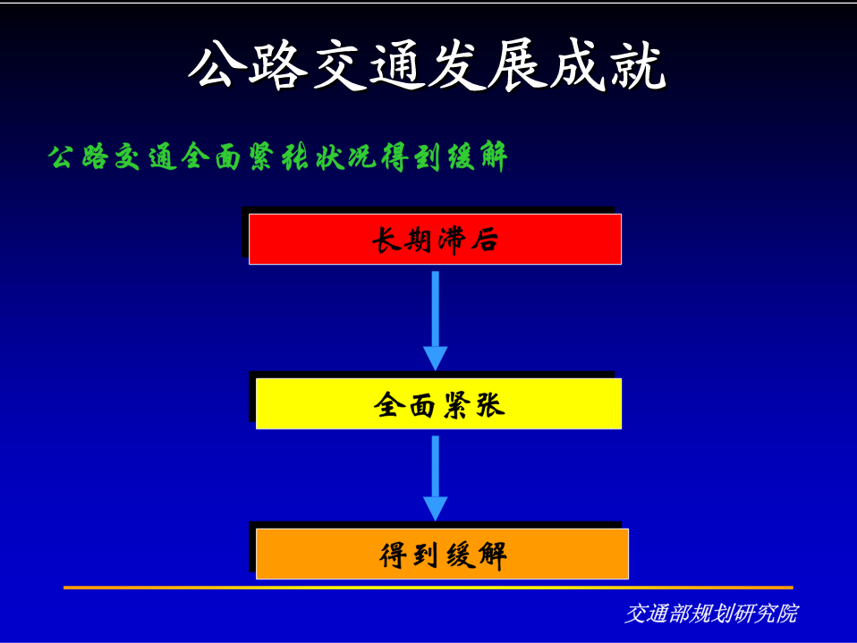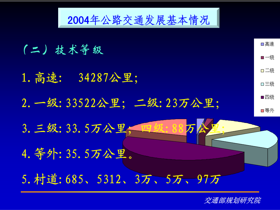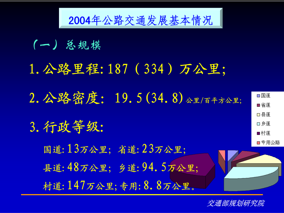 中国公路交通发展概述中国公路交通发展概述李海峰博士交通部规划研究院2006年6月交通部规划研究院主要内容主要内容•公路交通发展现状–2004年公路交通发展基本情况–公路交通发展成就•国家干线公路交通情况•交通安全•公路交通面临的机遇与挑战•未来发展目标交通部规划研究院主要内容主要内容•公路交通发展现状–2004年公路交通发展基本情况–公路交通发展成就•国家干线公路交通情况•交通安全•公路交通面临的机遇与挑战•未来发展目标交通部规划研究院2004年公路交通发展基本情况(一)总规模1.公路里程:187(334)万公里;2.公路密度:19.5(34.8)公里/百平方公里;3.行政等级:国道:13万公里;省道:23万公里;县道:48万公里;乡道:94.5万公里;村道:147万公里;专用:8.8万公里。交通部规划研究院2004年公路交通发展基本情况(二)技术等级1.高速:34287公里;2.一级:33522公里;二级:23万公里;3.三级:33.5万公里;四级:88万公里;4.等外:35.5万公里。5.村道:685、5312、3万、5万、97万交通部规划研究院2004年公路交通发展基本情况(三)路面类型1.高级:44万公里(23.5%);2.次高级:45.5公里(24.3%);3.中低级及无路面:97.5万公里。交通部规划研究院2004年公路交通发展基本情况(四)通达深度1.通县:西藏墨脱县未通;2.通乡镇:99.4%,167个未通;通沥青水泥路:76%,9700个未通;3.通建制村:92.9%,4.9万个未通;通沥青水泥路:50%,34.5万个未通。交通部规划研究院2004年公路交通发展基本情况(五)运输状况1.公路客运:163亿人(92.1%);周转量:8764亿人公里(53.7%);2.公路货运:122.5亿吨(73.1%);周转量:7596亿吨公里(11.4%)。交通部规划研究院主要内容主要内容•公路交通发展现状–2004年公路交通发展基本情况–公路交通发展成就•国家干线公路交通情况•交通安全•公路交通面临的机遇与挑战•未来发展目标交通部规划研究院公路交通发展成就公路交通发展成就公路交通全面紧张状况得到缓解长期滞后长期滞后全面紧张全面紧张得到缓解得到缓解交通部规划研究院公路交通发展成就公路交通发展成就1、基础设施建设取得重大进展,达到历史最好水平200全国公路总里程全国公路总里程(2004年187万公里)(2004年187万公里)1871811801771681701601401351281231201161191081121031041061008019901992199419961998200020022004交通部规划研究院公路交通发展成就公路交通发展成就1、础设施建设取得重大进展,达到历史最好水平全国高速公路里程全国高速公路里程(2004年34287公里)(2004年34287公里)3500034287300002974525000251301943720000163141500011605100008733477121415000574114534221603522652019901992199419961998200020022004交通部规划研究院公路交通发展成就公路交通发展成就1、基础设施建设取得重大进展,达到历史最好水平东北公路运输大动脉初步形成公路运输大动脉初步形成华北京沪通道京珠通道华东京沈通道交通部规划研究院公路交通发展成就公路交通发展成就1、基础设施建设取得重大进展,达到历史最好水平二级以上公路里程二级以上公路里程(2004年达到30万公里)(2004年达到30万公里)30.03027.225.02522.72018.916.914.91513.111.29.7108.06.95.94.75.15019901992199419961998200020022004交通部规划研究院公路交通发展成就公路交通发展成就1、基础设施建设取得重大进展,达到历史最好水平47.8%2004年22.5个百分点1990年高级次高级路面比重交通部规划研究院公路交通发展成就公路交通发展成就1、基础设施建设取得重大进展,达到历史最好水平