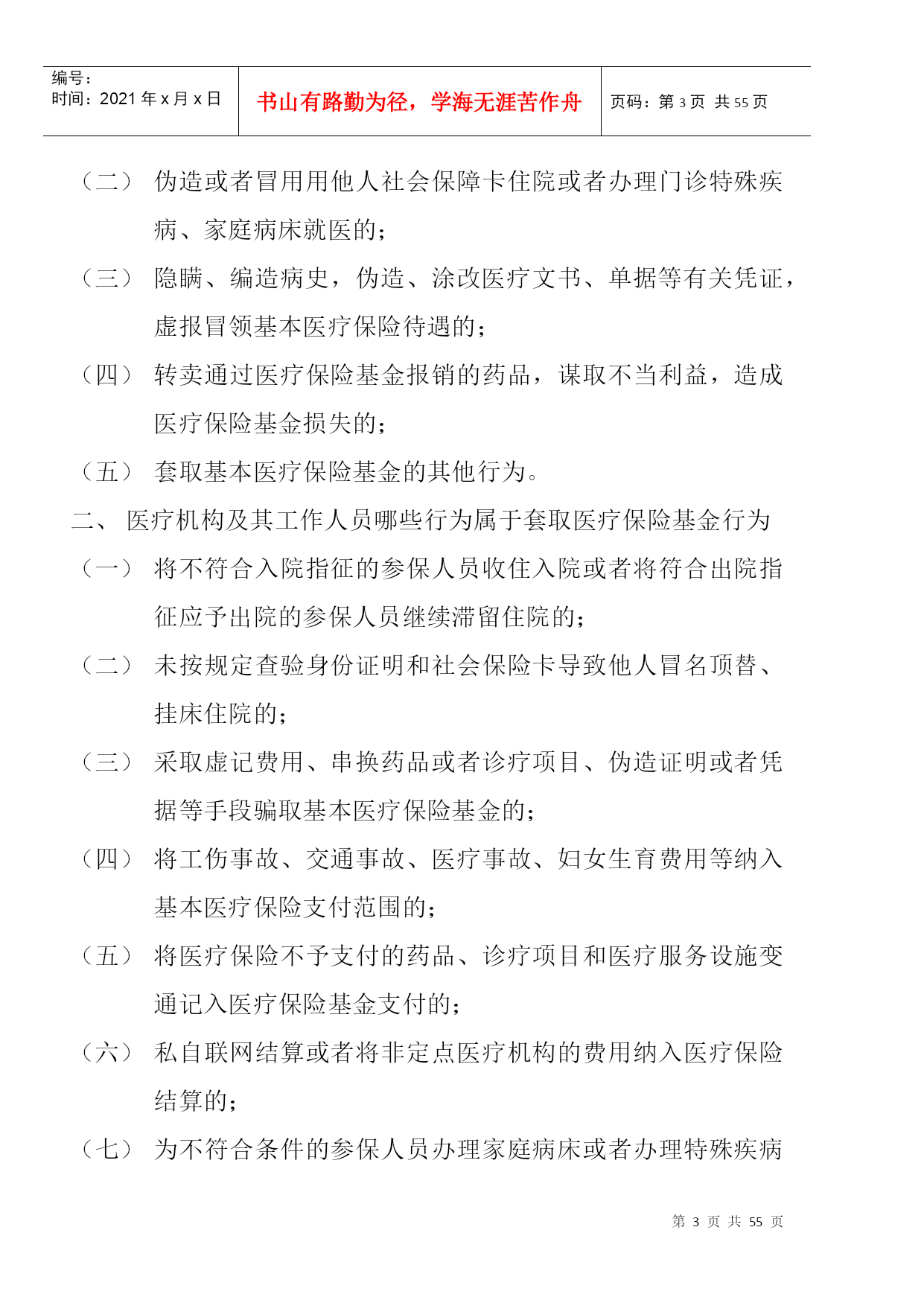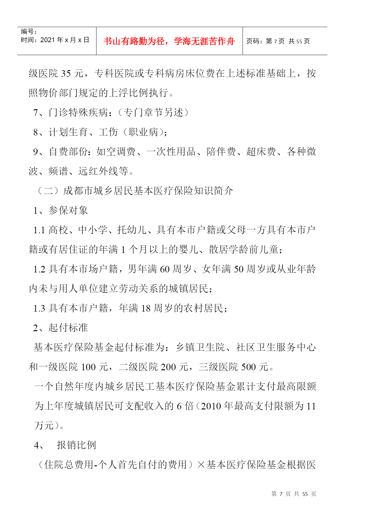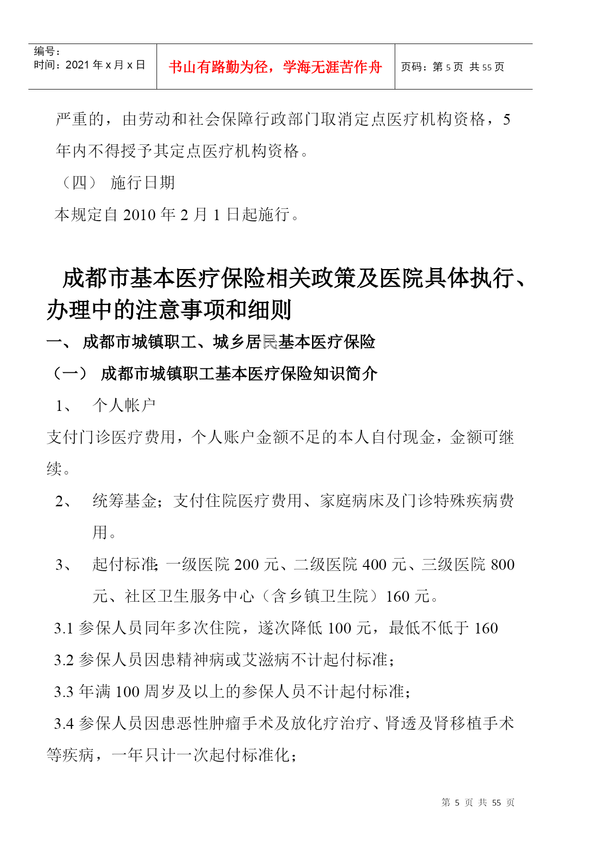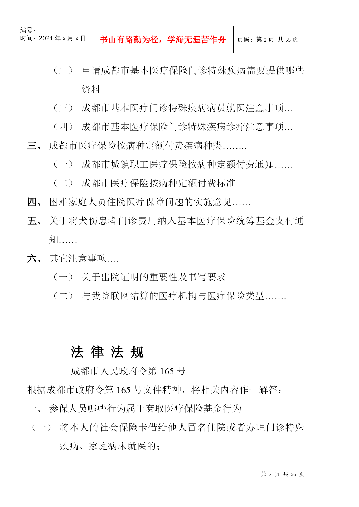 编号:时间:2021年x月x日书山有路勤为径,学海无涯苦作舟页码:第PAGE55页共NUMPAGES55页第PAGE\*MERGEFORMAT55页共NUMPAGES\*MERGEFORMAT55页目录法律法规一、参保人员哪些行为属于套取医疗保险基金行为…..1二、医疗机构及其工作人员哪些行为属于套取医疗保险基金行为……1三、套取医疗保险基金行为的处理条款和执行时间……2成都市基本医疗保险相关政策及医院具体执行、办理中的注意事项和细则成都市城镇职工、城乡居民基本医疗保险…….成都市城镇职工基本医疗保险知识简介…成都市城乡居民基本医疗保险知识简介….成都市基本医疗保险基金支付植入人体材料人工器官等特殊材料费比例……..成都市大病医疗互助补充保险办法简介…….成都市基本医疗保险外伤医疗费用管理…..成都市基本医疗保险患者住院须知…….临床中医诊疗项目注意事项…….临床检查治疗中的注意事项…….临床用药限制目录……成都市基本医疗保险门诊特殊疾病相关知识…….成都市基本医疗门诊特殊疾病知识简介….申请成都市基本医疗保险门诊特殊疾病需要提供哪些资料…….成都市基本医疗门诊特殊疾病病员就医注意事项…成都市基本医疗保险门诊特殊疾病诊疗注意事项…成都市医疗保险按病种定额付费疾病种类……..成都市城镇职工医疗保险按病种定额付费通知……成都市医疗保险按病种定额付费标准…..困难家庭人员住院医疗保障问题的实施意见……关于将犬伤患者门诊费用纳入基本医疗保险统筹基金支付通知……其它注意事项….关于出院证明的重要性及书写要求…..与我院联网结算的医疗机构与医疗保险类型…….法律法规成都市人民政府令第165号根据成都市政府令第165号文件精神,将相关内容作一解答:参保人员哪些行为属于套取医疗保险基金行为将本人的社会保险卡借给他人冒名住院或者办理门诊特殊疾病、家庭病床就医的;伪造或者冒用用他人社会保障卡住院或者办理门诊特殊疾病、家庭病床就医的;隐瞒、编造病史,伪造、涂改医疗文书、单据等有关凭证,虚报冒领基本医疗保险待遇的;转卖通过医疗保险基金报销的药品,谋取不当利益,造成医疗保险基金损失的;套取基本医疗保险基金的其他行为。医疗机构及其工作人员哪些行为属于套取医疗保险基金行为将不符合入院指征的参保人员收住入院或者将符合出院指征应予出院的参保人员继续滞留住院的;未按规定查验身份证明和社会保险卡导致他人冒名顶替、挂床住院的;采取虚记费用、串换药品或者诊疗项目、伪造证明或者凭据等手段骗取基本医疗保险基金的;将工伤事故、交通事故、医疗事故、妇女生育费用等纳入基本医疗保险支付范围的;将医疗保险不予支付的药品、诊疗项目和医疗服务设施变通记入医疗保险基金支付的;私自联网结算或者将非定点医疗机构的费用纳入医疗保险结算的;为不符合条件的参保人员办理家庭病床或者办理特殊疾病的;经核实无病历记载或者病历记载与发生的医疗费用不符的;利用特殊病种超量购药、搭车开药、转让医疗票据,从中牟利的;不按药品实际名称、数量、金额,多开或者乱开收费票据的;违反基本医疗保险规定,造成基本医疗保险基金流失的其他行为。套取医疗保险基金行为的处理条款和执行时间(一)、城镇职工参保人员;由医疗保险经办机构依法追回其从基本医疗保险基金中套取的医疗费用,由劳动和社会保障行政部门处以200元以上1000元以下罚款;并视情节轻重,暂停其6个月以上24个月以下基本医疗保险待遇。城乡居民参保人员由医疗保险经办机构依法追回其从基本医疗保险基金中获取的费用,由劳动和社会保障行政部门处以200元以下罚款。定点医疗机构及其工作人员由医疗保险经办机构依法追回其从基本医疗保险基金中获取的费用,由劳动和社会保障行政部门责令整改,处以违规金额1至3倍的罚款,对直接责任人员处500元以上2000元以下罚款;情节严重的,由劳动和社会保障行政部门取消定点医疗机构资格,5年内不得授予其定点医疗机构资格。施行日期本规定自2010年2月1日起施行。成都市基本医疗保险相关政策及医院具体执行、办理中的注意事项和细则成都市城镇职工、城乡居民基本医疗保险成都市城镇职工基本医疗保险知识简介个人帐户支付门诊医疗费用,个人账户金额不足的本人自付现金,金额可继续。统筹基金;支付住院医疗费用、家庭病床及门诊特殊疾病费用。起付标准;一级医院200元、二级医院400元、三级医院800元、社区卫生服务中心(含乡镇卫生院)160元。3.1参保人员同年多次住院,遂次降低100元,最低不低于1603.2参保人员因患精神病或艾滋病不计起付标准;3.3年满100周岁及以上的参保人员不计起付标准;3.4参保