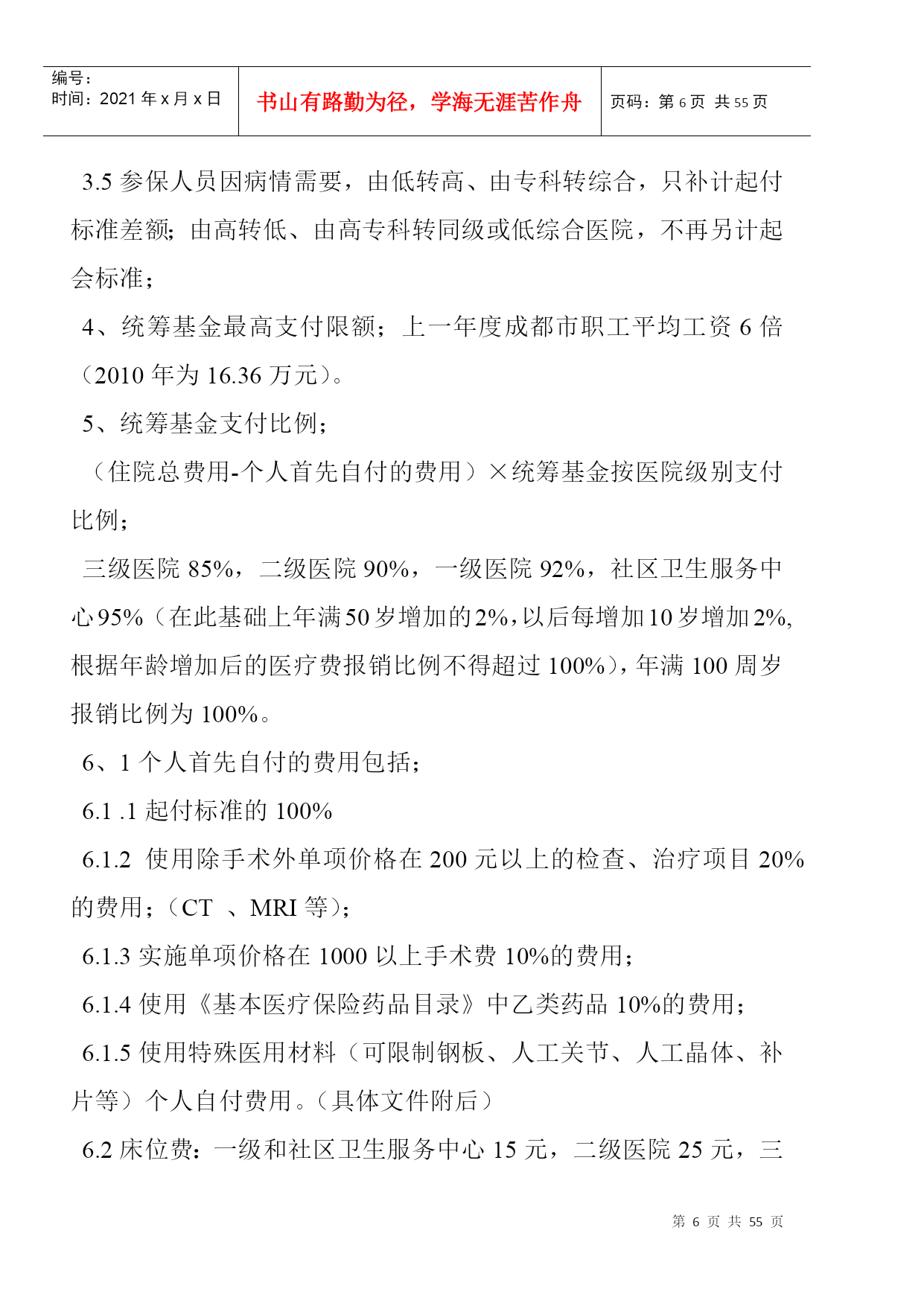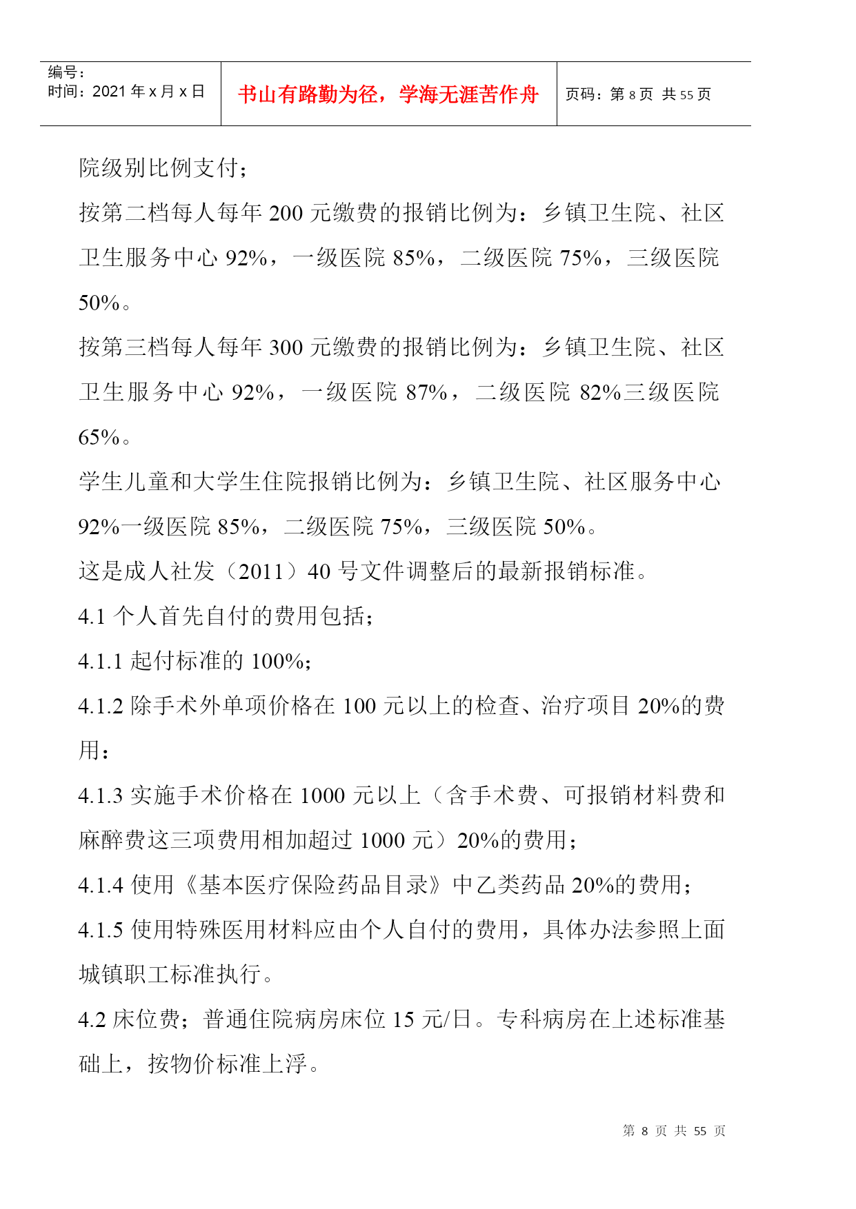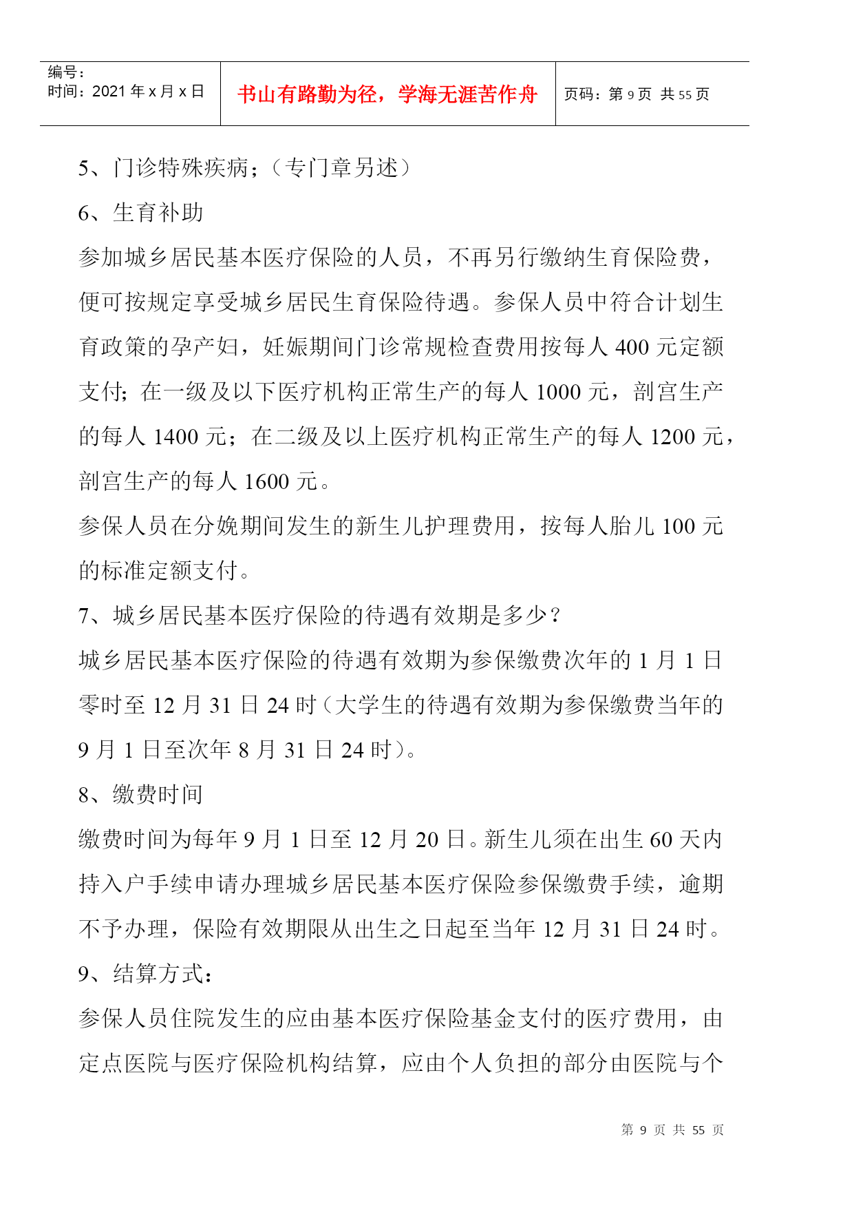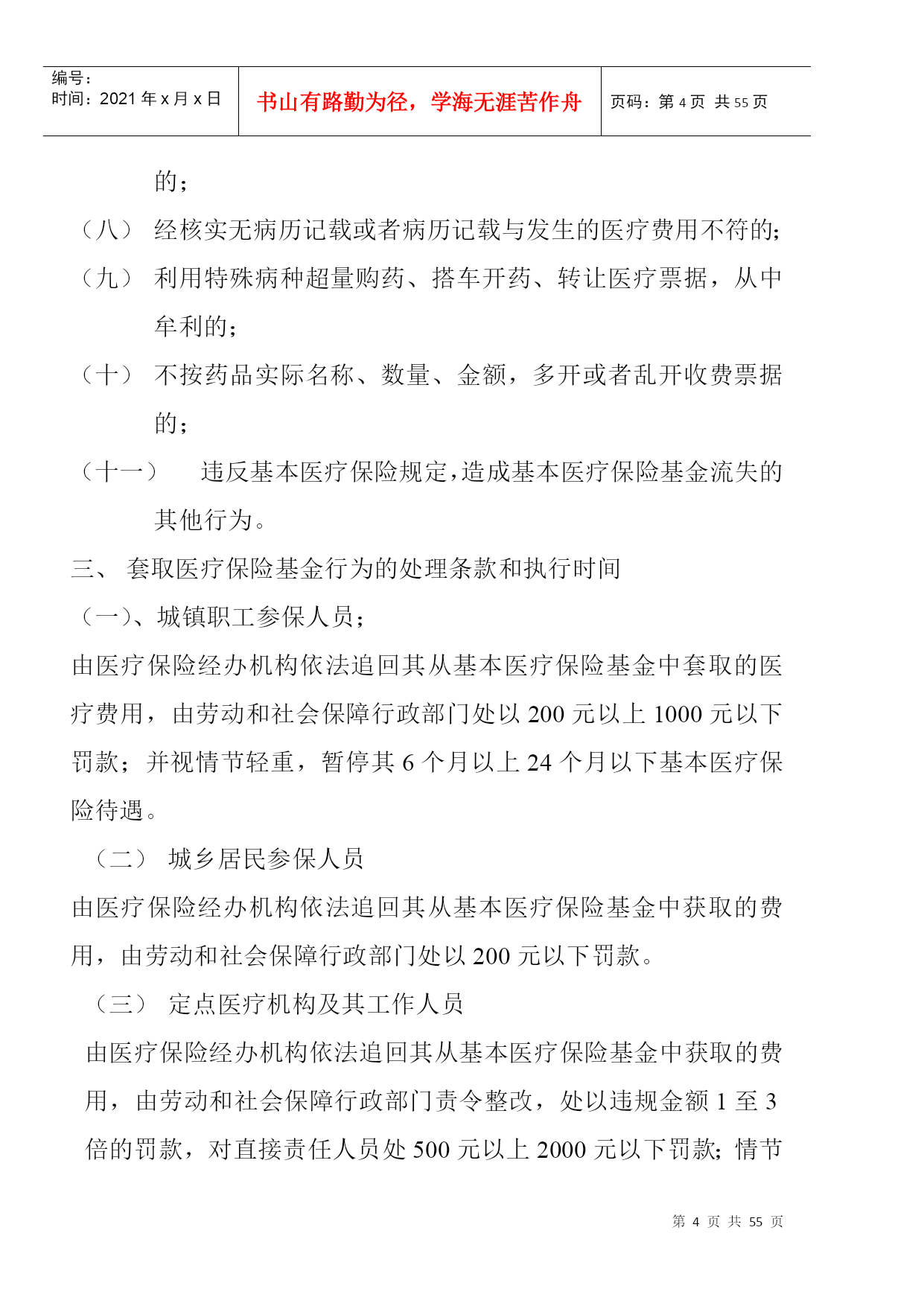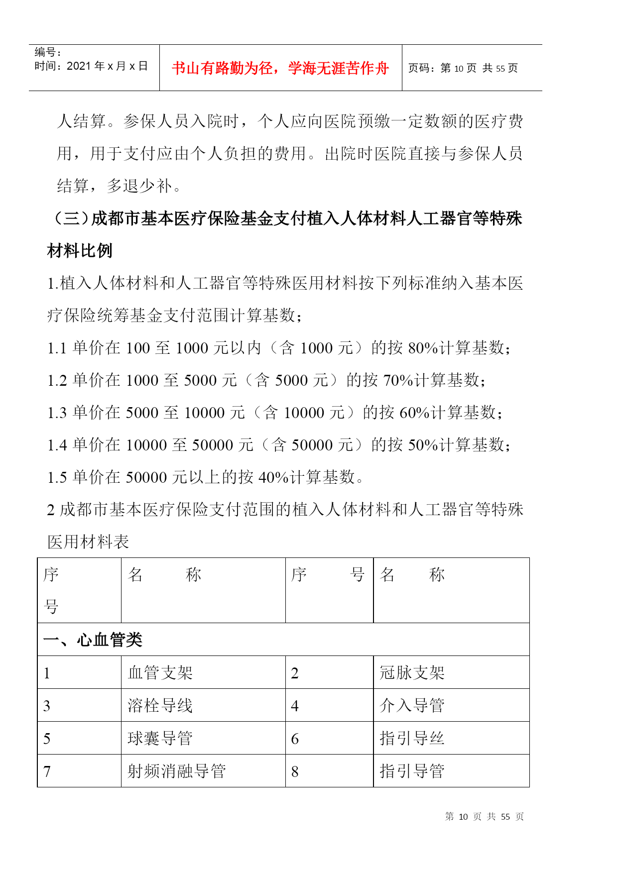 编号:时间:2021年x月x日书山有路勤为径,学海无涯苦作舟页码:第PAGE55页共NUMPAGES55页第PAGE\*MERGEFORMAT55页共NUMPAGES\*MERGEFORMAT55页目录法律法规一、参保人员哪些行为属于套取医疗保险基金行为…..1二、医疗机构及其工作人员哪些行为属于套取医疗保险基金行为……1三、套取医疗保险基金行为的处理条款和执行时间……2成都市基本医疗保险相关政策及医院具体执行、办理中的注意事项和细则成都市城镇职工、城乡居民基本医疗保险…….成都市城镇职工基本医疗保险知识简介…成都市城乡居民基本医疗保险知识简介….成都市基本医疗保险基金支付植入人体材料人工器官等特殊材料费比例……..成都市大病医疗互助补充保险办法简介…….成都市基本医疗保险外伤医疗费用管理…..成都市基本医疗保险患者住院须知…….临床中医诊疗项目注意事项…….临床检查治疗中的注意事项…….临床用药限制目录……成都市基本医疗保险门诊特殊疾病相关知识…….成都市基本医疗门诊特殊疾病知识简介….申请成都市基本医疗保险门诊特殊疾病需要提供哪些资料…….成都市基本医疗门诊特殊疾病病员就医注意事项…成都市基本医疗保险门诊特殊疾病诊疗注意事项…成都市医疗保险按病种定额付费疾病种类……..成都市城镇职工医疗保险按病种定额付费通知……成都市医疗保险按病种定额付费标准…..困难家庭人员住院医疗保障问题的实施意见……关于将犬伤患者门诊费用纳入基本医疗保险统筹基金支付通知……其它注意事项….关于出院证明的重要性及书写要求…..与我院联网结算的医疗机构与医疗保险类型…….法律法规成都市人民政府令第165号根据成都市政府令第165号文件精神,将相关内容作一解答:参保人员哪些行为属于套取医疗保险基金行为将本人的社会保险卡借给他人冒名住院或者办理门诊特殊疾病、家庭病床就医的;伪造或者冒用用他人社会保障卡住院或者办理门诊特殊疾病、家庭病床就医的;隐瞒、编造病史,伪造、涂改医疗文书、单据等有关凭证,虚报冒领基本医疗保险待遇的;转卖通过医疗保险基金报销的药品,谋取不当利益,造成医疗保险基金损失的;套取基本医疗保险基金的其他行为。医疗机构及其工作人员哪些行为属于套取医疗保险基金行为将不符合入院指征的参保人员收住入院或者将符合出院指征应予出院的参保人员继续滞留住院的;未按规定查验身份证明和社会保险卡导致他人冒名顶替、挂床住院的;采取虚记费用、串换药品或者诊疗项目、伪造证明或者凭据等手段骗取基本医疗保险基金的;将工伤事故、交通事故、医疗事故、妇女生育费用等纳入基本医疗保险支付范围的;将医疗保险不予支付的药品、诊疗项目和医疗服务设施变通记入医疗保险基金支付的;私自联网结算或者将非定点医疗机构的费用纳入医疗保险结算的;为不符合条件的参保人员办理家庭病床或者办理特殊疾病的;经核实无病历记载或者病历记载与发生的医疗费用不符的;利用特殊病种超量购药、搭车开药、转让医疗票据,从中牟利的;不按药品实际名称、数量、金额,多开或者乱开收费票据的;违反基本医疗保险规定,造成基本医疗保险基金流失的其他行为。套取医疗保险基金行为的处理条款和执行时间(一)、城镇职工参保人员;由医疗保险经办机构依法追回其从基本医疗保险基金中套取的医疗费用,由劳动和社会保障行政部门处以200元以上1000元以下罚款;并视情节轻重,暂停其6个月以上24个月以下基本医疗保险待遇。城乡居民参保人员由医疗保险经办机构依法追回其从基本医疗保险基金中获取的费用,由劳动和社会保障行政部门处以200元以下罚款。定点医疗机构及其工作人员由医疗保险经办机构依法追回其从基本医疗保险基金中获取的费用,由劳动和社会保障行政部门责令整改,处以违规金额1至3倍的罚款,对直接责任人员处500元以上2000元以下罚款;情节严重的,由劳动和社会保障行政部门取消定点医疗机构资格,5年内不得授予其定点医疗机构资格。施行日期本规定自2010年2月1日起施行。成都市基本医疗保险相关政策及医院具体执行、办理中的注意事项和细则成都市城镇职工、城乡居民基本医疗保险成都市城镇职工基本医疗保险知识简介个人帐户支付门诊医疗费用,个人账户金额不足的本人自付现金,金额可继续。统筹基金;支付住院医疗费用、家庭病床及门诊特殊疾病费用。起付标准;一级医院200元、二级医院400元、三级医院800元、社区卫生服务中心(含乡镇卫生院)160元。3.1参保人员同年多次住院,遂次降低100元,最低不低于1603.2参保人员因患精神病或艾滋病不计起付标准;3.3年满100周岁及以上的参保人员不计起付标准;3.4参保
