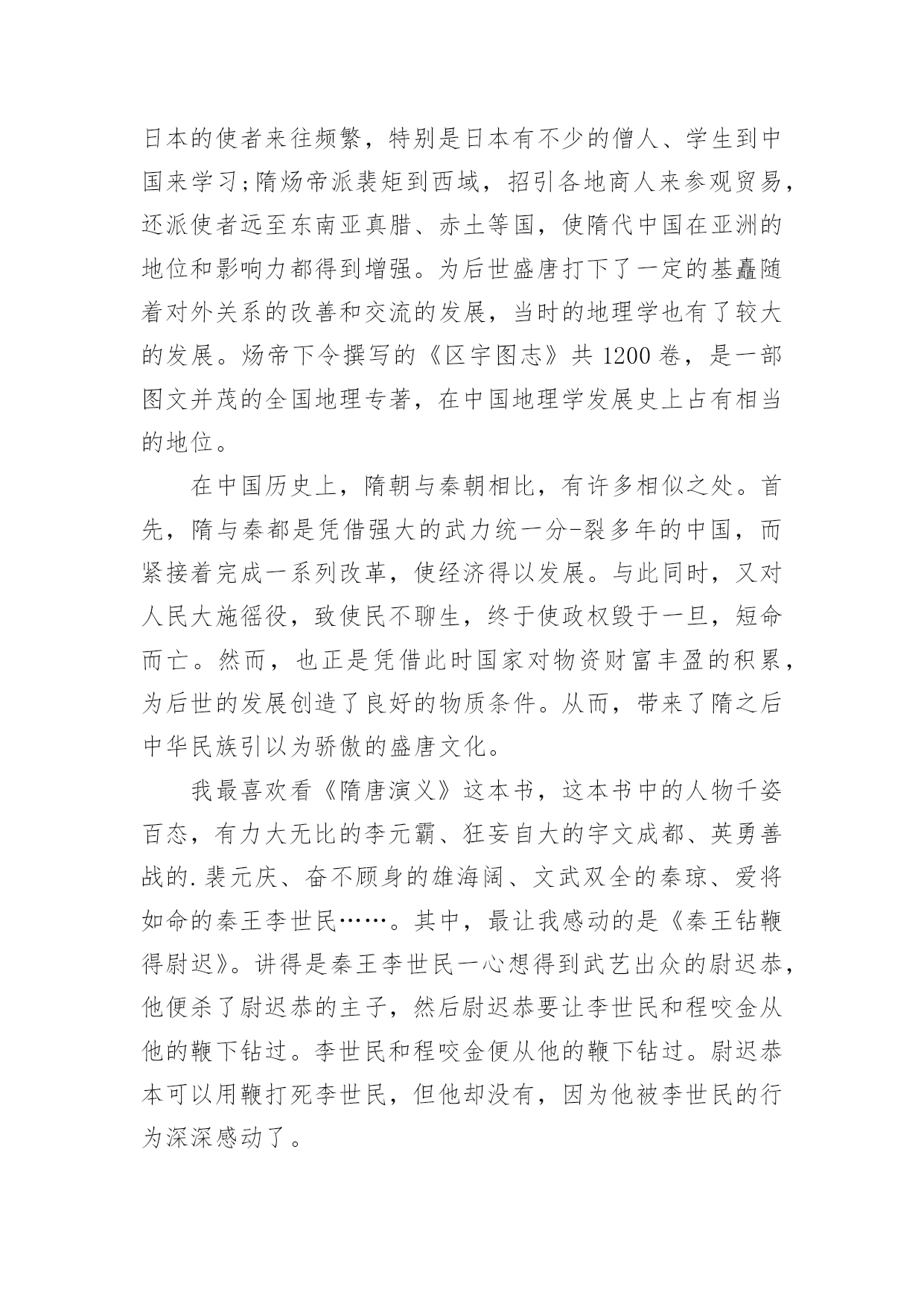 隋朝历史书籍读后感隋朝历史书籍读后感中国有千千万万的历史,可我最喜欢的历史片段不是秦汉时期也不是三国时期,而是隋唐时期的历史。里面讲的是从隋唐灭亡到唐朝开始,讲述了瓦岗寨的英雄好汉的传奇故事。他们起兵抗隋朝的暴-政,最后帮助李氏推翻隋朝建立了唐朝。里面最让人刻骨铭心的故事——李元霸初显威,李渊上朝时带上了自己的四个儿子上朝,隋炀帝带着无敌大将军于文成都,李渊第四个儿子李元霸“嘿嘿”的笑说:“就他那副模样还叫自己无敌大将军?”于文成都听了,生气极了,就在皇上面前大发雷霆,要和李元霸一较高下。宫殿门口只有两只石狮子,于文成都勉强举起一只狮子绕宫殿走了一圈。李元霸举起两只狮子,绕宫殿走了十多圈一点也不累,最后还把于文成都打伤了。在隋唐时期我最欣赏的人就是——秦琼,他字叔宝,名太平郎,他在当捕快时当过一次伯乐。买马时,他选了一匹黄骠马,那匹黄骠马不尽速度快而且还耐力好。当然他不但擅长选马而且武功也好,在隋唐十八好汉中排名十六。《隋唐演义》真的很不错,我非常喜欢!在短短三十几年中,隋王朝恢复了几个世纪以来因割据纷乱几乎中断的对外关系。通过“丝绸之路”的商业以来,促进了中国与西亚的相互交流。在东亚,隋与新罗、百济、日本的使者来往频繁,特别是日本有不少的僧人、学生到中国来学习;隋炀帝派裴矩到西域,招引各地商人来参观贸易,还派使者远至东南亚真腊、赤土等国,使隋代中国在亚洲的地位和影响力都得到增强。为后世盛唐打下了一定的基矗随着对外关系的改善和交流的发展,当时的地理学也有了较大的发展。炀帝下令撰写的《区宇图志》共1200卷,是一部图文并茂的全国地理专著,在中国地理学发展史上占有相当的地位。在中国历史上,隋朝与秦朝相比,有许多相似之处。首先,隋与秦都是凭借强大的武力统一分-裂多年的中国,而紧接着完成一系列改革,使经济得以发展。与此同时,又对人民大施徭役,致使民不聊生,终于使政权毁于一旦,短命而亡。然而,也正是凭借此时国家对物资财富丰盈的积累,为后世的发展创造了良好的物质条件。从而,带来了隋之后中华民族引以为骄傲的盛唐文化。我最喜欢看《隋唐演义》这本书,这本书中的人物千姿百态,有力大无比的李元霸、狂妄自大的宇文成都、英勇善战的.裴元庆、奋不顾身的雄海阔、文武双全的秦琼、爱将如命的秦王李世民……。其中,最让我感动的是《秦王钻鞭得尉迟》。讲得是秦王李世民一心想得到武艺出众的尉迟恭,他便杀了尉迟恭的主子,然后尉迟恭要让李世民和程咬金从他的鞭下钻过。李世民和程咬金便从他的鞭下钻过。尉迟恭本可以用鞭打死李世民,但他却没有,因为他被李世民的行为深深感动了。读了这部小说,我被人物身上的特有精神深深感动。瓦岗寨众兄弟为了推翻当时的封建社会,创造一个民主的世界而招兵买马,与另十七路反王一同征讨隋朝。瓦岗寨众兄弟这种为人民着想、大公无私的精神值得我们学习。王伯当虽然跟错了人,但他一心为自己的主人效劳,他这种忠于职守的精神让我非常感动。雄阔海托住千斤闸,让十八路反王安全逃离,让我从中体会到不能只顾自己的安危,不管他人的性命。我想如果世上每一个人都学他们的一个优点,这世界将变得更加美好。