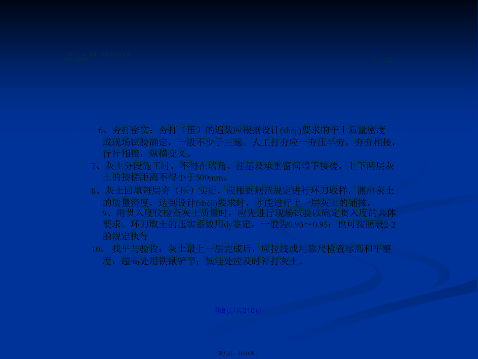 会计学一、地面(dìmiàn)工程施工工艺流程1、灰土地基施工(shīgōng)工艺流程土:宜优先采用基槽中挖出的土,但不得含有有机杂物,使用前应先过筛,其粒径不大于15mm。含水量应符合规定。石灰:应用块灰或生石灰粉;使用前应充分(chōngfèn)熟化过筛,不得含有粒径大于5mm的生石灰块,也不得含有过多的水分。一般应备有:●木夯、蛙式或柴油打夯机●手推车●筛子(孔径6~10mm和16~20mm两种)●标准(biāozhǔn)斗●靠尺●耙子●平头铁锹●胶皮管●小线●木折尺等。1、基坑(槽)在铺灰土前必须先行(xiānxíng)钎探验槽,并按设计和勘探部门的要求处理完地基,办完隐检手续。2、基础外侧打灰土,必须对基础,地下室墙和地下防水层、保护层进行检查,发现损坏时应及时修补处理,办完隐检手续。现浇的混凝土基础墙、地梁等均应达到规定的强度,不得碰坏损伤混凝土。3、当地下水位高于基坑(槽)底时,施工前应采取排水或降低地下水位的措施,使地下水位经常保持在施工面以下0.5m左右,在3d内不得受水浸泡。4、施工前应根据工程特点、设计压实系数,土料种类、施工条件等,合理确定土料含水量控制范围。铺灰土的厚度和夯打遍数等参数。重要的灰土填方其参数应通过压实试验来确定。5、房心灰土和管沟灰土,应先完成上下水管道的安装或管沟墙间加固等措施后,再进行。并且将管沟、槽内、地坪上的积水或杂物、垃圾等有机物清除干净。6、施工前,应作好水平高程的标志。如在基坑(槽)或管沟的边坡上每隔3m钉上灰土上平的木撅,在室内和散水的边墙上弹上水平线或在地坪上钉好标高控制的标准木桩。1、工艺流程:检验土料和石灰粉的质量并过筛(ɡuòshāi)→灰土拌合→槽底清理→分层铺灰土→夯打密实→找平验收灰土(huītǔ)最大虚铺厚度表2-16、夯打密实:夯打(压)的遍数应根据设计(shèjì)要求的干土质量密度或现场试验确定,一般不少于三遍。人工打夯应一夯压半夯,夯夯相接,行行相接,纵横交叉。7、灰土分段施工时,不得在墙角、柱基及承重窗间墙下接槎,上下两层灰土的接槎距离不得小于500mm。8、灰土回填每层夯(压)实后,应根据规范规定进行环刀取样,测出灰土的质量密度,达到设计(shèjì)要求时,才能进行上一层灰土的铺摊。9、用贯入度仪检查灰土质量时,应先进行现场试验以确定贯入度的具体要求。环刀取土的压实系数用dy鉴定,一般为0.93~0.95;也可按照表2-2的规定执行10、找平与验收:灰土最上一层完成后,应拉线或用靠尺检查标高和平整度,超高处用铁锹铲平;低洼处应及时补打灰土。河南农业大学艺术设计专业装修(zhuāngxiū)工程课程1、基坑(槽)或管沟灰土回填应连续进行,尽快完成。施工中应防止地面水流入槽坑内,以免边坡塌方或基上遭到破坏。2、雨天施工时,应采取防雨或排水措施。刚打完毕或尚未夯实的灰土,如遭雨淋浸泡,则应将积水及松软灰土除去,并重新补填新灰土夯实,受浸湿的灰土应在晾干后,再夯打密实。3、冬期打灰土的土料,不得含有冻土块,要做到随筛、随拌、随打、随盖,认真执行留、接搓和分层夯实的规定。在土壤松散时可允许洒盐水。气温在-10℃以下时,不宜(bùyí)施工。并且要有冬施方案。1、保证项目:a、基底的土质必须符合设计要求。b、灰土的干土质量密度或贯入度必须符合设计要求和施工规范的规定。2、基本项目a、配料正确,拌合均匀,分层虚铺厚度符合规定,夯压密实,表面无松散(sōngsǎn)、起皮。b、留槎和接槎。分层留接槎的位置、方法正确,接槎密实、平整。3、允许偏差项目,见表2-3。河南农业大学艺术设计专业(zhuānyè)装修工程课程河南农业大学艺术设计专业装修工程(gōngchéng)课程2、砂石地基(dìjī)施工艺1、天然级配砂石或人工级配砂石:宜采用质地坚硬的中砂、粗砂、砾砂、碎(卵)石、石屑或其他工业废粒料。在缺少中、粗砂和砾石的地区,可采用细砂,但宜同时掺入一定数量的碎石或卵石,其掺量应符合设计要求。颗粒(kēlì)级配应良好。2、次级配砂石材料,不得含有草根、树叶、塑料袋等有机杂物及垃圾。用做排水固结地基时,含泥量不宜超过3%。碎石或卵石最大粒径不得大于垫层或虚铺厚度的2/3,并不宜大于50mm。一般应备有木夯(mùhānɡ)、蛙式或柴油打夯机、推土机、压路机(6~10t)、手推车、平头铁锹、喷水用胶管、2m靠尺、小线或细铅丝、钢尺或木折尺等。1、设置控制铺筑厚度的标志,如水平标准木桩或标高桩,或在固定的建筑物墙上、槽和沟的边坡上弹上水平标高线或钉上水平标高木橛。2、在地下水位高于基坑(槽)底面的工程中施工时,应采取排水或降低地下水位的措施,使基坑(槽)保持无水状态。3、铺筑前,应组织(zǔzhī)