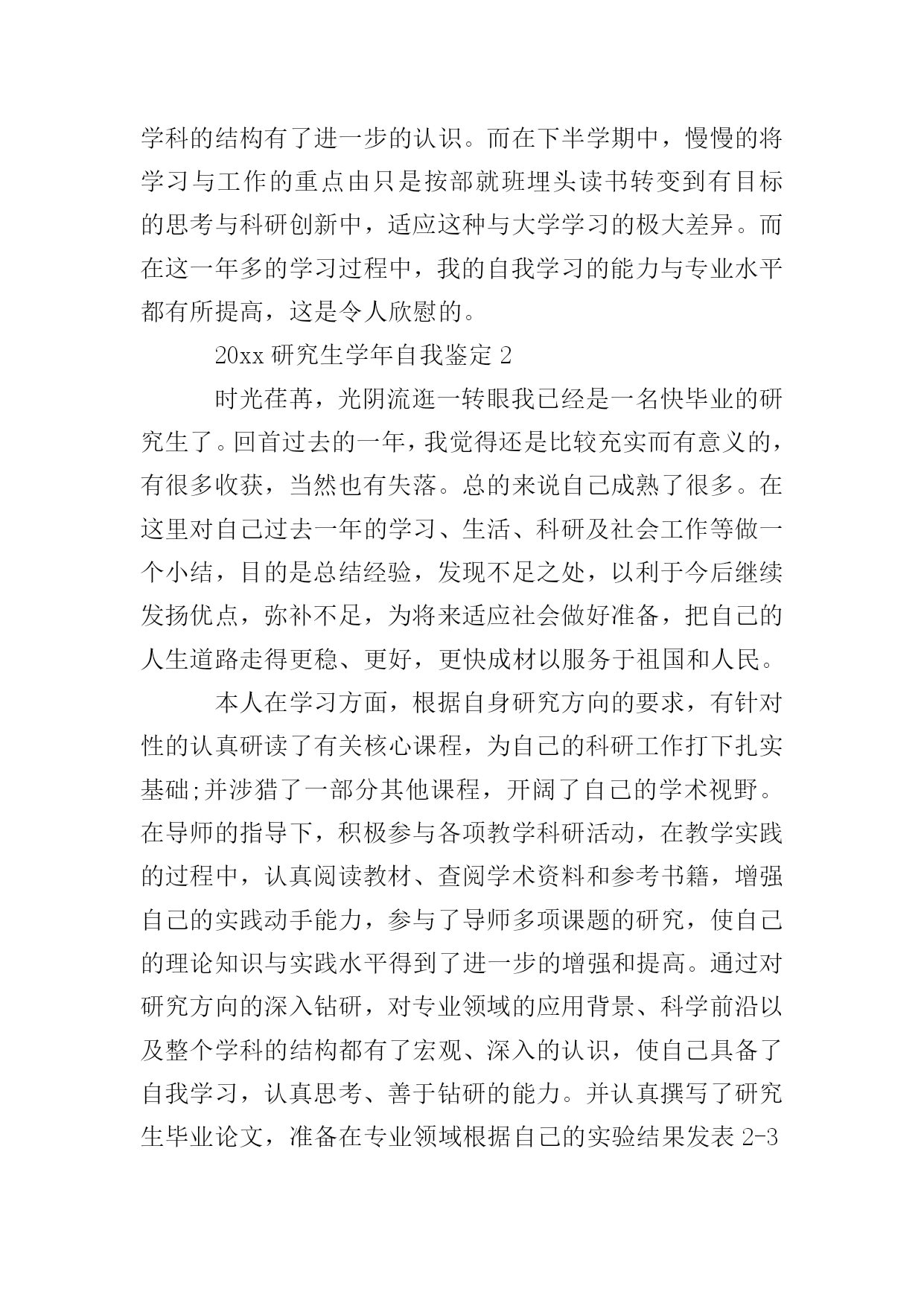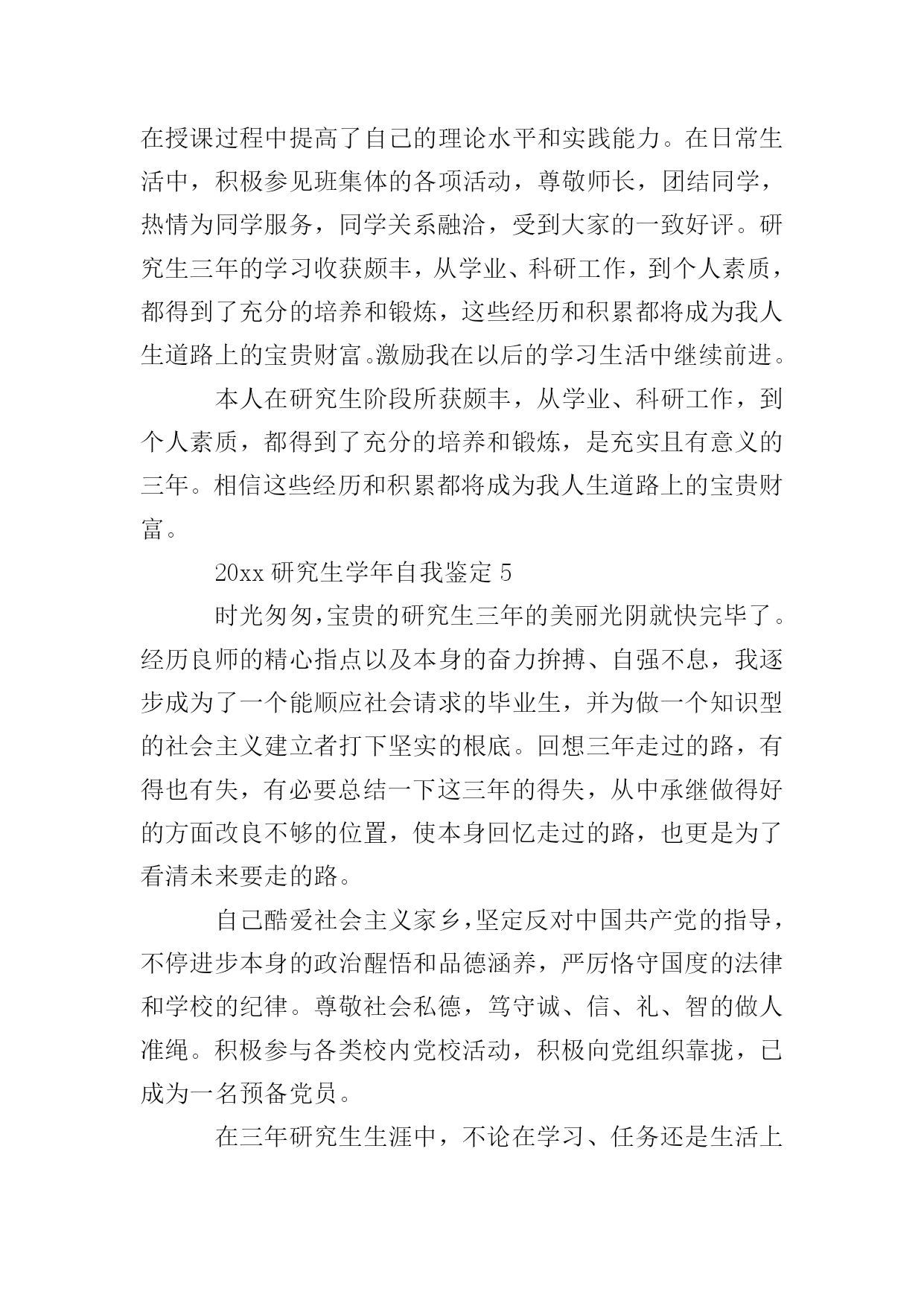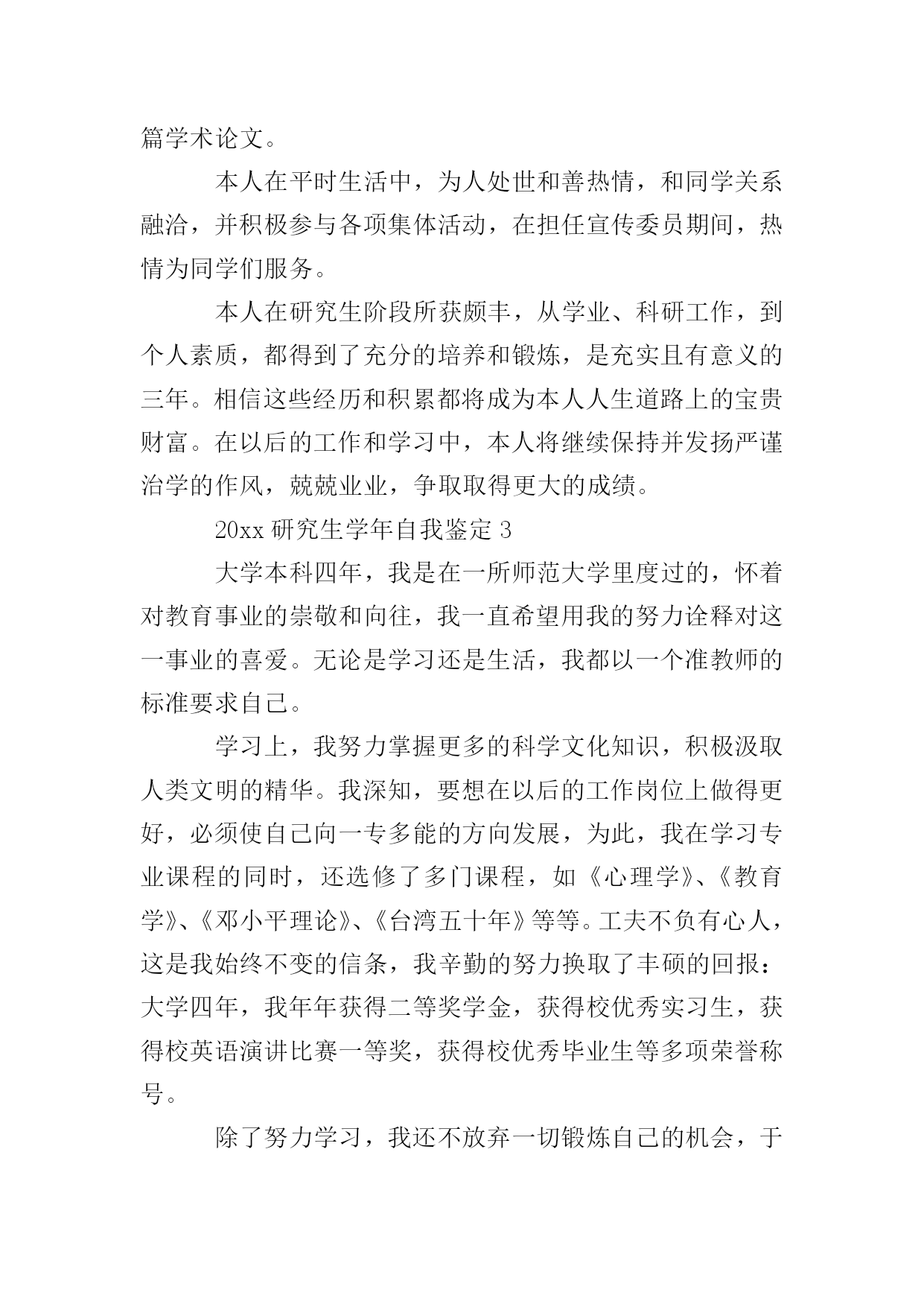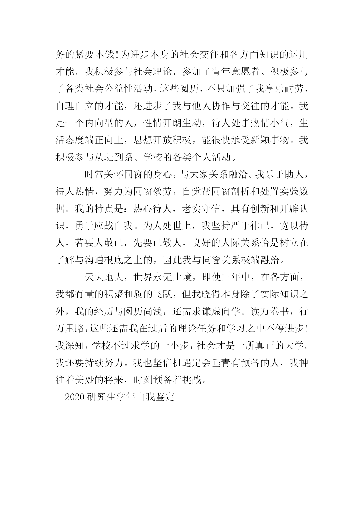 2020研究生学年自我鉴定20xx研究生学年自我鉴定120xxx年x月x日,在我踏入XX校园的时候,我便真真正正的成为了一名硕士研究生。在这过去的一年里,不仅加强了专业知识,更提高了专业素养。在导师、专业老师以及同学的帮助下,我获得了很大的进步并在学期末荣幸的获得了校级x等奖学金。在这里对自己过去一年的思想、学习与生活等方面做一个小结,目的是总结经验,发现不足之处,以利于今后继续发扬优点,弥补不足,为接下来的研究生生活确定方向,进一步完善自我,提高个人能力。在对科学发展观的学习过程中我发现,它对我的思想与科研理念有很大的指导作用。国家以发展为重中之重,而科研又以国家的需要与社会的需求为方向,科学发展观以发展为第一要义,指导我在学习科研知识时不能盲从,要在前人的基础上开拓创新,不断发展和丰富所学知识;它以人为本,指导我在学习工作中不能眼高手低、要用实践来取得发言权;它的基本要求是全面、协调、可持续,指导我做学问要一步一个脚印,不断前进,且勿急于求成;它根本方法是统筹兼顾,告诉我在搞科研时要综合考虑,不要丢三落四。我们用一年级一年的时间获得了研究生应完成的课程学分。上半学期可也比较紧张,我主要的精力花在了学习专业课程,并阅读了大量有关钢结构的书籍和论文上,这既让我开阔了视野,也使我对自己研究方向xxx内容以及整个学科的结构有了进一步的认识。而在下半学期中,慢慢的将学习与工作的重点由只是按部就班埋头读书转变到有目标的思考与科研创新中,适应这种与大学学习的极大差异。而在这一年多的学习过程中,我的自我学习的能力与专业水平都有所提高,这是令人欣慰的。20xx研究生学年自我鉴定2时光荏苒,光阴流逛一转眼我已经是一名快毕业的研究生了。回首过去的一年,我觉得还是比较充实而有意义的,有很多收获,当然也有失落。总的来说自己成熟了很多。在这里对自己过去一年的学习、生活、科研及社会工作等做一个小结,目的是总结经验,发现不足之处,以利于今后继续发扬优点,弥补不足,为将来适应社会做好准备,把自己的人生道路走得更稳、更好,更快成材以服务于祖国和人民。本人在学习方面,根据自身研究方向的要求,有针对性的认真研读了有关核心课程,为自己的科研工作打下扎实基础;并涉猎了一部分其他课程,开阔了自己的学术视野。在导师的指导下,积极参与各项教学科研活动,在教学实践的过程中,认真阅读教材、查阅学术资料和参考书籍,增强自己的实践动手能力,参与了导师多项课题的研究,使自己的理论知识与实践水平得到了进一步的增强和提高。通过对研究方向的深入钻研,对专业领域的应用背景、科学前沿以及整个学科的结构都有了宏观、深入的认识,使自己具备了自我学习,认真思考、善于钻研的能力。并认真撰写了研究生毕业论文,准备在专业领域根据自己的实验结果发表2-3篇学术论文。本人在平时生活中,为人处世和善热情,和同学关系融洽,并积极参与各项集体活动,在担任宣传委员期间,热情为同学们服务。本人在研究生阶段所获颇丰,从学业、科研工作,到个人素质,都得到了充分的培养和锻炼,是充实且有意义的三年。相信这些经历和积累都将成为本人人生道路上的宝贵财富。在以后的工作和学习中,本人将继续保持并发扬严谨治学的作风,兢兢业业,争取取得更大的成绩。20xx研究生学年自我鉴定3大学本科四年,我是在一所师范大学里度过的,怀着对教育事业的崇敬和向往,我一直希望用我的努力诠释对这一事业的喜爱。无论是学习还是生活,我都以一个准教师的标准要求自己。学习上,我努力掌握更多的科学文化知识,积极汲取人类文明的精华。我深知,要想在以后的工作岗位上做得更好,必须使自己向一专多能的方向发展,为此,我在学习专业课程的同时,还选修了多门课程,如《心理学》、《教育学》、《邓小平理论》、《台湾五十年》等等。工夫不负有心人,这是我始终不变的信条,我辛勤的努力换取了丰硕的回报:大学四年,我年年获得二等奖学金,获得校优秀实习生,获得校英语演讲比赛一等奖,获得校优秀毕业生等多项荣誉称号。除了努力学习,我还不放弃一切锻炼自己的机会,于是我参加社团,竞选班长,并出色地完成了领导和老师布置的任务,获得师生的一致好评,获得了校社团先进个人、优秀班干等荣誉称号。此外,我还在思想上加强改造自己,积极要求加入中国共产党,认真学习党在各个时期的方针政策,在大学毕业前,我被推荐为入党积极分子,并获得了优秀团员的荣誉称号。所有成绩的取得都已经成为过去,我清醒地意识到,知识的不完善和思想的不成熟是我发展道路上必须铲除的桎梏,于是,在工作之前,我选择了读研以继续对自己加以思想上的改造和学习上的提高。研究生对我而言是一个神圣的字眼,在我正式成为研究生的那一刻,我暗下决心,一定要用自己的努力来圆满完成自己两年半的研究生学习和生活。研究生是本科