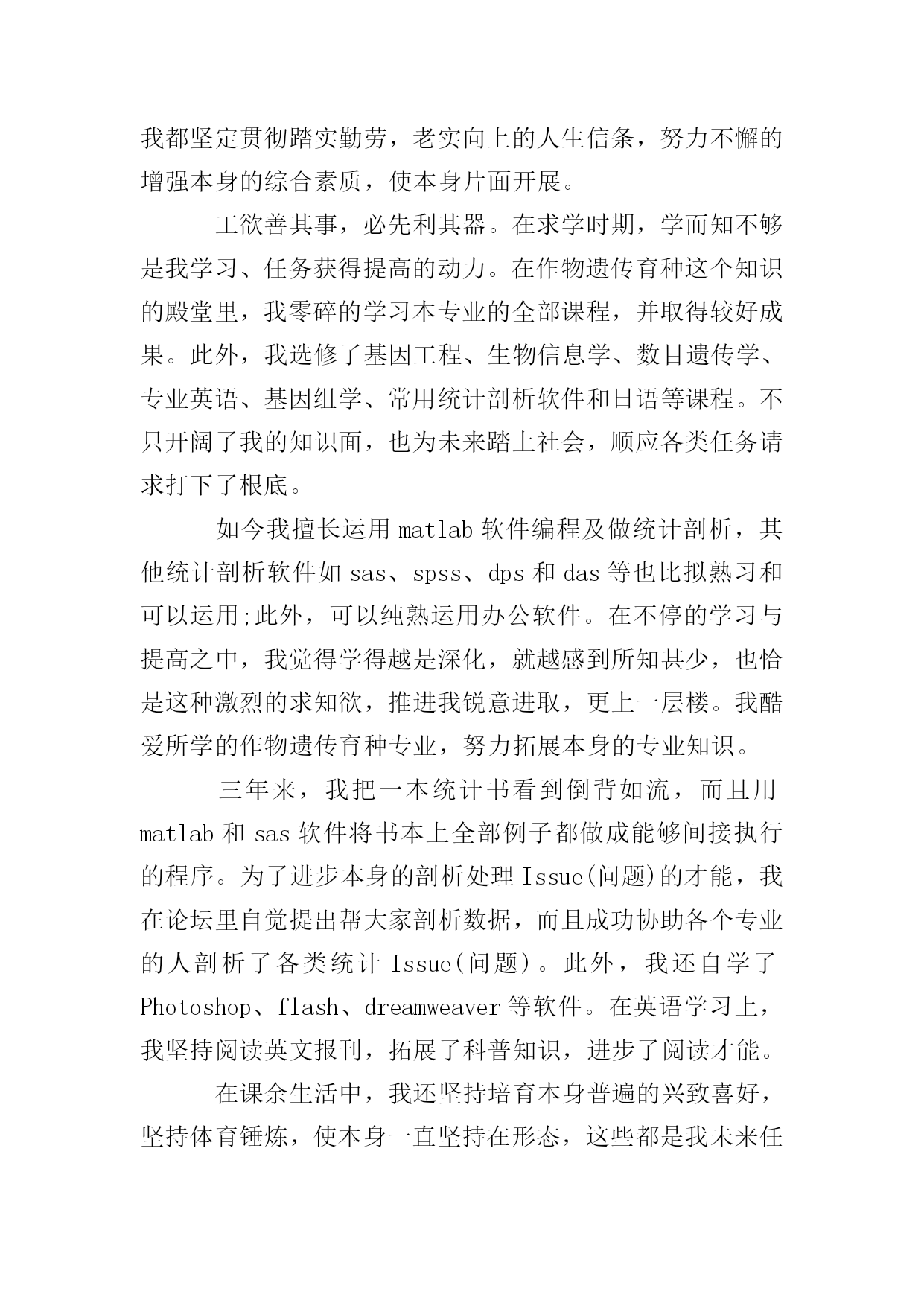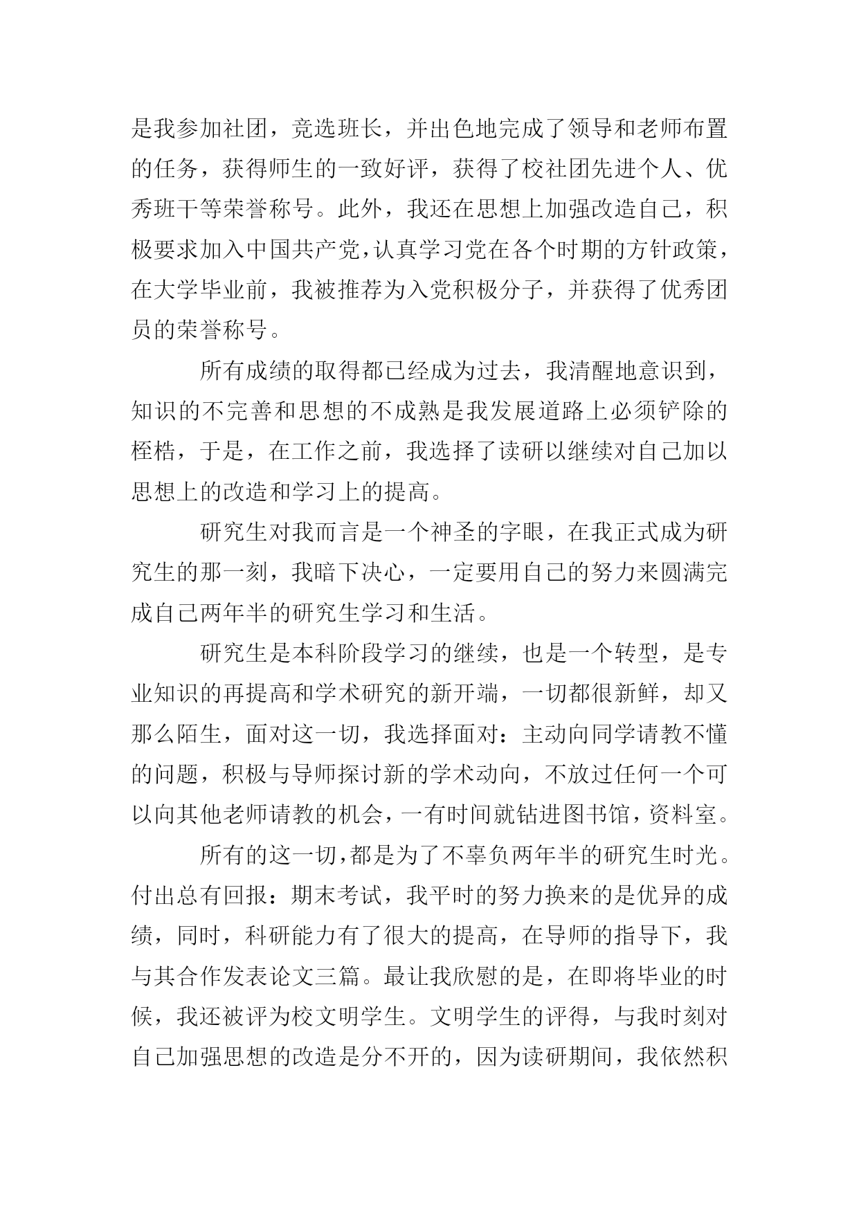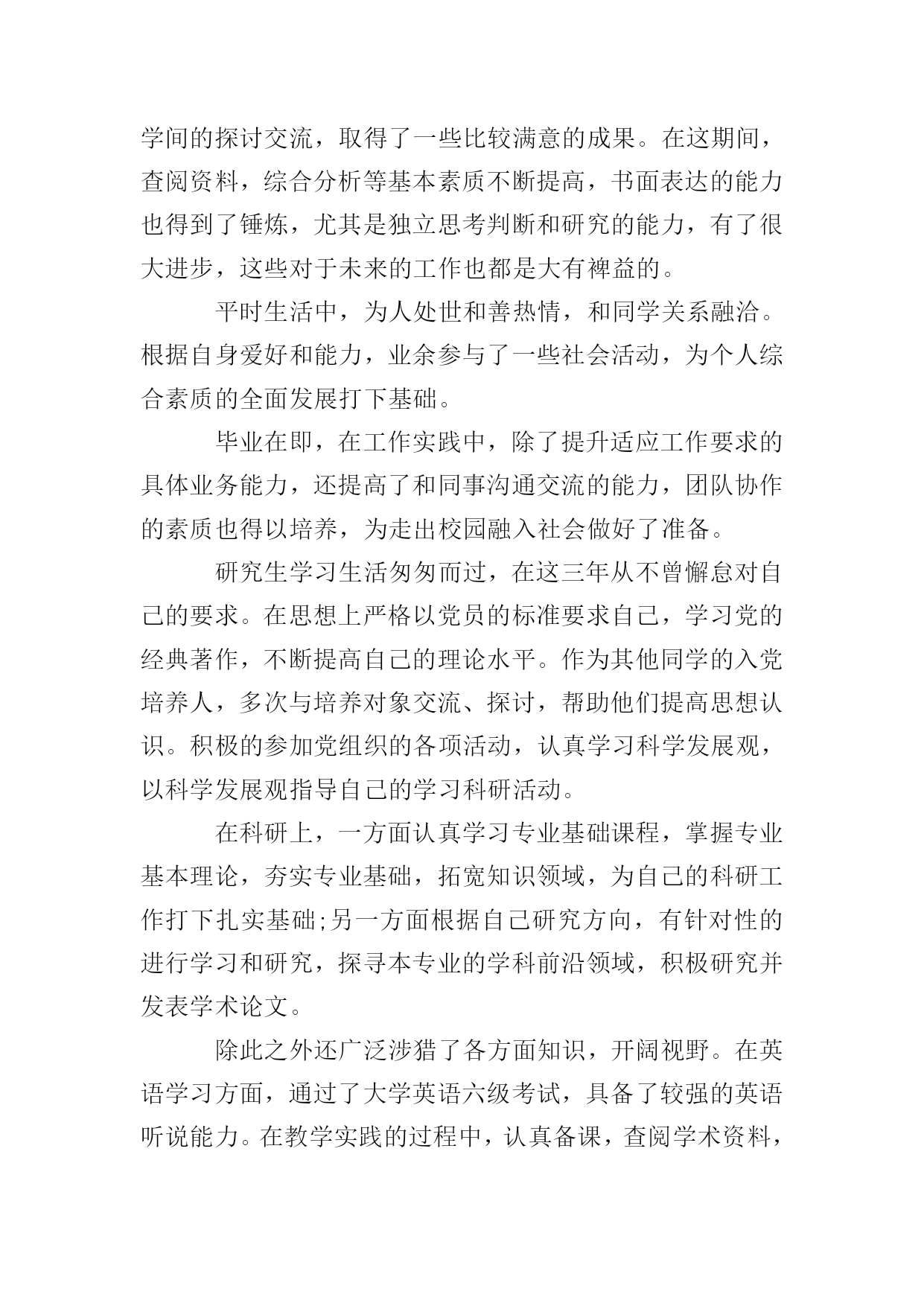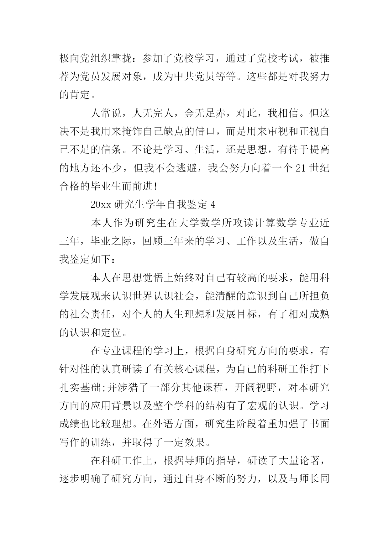 2020研究生学年自我鉴定20xx研究生学年自我鉴定120xxx年x月x日,在我踏入XX校园的时候,我便真真正正的成为了一名硕士研究生。在这过去的一年里,不仅加强了专业知识,更提高了专业素养。在导师、专业老师以及同学的帮助下,我获得了很大的进步并在学期末荣幸的获得了校级x等奖学金。在这里对自己过去一年的思想、学习与生活等方面做一个小结,目的是总结经验,发现不足之处,以利于今后继续发扬优点,弥补不足,为接下来的研究生生活确定方向,进一步完善自我,提高个人能力。在对科学发展观的学习过程中我发现,它对我的思想与科研理念有很大的指导作用。国家以发展为重中之重,而科研又以国家的需要与社会的需求为方向,科学发展观以发展为第一要义,指导我在学习科研知识时不能盲从,要在前人的基础上开拓创新,不断发展和丰富所学知识;它以人为本,指导我在学习工作中不能眼高手低、要用实践来取得发言权;它的基本要求是全面、协调、可持续,指导我做学问要一步一个脚印,不断前进,且勿急于求成;它根本方法是统筹兼顾,告诉我在搞科研时要综合考虑,不要丢三落四。我们用一年级一年的时间获得了研究生应完成的课程学分。上半学期可也比较紧张,我主要的精力花在了学习专业课程,并阅读了大量有关钢结构的书籍和论文上,这既让我开阔了视野,也使我对自己研究方向xxx内容以及整个学科的结构有了进一步的认识。而在下半学期中,慢慢的将学习与工作的重点由只是按部就班埋头读书转变到有目标的思考与科研创新中,适应这种与大学学习的极大差异。而在这一年多的学习过程中,我的自我学习的能力与专业水平都有所提高,这是令人欣慰的。20xx研究生学年自我鉴定2时光荏苒,光阴流逛一转眼我已经是一名快毕业的研究生了。回首过去的一年,我觉得还是比较充实而有意义的,有很多收获,当然也有失落。总的来说自己成熟了很多。在这里对自己过去一年的学习、生活、科研及社会工作等做一个小结,目的是总结经验,发现不足之处,以利于今后继续发扬优点,弥补不足,为将来适应社会做好准备,把自己的人生道路走得更稳、更好,更快成材以服务于祖国和人民。本人在学习方面,根据自身研究方向的要求,有针对性的认真研读了有关核心课程,为自己的科研工作打下扎实基础;并涉猎了一部分其他课程,开阔了自己的学术视野。在导师的指导下,积极参与各项教学科研活动,在教学实践的过程中,认真阅读教材、查阅学术资料和参考书籍,增强自己的实践动手能力,参与了导师多项课题的研究,使自己的理论知识与实践水平得到了进一步的增强和提高。通过对研究方向的深入钻研,对专业领域的应用背景、科学前沿以及整个学科的结构都有了宏观、深入的认识,使自己具备了自我学习,认真思考、善于钻研的能力。并认真撰写了研究生毕业论文,准备在专业领域根据自己的实验结果发表2-3篇学术论文。本人在平时生活中,为人处世和善热情,和同学关系融洽,并积极参与各项集体活动,在担任宣传委员期间,热情为同学们服务。本人在研究生阶段所获颇丰,从学业、科研工作,到个人素质,都得到了充分的培养和锻炼,是充实且有意义的三年。相信这些经历和积累都将成为本人人生道路上的宝贵财富。在以后的工作和学习中,本人将继续保持并发扬严谨治学的作风,兢兢业业,争取取得更大的成绩。20xx研究生学年自我鉴定3大学本科四年,我是在一所师范大学里度过的,怀着对教育事业的崇敬和向往,我一直希望用我的努力诠释对这一事业的喜爱。无论是学习还是生活,我都以一个准教师的标准要求自己。学习上,我努力掌握更多的科学文化知识,积极汲取人类文明的精华。我深知,要想在以后的工作岗位上做得更好,必须使自己向一专多能的方向发展,为此,我在学习专业课程的同时,还选修了多门课程,如《心理学》、《教育学》、《邓小平理论》、《台湾五十年》等等。工夫不负有心人,这是我始终不变的信条,我辛勤的努力换取了丰硕的回报:大学四年,我年年获得二等奖学金,获得校优秀实习生,获得校英语演讲比赛一等奖,获得校优秀毕业生等多项荣誉称号。除了努力学习,我还不放弃一切锻炼自己的机会,于是我参加社团,竞选班长,并出色地完成了领导和老师布置的任务,获得师生的一致好评,获得了校社团先进个人、优秀班干等荣誉称号。此外,我还在思想上加强改造自己,积极要求加入中国共产党,认真学习党在各个时期的方针政策,在大学毕业前,我被推荐为入党积极分子,并获得了优秀团员的荣誉称号。所有成绩的取得都已经成为过去,我清醒地意识到,知识的不完善和思想的不成熟是我发展道路上必须铲除的桎梏,于是,在工作之前,我选择了读研以继续对自己加以思想上的改造和学习上的提高。研究生对我而言是一个神圣的字眼,在我正式成为研究生的那一刻,我暗下决心,一定要用自己的努力来圆满完成自己两年半的研究生学习和生活。研究生是本科