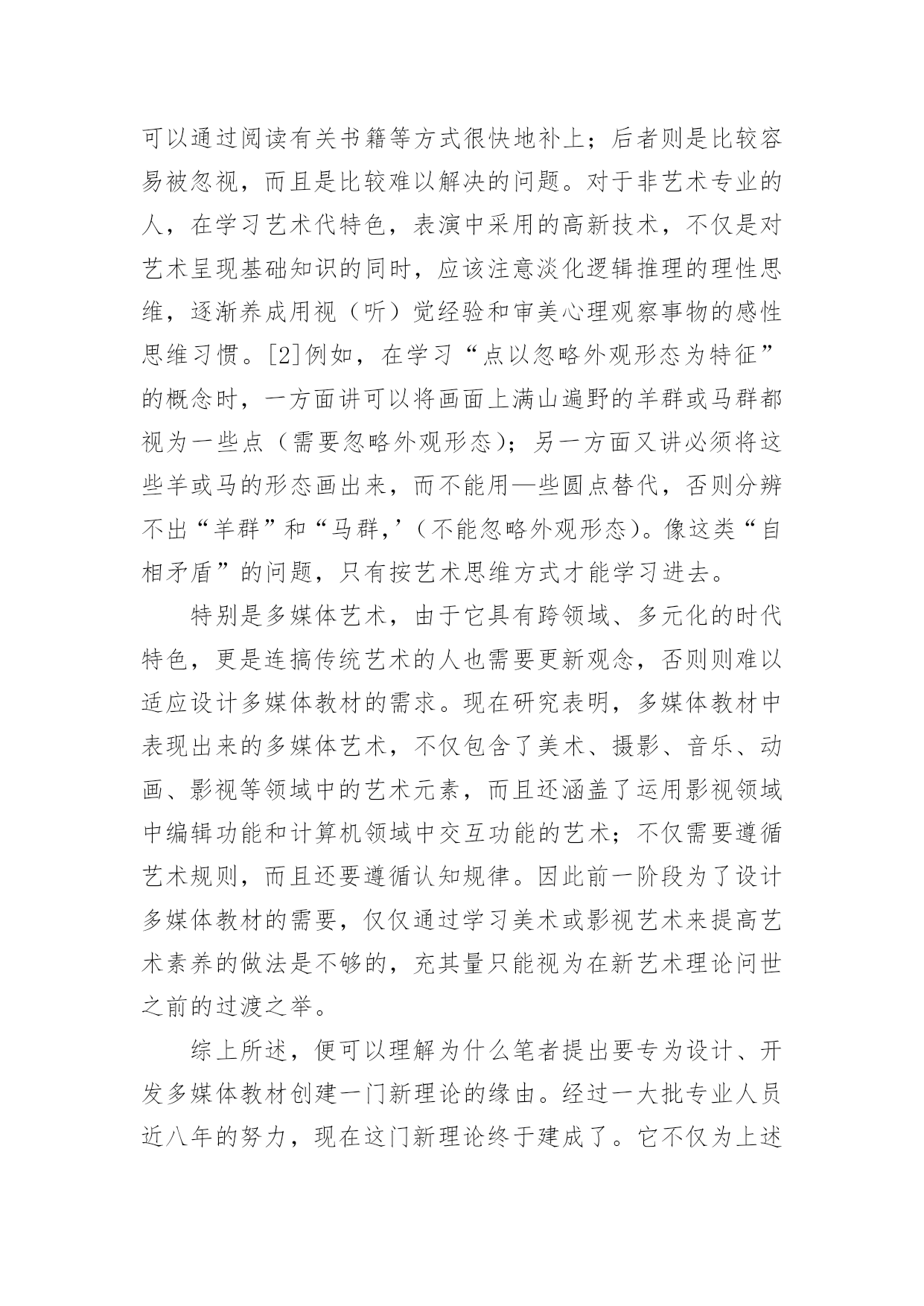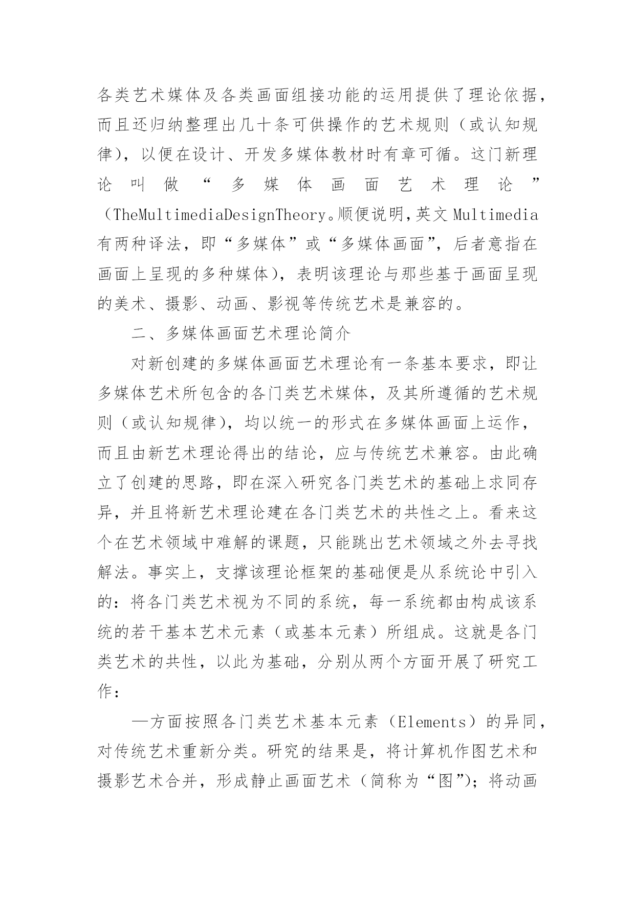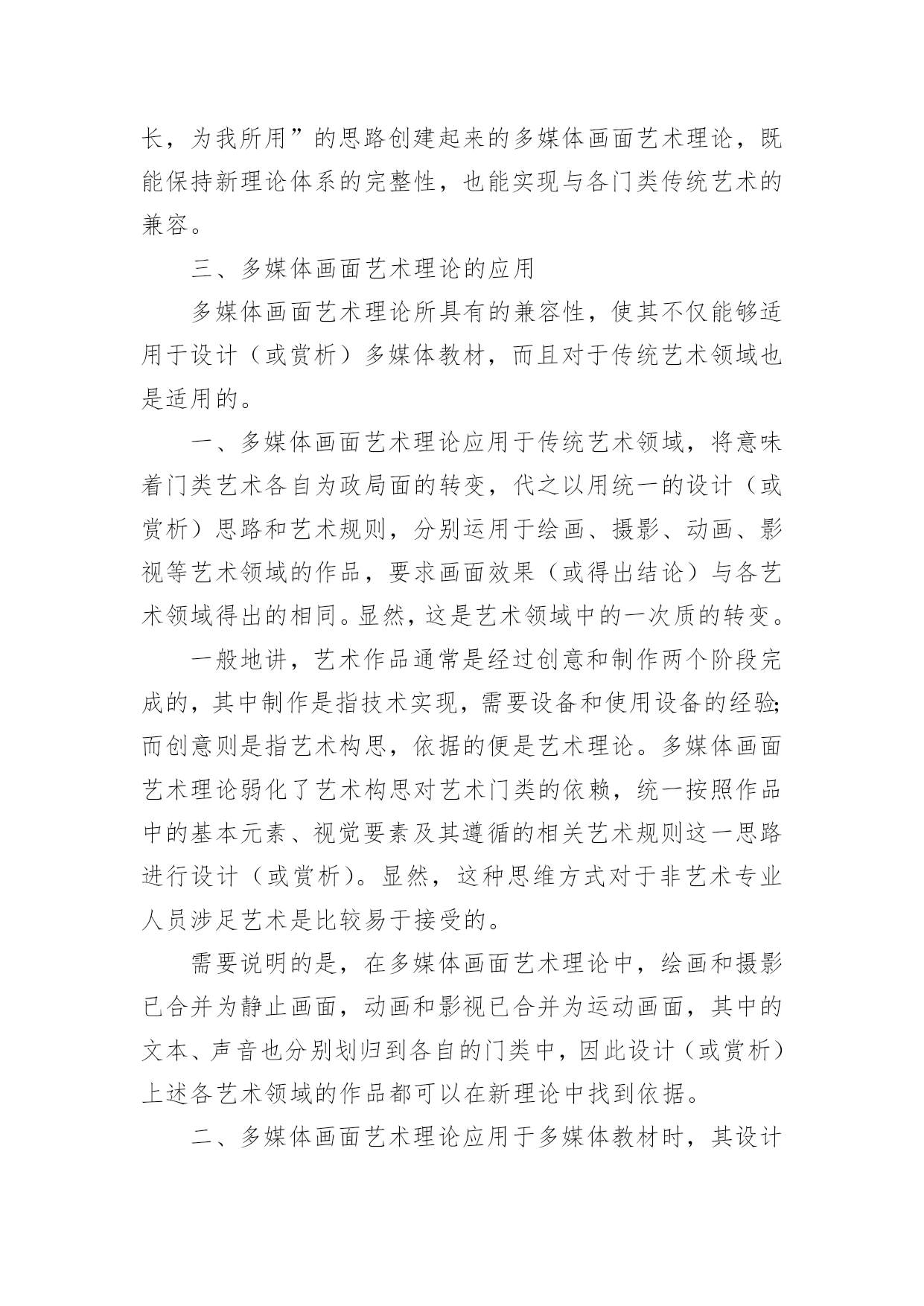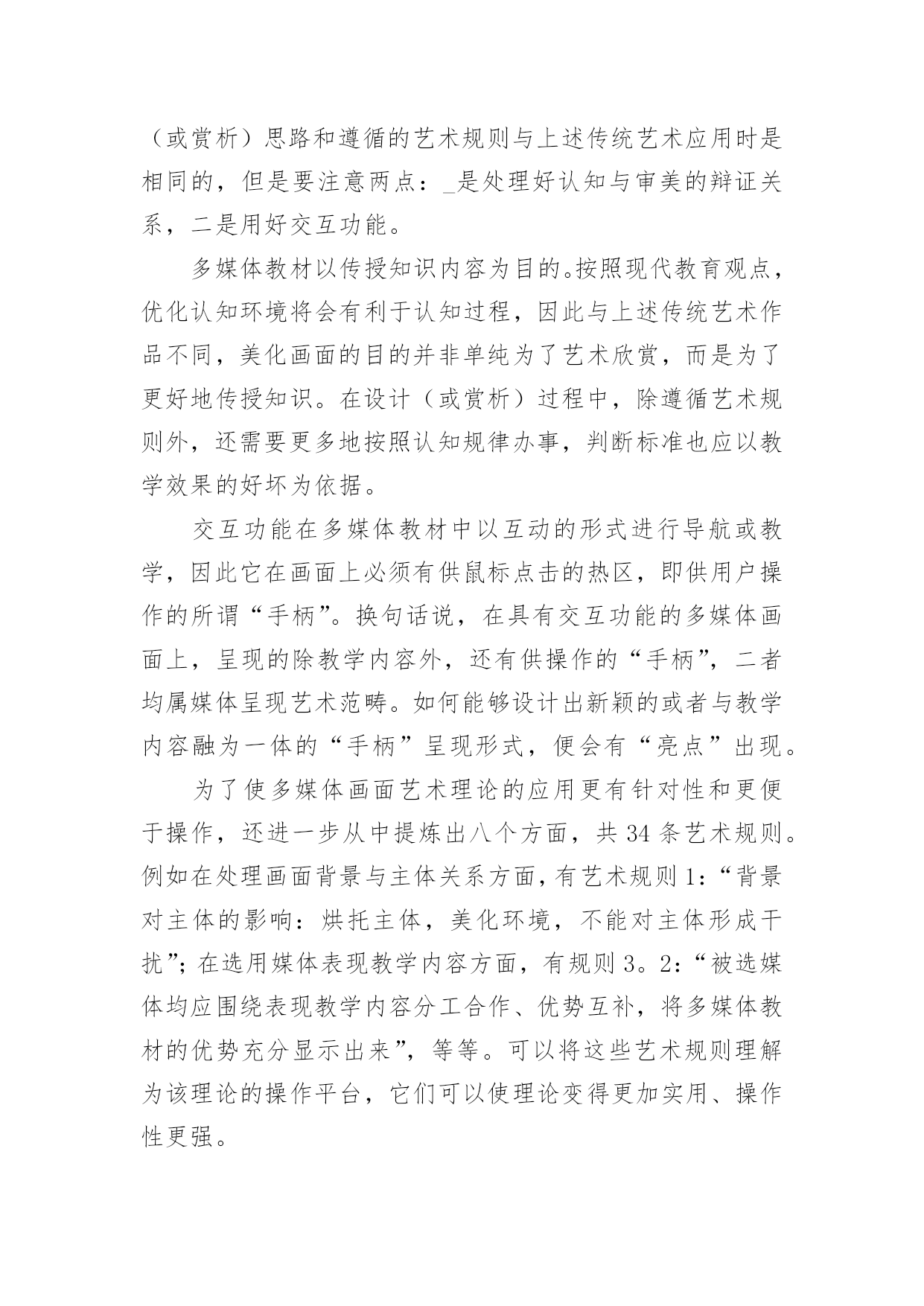 谈谈多媒体画面艺术理论论文谈谈多媒体画面艺术理论论文不久前,南国农先生到天津,笔者谈到了创建新艺术理论的思路,南先生听了很感兴趣,希望笔者写—篇文章详细介绍一下。恭敬不如从命。但是考虑到该理论已在《中国电化教育》杂志上介绍过,因此本文打算从另一个角度,谈谈多媒体画面艺术理论的意义、内容和应用。一、为什么要创建新艺术理论对这个问题的回答,需要从“多媒体艺术”的时代特色和艺术属性谈起。(一)多媒体艺术的时代特色多媒体技术和多媒体艺术是在信息时代问世的,因此在对待技术与艺术的关系上,不可避免地带着很深的时代烙印。正是由于这一时代特色,需要我们转变看待艺术的观念。进入信息时代以后,在跨领域、多元化意识成为时代主流的背景下,人们开始用全新的眼光审视科学技术与艺术,认识到二者实际是人类追求的两大目标:“科学揭示宇宙的奥秘,艺术揭示情感的奥秘。信息时代四大热门课题之一的人性化、自然化界面设计,其显著的特点便是集技术与艺术于一体,旨在同时满足人们的物质需求和精神需求。例如在去年北京奥运会期间,一方面通过“水立方”、“鸟巢”等建筑,体现了“工程艺术化”的设计思想,将一座座现代化的场馆建筑以艺术品的形式展示在人们面前;另一方面通过开、闭幕式的表演,反映了当今“艺术技术化”的时的支撑,有时甚至内化为艺术因素融入到表演之中,成为艺术欣赏的对象。又如在电器商场中,集功能与式样于一身的各种手机、冰箱、电视机、电脑、复印机等家电产品琳琅满目,令人目不暇接,使顾客在满足视觉美感的环境中享受购物的乐趣。因此,信息时代对当今科技人员的要求是,除了掌握本专业的技术外,还应该具备起码的艺术修养,通过理性思维与感性思维的结合,才能实行对产品进行人性化和自然化的设计。处于这样的时代背景下,便不难理解,为什么在设计、开发媒体教材时,只有将多媒体技术与多媒体艺术结合起来,才能将多媒体作品的优势充分发挥出来,使学习者在满足审美需求的环境中完成学习任务。(二)多媒体艺术的艺术属性讨论多媒体艺术的时代特色,旨在说明信息时代设计观念发生了变化,即人们对产品(或作品)的功能与审美是并重的,应该转变那种重技术制作、轻艺术设计的过时观念;而讨论多媒体艺术的艺术属性,则是强调艺术类和技术类的思维方式不同,学习多媒体艺术要按艺术思维方式去学。设计、开发多媒体教材,对于许多非艺术专业的人来讲,可能缺乏所谓“艺术素养”是个普遍存在的问题。艺术素养包括艺术基础知识和艺术思维方式两个方面。前者是有形的,可以通过阅读有关书籍等方式很快地补上;后者则是比较容易被忽视,而且是比较难以解决的问题。对于非艺术专业的人,在学习艺术代特色,表演中采用的高新技术,不仅是对艺术呈现基础知识的同时,应该注意淡化逻辑推理的理性思维,逐渐养成用视(听)觉经验和审美心理观察事物的感性思维习惯。[2]例如,在学习“点以忽略外观形态为特征”的概念时,一方面讲可以将画面上满山遍野的羊群或马群都视为一些点(需要忽略外观形态);另一方面又讲必须将这些羊或马的形态画出来,而不能用—些圆点替代,否则分辨不出“羊群”和“马群,’(不能忽略外观形态)。像这类“自相矛盾”的问题,只有按艺术思维方式才能学习进去。特别是多媒体艺术,由于它具有跨领域、多元化的时代特色,更是连搞传统艺术的人也需要更新观念,否则则难以适应设计多媒体教材的需求。现在研究表明,多媒体教材中表现出来的多媒体艺术,不仅包含了美术、摄影、音乐、动画、影视等领域中的艺术元素,而且还涵盖了运用影视领域中编辑功能和计算机领域中交互功能的艺术;不仅需要遵循艺术规则,而且还要遵循认知规律。因此前一阶段为了设计多媒体教材的需要,仅仅通过学习美术或影视艺术来提高艺术素养的做法是不够的,充其量只能视为在新艺术理论问世之前的过渡之举。综上所述,便可以理解为什么笔者提出要专为设计、开发多媒体教材创建一门新理论的缘由。经过一大批专业人员近八年的努力,现在这门新理论终于建成了。它不仅为上述各类艺术媒体及各类画面组接功能的运用提供了理论依据,而且还归纳整理出几十条可供操作的艺术规则(或认知规律),以便在设计、开发多媒体教材时有章可循。这门新理论叫做“多媒体画面艺术理论”(TheMultimediaDesignTheory。顺便说明,英文Multimedia有两种译法,即“多媒体”或“多媒体画面”,后者意指在画面上呈现的多种媒体),表明该理论与那些基于画面呈现的美术、摄影、动画、影视等传统艺术是兼容的。二、多媒体画面艺术理论简介对新创建的多媒体画面艺术理论有一条基本要求,即让多媒体艺术所包含的各门类艺术媒体,及其所遵循的艺术规则(或认知规律),均以统一的形式在多媒体画面上运作,而且由新艺术理论得出的结论,应与传统艺术兼容。由此确立了创建的思路,即在深入研究各门类艺术的基础上求同存异,并且将新艺术理论建在