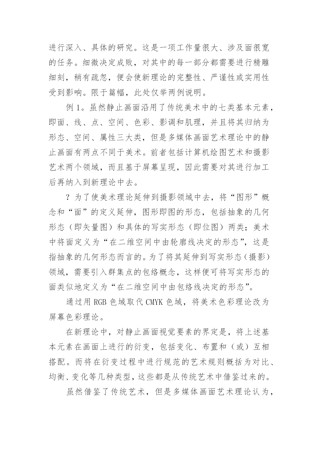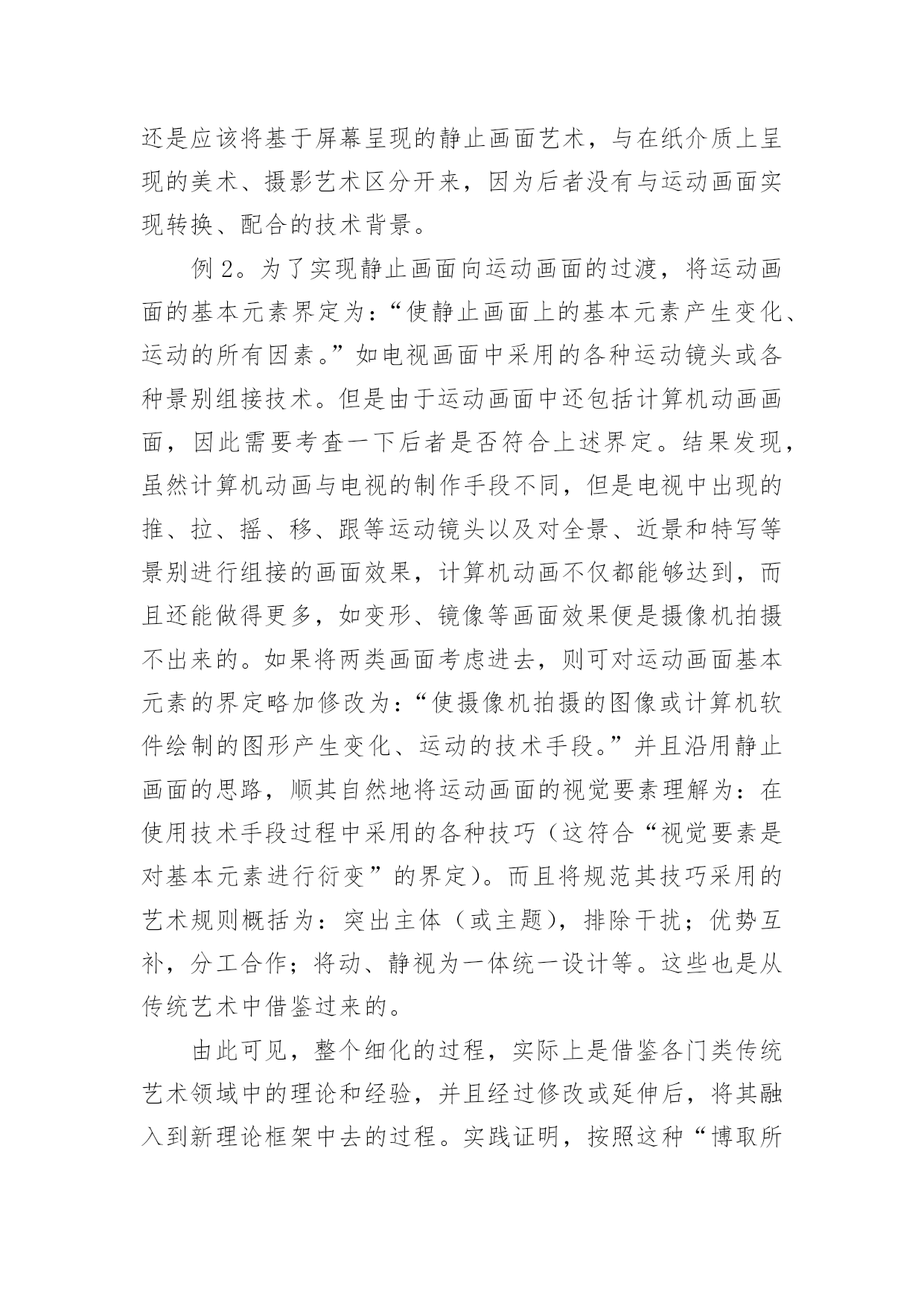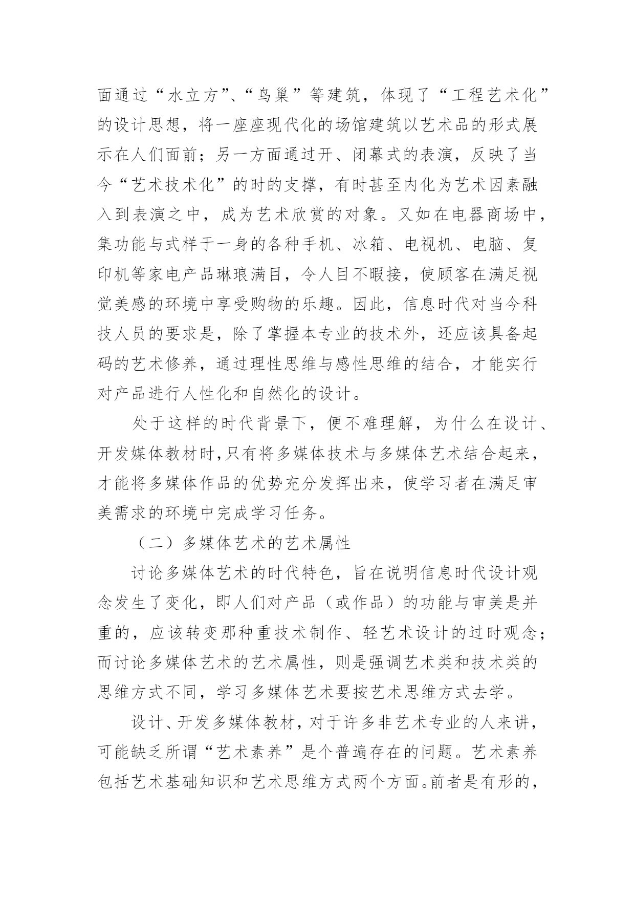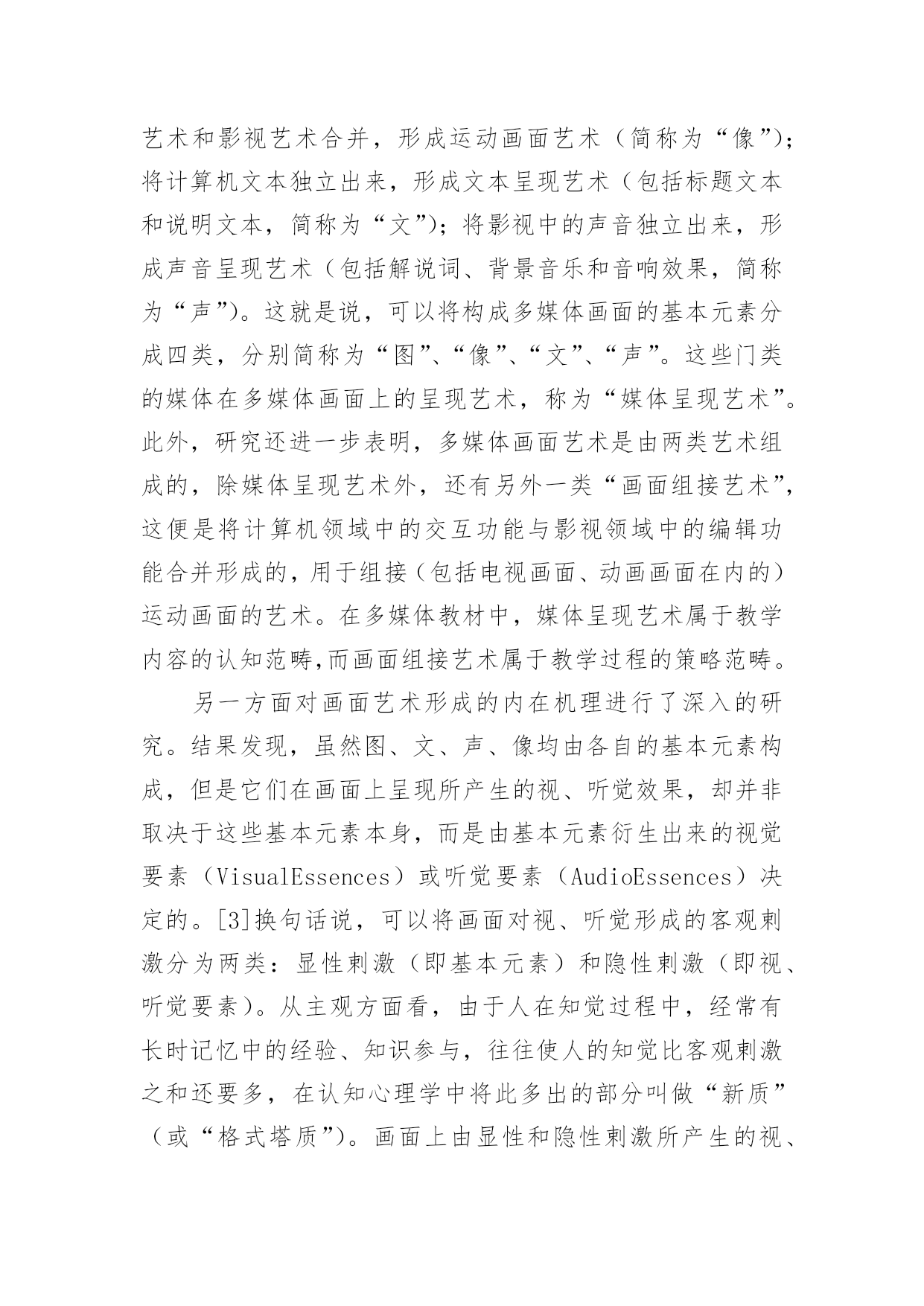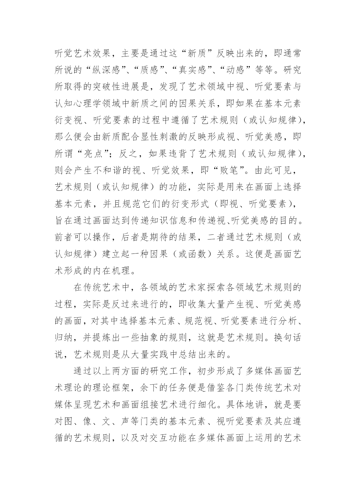 谈谈多媒体画面艺术理论论文谈谈多媒体画面艺术理论论文不久前,南国农先生到天津,笔者谈到了创建新艺术理论的思路,南先生听了很感兴趣,希望笔者写—篇文章详细介绍一下。恭敬不如从命。但是考虑到该理论已在《中国电化教育》杂志上介绍过,因此本文打算从另一个角度,谈谈多媒体画面艺术理论的意义、内容和应用。一、为什么要创建新艺术理论对这个问题的回答,需要从“多媒体艺术”的时代特色和艺术属性谈起。(一)多媒体艺术的时代特色多媒体技术和多媒体艺术是在信息时代问世的,因此在对待技术与艺术的关系上,不可避免地带着很深的时代烙印。正是由于这一时代特色,需要我们转变看待艺术的观念。进入信息时代以后,在跨领域、多元化意识成为时代主流的背景下,人们开始用全新的眼光审视科学技术与艺术,认识到二者实际是人类追求的两大目标:“科学揭示宇宙的奥秘,艺术揭示情感的奥秘。信息时代四大热门课题之一的人性化、自然化界面设计,其显著的特点便是集技术与艺术于一体,旨在同时满足人们的物质需求和精神需求。例如在去年北京奥运会期间,一方面通过“水立方”、“鸟巢”等建筑,体现了“工程艺术化”的设计思想,将一座座现代化的场馆建筑以艺术品的形式展示在人们面前;另一方面通过开、闭幕式的表演,反映了当今“艺术技术化”的时的支撑,有时甚至内化为艺术因素融入到表演之中,成为艺术欣赏的对象。又如在电器商场中,集功能与式样于一身的各种手机、冰箱、电视机、电脑、复印机等家电产品琳琅满目,令人目不暇接,使顾客在满足视觉美感的环境中享受购物的乐趣。因此,信息时代对当今科技人员的要求是,除了掌握本专业的技术外,还应该具备起码的艺术修养,通过理性思维与感性思维的结合,才能实行对产品进行人性化和自然化的设计。处于这样的时代背景下,便不难理解,为什么在设计、开发媒体教材时,只有将多媒体技术与多媒体艺术结合起来,才能将多媒体作品的优势充分发挥出来,使学习者在满足审美需求的环境中完成学习任务。(二)多媒体艺术的艺术属性讨论多媒体艺术的时代特色,旨在说明信息时代设计观念发生了变化,即人们对产品(或作品)的功能与审美是并重的,应该转变那种重技术制作、轻艺术设计的过时观念;而讨论多媒体艺术的艺术属性,则是强调艺术类和技术类的思维方式不同,学习多媒体艺术要按艺术思维方式去学。设计、开发多媒体教材,对于许多非艺术专业的人来讲,可能缺乏所谓“艺术素养”是个普遍存在的问题。艺术素养包括艺术基础知识和艺术思维方式两个方面。前者是有形的,可以通过阅读有关书籍等方式很快地补上;后者则是比较容易被忽视,而且是比较难以解决的问题。对于非艺术专业的人,在学习艺术代特色,表演中采用的高新技术,不仅是对艺术呈现基础知识的同时,应该注意淡化逻辑推理的理性思维,逐渐养成用视(听)觉经验和审美心理观察事物的感性思维习惯。[2]例如,在学习“点以忽略外观形态为特征”的概念时,一方面讲可以将画面上满山遍野的羊群或马群都视为一些点(需要忽略外观形态);另一方面又讲必须将这些羊或马的形态画出来,而不能用—些圆点替代,否则分辨不出“羊群”和“马群,’(不能忽略外观形态)。像这类“自相矛盾”的问题,只有按艺术思维方式才能学习进去。特别是多媒体艺术,由于它具有跨领域、多元化的时代特色,更是连搞传统艺术的人也需要更新观念,否则则难以适应设计多媒体教材的需求。现在研究表明,多媒体教材中表现出来的多媒体艺术,不仅包含了美术、摄影、音乐、动画、影视等领域中的艺术元素,而且还涵盖了运用影视领域中编辑功能和计算机领域中交互功能的艺术;不仅需要遵循艺术规则,而且还要遵循认知规律。因此前一阶段为了设计多媒体教材的需要,仅仅通过学习美术或影视艺术来提高艺术素养的做法是不够的,充其量只能视为在新艺术理论问世之前的过渡之举。综上所述,便可以理解为什么笔者提出要专为设计、开发多媒体教材创建一门新理论的缘由。经过一大批专业人员近八年的努力,现在这门新理论终于建成了。它不仅为上述各类艺术媒体及各类画面组接功能的运用提供了理论依据,而且还归纳整理出几十条可供操作的艺术规则(或认知规律),以便在设计、开发多媒体教材时有章可循。这门新理论叫做“多媒体画面艺术理论”(TheMultimediaDesignTheory。顺便说明,英文Multimedia有两种译法,即“多媒体”或“多媒体画面”,后者意指在画面上呈现的多种媒体),表明该理论与那些基于画面呈现的美术、摄影、动画、影视等传统艺术是兼容的。二、多媒体画面艺术理论简介对新创建的多媒体画面艺术理论有一条基本要求,即让多媒体艺术所包含的各门类艺术媒体,及其所遵循的艺术规则(或认知规律),均以统一的形式在多媒体画面上运作,而且由新艺术理论得出的结论,应与传统艺术兼容。由此确立了创建的思路,即在深入研究各门类艺术的基础上求同存异,并且将新艺术理论建在