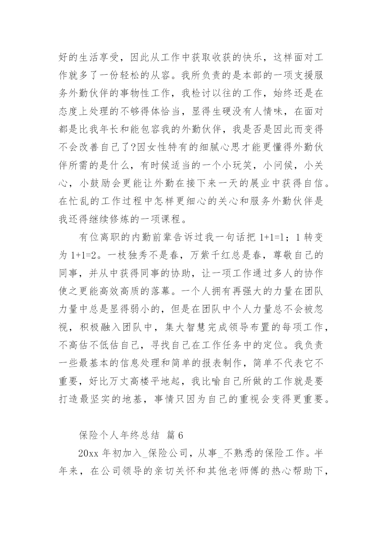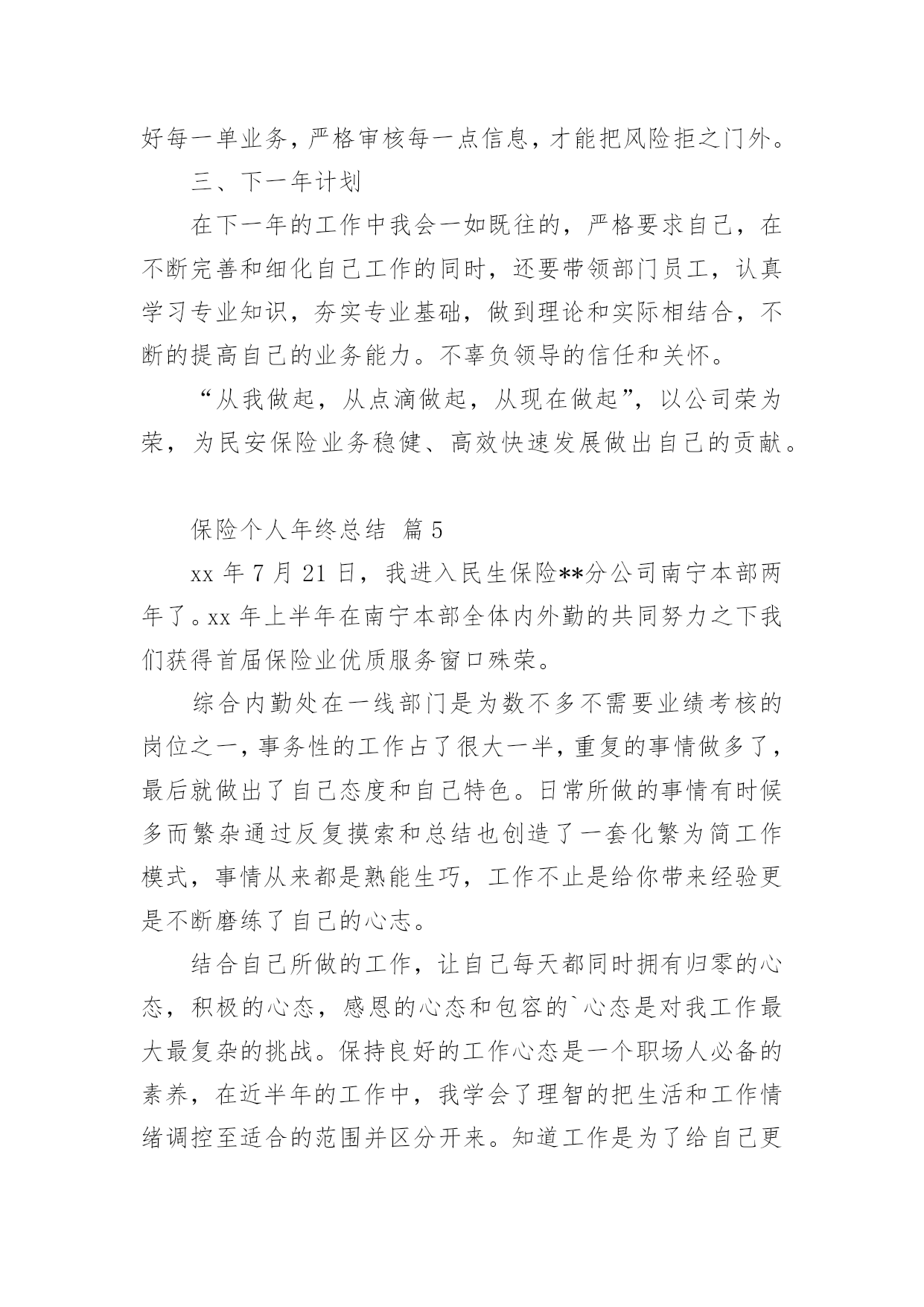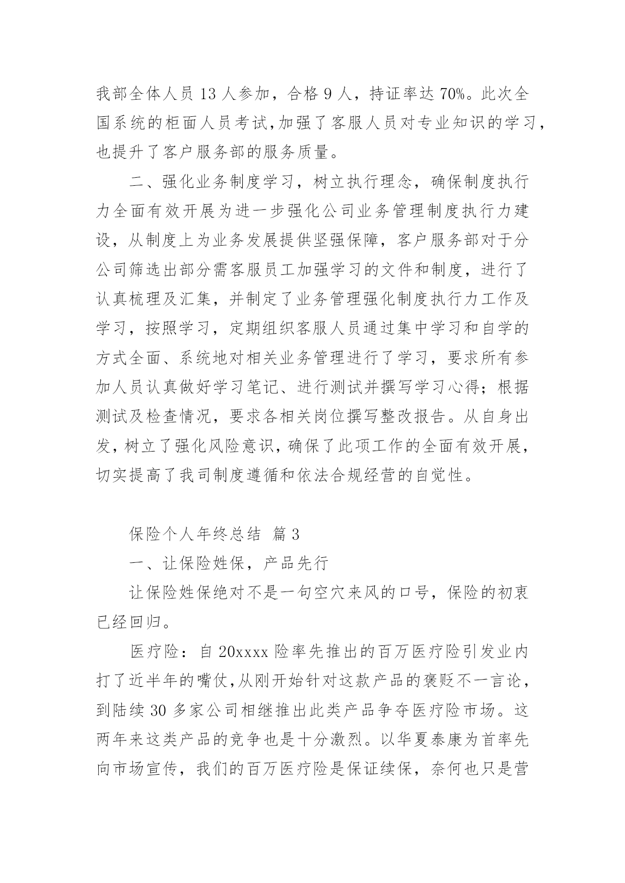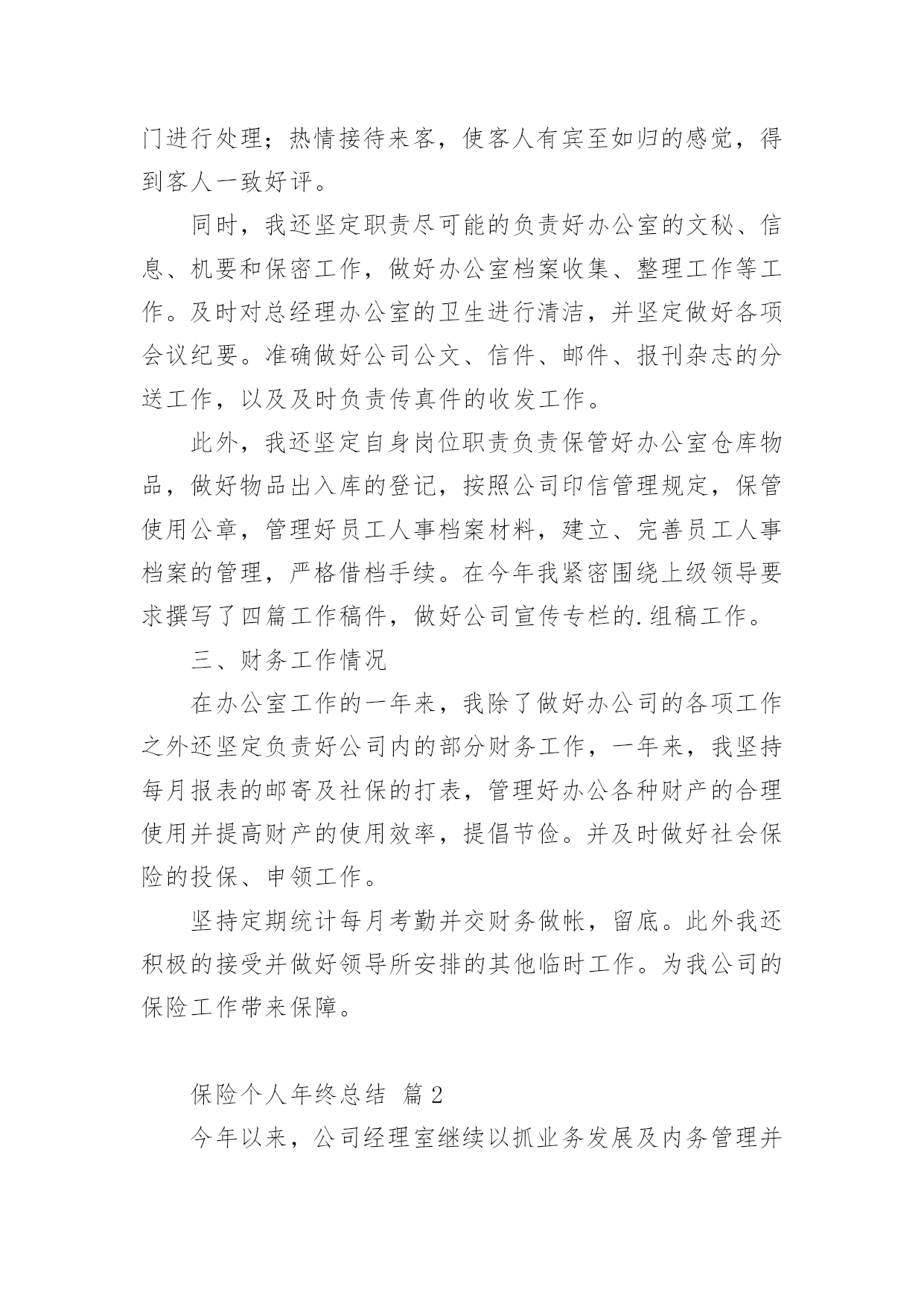 保险个人年终总结总结是指对某一阶段的工作、学习或思想中的经验或情况进行分析研究,做出带有规律性结论的书面材料,通过它可以全面地、系统地了解以往的学习和工作情况,因此,让我们写一份总结吧。那么你真的懂得怎么写总结吗?以下是小编精心整理的保险个人年终总结,希望能够帮助到大家。保险个人年终总结篇1一、实习工作情况我于今年XX月份进入我XX财产保险公司工作。自进入公司之初,我在我公司大厅进行了为期三个月的工作实习。在实习期间,我较好地完成了公司上级领导所安排的各项工作任务,积极向我XX财产保险公司的老员工进行学习,虚心请教和吸取老一辈员工经验,做到了在较短的时间内融入了我XX财产保险公司,并熟悉的掌握和了解了我公司的各项保险业务,做到主动接待,热情服务,用真挚,微笑的服务态度,赢得了顾客的一致好评,和领导以及同事的一致肯定与认可。二、办公室工作情况我于去年4月份被分配到办公室进行工作。自进入办公司工作以来,我坚持在竞争中求生存,在竞争中促发展的工作理念。立实踏实工作,勤恳做人。在工作中,我做到及时接听和转接电话,并将来电信息准确记录,及时转到相关部门进行处理;热情接待来客,使客人有宾至如归的感觉,得到客人一致好评。同时,我还坚定职责尽可能的负责好办公室的文秘、信息、机要和保密工作,做好办公室档案收集、整理工作等工作。及时对总经理办公室的卫生进行清洁,并坚定做好各项会议纪要。准确做好公司公文、信件、邮件、报刊杂志的分送工作,以及及时负责传真件的收发工作。此外,我还坚定自身岗位职责负责保管好办公室仓库物品,做好物品出入库的登记,按照公司印信管理规定,保管使用公章,管理好员工人事档案材料,建立、完善员工人事档案的管理,严格借档手续。在今年我紧密围绕上级领导要求撰写了四篇工作稿件,做好公司宣传专栏的.组稿工作。三、财务工作情况在办公室工作的一年来,我除了做好办公司的各项工作之外还坚定负责好公司内的部分财务工作,一年来,我坚持每月报表的邮寄及社保的打表,管理好办公各种财产的合理使用并提高财产的使用效率,提倡节俭。并及时做好社会保险的投保、申领工作。坚持定期统计每月考勤并交财务做帐,留底。此外我还积极的接受并做好领导所安排的其他临时工作。为我公司的保险工作带来保障。保险个人年终总结篇2今年以来,公司经理室继续以抓业务发展及内务管理并重,实现两手抓,齐抓共管的管理模式,带领客服全体员工,团结奋进,客服管理工作取得了一定的成绩,客服水平也有了一些根本的提高。公司通过开展集中、统一的客户服务活动,进一步整合服务资源,促进以保单为中心的服务向以客户为中心的服务转型,不断提升服务水平,创造客户价值,积极承担社会责任,为公司永续经营打下坚实的`基础客户服务部紧紧围绕公司总体发展目标,在做好本职工作的同时做好服务创新,体现在以下几个方面。一、在制度建设方面,继续加强客户服务基础管理工作,进一步完善相关管理制度。1、主要从“内强素质、外树形象“着手,通过狠抓公司各岗位人员素质,进一步提高客户满意度,树立公司良好的对外形象。2、一个优秀的团队须有一个素质、技术过硬的服务队伍,今年以来,我部着重从完善制度着手,通过加大制度的执行力不断加大服务考核力度,以进一步提高客服人员综合素质。3、加强服务意识、强化服务执行标准等几方面对客户服务人员做了一些强化训练,加大了现场监督考核力度,现场检查,现场指导,并予以相应处罚。通过一系列的措施,使柜面人员加大了操作的规范性,服务礼仪的执行上也有了一个很大的提升,也为我司不断提高服务水平奠定了很好的基础作用。xx年xx月,总公司举行了全国柜面人员上岗资格考试,我部全体人员13人参加,合格9人,持证率达70%。此次全国系统的柜面人员考试,加强了客服人员对专业知识的学习,也提升了客户服务部的服务质量。二、强化业务制度学习,树立执行理念,确保制度执行力全面有效开展为进一步强化公司业务管理制度执行力建设,从制度上为业务发展提供坚强保障,客户服务部对于分公司筛选出部分需客服员工加强学习的文件和制度,进行了认真梳理及汇集,并制定了业务管理强化制度执行力工作及学习,按照学习,定期组织客服人员通过集中学习和自学的方式全面、系统地对相关业务管理进行了学习,要求所有参加人员认真做好学习笔记、进行测试并撰写学习心得;根据测试及检查情况,要求各相关岗位撰写整改报告。从自身出发,树立了强化风险意识,确保了此项工作的全面有效开展,切实提高了我司制度遵循和依法合规经营的自觉性。保险个人年终总结篇3一、让保险姓保,产品先行让保险姓保绝对不是一句空穴来风的口号,保险的初衷已经回归。医疗险:自20xxxx险率先推出的百万医疗险引发业内打了近半年的嘴仗,从刚开始针对这款产品的褒贬不一言论,到陆续30多家公司相继推出此类产品争夺医疗险市场。这两年来这类产品的竞争也是十
