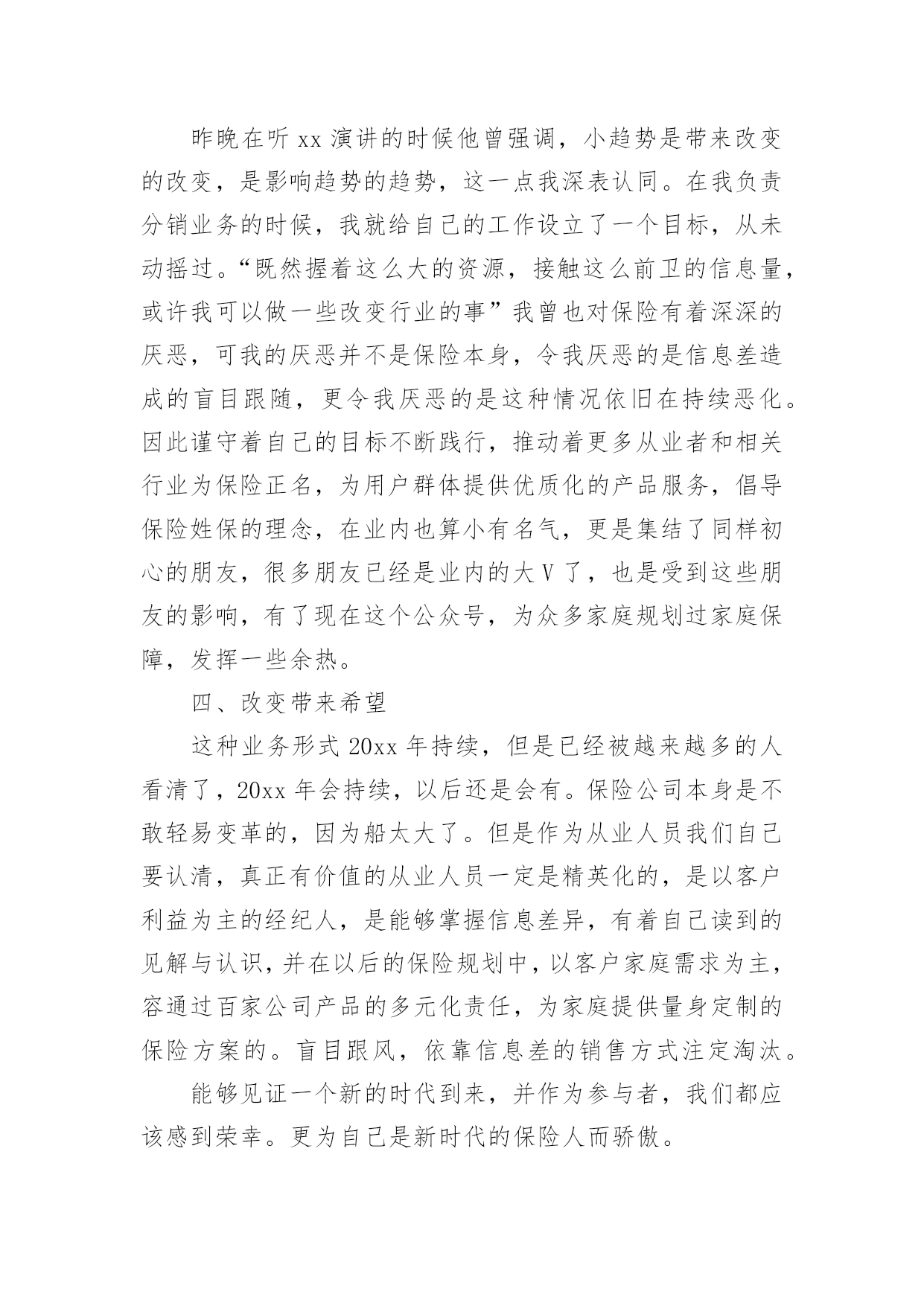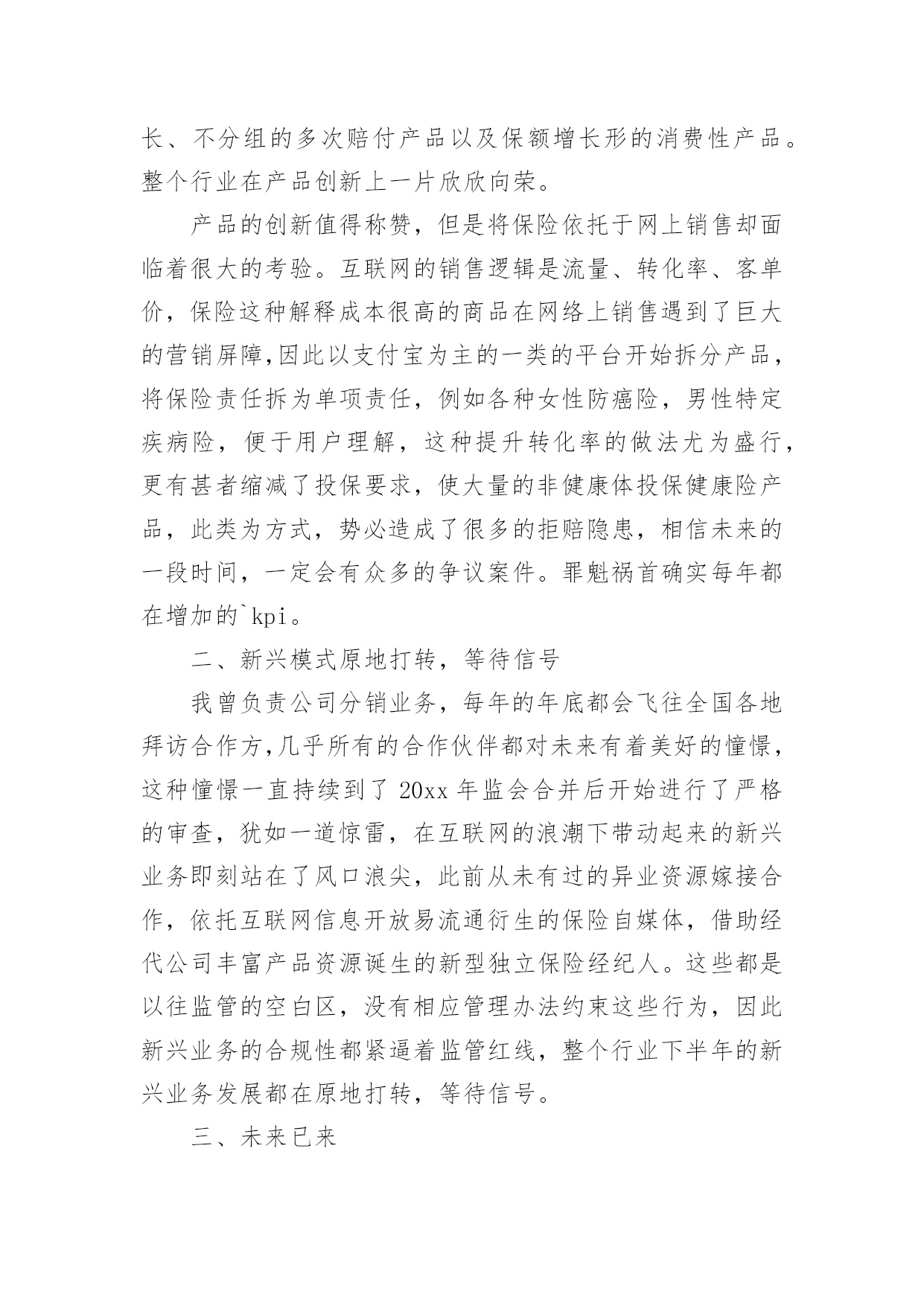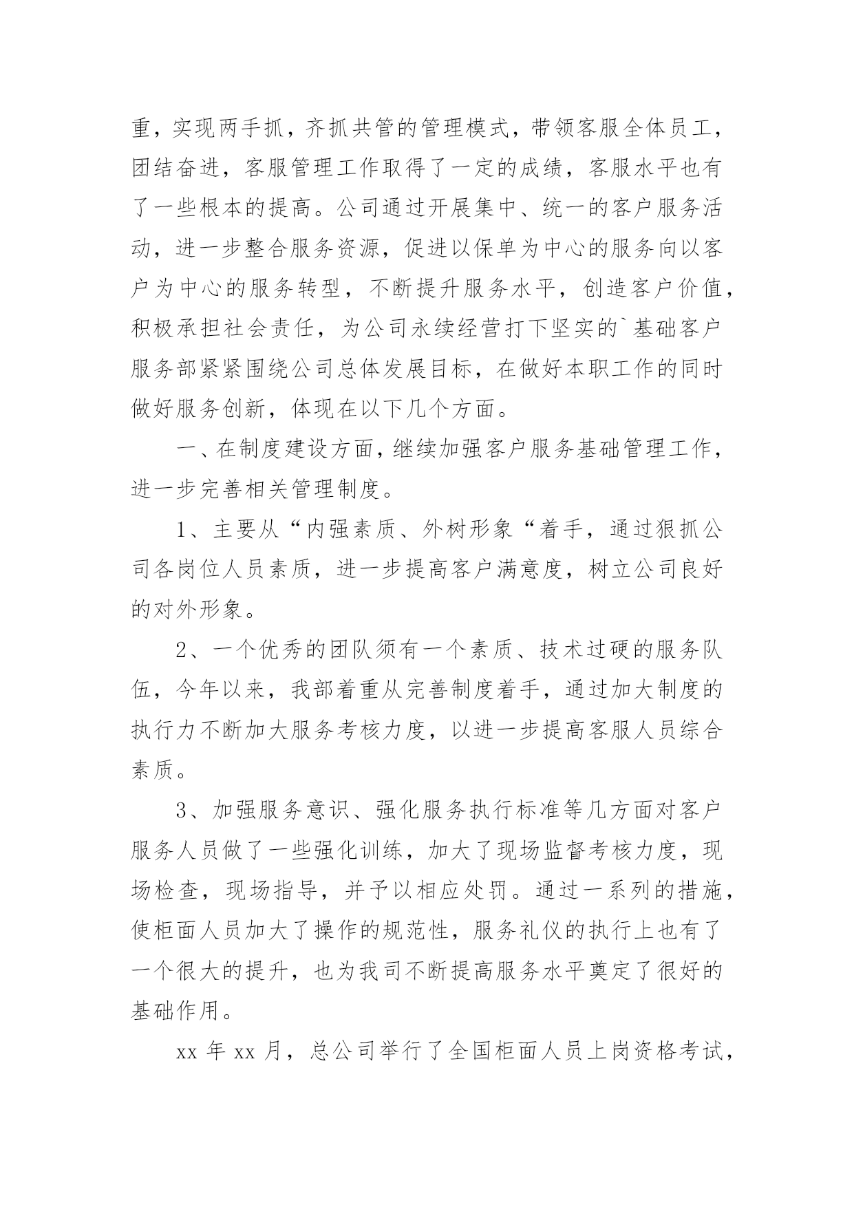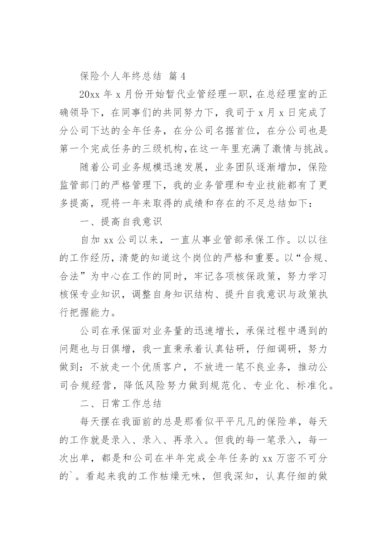 保险个人年终总结总结是指对某一阶段的工作、学习或思想中的经验或情况进行分析研究,做出带有规律性结论的书面材料,通过它可以全面地、系统地了解以往的学习和工作情况,因此,让我们写一份总结吧。那么你真的懂得怎么写总结吗?以下是小编精心整理的保险个人年终总结,希望能够帮助到大家。保险个人年终总结篇1一、实习工作情况我于今年XX月份进入我XX财产保险公司工作。自进入公司之初,我在我公司大厅进行了为期三个月的工作实习。在实习期间,我较好地完成了公司上级领导所安排的各项工作任务,积极向我XX财产保险公司的老员工进行学习,虚心请教和吸取老一辈员工经验,做到了在较短的时间内融入了我XX财产保险公司,并熟悉的掌握和了解了我公司的各项保险业务,做到主动接待,热情服务,用真挚,微笑的服务态度,赢得了顾客的一致好评,和领导以及同事的一致肯定与认可。二、办公室工作情况我于去年4月份被分配到办公室进行工作。自进入办公司工作以来,我坚持在竞争中求生存,在竞争中促发展的工作理念。立实踏实工作,勤恳做人。在工作中,我做到及时接听和转接电话,并将来电信息准确记录,及时转到相关部门进行处理;热情接待来客,使客人有宾至如归的感觉,得到客人一致好评。同时,我还坚定职责尽可能的负责好办公室的文秘、信息、机要和保密工作,做好办公室档案收集、整理工作等工作。及时对总经理办公室的卫生进行清洁,并坚定做好各项会议纪要。准确做好公司公文、信件、邮件、报刊杂志的分送工作,以及及时负责传真件的收发工作。此外,我还坚定自身岗位职责负责保管好办公室仓库物品,做好物品出入库的登记,按照公司印信管理规定,保管使用公章,管理好员工人事档案材料,建立、完善员工人事档案的管理,严格借档手续。在今年我紧密围绕上级领导要求撰写了四篇工作稿件,做好公司宣传专栏的.组稿工作。三、财务工作情况在办公室工作的一年来,我除了做好办公司的各项工作之外还坚定负责好公司内的部分财务工作,一年来,我坚持每月报表的邮寄及社保的打表,管理好办公各种财产的合理使用并提高财产的使用效率,提倡节俭。并及时做好社会保险的投保、申领工作。坚持定期统计每月考勤并交财务做帐,留底。此外我还积极的接受并做好领导所安排的其他临时工作。为我公司的保险工作带来保障。保险个人年终总结篇2今年以来,公司经理室继续以抓业务发展及内务管理并重,实现两手抓,齐抓共管的管理模式,带领客服全体员工,团结奋进,客服管理工作取得了一定的成绩,客服水平也有了一些根本的提高。公司通过开展集中、统一的客户服务活动,进一步整合服务资源,促进以保单为中心的服务向以客户为中心的服务转型,不断提升服务水平,创造客户价值,积极承担社会责任,为公司永续经营打下坚实的`基础客户服务部紧紧围绕公司总体发展目标,在做好本职工作的同时做好服务创新,体现在以下几个方面。一、在制度建设方面,继续加强客户服务基础管理工作,进一步完善相关管理制度。1、主要从“内强素质、外树形象“着手,通过狠抓公司各岗位人员素质,进一步提高客户满意度,树立公司良好的对外形象。2、一个优秀的团队须有一个素质、技术过硬的服务队伍,今年以来,我部着重从完善制度着手,通过加大制度的执行力不断加大服务考核力度,以进一步提高客服人员综合素质。3、加强服务意识、强化服务执行标准等几方面对客户服务人员做了一些强化训练,加大了现场监督考核力度,现场检查,现场指导,并予以相应处罚。通过一系列的措施,使柜面人员加大了操作的规范性,服务礼仪的执行上也有了一个很大的提升,也为我司不断提高服务水平奠定了很好的基础作用。xx年xx月,总公司举行了全国柜面人员上岗资格考试,我部全体人员13人参加,合格9人,持证率达70%。此次全国系统的柜面人员考试,加强了客服人员对专业知识的学习,也提升了客户服务部的服务质量。二、强化业务制度学习,树立执行理念,确保制度执行力全面有效开展为进一步强化公司业务管理制度执行力建设,从制度上为业务发展提供坚强保障,客户服务部对于分公司筛选出部分需客服员工加强学习的文件和制度,进行了认真梳理及汇集,并制定了业务管理强化制度执行力工作及学习,按照学习,定期组织客服人员通过集中学习和自学的方式全面、系统地对相关业务管理进行了学习,要求所有参加人员认真做好学习笔记、进行测试并撰写学习心得;根据测试及检查情况,要求各相关岗位撰写整改报告。从自身出发,树立了强化风险意识,确保了此项工作的全面有效开展,切实提高了我司制度遵循和依法合规经营的自觉性。保险个人年终总结篇3一、让保险姓保,产品先行让保险姓保绝对不是一句空穴来风的口号,保险的初衷已经回归。医疗险:自20xxxx险率先推出的百万医疗险引发业内打了近半年的嘴仗,从刚开始针对这款产品的褒贬不一言论,到陆续30多家公司相继推出此类产品争夺医疗险市场。这两年来这类产品的竞争也是十