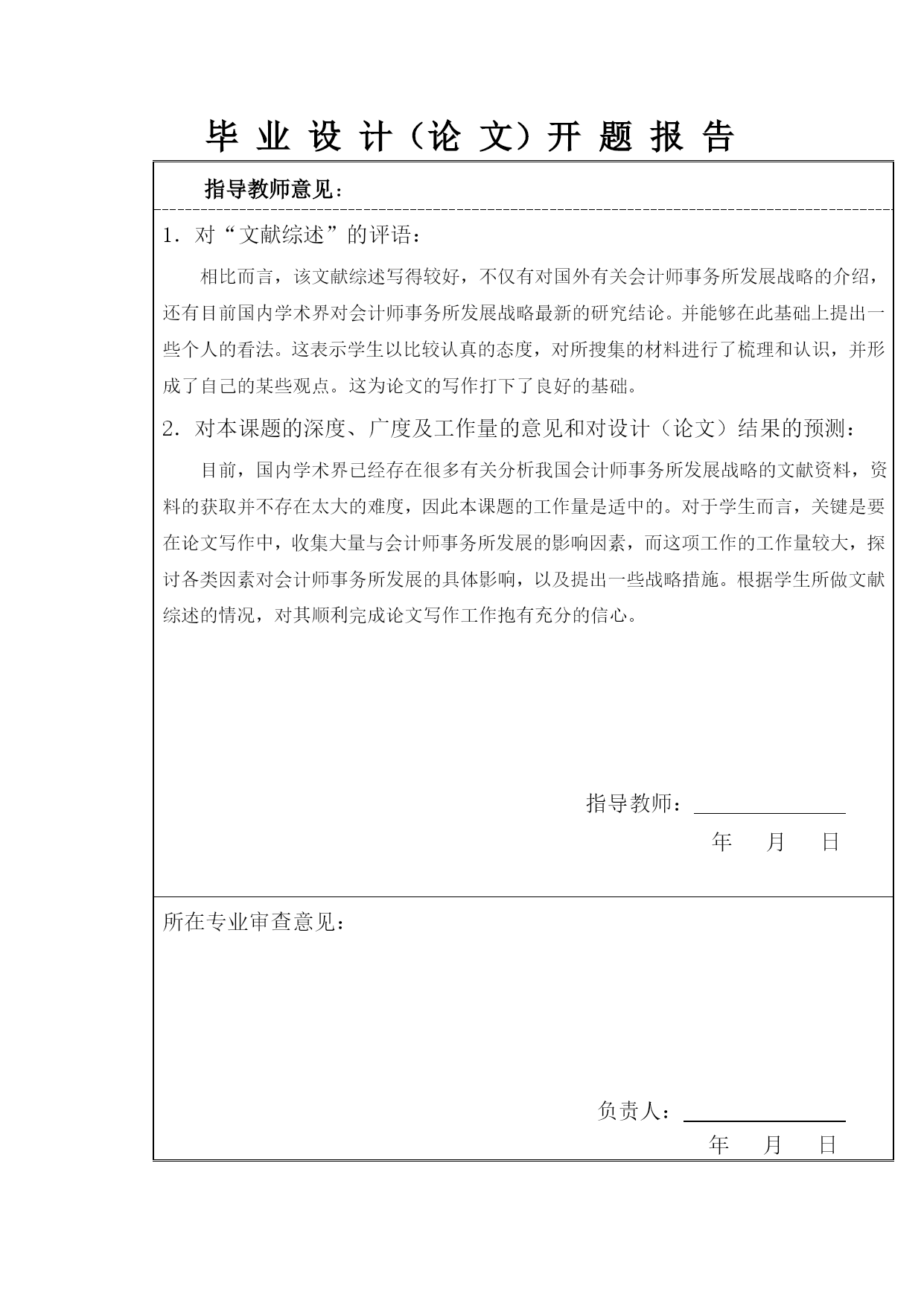 南京理工大学紫金学院毕业设计(论文)开题报告学生姓名:戴鹏学号:110703363专业:会计学设计(论文)题目:本土会计师事务所发展战略分析指导教师:唐婉虹2014年11月8日开题报告填写要求1.开题报告(含“文献综述”)作为毕业设计(论文)答辩委员会对学生答辩资格审查的依据材料之一。此报告应在指导教师指导下,由学生在毕业设计(论文)工作前期内完成,经指导教师签署意见及所在专业审查后生效;2.开题报告内容必须用黑墨水笔工整书写或按教务处统一设计的电子文档标准格式(可从教务处网页上下载)打印,禁止打印在其它纸上后剪贴,完成后应及时交给指导教师签署意见;3.“文献综述”应按论文的格式成文,并直接书写(或打印)在本开题报告第一栏目内,学生写文献综述的参考文献应不少于15篇(不包括辞典、手册);4.有关年月日等日期的填写,应当按照国标GB/T7408—94《数据元和交换格式、信息交换、日期和时间表示法》规定的要求,一律用阿拉伯数字书写。如“2008年9月15日”或“2008-09-15”。毕业设计(论文)开题报告1.结合毕业设计(论文)课题情况,根据所查阅的文献资料,每人撰写2000字左右的文献综述:文献综述会计师事务所是指依法独立承担注册会计师业务的中介服务机构,是由有一定会计专业水平经考核取得证书的会计师组成的受当事人委托承办有关审计会计咨询税务等方面业务的组织自从1981年上海成立第一家会计师事务所至今,在近30年的时间里,我国会计师事务所伴随着我国经济社会的快速发展而迅速成长"同时,我国的会计服务市场开始与国际接轨,一大批国外会计师事务所以各种形式进入中国市场,国内会计师事务所不仅要面对国内同行的竞争,还要面对国外同行的竞争"这为我国会计师事务所的发展提供了前所未有的机遇,同时也带来了严峻的考验。(1)国外研究现状Narasimhan和Chung(1998)认为,“八大”合并为“六大”主要是为了提高其国际竞争力,从而提升其在国际上的地位,进而在为跨国公司服务时占据更加有利的位置。ThavapalanS.,MoroneyR.和SimnettR(2002)对1989年Coopers&Lybrand与PriceWaterhouse的合并进行了研究,发现合并为PriceWaterhouseCoopers后,事务所的市场地位显著提升,在审计市场的多个行业中跃居主导地位。FrancisJR,StocksDJ和AndersonD(1999)对1989年当时“八大”会计师事务所之间的合并行为的实证分析,结果表明了会计师事务所审计市场集中度的提高,既能够增加事务所在审计市场的竞争度,也有利于提高会计师事务所的经营和管理效率。DeAngelo(1981)提供了一个分析框架来分析事务所规模和审计质量的关系,指出审计质量主要取决于审计独立性和注册会计师的执业能力,一方面论证了事务所规模越大,其审计独立性越强;另一方面事务所规模越大,越有利于注册会计师执业能力的提高。PaulK.Chaney和Debrac.Jeter(2003)通过比较分析会计师事务所的公司制形式与事务所审计业务收入的相关联系,研究表明了合伙制形式的会计师事务所比有限责任制会计师事务所更能提高审计质量。其实这个也是不难理解的,有限责任制形式的事务所发生审计舞弊时,只是以有限责任公司法人的财产为限对其承担审计责任赔偿,而合伙制会计师事务所是以合伙人的所有财产为限对发生审计舞弊进行赔偿。虽然他们指出了此差别,但是没有得到一个最优的赔偿金额来使两者合理化。AThomasC.Wooten(2003)分析了会计师事务所发展的影响因素,主要包括其规模、人力资源、内部控制过程等,研究了其对事务所发展的影响,并提出相应的控制措施,从而强化对事务所内部治理的控制。(2)国内研究现状自从1981年上海成立第一家会计师事务所,标志中国在建国年后重新恢复了注册会计师制度之后在近三十多年的时间里,中国会计师事务所伴随着中国经济的快速成长,得到了迅速发展,但是,也应看到,在中国注册会计师职业迅猛发展的过程中,出现了不少亟待解决的问题。王聪(2010)认为我国会计师事务所规模较小,竞争能力不强。从业人员的素质参差不齐,各种形式的行政干预仍比较突出。法律法规建设未能跟上形势发展,违规操作较多。从多样化发展战略,规模化发展战略,国际化发展战略三方面提出决策。蔡铃铃(2010)应用SWOT分析框架,对会计师事务所面临的优势,劣势,面对的机会,挑战一一进行剖析,并结合实际情况,提出了会计师事务所未来发展战略在市场细分,组织形式,规模效应,多元业务和品牌发展等方面的理性选择。于海云、王则斌(2010)从“嵌入性视角”出发,认为会计师事务所是嵌入