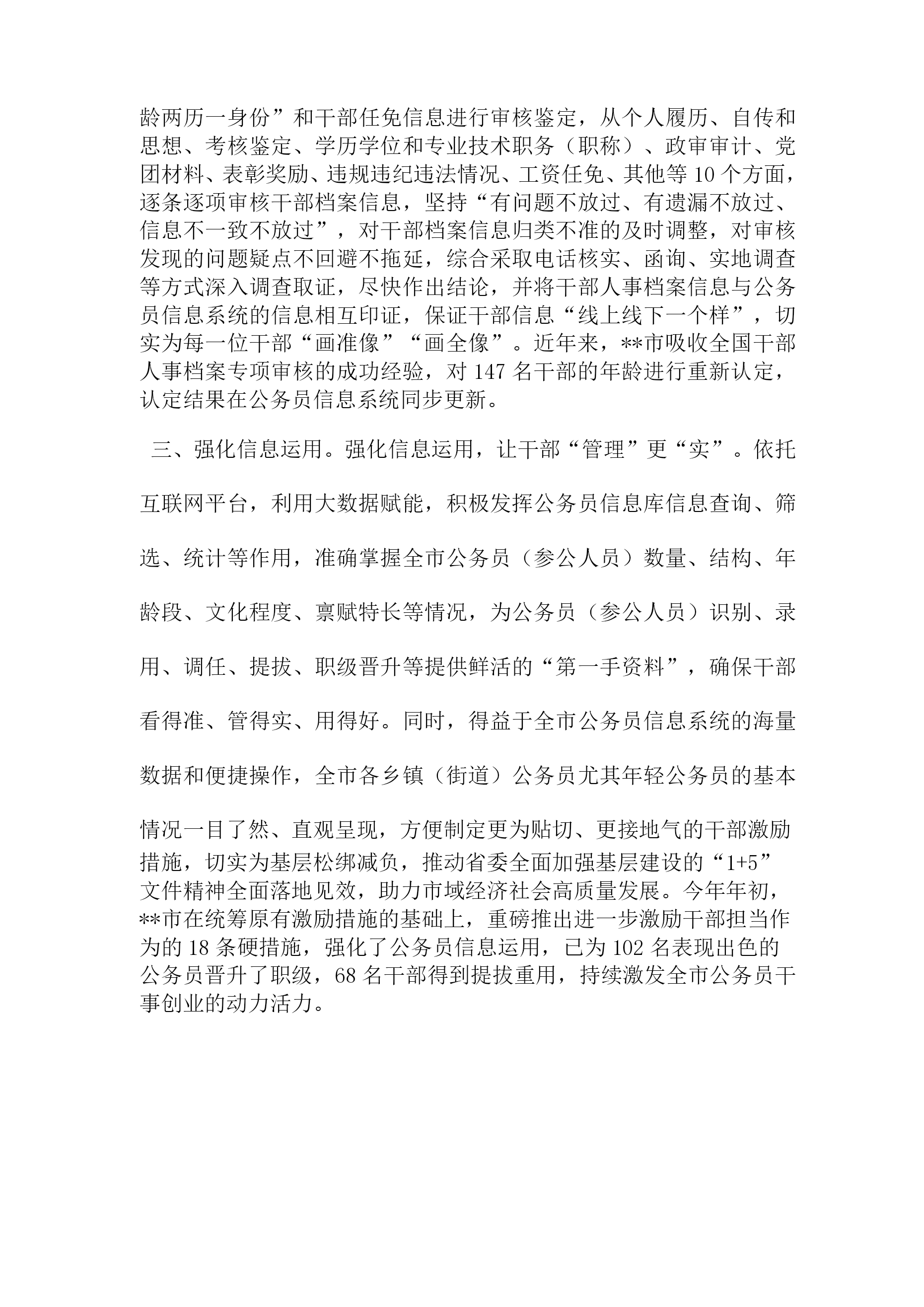 公务员信息管理工作汇报近年来,我市将公务员信息管理作为新时代公务员管理工作的重要抓手,着力打好强化信息维护、强化信息审核、强化信息运用的“组合拳”,进一步规范全市公务员信息管理,充分发挥公务员信息在干部管理使用中的基础性作用,激励公务员群体担当作为、干事创业,凝聚全市经济社会高质量发展的强大正能量。一、强化信息维护。依托全市公务员信息系统,扎实做好每一名公务员信息的录入、更新和维护。突出做好新招录公务员、调任转任干部的信息采集与确认,针对调出、辞职、辞退、退休、死亡等不同类型公务员,严格按照制度程序,及时在系统内将相关人员的信息退出。“一对一”“点对点”,有条不紊、逐一录入,确保每一名公务员的信息无遗漏、无重复、无错误,保证每一条信息数据的精准性、真实性,让公务员信息成为实时反映公务员个人状态的“晴雨表”和“电子名片”。今年以来,**市按照计划对全市公务员信息系统开展年中维护,2991名公务员的基本信息逐项“过筛”,实行全面“体检”,及时对4名调任干部、35名离退休干部、210名职务职级发生变化干部的个人信息予以更新。二、强化信息审核。对照干部个人档案专审表,结合干部人事档案,对全市所有在职科级干部、一般科员、办事员、新考录公务员的“三龄两历一身份”和干部任免信息进行审核鉴定,从个人履历、自传和思想、考核鉴定、学历学位和专业技术职务(职称)、政审审计、党团材料、表彰奖励、违规违纪违法情况、工资任免、其他等10个方面,逐条逐项审核干部档案信息,坚持“有问题不放过、有遗漏不放过、信息不一致不放过”,对干部档案信息归类不准的及时调整,对审核发现的问题疑点不回避不拖延,综合采取电话核实、函询、实地调查等方式深入调查取证,尽快作出结论,并将干部人事档案信息与公务员信息系统的信息相互印证,保证干部信息“线上线下一个样”,切实为每一位干部“画准像”“画全像”。近年来,**市吸收全国干部人事档案专项审核的成功经验,对147名干部的年龄进行重新认定,认定结果在公务员信息系统同步更新。三、强化信息运用。强化信息运用,让干部“管理”更“实”。依托互联网平台,利用大数据赋能,积极发挥公务员信息库信息查询、筛选、统计等作用,准确掌握全市公务员(参公人员)数量、结构、年龄段、文化程度、禀赋特长等情况,为公务员(参公人员)识别、录用、调任、提拔、职级晋升等提供鲜活的“第一手资料”,确保干部看得准、管得实、用得好。同时,得益于全市公务员信息系统的海量数据和便捷操作,全市各乡镇(街道)公务员尤其年轻公务员的基本情况一目了然、直观呈现,方便制定更为贴切、更接地气的干部激励措施,切实为基层松绑减负,推动省委全面加强基层建设的“1+5”文件精神全面落地见效,助力市域经济社会高质量发展。今年年初,**市在统筹原有激励措施的基础上,重磅推出进一步激励干部担当作为的18条硬措施,强化了公务员信息运用,已为102名表现出色的公务员晋升了职级,68名干部得到提拔重用,持续激发全市公务员干事创业的动力活力。