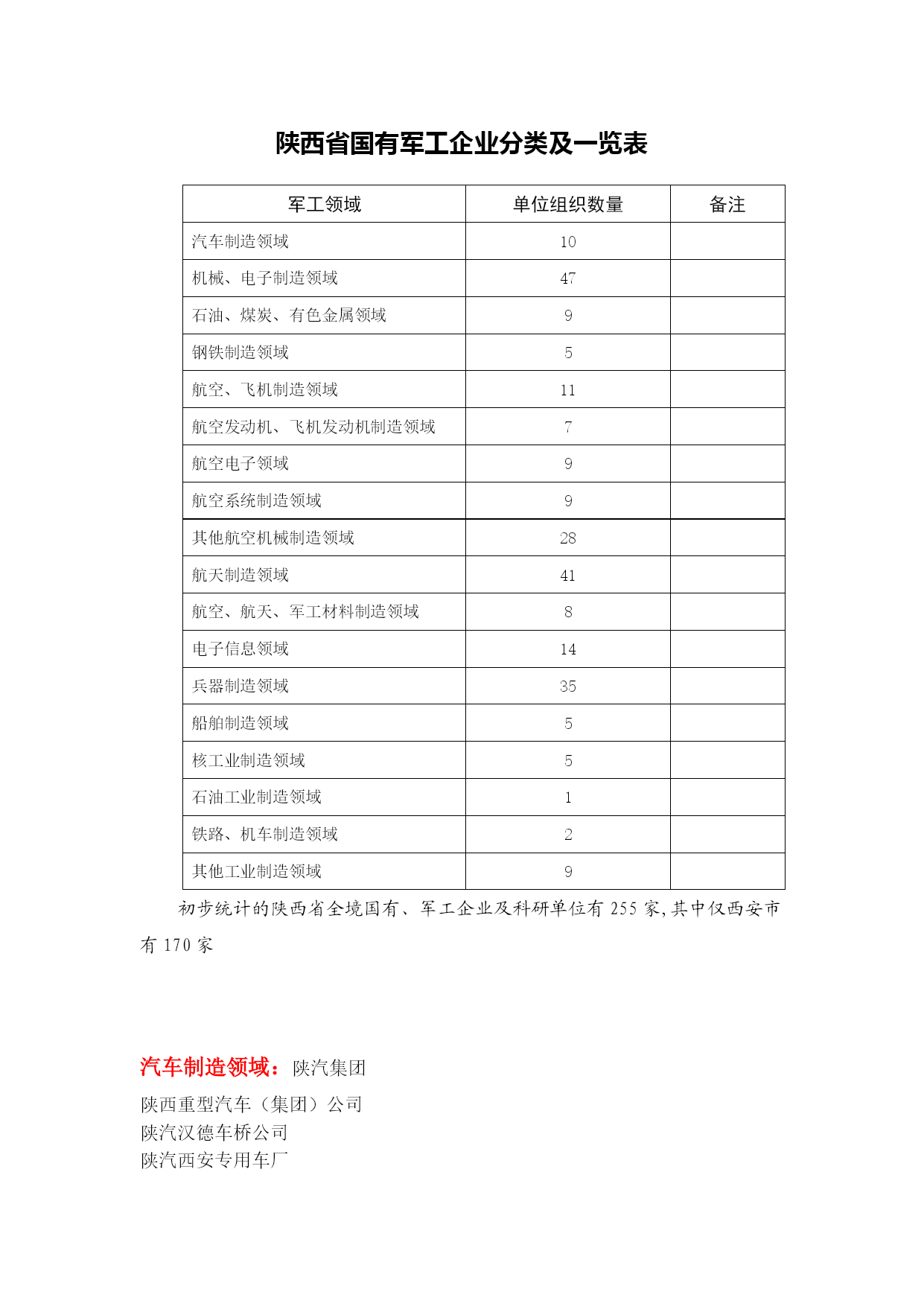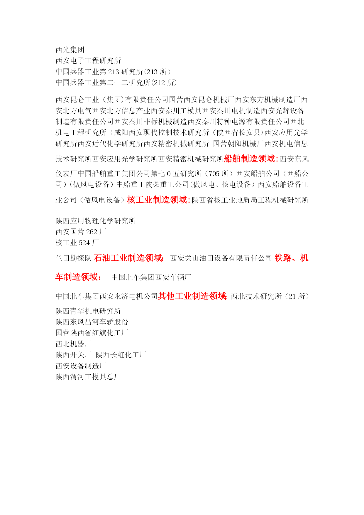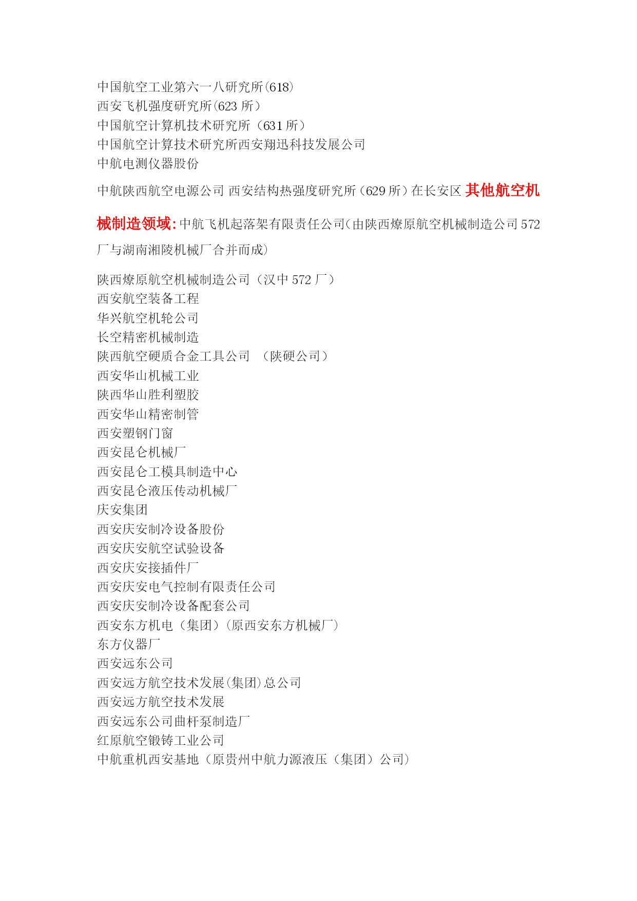 疾病分类与手术操作分类编码培训计划实用文档(实用文档,可以直接使用,可编辑优秀版资料,欢迎下载)疾病分类与手术操作分类编码培训计划为进一步提高我院疾病分类与手术操作分类编码的准确性,适应卫生部要求二级医院网络直报的要求,同时也应医院管理的需要,对我院编码录入人员进行逐步规范化培训,提高对全院人员进行疾病分类和手术操作分类编码的知识普及,培训计划和实施内容如下:一、培训对象编码录入人员,统计人员,质控人员,全院临床医生二、培训内容人民卫生出版社年出版ICD第二版人民军医出版社年底最新出版ICDCM(版)国际疾病分类手术与操作(第九次修订本)三、培训计划1、临床医生为主要培养对象,不定期开展全院临床医师的疾病分类与手术操作分类的知识培训,力求全院临床医师均接受培训熟悉疾病分类与手术操作分类。编码录入,统计,病历质控专业人员,科室业务学习每季度至少一次,集中学习与自学相结合。考核办法医院及相关职能科室,不定期检查培训目标使相关专业人员更好的适应医院发展的需要,提高疾病分类与手术操作编码的准确性,保证病案管理高质量。使全院临床医师熟悉疾病分类与手术操作分类,疾病的诊断准确性有进一步的提高奖惩办法不定期检查的结果将和年终考核挂钩,参与评先评优。检查结果将作为专职编码录入人员是否胜任本职工作的依据之一,定岗定聘,不胜任者待岗培训.考查结果将作为科室晋升职称的依据。宁夏张氏回医正骨医院医务科2021年1月6日陕西省国有军工企业分类及一览表军工领域单位组织数量备注汽车制造领域10机械、电子制造领域47石油、煤炭、有色金属领域9钢铁制造领域5航空、飞机制造领域11航空发动机、飞机发动机制造领域7航空电子领域9航空系统制造领域9其他航空机械制造领域28航天制造领域41航空、航天、军工材料制造领域8电子信息领域14兵器制造领域35船舶制造领域5核工业制造领域5石油工业制造领域1铁路、机车制造领域2其他工业制造领域9初步统计的陕西省全境国有、军工企业及科研单位有255家,其中仅西安市有170家汽车制造领域:陕汽集团陕西重型汽车(集团)公司陕汽汉德车桥公司陕汽西安专用车厂陕汽宝鸡华山车辆厂陕汽通家汽车有限责任公司陕西法士特汽车传动陕西法士特汽车齿轮厂比亚迪汽车公司(原中国兵器工业集团秦川汽车厂)中国兵器工业集团西安骊山汽车制造厂机械、电子制造领域:中国西电集团中国西电集团西安电容器厂(西容)中国西电集团西安电力陶瓷厂(西瓷)中国西电集团西安高压开关厂(西开)中国西电集团陕西高压开关厂(陕开)中国西电集团西安变压器厂(西变)中国西电集团西安电光缆(西缆)陕西宝光真空电器股份陕西鼓风机(集团)(原陕西鼓风机厂)西安陕鼓动力股份西安陕鼓通风设备陕鼓铸锻有限责任公司陕西电子信息集团中国冶金工业集团集团陕压重工设备(中冶陕压)中国机械工业集团中国重型机械研究院(原西重所)中国建筑集团西安轻工业钟表研究所西安金风科技有限责任公司(做风电设备)中钢集团西安重型机械(中钢西重)(做风电设备)西安盾安电气有限责任公司(做风电设备)中国北车集团西安车辆厂(北车西厂)中船重工陕柴重工公司(中船陕柴)(做风电、核电设备)西安船舶公司(西船公司)(做风电设备)西安船舶设备工业公司(做风电设备)彩虹集团公司咸阳彩虹热电陕西彩虹彩色显像管总厂(原国营4400厂)陕西彩虹光电材料总公司西安彩虹电器工业西安标准工业股份西安重工装备制造集团西安煤矿机械有限责任公司陕西建设机械股份中交集团西安筑路机械(中交西筑)宝鸡东岭工贸集团股份陕西秦川机床工具集团宝鸡机床工具厂西安锻压机床机床厂西安仪表机床厂西安专用机床厂西安第三机床厂西安裁剪机床厂咸阳机床厂咸阳关中工具厂汉川机床集团有限责任公司(原汉川机床厂)汉江工具有限责任公司(原汉江工具厂)天水星火机床厂中联重科(集团)渭南土方机械厂石油、煤炭、有色金属领域:中石油长庆石油(集团)有限责任公司陕西延长石油(集团)有限责任公司陕西煤业(集团)有限责任公司陕西煤业化工(集团)有限责任公司陕西有色金属(集团)有限责任公司陕西燃机(集团)有限责任公司陕西金钼集团有限责任公司陕西星王企业集团有限责任公司宝鸡钛业股份(宝钛集团)钢铁制造领域:陕西钢铁(集团)公司(陕钢集团)陕钢集团龙门钢铁(集团)公司陕钢集团龙门钢铁(集团)西安钢铁厂陕钢集团汉中钢铁厂陕钢集团略阳钢铁厂航空、飞机制造领域:飞机整机制造领域:中航飞机(集团)公司西安飞机工业(集团)有限责任公司(西飞集团公司)陕西飞机工业(集团)中国一航西安航空动力控制公司中国航空工业第一集团公司第一飞机设计研究(603所)中国飞行试验研究院(630所)中国航空工业第一集团公司第一飞机设计研究院庆安集团西安飞豹科技发展公司西安飞机国际航空制造股份西