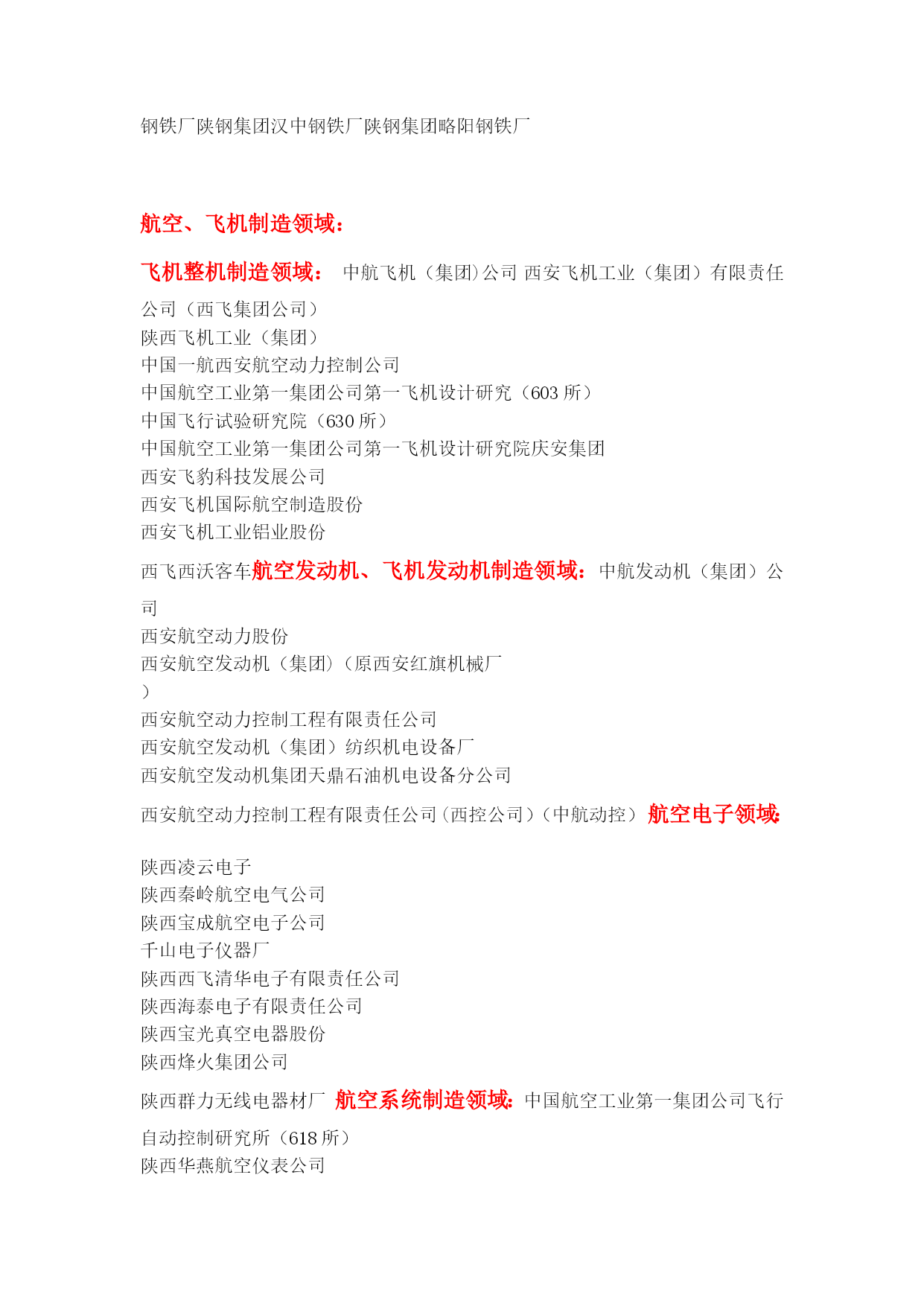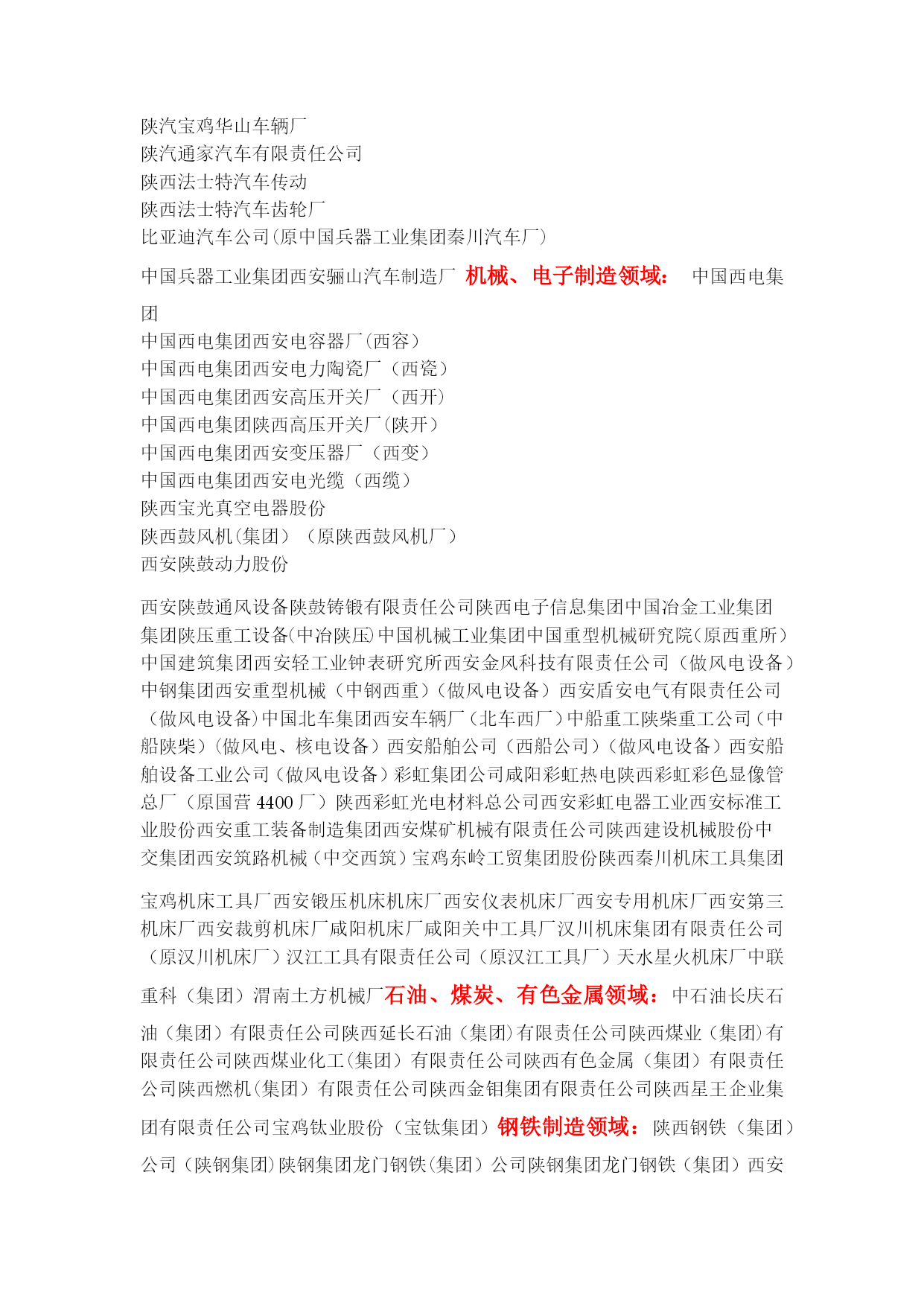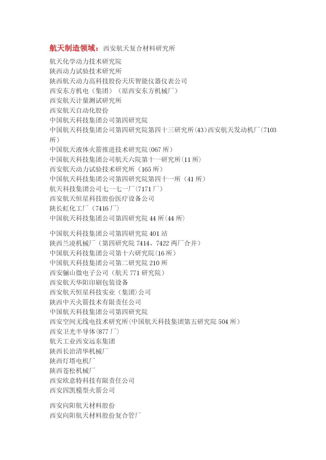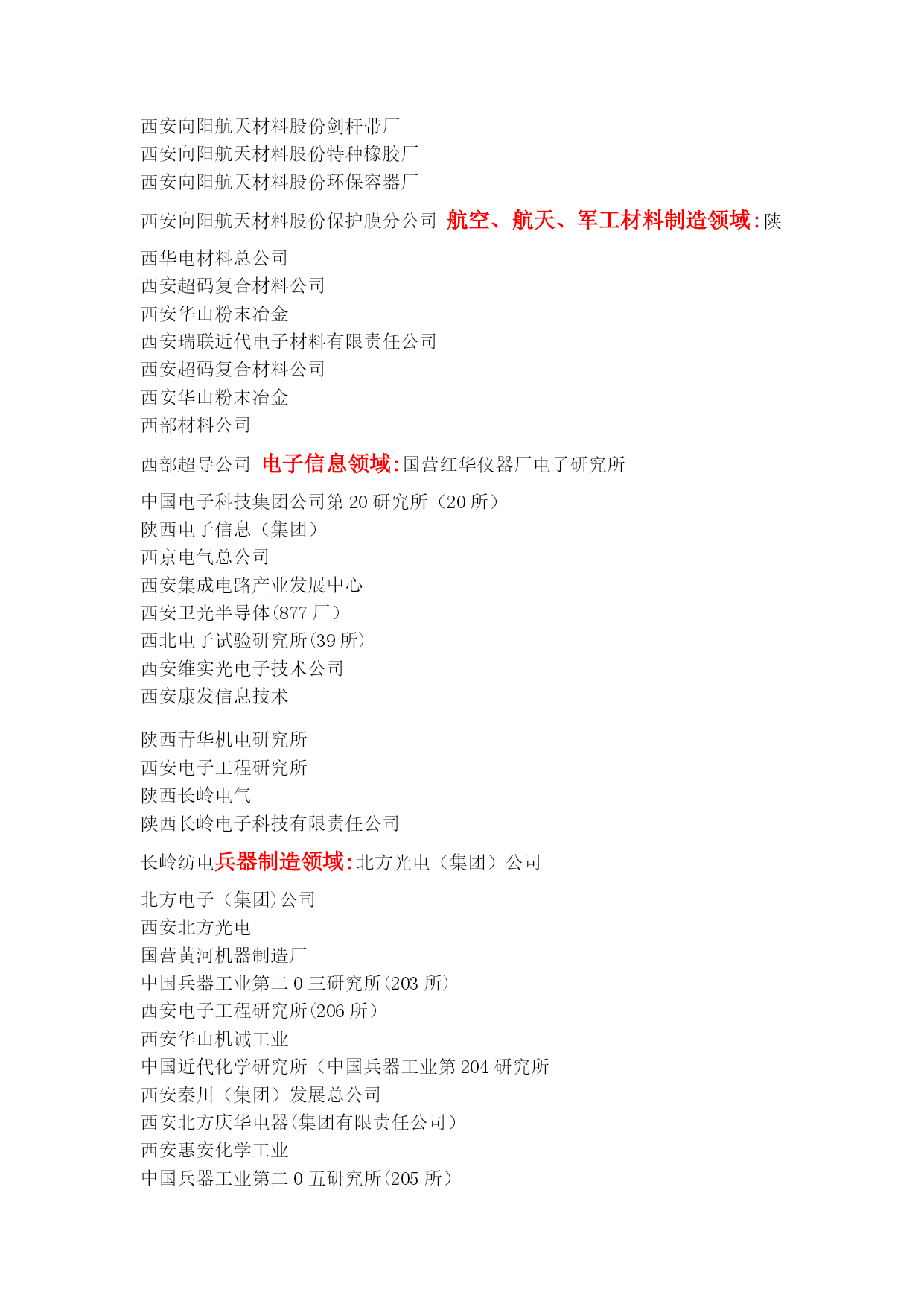疾病分类与手术操作分类编码培训计划实用文档(实用文档,可以直接使用,可编辑优秀版资料,欢迎下载)疾病分类与手术操作分类编码培训计划为进一步提高我院疾病分类与手术操作分类编码的准确性,适应卫生部要求二级医院网络直报的要求,同时也应医院管理的需要,对我院编码录入人员进行逐步规范化培训,提高对全院人员进行疾病分类和手术操作分类编码的知识普及,培训计划和实施内容如下:一、培训对象编码录入人员,统计人员,质控人员,全院临床医生二、培训内容人民卫生出版社年出版ICD第二版人民军医出版社年底最新出版ICDCM(版)国际疾病分类手术与操作(第九次修订本)三、培训计划1、临床医生为主要培养对象,不定期开展全院临床医师的疾病分类与手术操作分类的知识培训,力求全院临床医师均接受培训熟悉疾病分类与手术操作分类。编码录入,统计,病历质控专业人员,科室业务学习每季度至少一次,集中学习与自学相结合。考核办法医院及相关职能科室,不定期检查培训目标使相关专业人员更好的适应医院发展的需要,提高疾病分类与手术操作编码的准确性,保证病案管理高质量。使全院临床医师熟悉疾病分类与手术操作分类,疾病的诊断准确性有进一步的提高奖惩办法不定期检查的结果将和年终考核挂钩,参与评先评优。检查结果将作为专职编码录入人员是否胜任本职工作的依据之一,定岗定聘,不胜任者待岗培训.考查结果将作为科室晋升职称的依据。宁夏张氏回医正骨医院医务科2021年1月6日陕西省国有军工企业分类及一览表军工领域单位组织数量备注汽车制造领域10机械、电子制造领域47石油、煤炭、有色金属领域9钢铁制造领域5航空、飞机制造领域11航空发动机、飞机发动机制造领域7航空电子领域9航空系统制造领域9其他航空机械制造领域28航天制造领域41航空、航天、军工材料制造领域8电子信息领域14兵器制造领域35船舶制造领域5核工业制造领域5石油工业制造领域1铁路、机车制造领域2其他工业制造领域9初步统计的陕西省全境国有、军工企业及科研单位有255家,其中仅西安市有170家汽车制造领域:陕汽集团陕西重型汽车(集团)公司陕汽汉德车桥公司陕汽西安专用车厂陕汽宝鸡华山车辆厂陕汽通家汽车有限责任公司陕西法士特汽车传动陕西法士特汽车齿轮厂比亚迪汽车公司(原中国兵器工业集团秦川汽车厂)中国兵器工业集团西安骊山汽车制造厂机械、电子制造领域:中国西电集团中国西电集团西安电容器厂(西容)中国西电集团西安电力陶瓷厂(西瓷)中国西电集团西安高压开关厂(西开)中国西电集团陕西高压开关厂(陕开)中国西电集团西安变压器厂(西变)中国西电集团西安电光缆(西缆)陕西宝光真空电器股份陕西鼓风机(集团)(原陕西鼓风机厂)西安陕鼓动力股份西安陕鼓通风设备陕鼓铸锻有限责任公司陕西电子信息集团中国冶金工业集团集团陕压重工设备(中冶陕压)中国机械工业集团中国重型机械研究院(原西重所)中国建筑集团西安轻工业钟表研究所西安金风科技有限责任公司(做风电设备)中钢集团西安重型机械(中钢西重)(做风电设备)西安盾安电气有限责任公司(做风电设备)中国北车集团西安车辆厂(北车西厂)中船重工陕柴重工公司(中船陕柴)(做风电、核电设备)西安船舶公司(西船公司)(做风电设备)西安船舶设备工业公司(做风电设备)彩虹集团公司咸阳彩虹热电陕西彩虹彩色显像管总厂(原国营4400厂)陕西彩虹光电材料总公司西安彩虹电器工业西安标准工业股份西安重工装备制造集团西安煤矿机械有限责任公司陕西建设机械股份中交集团西安筑路机械(中交西筑)宝鸡东岭工贸集团股份陕西秦川机床工具集团宝鸡机床工具厂西安锻压机床机床厂西安仪表机床厂西安专用机床厂西安第三机床厂西安裁剪机床厂咸阳机床厂咸阳关中工具厂汉川机床集团有限责任公司(原汉川机床厂)汉江工具有限责任公司(原汉江工具厂)天水星火机床厂中联重科(集团)渭南土方机械厂石油、煤炭、有色金属领域:中石油长庆石油(集团)有限责任公司陕西延长石油(集团)有限责任公司陕西煤业(集团)有限责任公司陕西煤业化工(集团)有限责任公司陕西有色金属(集团)有限责任公司陕西燃机(集团)有限责任公司陕西金钼集团有限责任公司陕西星王企业集团有限责任公司宝鸡钛业股份(宝钛集团)钢铁制造领域:陕西钢铁(集团)公司(陕钢集团)陕钢集团龙门钢铁(集团)公司陕钢集团龙门钢铁(集团)西安钢铁厂陕钢集团汉中钢铁厂陕钢集团略阳钢铁厂航空、飞机制造领域:飞机整机制造领域:中航飞机(集团)公司西安飞机工业(集团)有限责任公司(西飞集团公司)陕西飞机工业(集团)中国一航西安航空动力控制公司中国航空工业第一集团公司第一飞机设计研究(603所)中国飞行试验研究院(630所)中国航空工业第一集团公司第一飞机设计研究院庆安集团西安飞豹科技发展公司西安飞机国际航空制造股份西