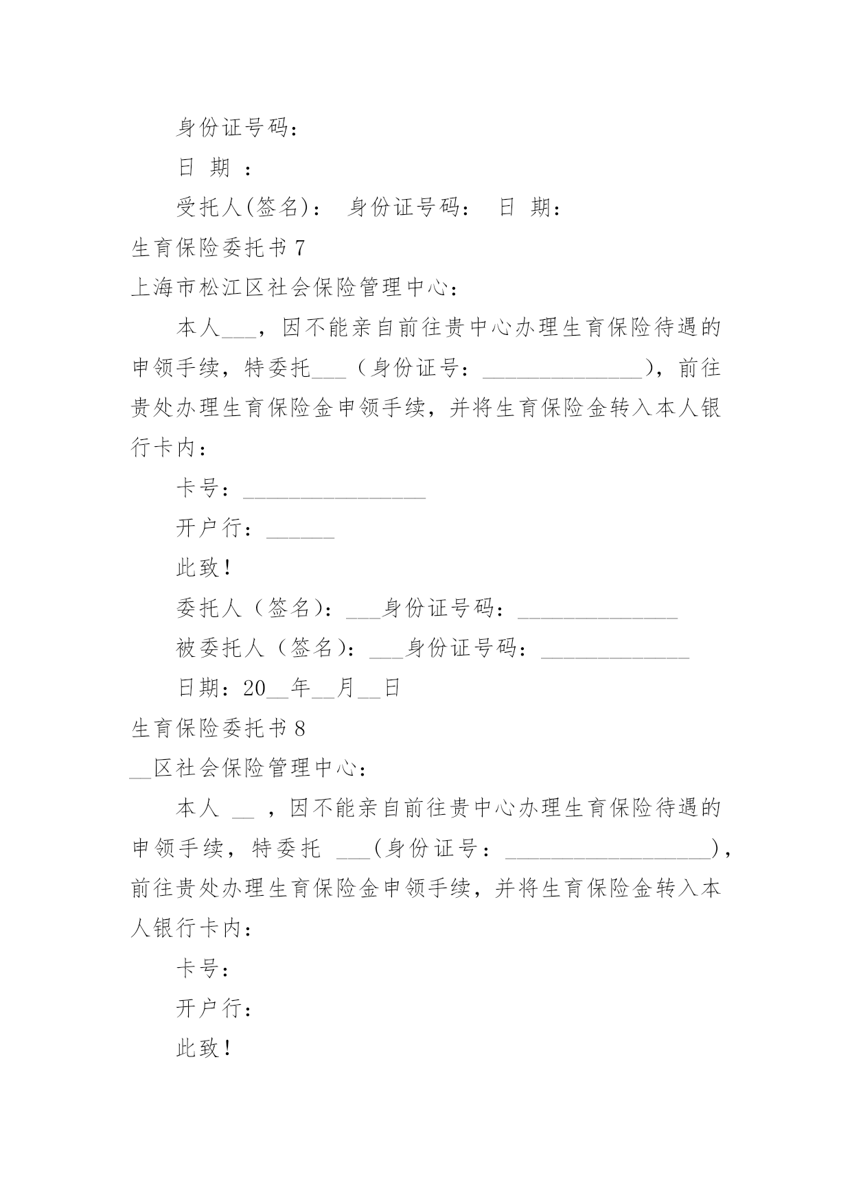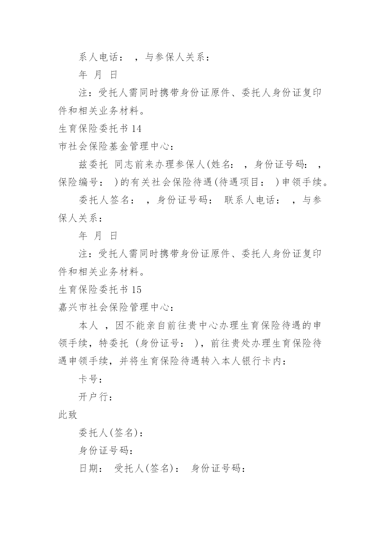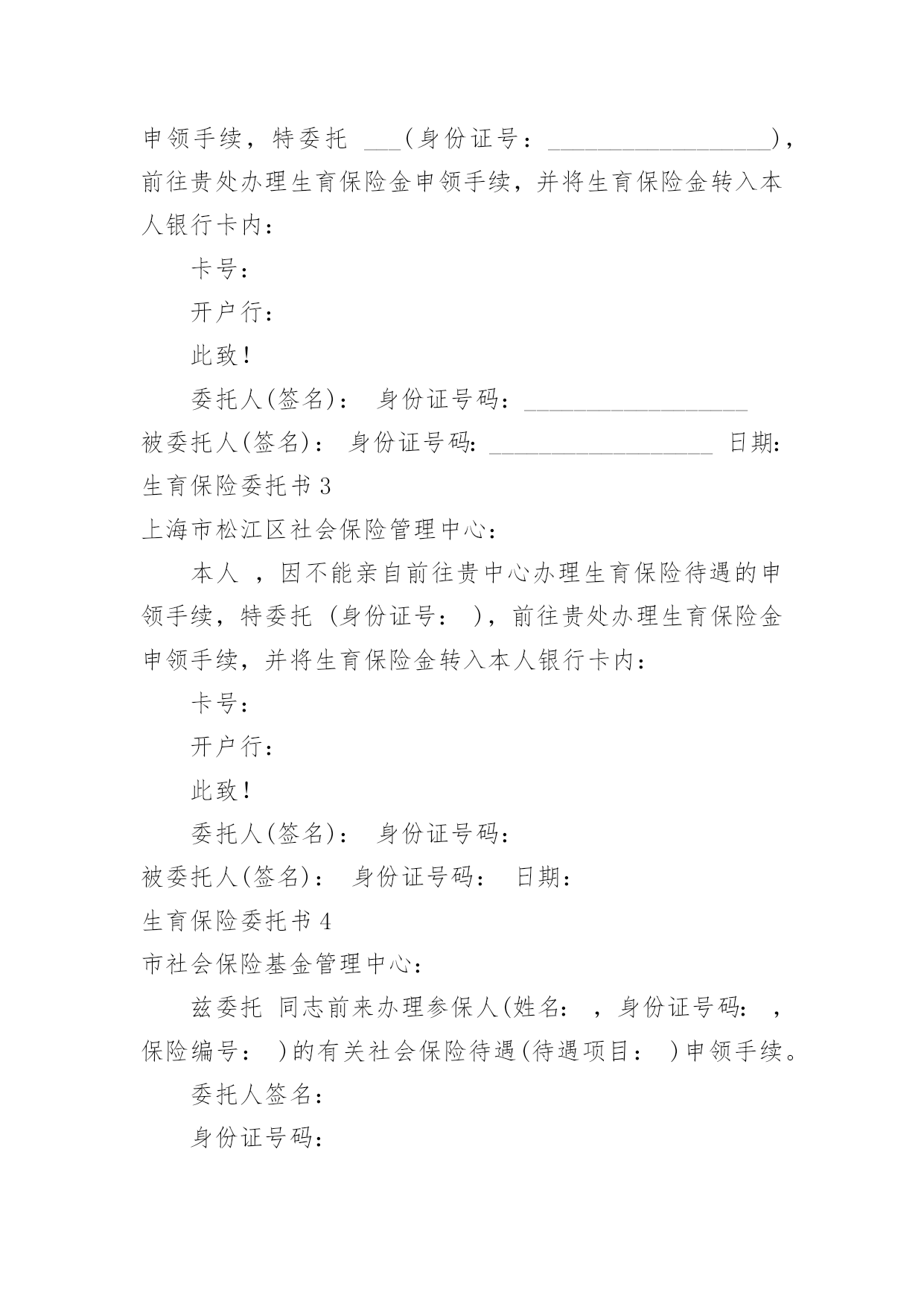 生育保险委托书【推荐】生育保险委托书在委托人的委托书上的合法权益内,委托人不得以任何理由反悔委托事项。随着社会不断地进步,我们在很多事务中都会使用到委托书,来参考自己需要的委托书吧!下面是小编帮大家整理的生育保险委托书,欢迎阅读与收藏。生育保险委托书1上海市普陀区社会保险管理中心:本人___,因不能亲自前往贵中心办理生育保险待遇的申领手续,特委托___(身份证号:_________),前往贵处办理生育保险待遇申领手续,并将生育保险待遇转入本人银行卡内:卡号:__________。开户行:____。此致委托人(签名):身份证号码:日期:受托人(签名):身份证号码:日期:生育保险委托书2__区社会保险管理中心:本人__,因不能亲自前往贵中心办理生育保险待遇的申领手续,特委托___(身份证号:__________________),前往贵处办理生育保险金申领手续,并将生育保险金转入本人银行卡内:卡号:开户行:此致!委托人(签名):身份证号码:__________________被委托人(签名):身份证号码:__________________日期:生育保险委托书3上海市松江区社会保险管理中心:本人,因不能亲自前往贵中心办理生育保险待遇的申领手续,特委托(身份证号:),前往贵处办理生育保险金申领手续,并将生育保险金转入本人银行卡内:卡号:开户行:此致!委托人(签名):身份证号码:被委托人(签名):身份证号码:日期:生育保险委托书4市社会保险基金管理中心:兹委托同志前来办理参保人(姓名:,身份证号码:,保险编号:)的有关社会保险待遇(待遇项目:)申领手续。委托人签名:身份证号码:联系人电话:与参保人关系:年月日注:受托人需同时携带身份证原件、委托人身份证复印件和相关业务材料。生育保险委托书5__区社会保险管理中心:本人__,因不能亲自前往贵中心办理生育保险待遇的申领手续,特委托___(身份证号:____),前往贵处办理生育保险金申领手续,并将生育保险金转入本人银行卡内:卡号:开户行:此致!委托人(签名):身份证号码:___被委托人(签名):身份证号码:____日期:生育保险委托书6上海市普陀区社会保险管理中心:本人___,因不能亲自前往贵中心办理生育保险待遇的申领手续,特委托___(身份证号:______),前往贵处办理生育保险待遇申领手续,并将生育保险待遇转入本人银行卡内:卡号:开户行:此致委托人(签名):身份证号码:日期:受托人(签名):身份证号码:日期:生育保险委托书7上海市松江区社会保险管理中心:本人___,因不能亲自前往贵中心办理生育保险待遇的申领手续,特委托___(身份证号:______________),前往贵处办理生育保险金申领手续,并将生育保险金转入本人银行卡内:卡号:________________开户行:______此致!委托人(签名):___身份证号码:______________被委托人(签名):___身份证号码:_____________日期:20__年__月__日生育保险委托书8__区社会保险管理中心:本人__,因不能亲自前往贵中心办理生育保险待遇的申领手续,特委托___(身份证号:__________________),前往贵处办理生育保险金申领手续,并将生育保险金转入本人银行卡内:卡号:开户行:此致!委托人(签名):身份证号码:__________________被委托人(签名):身份证号码:__________________日期:生育保险委托书9__市普陀区社会保险管理中心:本人___,因不能亲自前往贵中心办理生育保险待遇的申领手续,特委托___(身份证号:_________),前往贵处办理生育保险待遇申领手续,并将生育保险待遇转入本人银行卡内:卡号:__________。开户行:____。此致委托人(签名):身份证号码:日期:20__年__月__日受托人(签名):身份证号码:日期:20__年__月__日生育保险委托书10委托人:__,女,29岁,身份证号码:______受托人:__,男,33岁,身份证号码:310004198______委托人与受托人关系:夫妻兹委托受托人___为我的'代理人,全权代表我办理上海市享受生育保险待遇(生育金)的相关事务。代理人在权限范围内签署的一切相关文件,我均承认,由此在法律上产生的权利、义务均由委托人享有和承担。委托人:年月日生育保险委托书11市社会保险基金管理中心:兹委托同志前来办理参保人(姓名:,身份证号码:,保险编号:)的有关社会保险待遇(待遇项目:)申领手续。委托人(签名):身份证号码:日期:受托人(签名):身份证号码:日期生育保险委托书12市社会保险基金管理中心:兹委托同志前来办理参保人(姓名:,身份证号码:,保险编号:)的有关社会保险待遇(待遇项目