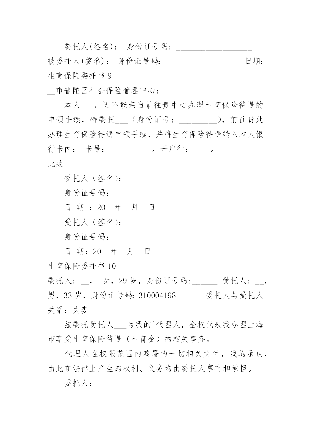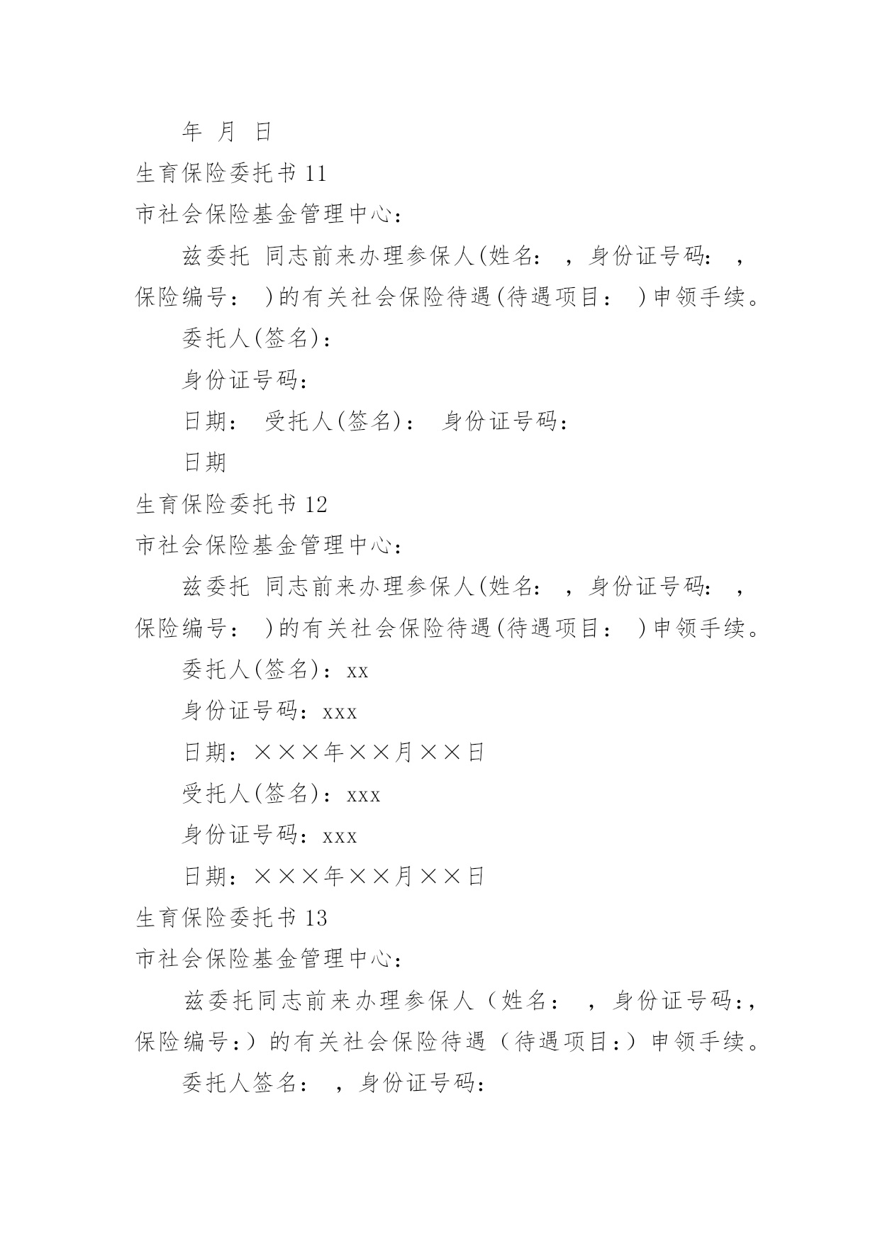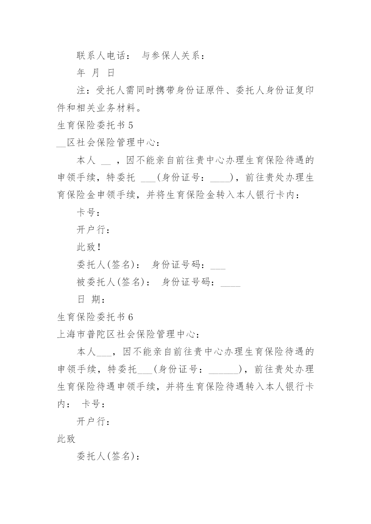 生育保险委托书【推荐】生育保险委托书在委托人的委托书上的合法权益内,委托人不得以任何理由反悔委托事项。随着社会不断地进步,我们在很多事务中都会使用到委托书,来参考自己需要的委托书吧!下面是小编帮大家整理的生育保险委托书,欢迎阅读与收藏。生育保险委托书1上海市普陀区社会保险管理中心:本人___,因不能亲自前往贵中心办理生育保险待遇的申领手续,特委托___(身份证号:_________),前往贵处办理生育保险待遇申领手续,并将生育保险待遇转入本人银行卡内:卡号:__________。开户行:____。此致委托人(签名):身份证号码:日期:受托人(签名):身份证号码:日期:生育保险委托书2__区社会保险管理中心:本人__,因不能亲自前往贵中心办理生育保险待遇的申领手续,特委托___(身份证号:__________________),前往贵处办理生育保险金申领手续,并将生育保险金转入本人银行卡内:卡号:开户行:此致!委托人(签名):身份证号码:__________________被委托人(签名):身份证号码:__________________日期:生育保险委托书3上海市松江区社会保险管理中心:本人,因不能亲自前往贵中心办理生育保险待遇的申领手续,特委托(身份证号:),前往贵处办理生育保险金申领手续,并将生育保险金转入本人银行卡内:卡号:开户行:此致!委托人(签名):身份证号码:被委托人(签名):身份证号码:日期:生育保险委托书4市社会保险基金管理中心:兹委托同志前来办理参保人(姓名:,身份证号码:,保险编号:)的有关社会保险待遇(待遇项目:)申领手续。委托人签名:身份证号码:联系人电话:与参保人关系:年月日注:受托人需同时携带身份证原件、委托人身份证复印件和相关业务材料。生育保险委托书5__区社会保险管理中心:本人__,因不能亲自前往贵中心办理生育保险待遇的申领手续,特委托___(身份证号:____),前往贵处办理生育保险金申领手续,并将生育保险金转入本人银行卡内:卡号:开户行:此致!委托人(签名):身份证号码:___被委托人(签名):身份证号码:____日期:生育保险委托书6上海市普陀区社会保险管理中心:本人___,因不能亲自前往贵中心办理生育保险待遇的申领手续,特委托___(身份证号:______),前往贵处办理生育保险待遇申领手续,并将生育保险待遇转入本人银行卡内:卡号:开户行:此致委托人(签名):身份证号码:日期:受托人(签名):身份证号码:日期:生育保险委托书7上海市松江区社会保险管理中心:本人___,因不能亲自前往贵中心办理生育保险待遇的申领手续,特委托___(身份证号:______________),前往贵处办理生育保险金申领手续,并将生育保险金转入本人银行卡内:卡号:________________开户行:______此致!委托人(签名):___身份证号码:______________被委托人(签名):___身份证号码:_____________日期:20__年__月__日生育保险委托书8__区社会保险管理中心:本人__,因不能亲自前往贵中心办理生育保险待遇的申领手续,特委托___(身份证号:__________________),前往贵处办理生育保险金申领手续,并将生育保险金转入本人银行卡内:卡号:开户行:此致!委托人(签名):身份证号码:__________________被委托人(签名):身份证号码:__________________日期:生育保险委托书9__市普陀区社会保险管理中心:本人___,因不能亲自前往贵中心办理生育保险待遇的申领手续,特委托___(身份证号:_________),前往贵处办理生育保险待遇申领手续,并将生育保险待遇转入本人银行卡内:卡号:__________。开户行:____。此致委托人(签名):身份证号码:日期:20__年__月__日受托人(签名):身份证号码:日期:20__年__月__日生育保险委托书10委托人:__,女,29岁,身份证号码:______受托人:__,男,33岁,身份证号码:310004198______委托人与受托人关系:夫妻兹委托受托人___为我的'代理人,全权代表我办理上海市享受生育保险待遇(生育金)的相关事务。代理人在权限范围内签署的一切相关文件,我均承认,由此在法律上产生的权利、义务均由委托人享有和承担。委托人:年月日生育保险委托书11市社会保险基金管理中心:兹委托同志前来办理参保人(姓名:,身份证号码:,保险编号:)的有关社会保险待遇(待遇项目:)申领手续。委托人(签名):身份证号码:日期:受托人(签名):身份证号码:日期生育保险委托书12市社会保险基金管理中心:兹委托同志前来办理参保人(姓名:,身份证号码:,保险编号:)的有关社会保险待遇(待遇项目