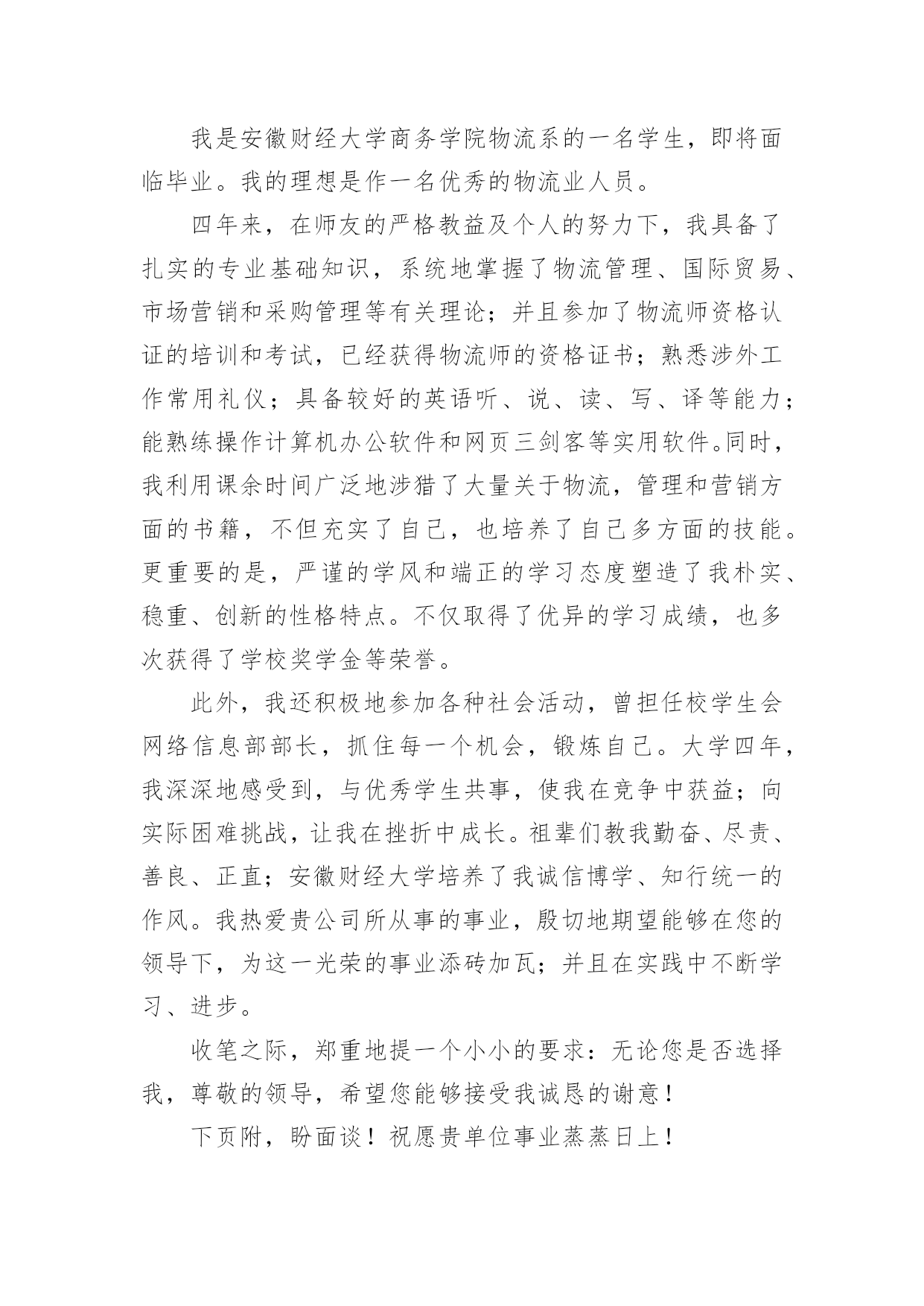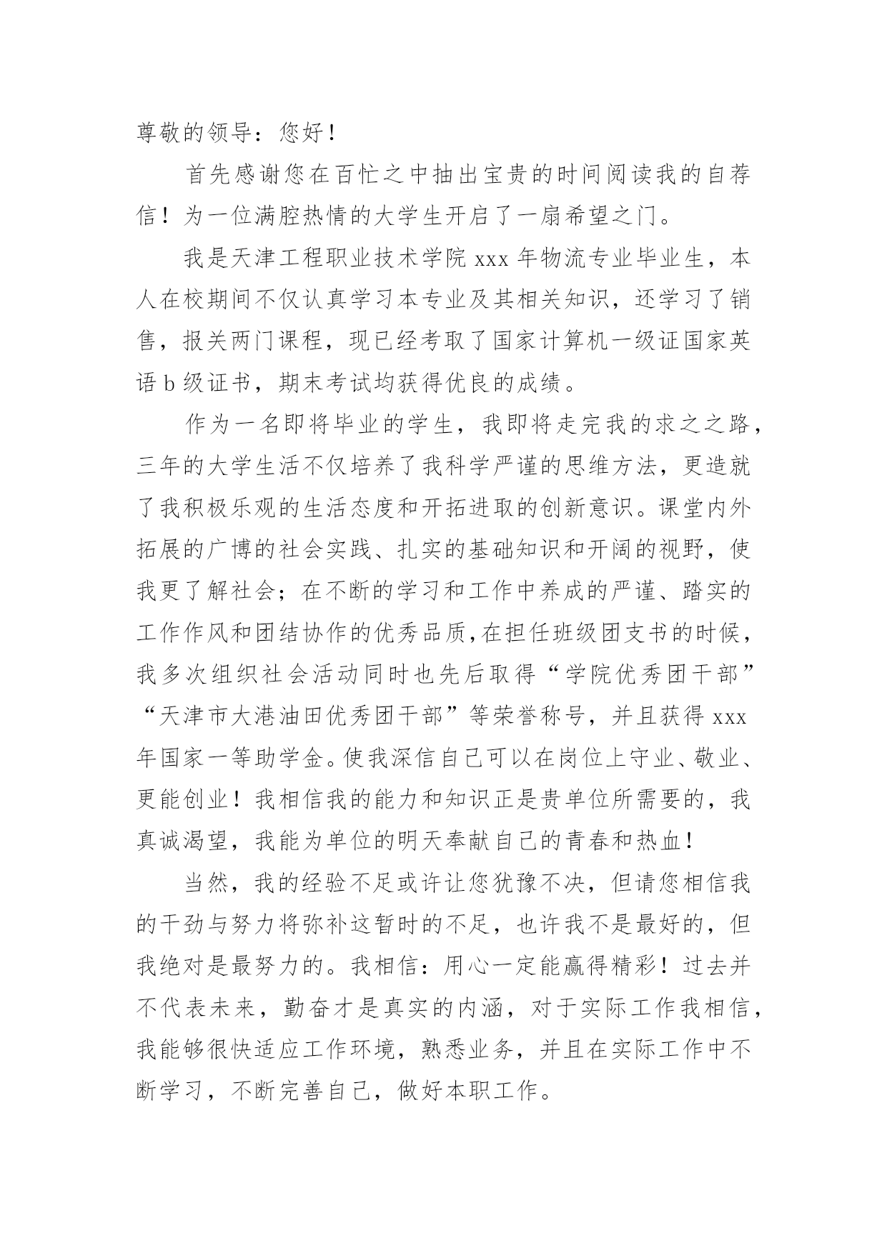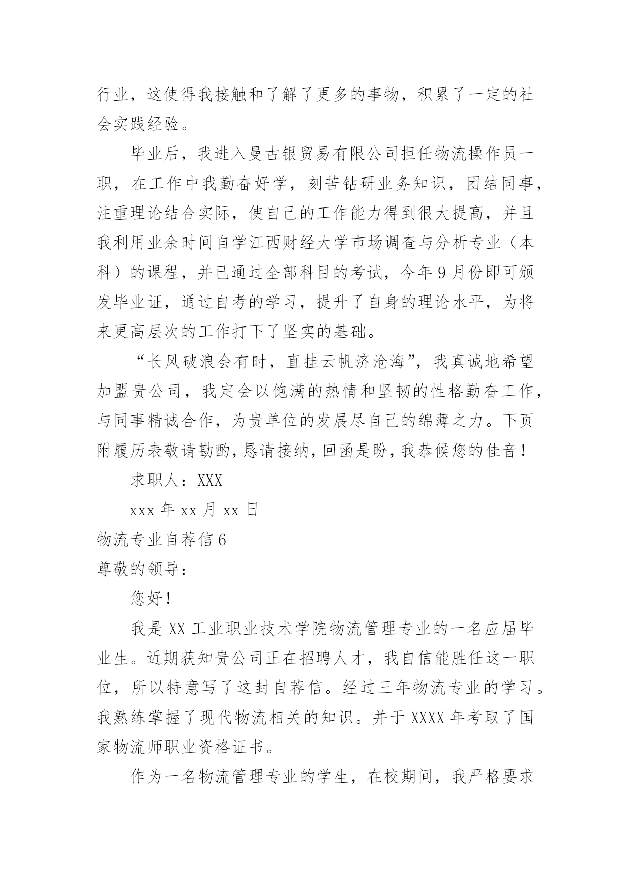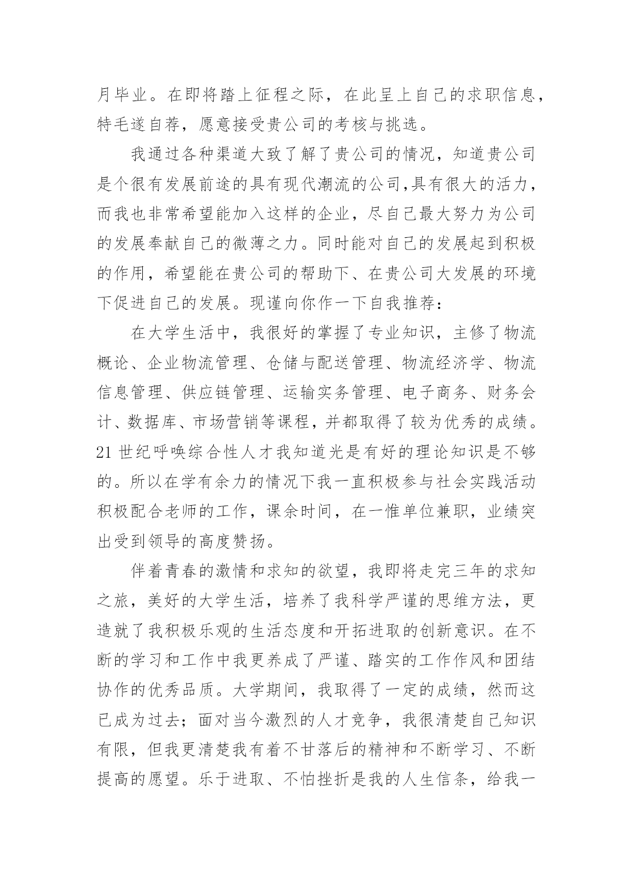 物流专业自荐信物流专业自荐信在当今社会中,我很多时候都不得不用到自荐信,自荐信根据用途的不同也有着不同的类型。你还不会写自荐信吗?以下是小编帮大家整理的物流专业自荐信,欢迎阅读,希望大家能够喜欢。物流专业自荐信1尊敬的领导:您好!感谢您在百忙之中翻阅,不胜感激!我是xxxx区职业技术学校xxxx年应届毕业生,所学专业是物流服务与管理,三年的职中学习,我掌握了扎实的专业知识,更重要的是掌握了一种良好的学习方法,使我可以以最快的速度接受最新的知识和信息,并运用到实践当中。通过对专业的学习,我深刻认识到:管理注重的是思维的方式和解决问题的能力,并不在于理论知识的量的堆砌与其牢固程度的把握,而在于是否养成一种良好的思考问题、解决问题的习惯,所以我一直刻意培养自己在这方面的能力,平时广泛阅读了营销、广告、生产管理、沟通艺术、顾客服务等方面的书籍。同时,我深知“纸上得来终觉浅,绝知此事要躬行”的道理的,因此在对理论知识进行积累的同时,还积极投身于社会实践(如:曾经在xxxx太古可口可乐储运部实习的,对运输,仓储管理及成本控制、物流职能各部门关系的协调有较深刻的认识),力求拓宽自己的视野的、提高自己的实际操作与社会适应能力。诚实、乐于助人是一个人应有的品质,勤奋务实是一个人的立足之本。本着这两条原则我取得了朋友与同学的信任,并在他们心目中树立了一个成熟稳重的形象。然而,我知道我做的仍然不够,经历、经验对我来说依旧是缺乏的,但我一直留心观察身边的一事一物,在这个过程当中,我学到了很多做人的道理和处事的方法。当然,要学会为人处事必须走到社会中去,工作---是得到社会的认可的必由之路,为了这一刻我一直在默默地准备着,我相信以我充足的准备我一定能在这芸芸众生中立足并成才!我坚信:“没有比脚更长的路,没有比人更高的山”,有艰辛的付出才会有丰盛的回报。我相信自己的知识和能力可以为贵单位的工作做出一份贡献。自荐人:xxxxxxx年xx月xx日物流专业自荐信2尊敬的领导:您好!非常感谢你能在百忙之中抽出时间审阅我的自荐书!我是xx外语职业学院物流管理的学生,将在xxx年6月毕业。在即将踏上征程之际,在此呈上自己的求职信息,特毛遂自荐,愿意接受贵公司的考核与挑选。我通过各种渠道大致了解了贵公司的情况,知道贵公司是个很有发展前途的具有现代潮流的公司,具有很大的活力,而我也非常希望能加入这样的企业,尽自己最大努力为公司的发展奉献自己的微薄之力。同时能对自己的发展起到积极的作用,希望能在贵公司的帮助下、在贵公司大发展的环境下促进自己的发展。现谨向你作一下自我推荐:在大学生活中,我很好的掌握了专业知识,主修了物流概论、企业物流管理、仓储与配送管理、物流经济学、物流信息管理、供应链管理、运输实务管理、电子商务、财务会计、数据库、市场营销等课程,并都取得了较为优秀的成绩。21世纪呼唤综合性人才我知道光是有好的理论知识是不够的。所以在学有余力的情况下我一直积极参与社会实践活动积极配合老师的工作,课余时间,在一惟单位兼职,业绩突出受到领导的高度赞扬。伴着青春的激情和求知的欲望,我即将走完三年的求知之旅,美好的大学生活,培养了我科学严谨的思维方法,更造就了我积极乐观的生活态度和开拓进取的创新意识。在不断的学习和工作中我更养成了严谨、踏实的工作作风和团结协作的优秀品质。大学期间,我取得了一定的成绩,然而这已成为过去;面对当今激烈的人才竞争,我很清楚自己知识有限,但我更清楚我有着不甘落后的精神和不断学习、不断提高的愿望。乐于进取、不怕挫折是我的人生信条,给我一次机会,让我去实践、去闯、去干,因为能力要在实践中培养,也终究要在实践中体险辏我深信自己完全可以在岗位上守业、敬业、更能创业!我相信我的能力和知识正是贵单位所需要的,我真诚渴望,我能为单位的明天奉献自己的青春和热血!愿贵单位事业蒸蒸日上,蓬勃发展!静盼你的佳音!此致敬礼!自荐人:xxx年xx月xx日物流专业自荐信3尊敬的领导:您好!我xxx高校物流管理专业的一名应届毕业生。近期获知贵公司正在招聘人才,我自信能胜任这一职位,所以特意写了这封信。感谢您能在百忙中翻阅我的求职信。经过四年物流专业的学习,在师友的严格教益及个人的努力下,我具备了扎实的专业基础知识,系统地掌握了《管理学基础》、《统计学基础》、《经济学基础》、《基础会计》、《货物学》、《供应链管理物流信息技术》等有关理论;熟悉涉外工作常用礼仪;具备较好的英语听、说、读、写、译等能力;能熟练操作计算机办公软件。我熟练掌握与现代物流相关的知识。并于××年国家物流师职业资格证书。四年的高校校园和社会实践生活使我不断地挑战自我、开拓创新,为实现自身价值打下了坚实的基础。在校期间得到了老师和同学们的一致肯定。作为一名物流管理专业应届毕业生,我期望从一线职位做起,把所学到的专业