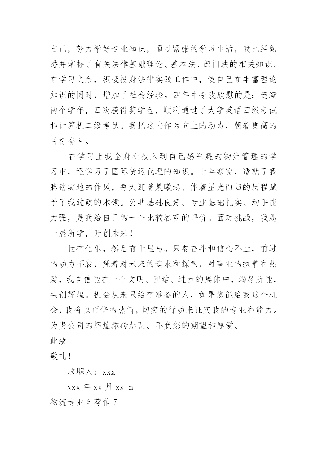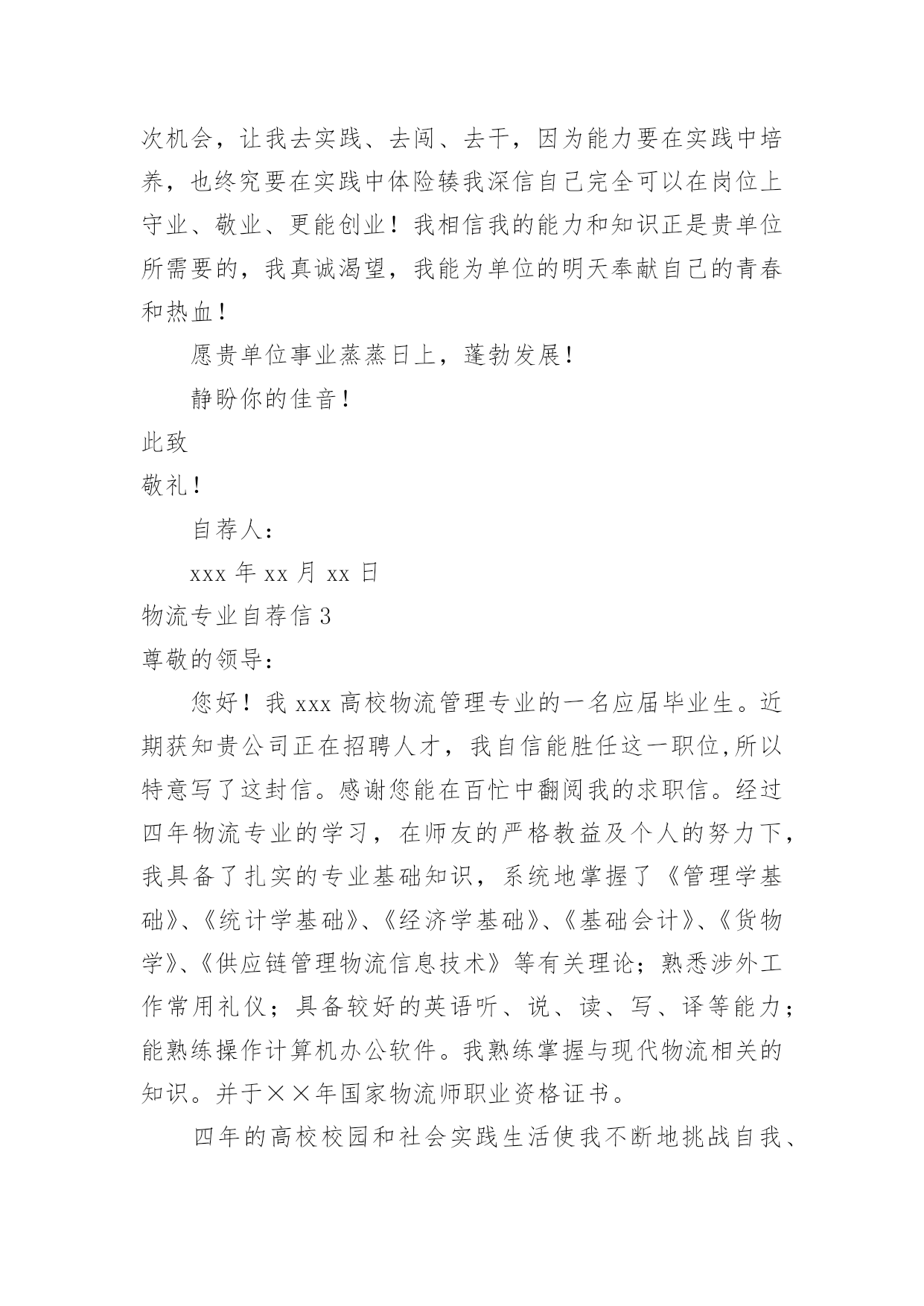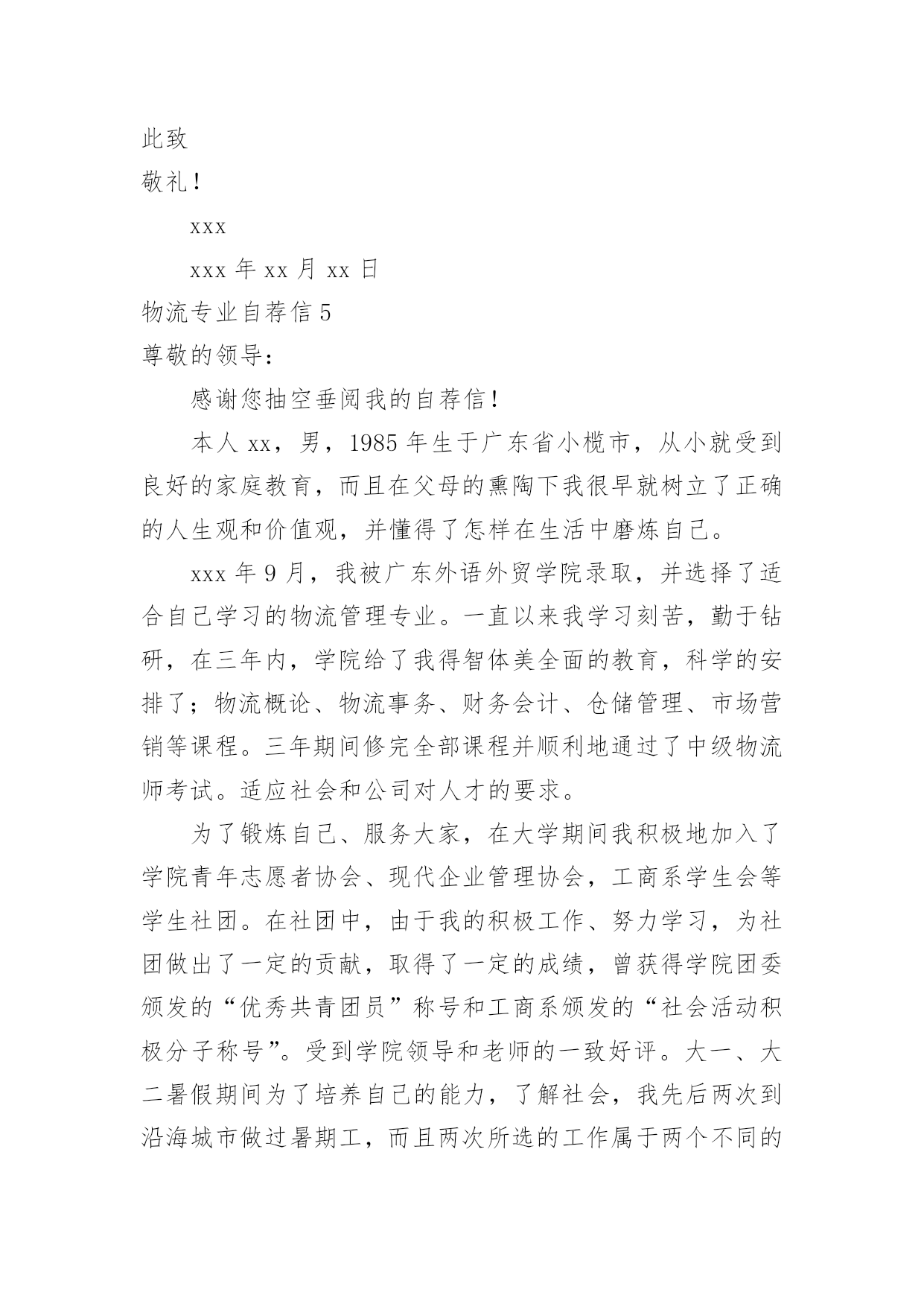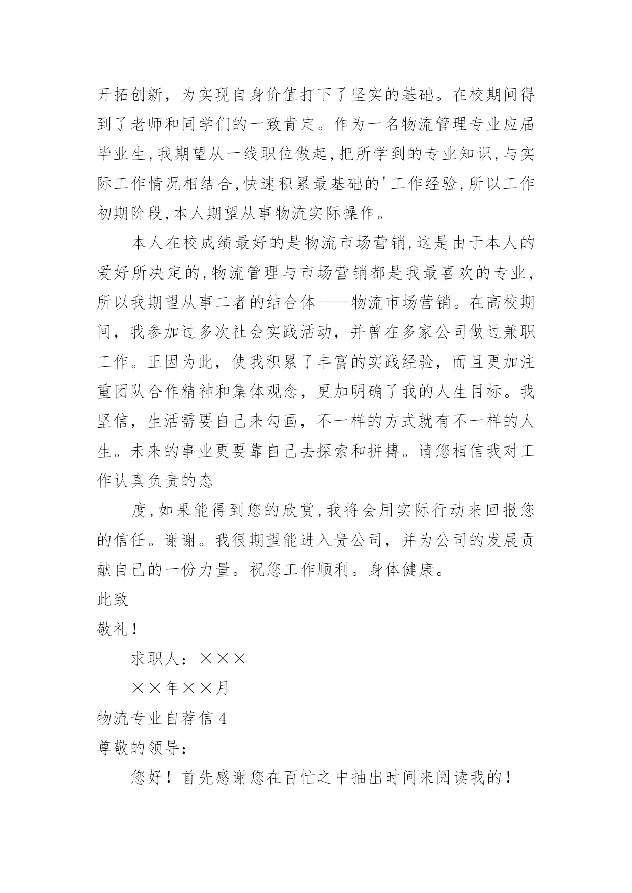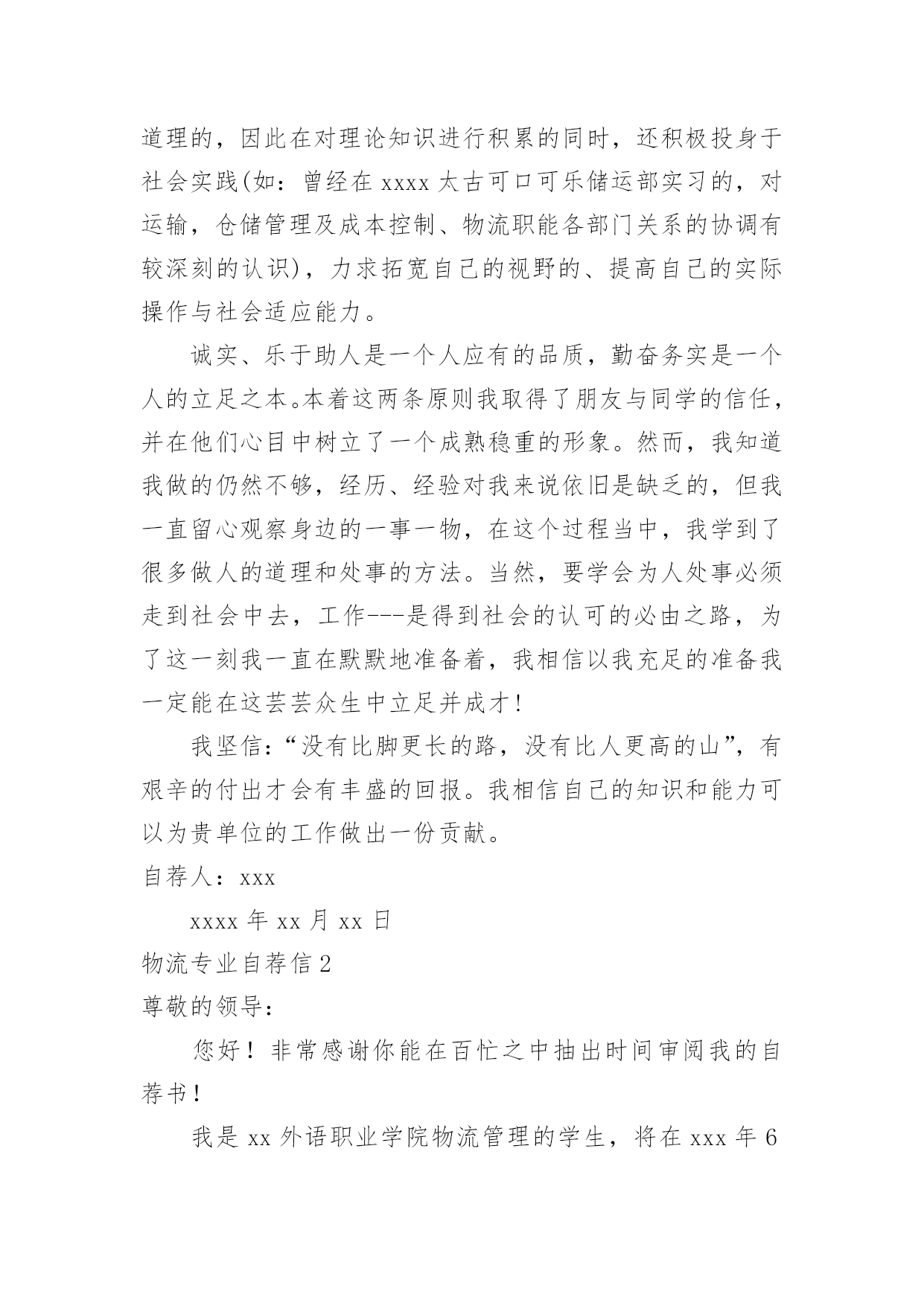 物流专业自荐信物流专业自荐信在当今社会中,我很多时候都不得不用到自荐信,自荐信根据用途的不同也有着不同的类型。你还不会写自荐信吗?以下是小编帮大家整理的物流专业自荐信,欢迎阅读,希望大家能够喜欢。物流专业自荐信1尊敬的领导:您好!感谢您在百忙之中翻阅,不胜感激!我是xxxx区职业技术学校xxxx年应届毕业生,所学专业是物流服务与管理,三年的职中学习,我掌握了扎实的专业知识,更重要的是掌握了一种良好的学习方法,使我可以以最快的速度接受最新的知识和信息,并运用到实践当中。通过对专业的学习,我深刻认识到:管理注重的是思维的方式和解决问题的能力,并不在于理论知识的量的堆砌与其牢固程度的把握,而在于是否养成一种良好的思考问题、解决问题的习惯,所以我一直刻意培养自己在这方面的能力,平时广泛阅读了营销、广告、生产管理、沟通艺术、顾客服务等方面的书籍。同时,我深知“纸上得来终觉浅,绝知此事要躬行”的道理的,因此在对理论知识进行积累的同时,还积极投身于社会实践(如:曾经在xxxx太古可口可乐储运部实习的,对运输,仓储管理及成本控制、物流职能各部门关系的协调有较深刻的认识),力求拓宽自己的视野的、提高自己的实际操作与社会适应能力。诚实、乐于助人是一个人应有的品质,勤奋务实是一个人的立足之本。本着这两条原则我取得了朋友与同学的信任,并在他们心目中树立了一个成熟稳重的形象。然而,我知道我做的仍然不够,经历、经验对我来说依旧是缺乏的,但我一直留心观察身边的一事一物,在这个过程当中,我学到了很多做人的道理和处事的方法。当然,要学会为人处事必须走到社会中去,工作---是得到社会的认可的必由之路,为了这一刻我一直在默默地准备着,我相信以我充足的准备我一定能在这芸芸众生中立足并成才!我坚信:“没有比脚更长的路,没有比人更高的山”,有艰辛的付出才会有丰盛的回报。我相信自己的知识和能力可以为贵单位的工作做出一份贡献。自荐人:xxxxxxx年xx月xx日物流专业自荐信2尊敬的领导:您好!非常感谢你能在百忙之中抽出时间审阅我的自荐书!我是xx外语职业学院物流管理的学生,将在xxx年6月毕业。在即将踏上征程之际,在此呈上自己的求职信息,特毛遂自荐,愿意接受贵公司的考核与挑选。我通过各种渠道大致了解了贵公司的情况,知道贵公司是个很有发展前途的具有现代潮流的公司,具有很大的活力,而我也非常希望能加入这样的企业,尽自己最大努力为公司的发展奉献自己的微薄之力。同时能对自己的发展起到积极的作用,希望能在贵公司的帮助下、在贵公司大发展的环境下促进自己的发展。现谨向你作一下自我推荐:在大学生活中,我很好的掌握了专业知识,主修了物流概论、企业物流管理、仓储与配送管理、物流经济学、物流信息管理、供应链管理、运输实务管理、电子商务、财务会计、数据库、市场营销等课程,并都取得了较为优秀的成绩。21世纪呼唤综合性人才我知道光是有好的理论知识是不够的。所以在学有余力的情况下我一直积极参与社会实践活动积极配合老师的工作,课余时间,在一惟单位兼职,业绩突出受到领导的高度赞扬。伴着青春的激情和求知的欲望,我即将走完三年的求知之旅,美好的大学生活,培养了我科学严谨的思维方法,更造就了我积极乐观的生活态度和开拓进取的创新意识。在不断的学习和工作中我更养成了严谨、踏实的工作作风和团结协作的优秀品质。大学期间,我取得了一定的成绩,然而这已成为过去;面对当今激烈的人才竞争,我很清楚自己知识有限,但我更清楚我有着不甘落后的精神和不断学习、不断提高的愿望。乐于进取、不怕挫折是我的人生信条,给我一次机会,让我去实践、去闯、去干,因为能力要在实践中培养,也终究要在实践中体险辏我深信自己完全可以在岗位上守业、敬业、更能创业!我相信我的能力和知识正是贵单位所需要的,我真诚渴望,我能为单位的明天奉献自己的青春和热血!愿贵单位事业蒸蒸日上,蓬勃发展!静盼你的佳音!此致敬礼!自荐人:xxx年xx月xx日物流专业自荐信3尊敬的领导:您好!我xxx高校物流管理专业的一名应届毕业生。近期获知贵公司正在招聘人才,我自信能胜任这一职位,所以特意写了这封信。感谢您能在百忙中翻阅我的求职信。经过四年物流专业的学习,在师友的严格教益及个人的努力下,我具备了扎实的专业基础知识,系统地掌握了《管理学基础》、《统计学基础》、《经济学基础》、《基础会计》、《货物学》、《供应链管理物流信息技术》等有关理论;熟悉涉外工作常用礼仪;具备较好的英语听、说、读、写、译等能力;能熟练操作计算机办公软件。我熟练掌握与现代物流相关的知识。并于××年国家物流师职业资格证书。四年的高校校园和社会实践生活使我不断地挑战自我、开拓创新,为实现自身价值打下了坚实的基础。在校期间得到了老师和同学们的一致肯定。作为一名物流管理专业应届毕业生,我期望从一线职位做起,把所学到的专业