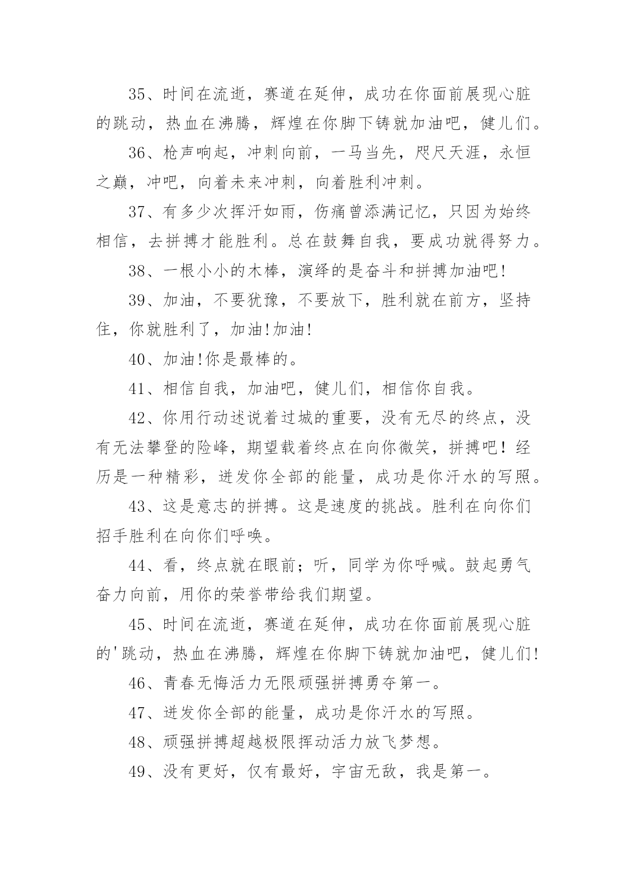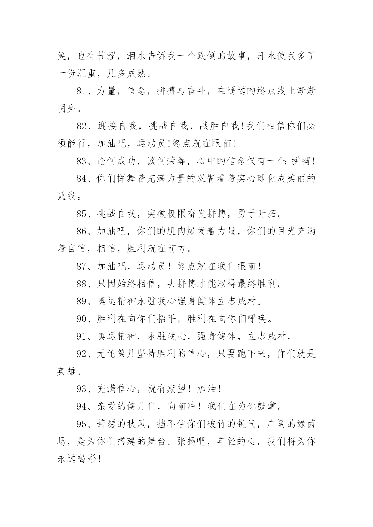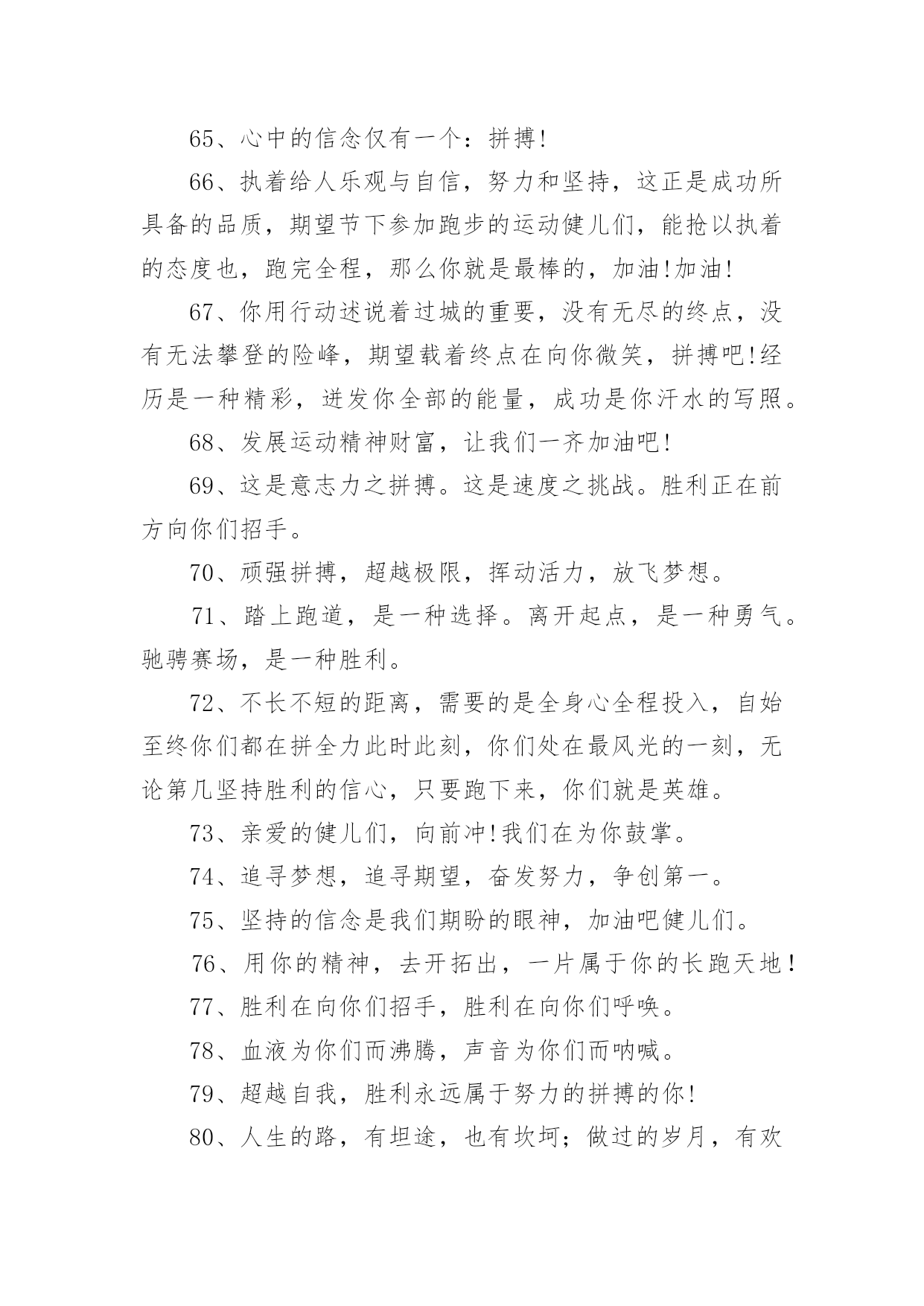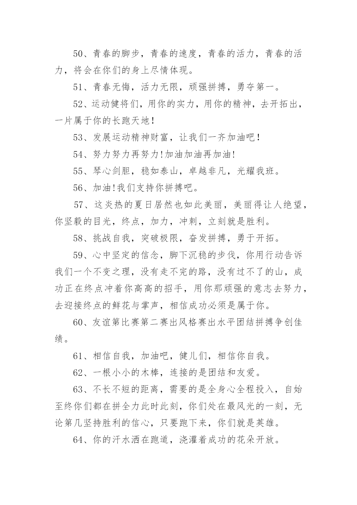 运动会加油稿运动会加油稿在不断进步的时代,很多地方都会使用到加油稿,加油稿可以激励对方更好地参加活动。相信很多朋友都对写加油稿感到非常苦恼吧,下面是小编帮大家整理的运动会加油稿,欢迎阅读与收藏。运动会加油稿1踏着春天的气息,迈着轻盈的脚步,我们迎来了心仪已久的运动会。这里就是展示自我的舞台。我们向往高山的坚忍不拔,我们渴望大海的博大精深,还有,我们更痴迷于你们的速度激|情。来吧,尽情释放你的活力。你的每一次冲刺,都叩动着我们的心弦;你的每一次跨越,都吸引着我们的'视线;你的每一次起跳,都绷紧我们的神经。我们为你呐喊,我们为你自豪,我们为你疯狂。运动会加油稿2三(5)班是一个温馨,可爱的班集体,也是一个由36名同学组成的一个大家庭,我们班是一个团结友爱的班级,这三年来我们班度过了许多难忘的日子。勤奋、团结、活泼是我们班的班风。12月,我们完成了三年级上册的学业,我们班也有了一个崭新的`起点。这次运动会,我们奔着友谊第一、比赛第二的精神来参与。我们想信,只要团结,就能战胜一切。‘团结拼搏,永往直前,放飞梦想’,共创佳绩!这是我们的口号,我们带着我们的口号向更好的目标前进!运动会加油稿3广阔的绿茵场,是为你们搭建的.舞台。张扬吧,年轻的心,我们将为你永远喝彩!泰戈尔在诗中说,天空没有翅膀的影子,但我已飞过;艾青对朋友说,也许有人到达不了彼岸,但我们共同拥有大海。也许你们没有显赫的成绩,但运动场上留下了你们的足迹。也许你们没有奖品,但我们心中留下了你们拼搏的身影。所有的努力都是为了迎接这一刹那,所有的拼搏都是为了这一声令下。运动会加油稿4也许流星并不少见,但它燃烧的刹那,留给人间最美丽的回忆!也许笑脸并不少见,但胜利的喜悦,总会留给世界精彩的一瞬!是的,那些曾经美妙的`东西只有短短的一瞬间,但那却把最辉煌的一刻留给了人间。胜利,是每个人所追求的,胜利的喜悦,是胜利与重新开始的转折,胜利是新的开始!运动会加油稿5也许流星并不少见,但它燃烧的刹那,留给人间最美丽的回忆!也许笑脸并不少见,但胜利的喜悦,总会留给世界精彩的一瞬!是的,那些曾经美妙的东西只有短短的`一瞬间,但那却把最辉煌的一刻留给了人间。胜利,是每个人所追求的,胜利的喜悦,是胜利与重新开始的转折,胜利是新的开始!运动会加油稿6不为鲜花的围绕,不为刹那的荣耀,只有执着的信念,化作不停的奔跑,心中燃烧着梦想,脚下不停的步伐,你用行动述说着过程的'重要,没有无尽的终点,没有无法攀登的险峰,希望载着终点在向你微笑,拼搏吧!经历是一种精彩,迸发你全部的能量,成功是你汗水的写照。运动会加油稿7赞三千米运动员你是运动场的心脏,跳动梦想;你是漫长路的精神,激励辉煌;你们是将上下求索的人!风为你加油,云为你助兴,坚定,执着,耐力与希望,在延伸的白色跑道中点点凝聚!力量,信念,拼搏与奋斗,在遥远的终点线上渐渐明亮!时代的`强音正在你的脚下踏响。运动会加油稿8年轻的我们自信飞扬,青春的气息如同出生的朝陽,蓬勃的力量如同陽光的挥洒。此时此刻,跑道便是我们精彩的'舞台,声声加油便是我们的奖项!论何成功,谈何荣辱,心中的信念只有一个:拼搏!萧瑟的秋风,挡不住你们破竹的锐气。运动会加油稿9蔚蓝的天空下,有你矫健的身影,热闹的操场上,有你坚定的步伐,美丽的'鲜花后有你辛勤的汗水,我们的喝彩中,有你的自豪与骄傲!体育健儿们,我们知道你们的辛勤,我们了解你们的辛苦,加油吧!不论你是成功还是失败,我们都是你们坚强的后盾,胜也爱你,败也爱你,我们永远支持你,你们永远是“最特别的存在”。运动会加油稿101、挑战运动极限,演绎健康风采!2、加油吧,运动员!终点就在我们眼前!3、不为鲜花的围绕,不为刹那的荣耀,仅有执着的信念,化作不停的奔跑,心中燃烧着梦想,脚下不停的步伐。4、你们挥舞着充满力量的双臂看着实心球化成美丽的弧线5、这是意志的拼搏。这是速度的挑战。胜利在向你们招手胜利在向你们呼唤。6、一根小小的木棒,演绎的是奋斗和拼搏,加油吧!7、力量,信念,拼搏与奋斗,在遥远的终点线上渐渐明亮。8、你的汗水洒在跑道,浇灌着成功的花朵开放。9、掌声为你们而响起,加油!10、离开起点,是一种勇气。驰骋赛场,是一种胜利11、挑战运动极限,演绎健康风采!12、奋斗是你的极至你在挑战极限运动健儿,冲刺吧。13、让我们一齐高呼:我们能行我们能赢!14、论何成功,谈何荣辱,心中的信念仅有一个:拼搏!15、追寻梦想,追寻期望,奋发努力,争创第一。16、挑战运动极限,演绎健康风采!17、友谊第一,比赛第二,赛出风格,赛出水平,团结拼搏争创佳绩。18、一根小小的木棒,连接的是团结和友爱19、挑战自我,突破极限,奋发拼搏,勇于开拓。20、让我们一齐高呼:我们能行我们能赢!21、总在鼓舞自我,要成功就得努力。22、用你的精神,去开拓出,一片属于
