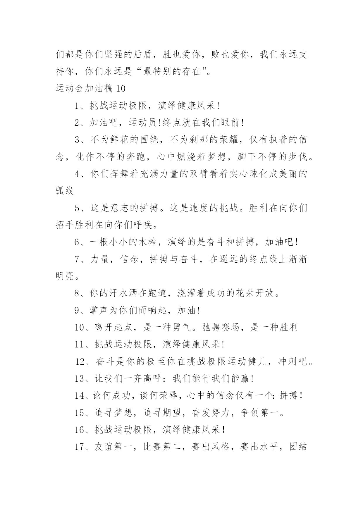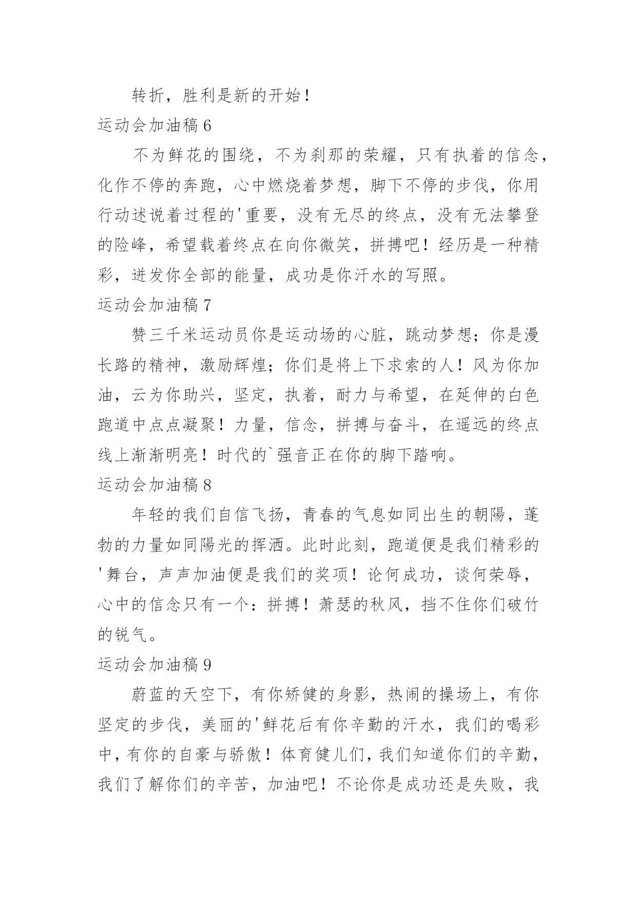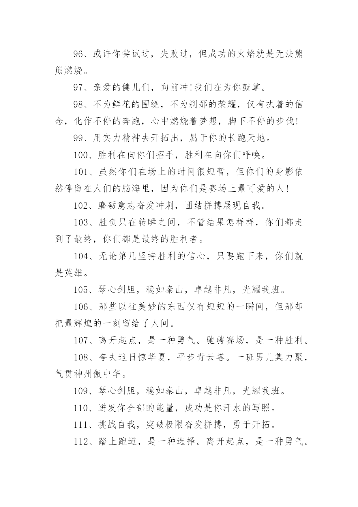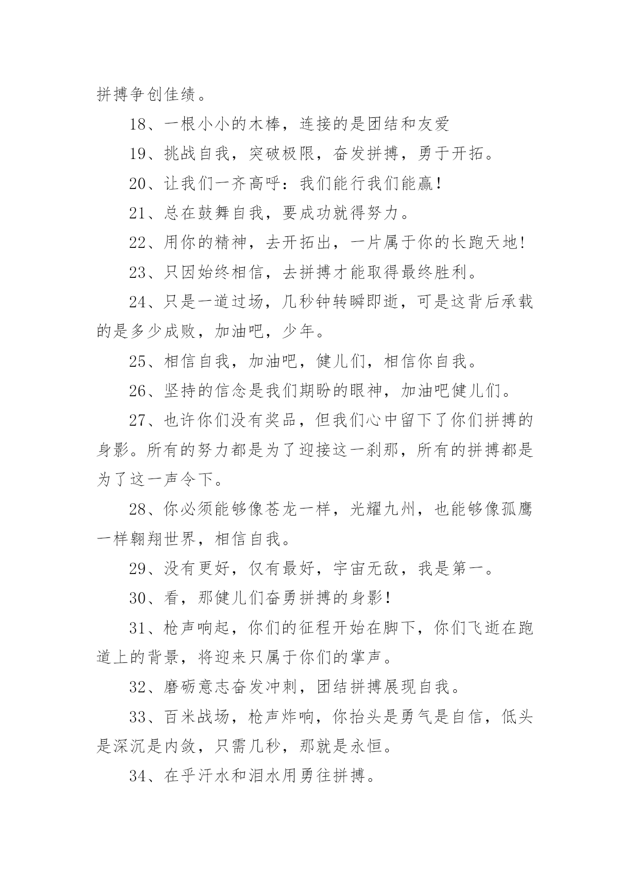 运动会加油稿运动会加油稿在不断进步的时代,很多地方都会使用到加油稿,加油稿可以激励对方更好地参加活动。相信很多朋友都对写加油稿感到非常苦恼吧,下面是小编帮大家整理的运动会加油稿,欢迎阅读与收藏。运动会加油稿1踏着春天的气息,迈着轻盈的脚步,我们迎来了心仪已久的运动会。这里就是展示自我的舞台。我们向往高山的坚忍不拔,我们渴望大海的博大精深,还有,我们更痴迷于你们的速度激|情。来吧,尽情释放你的活力。你的每一次冲刺,都叩动着我们的心弦;你的每一次跨越,都吸引着我们的'视线;你的每一次起跳,都绷紧我们的神经。我们为你呐喊,我们为你自豪,我们为你疯狂。运动会加油稿2三(5)班是一个温馨,可爱的班集体,也是一个由36名同学组成的一个大家庭,我们班是一个团结友爱的班级,这三年来我们班度过了许多难忘的日子。勤奋、团结、活泼是我们班的班风。12月,我们完成了三年级上册的学业,我们班也有了一个崭新的`起点。这次运动会,我们奔着友谊第一、比赛第二的精神来参与。我们想信,只要团结,就能战胜一切。‘团结拼搏,永往直前,放飞梦想’,共创佳绩!这是我们的口号,我们带着我们的口号向更好的目标前进!运动会加油稿3广阔的绿茵场,是为你们搭建的.舞台。张扬吧,年轻的心,我们将为你永远喝彩!泰戈尔在诗中说,天空没有翅膀的影子,但我已飞过;艾青对朋友说,也许有人到达不了彼岸,但我们共同拥有大海。也许你们没有显赫的成绩,但运动场上留下了你们的足迹。也许你们没有奖品,但我们心中留下了你们拼搏的身影。所有的努力都是为了迎接这一刹那,所有的拼搏都是为了这一声令下。运动会加油稿4也许流星并不少见,但它燃烧的刹那,留给人间最美丽的回忆!也许笑脸并不少见,但胜利的喜悦,总会留给世界精彩的一瞬!是的,那些曾经美妙的`东西只有短短的一瞬间,但那却把最辉煌的一刻留给了人间。胜利,是每个人所追求的,胜利的喜悦,是胜利与重新开始的转折,胜利是新的开始!运动会加油稿5也许流星并不少见,但它燃烧的刹那,留给人间最美丽的回忆!也许笑脸并不少见,但胜利的喜悦,总会留给世界精彩的一瞬!是的,那些曾经美妙的东西只有短短的`一瞬间,但那却把最辉煌的一刻留给了人间。胜利,是每个人所追求的,胜利的喜悦,是胜利与重新开始的转折,胜利是新的开始!运动会加油稿6不为鲜花的围绕,不为刹那的荣耀,只有执着的信念,化作不停的奔跑,心中燃烧着梦想,脚下不停的步伐,你用行动述说着过程的'重要,没有无尽的终点,没有无法攀登的险峰,希望载着终点在向你微笑,拼搏吧!经历是一种精彩,迸发你全部的能量,成功是你汗水的写照。运动会加油稿7赞三千米运动员你是运动场的心脏,跳动梦想;你是漫长路的精神,激励辉煌;你们是将上下求索的人!风为你加油,云为你助兴,坚定,执着,耐力与希望,在延伸的白色跑道中点点凝聚!力量,信念,拼搏与奋斗,在遥远的终点线上渐渐明亮!时代的`强音正在你的脚下踏响。运动会加油稿8年轻的我们自信飞扬,青春的气息如同出生的朝陽,蓬勃的力量如同陽光的挥洒。此时此刻,跑道便是我们精彩的'舞台,声声加油便是我们的奖项!论何成功,谈何荣辱,心中的信念只有一个:拼搏!萧瑟的秋风,挡不住你们破竹的锐气。运动会加油稿9蔚蓝的天空下,有你矫健的身影,热闹的操场上,有你坚定的步伐,美丽的'鲜花后有你辛勤的汗水,我们的喝彩中,有你的自豪与骄傲!体育健儿们,我们知道你们的辛勤,我们了解你们的辛苦,加油吧!不论你是成功还是失败,我们都是你们坚强的后盾,胜也爱你,败也爱你,我们永远支持你,你们永远是“最特别的存在”。运动会加油稿101、挑战运动极限,演绎健康风采!2、加油吧,运动员!终点就在我们眼前!3、不为鲜花的围绕,不为刹那的荣耀,仅有执着的信念,化作不停的奔跑,心中燃烧着梦想,脚下不停的步伐。4、你们挥舞着充满力量的双臂看着实心球化成美丽的弧线5、这是意志的拼搏。这是速度的挑战。胜利在向你们招手胜利在向你们呼唤。6、一根小小的木棒,演绎的是奋斗和拼搏,加油吧!7、力量,信念,拼搏与奋斗,在遥远的终点线上渐渐明亮。8、你的汗水洒在跑道,浇灌着成功的花朵开放。9、掌声为你们而响起,加油!10、离开起点,是一种勇气。驰骋赛场,是一种胜利11、挑战运动极限,演绎健康风采!12、奋斗是你的极至你在挑战极限运动健儿,冲刺吧。13、让我们一齐高呼:我们能行我们能赢!14、论何成功,谈何荣辱,心中的信念仅有一个:拼搏!15、追寻梦想,追寻期望,奋发努力,争创第一。16、挑战运动极限,演绎健康风采!17、友谊第一,比赛第二,赛出风格,赛出水平,团结拼搏争创佳绩。18、一根小小的木棒,连接的是团结和友爱19、挑战自我,突破极限,奋发拼搏,勇于开拓。20、让我们一齐高呼:我们能行我们能赢!21、总在鼓舞自我,要成功就得努力。22、用你的精神,去开拓出,一片属于