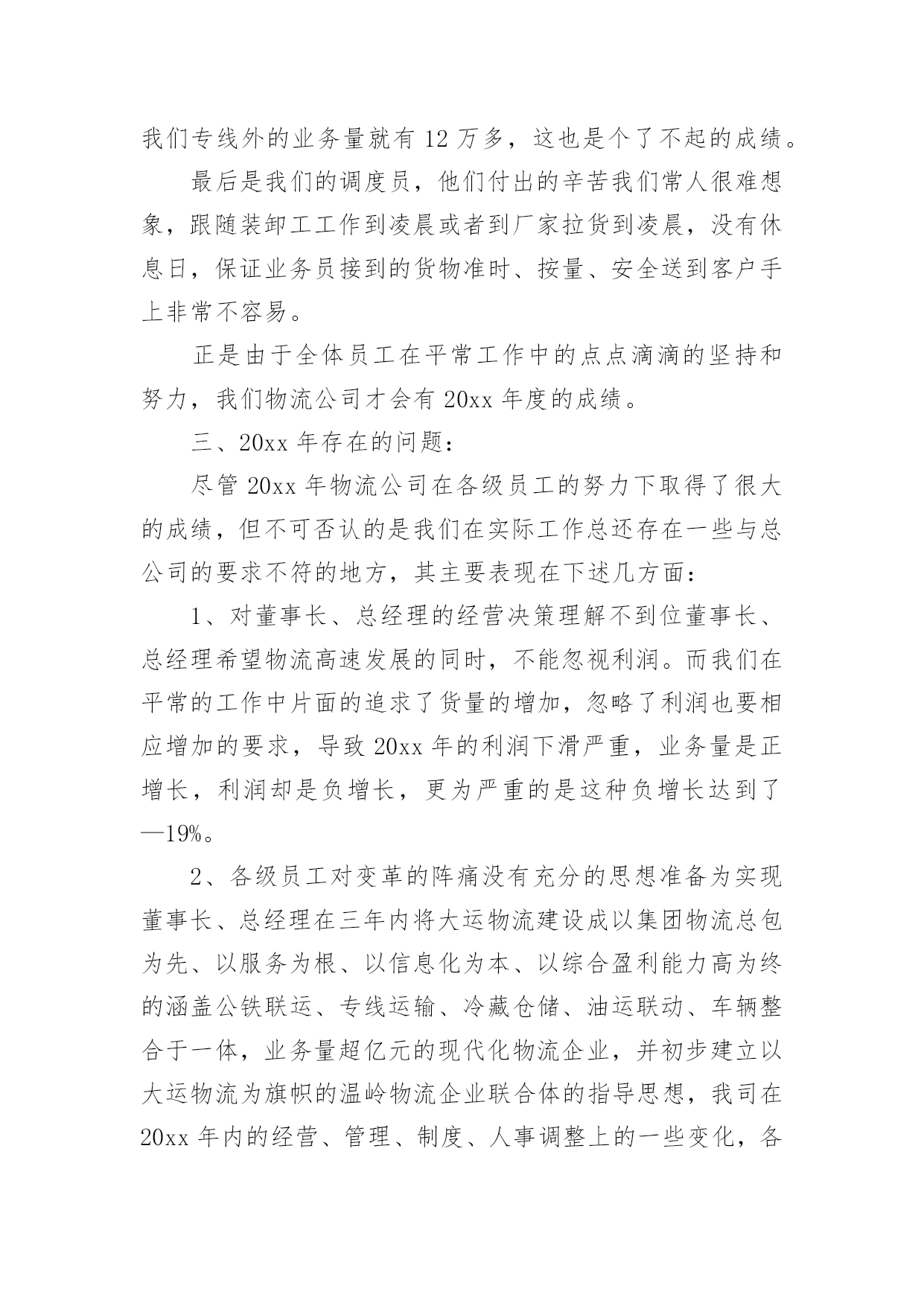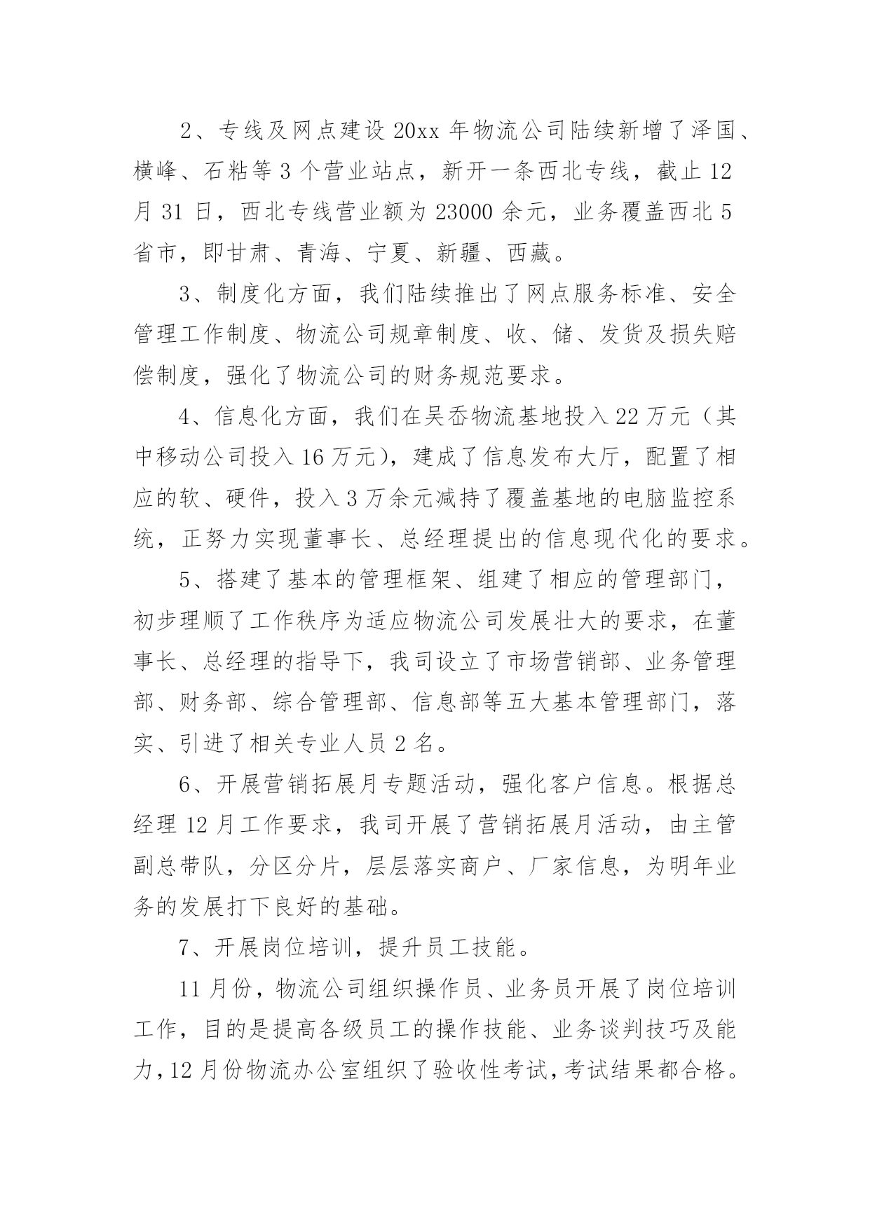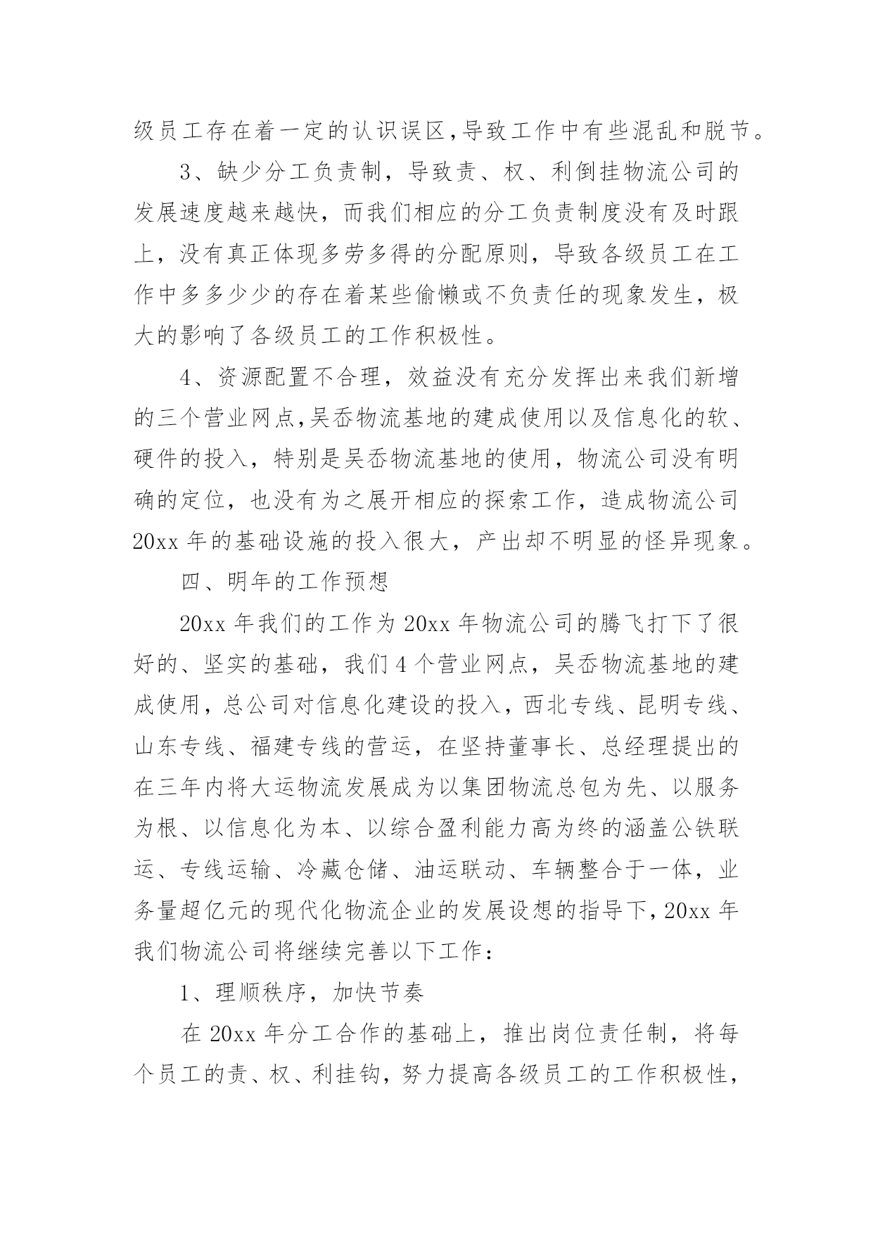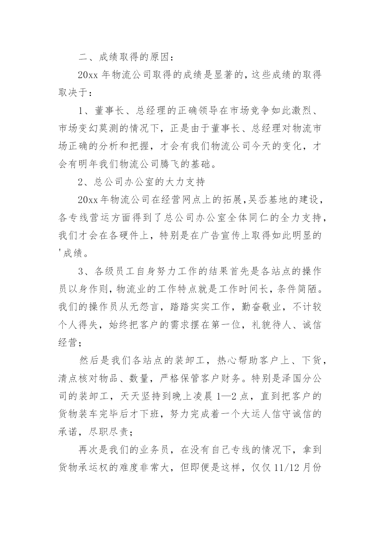 物流公司公司年终总结实用的物流公司公司年终总结3篇总结是对取得的成绩、存在的问题及得到的经验和教训等方面情况进行评价与描述的一种书面材料,它可以提升我们发现问题的能力,不如立即行动起来写一份总结吧。总结你想好怎么写了吗?以下是小编收集整理的物流公司公司年终总结3篇,欢迎大家借鉴与参考,希望对大家有所帮助。物流公司公司年终总结篇1经过又一年的物流管理工作,内心不禁感慨万千,回顾物流全年的工作历程,既有辛酸的汗水,也有进步的喜悦。过去的一年在公司各部门的配合支持及部门员工的共同努力下,顺利完成了全年的各项工作任务,现将我部门一年来的工作情况汇报如下。一、配送1、相比XX年,我们公司销售在整个大环境不景气的情况下有所下滑,在配送这一块,我们配送司机的薪水多少主要是取决配送的商品来计提成的。其实可以发现我们的司机不愿每天呆在家里,情愿多送货多做事来增加收入。2、XX年,我在司机计算提成这一块要求收营员做好司机每天的配送单统计,做到货物配送单的合理安排,避免了以往司机大笔金额货物配送时抢单、抢送的局面,维护了司机之间共同利益和部门员工团结关系。3、门店有时催送货比较急,货物量又比较少,路比较偏远,我们送货的原则是分线配送。有时候一个地方的货比较多,司机走几分钟后又被叫回来,这样来回几下我们的司机也有脾气,这样既浪费人力又浪费物力。还有一种情况就是货不多比较偏、又要得急,我们部门又要考虑油耗、费用的问题。所以说物流部门需要门店的配合,尽量给顾客做好解释工作。4、出货、装车司机按出库单对单对货核对,必须要求司机本人当面做好商品的二次核对。5、加强与各部门的衔接沟通,有效发挥公司现有车辆人员优势,把一些比较急的、数量不多的小货尽量让客户顺路带走。二、人员要求与管理1、20xx年初公司给物流管理部的人员编制是8人,实际在岗人数一直没有达到要求。2、由于人员的流动性大,一直以来是困扰部门工作开展的大问题。作为我部门员工的工作要求,虽然技术性不高。但作业强度大,体力要求比较高,也需要勤劳好学,做事责任心也要求高。自己必须要了解自己的下属,包括他的人品、性格、爱好、处事作风、工作能力等诸多方面,针对不同性格、不同年龄段、不同能力的人应该分别予以不同的管理方式、做到人尽其才,物尽其用。同时要关心自己的员工生活,除了批评外还要多加鼓励,以及对其的信任,让他体会到领导层的关心与器重,让他知道我们不但是上下级关系、同事关系,我们还是互相支持、关心的朋友关系。当然,作为管理者,同样要在员工面前树立自己的威信。这种威信不是靠恶语批评,也不是靠一味的做老好人树立起来的。你需要的是一个团队的力量,你需要说你好的人的支持,你同样需要说你坏的人的支持。三、车辆的管理1、定期对配送司机进行车辆人生安全防范意识培训讲解,定期做好车辆内外清洁卫生。2、严格控制部门内车辆费用,合理有效安排配送路线。3、严格要求配送员填写出车记录:如出车时间、行程、地点、事由、驾驶人签名,做到有出车就必有出车记录,做到保存全年的出车记录表。4、对全年车辆的费用使用情况做表格化存档:如车辆维修零件费用、保养、加油的时间、行驶公里数都有记录,做到部门内有数据可查,明确保养周期、时间。5、坚持秉承小问题自己动手解决、大问题送修自己买维修配件的原则,节约控制部门车辆费用。四、工作回顾与展望1、20xx年不知不觉在指尖慢慢逝去,20xx年迎面而来。回想过去,展望未来!有进步的喜悦,亦有工作中失误的愧疚。用心总结工作当中的利弊、得失。2、认真履行工作职责,在新的一年里,物流部将为公司的发展做到尽心尽力。物流公司公司年终总结篇220xx年时物流公司不平凡的一年,也是物流公司与时俱进、开拓创新、激情创业,奋力超越,再铸辉煌的一年。一年来,物流公司在总公司董事长、总经理的正确领导和关怀下,在办公室主任的有力支持下,在物流公司各级领导的科学管理和以身作则的带领下,在全体人员的不懈努力和奋力拼搏下,公司始终坚持董事长、总经理制定的经营策略和业务方针,认真落实公司20xx年工作计划,全面执行总经理“敬业、团结、智慧”的工作指示,围绕着“安全发展、专线发展和优质服务”三条主线,竭尽全力,忘我工作,优质、高效、圆满的完成了全年任务。20xx年物流公司在温岭物流业散、乱、小的复杂形势,运价竞争非常恶劣、自身起点相对弱小的情况下,我司共完成销售额520余万元,新增专线一条—西北专线,营业网点增加泽国、横峰、石粘等站点,吴岙物流基地建成投入使用,组建了适应公司飞速发展需要的管理层,为20xx年更高速的发展奠定了良好的基础。如今,我司全体人员意气风发、斗志昂扬、团结奋斗、积极进取、不怕困难、迎接挑战,全面落实董事长、总经理的决策,向更高更好的目标进军。一、现将20xx年工作总结如下:1、销售总额及利润20xx年物流公司完成销售