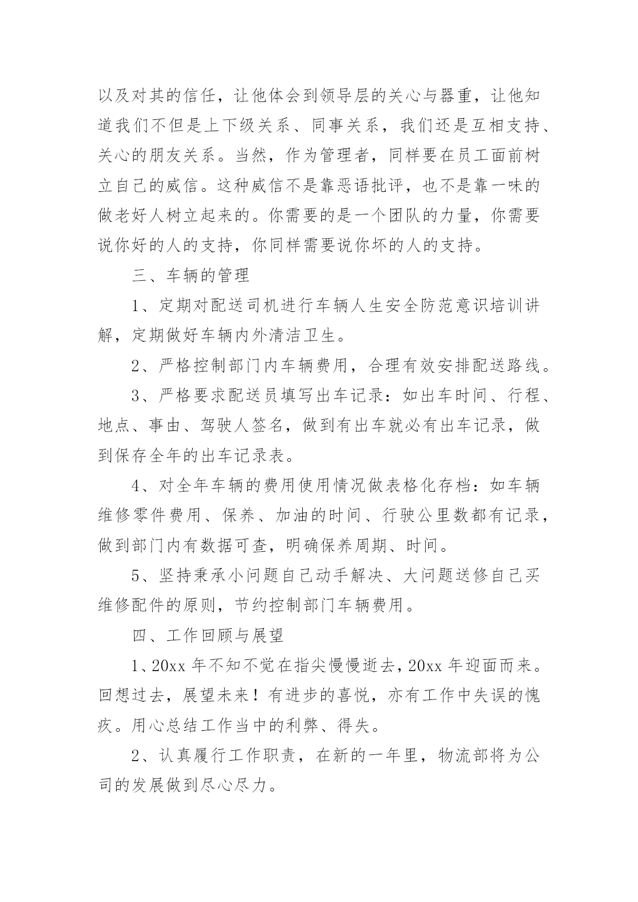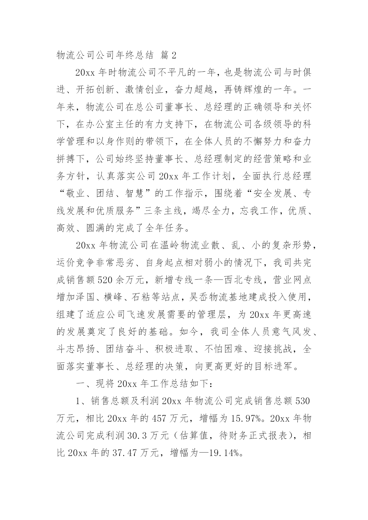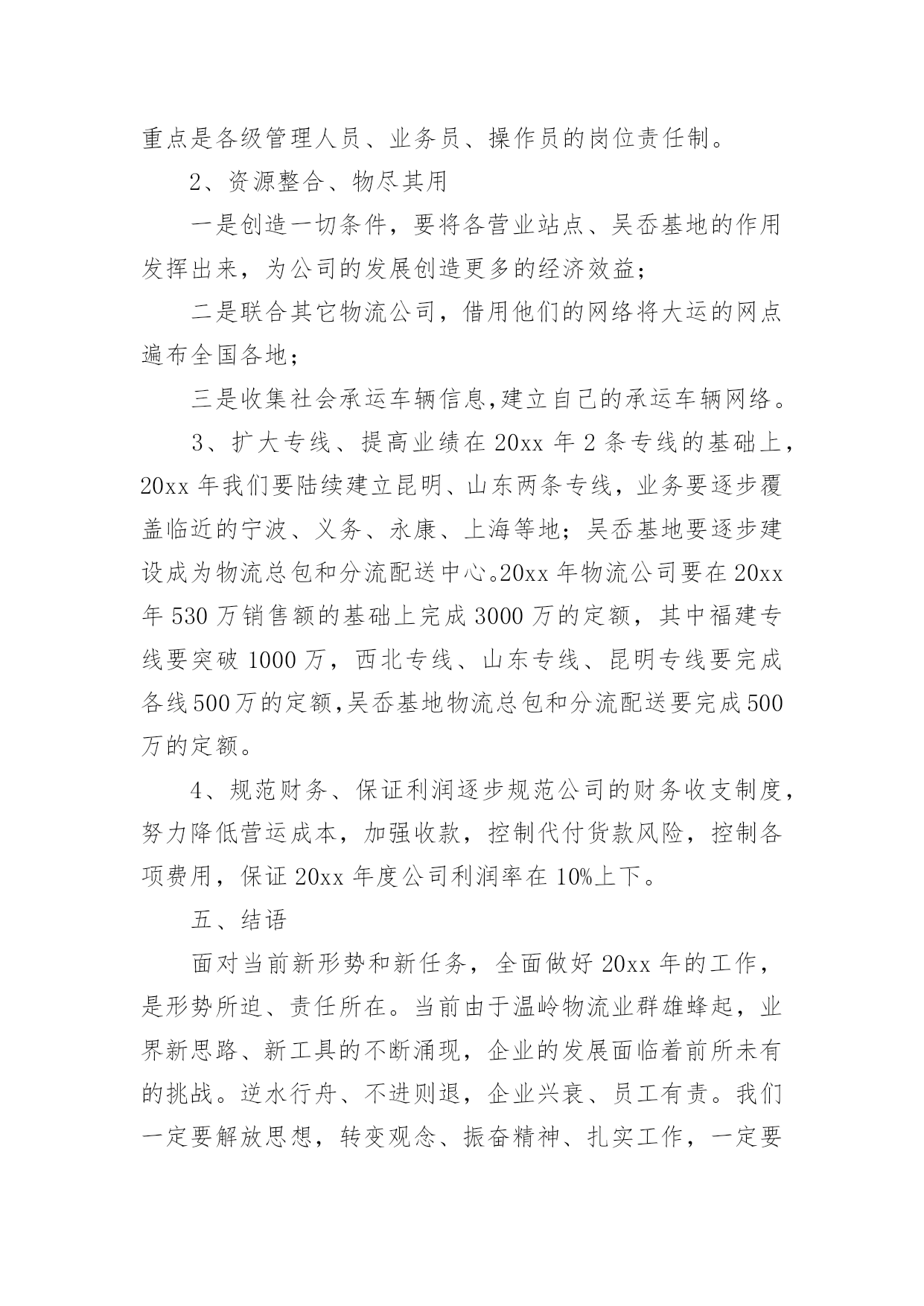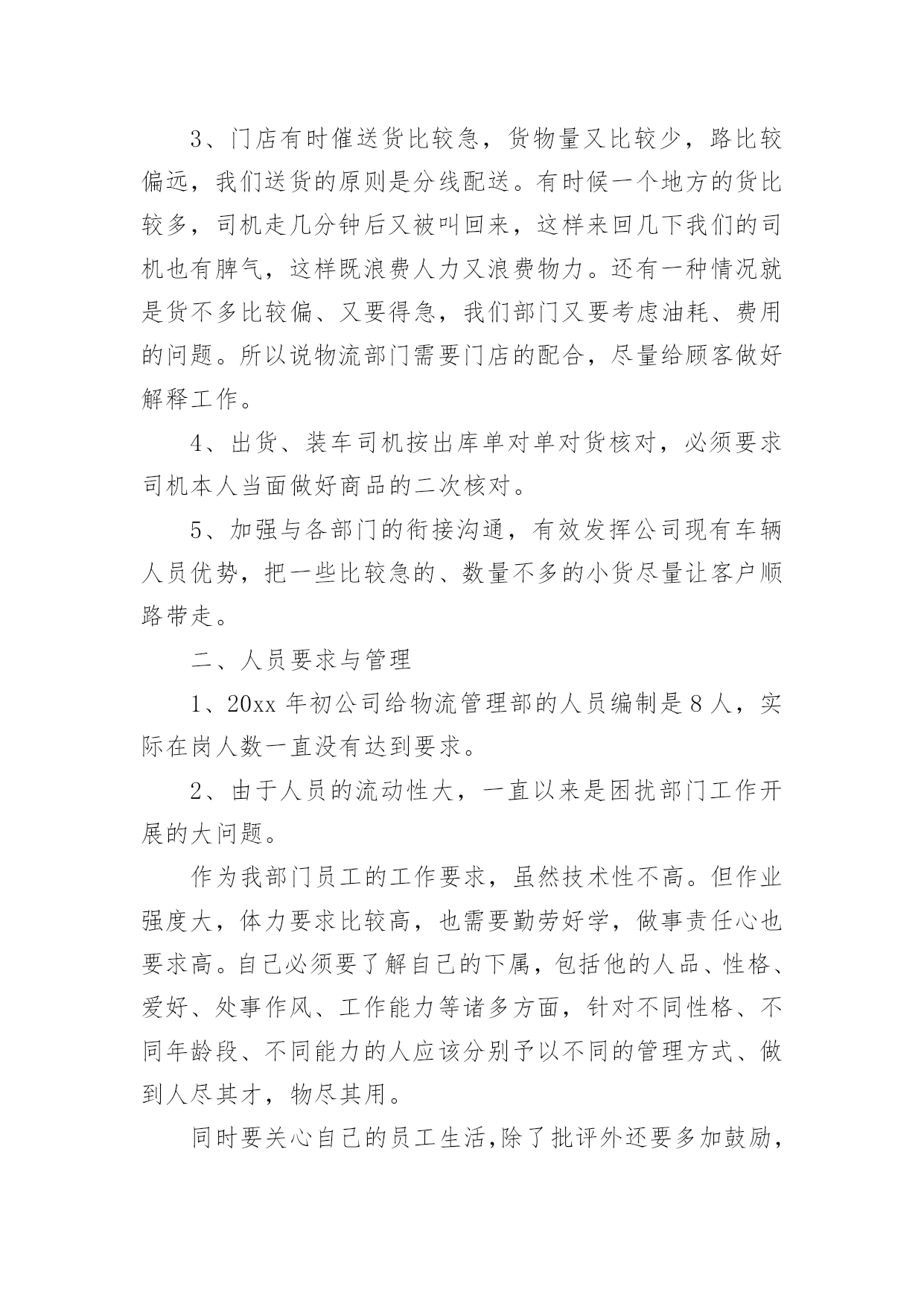 物流公司公司年终总结实用的物流公司公司年终总结3篇总结是对取得的成绩、存在的问题及得到的经验和教训等方面情况进行评价与描述的一种书面材料,它可以提升我们发现问题的能力,不如立即行动起来写一份总结吧。总结你想好怎么写了吗?以下是小编收集整理的物流公司公司年终总结3篇,欢迎大家借鉴与参考,希望对大家有所帮助。物流公司公司年终总结篇1经过又一年的物流管理工作,内心不禁感慨万千,回顾物流全年的工作历程,既有辛酸的汗水,也有进步的喜悦。过去的一年在公司各部门的配合支持及部门员工的共同努力下,顺利完成了全年的各项工作任务,现将我部门一年来的工作情况汇报如下。一、配送1、相比XX年,我们公司销售在整个大环境不景气的情况下有所下滑,在配送这一块,我们配送司机的薪水多少主要是取决配送的商品来计提成的。其实可以发现我们的司机不愿每天呆在家里,情愿多送货多做事来增加收入。2、XX年,我在司机计算提成这一块要求收营员做好司机每天的配送单统计,做到货物配送单的合理安排,避免了以往司机大笔金额货物配送时抢单、抢送的局面,维护了司机之间共同利益和部门员工团结关系。3、门店有时催送货比较急,货物量又比较少,路比较偏远,我们送货的原则是分线配送。有时候一个地方的货比较多,司机走几分钟后又被叫回来,这样来回几下我们的司机也有脾气,这样既浪费人力又浪费物力。还有一种情况就是货不多比较偏、又要得急,我们部门又要考虑油耗、费用的问题。所以说物流部门需要门店的配合,尽量给顾客做好解释工作。4、出货、装车司机按出库单对单对货核对,必须要求司机本人当面做好商品的二次核对。5、加强与各部门的衔接沟通,有效发挥公司现有车辆人员优势,把一些比较急的、数量不多的小货尽量让客户顺路带走。二、人员要求与管理1、20xx年初公司给物流管理部的人员编制是8人,实际在岗人数一直没有达到要求。2、由于人员的流动性大,一直以来是困扰部门工作开展的大问题。作为我部门员工的工作要求,虽然技术性不高。但作业强度大,体力要求比较高,也需要勤劳好学,做事责任心也要求高。自己必须要了解自己的下属,包括他的人品、性格、爱好、处事作风、工作能力等诸多方面,针对不同性格、不同年龄段、不同能力的人应该分别予以不同的管理方式、做到人尽其才,物尽其用。同时要关心自己的员工生活,除了批评外还要多加鼓励,以及对其的信任,让他体会到领导层的关心与器重,让他知道我们不但是上下级关系、同事关系,我们还是互相支持、关心的朋友关系。当然,作为管理者,同样要在员工面前树立自己的威信。这种威信不是靠恶语批评,也不是靠一味的做老好人树立起来的。你需要的是一个团队的力量,你需要说你好的人的支持,你同样需要说你坏的人的支持。三、车辆的管理1、定期对配送司机进行车辆人生安全防范意识培训讲解,定期做好车辆内外清洁卫生。2、严格控制部门内车辆费用,合理有效安排配送路线。3、严格要求配送员填写出车记录:如出车时间、行程、地点、事由、驾驶人签名,做到有出车就必有出车记录,做到保存全年的出车记录表。4、对全年车辆的费用使用情况做表格化存档:如车辆维修零件费用、保养、加油的时间、行驶公里数都有记录,做到部门内有数据可查,明确保养周期、时间。5、坚持秉承小问题自己动手解决、大问题送修自己买维修配件的原则,节约控制部门车辆费用。四、工作回顾与展望1、20xx年不知不觉在指尖慢慢逝去,20xx年迎面而来。回想过去,展望未来!有进步的喜悦,亦有工作中失误的愧疚。用心总结工作当中的利弊、得失。2、认真履行工作职责,在新的一年里,物流部将为公司的发展做到尽心尽力。物流公司公司年终总结篇220xx年时物流公司不平凡的一年,也是物流公司与时俱进、开拓创新、激情创业,奋力超越,再铸辉煌的一年。一年来,物流公司在总公司董事长、总经理的正确领导和关怀下,在办公室主任的有力支持下,在物流公司各级领导的科学管理和以身作则的带领下,在全体人员的不懈努力和奋力拼搏下,公司始终坚持董事长、总经理制定的经营策略和业务方针,认真落实公司20xx年工作计划,全面执行总经理“敬业、团结、智慧”的工作指示,围绕着“安全发展、专线发展和优质服务”三条主线,竭尽全力,忘我工作,优质、高效、圆满的完成了全年任务。20xx年物流公司在温岭物流业散、乱、小的复杂形势,运价竞争非常恶劣、自身起点相对弱小的情况下,我司共完成销售额520余万元,新增专线一条—西北专线,营业网点增加泽国、横峰、石粘等站点,吴岙物流基地建成投入使用,组建了适应公司飞速发展需要的管理层,为20xx年更高速的发展奠定了良好的基础。如今,我司全体人员意气风发、斗志昂扬、团结奋斗、积极进取、不怕困难、迎接挑战,全面落实董事长、总经理的决策,向更高更好的目标进军。一、现将20xx年工作总结如下:1、销售总额及利润20xx年物流公司完成销售