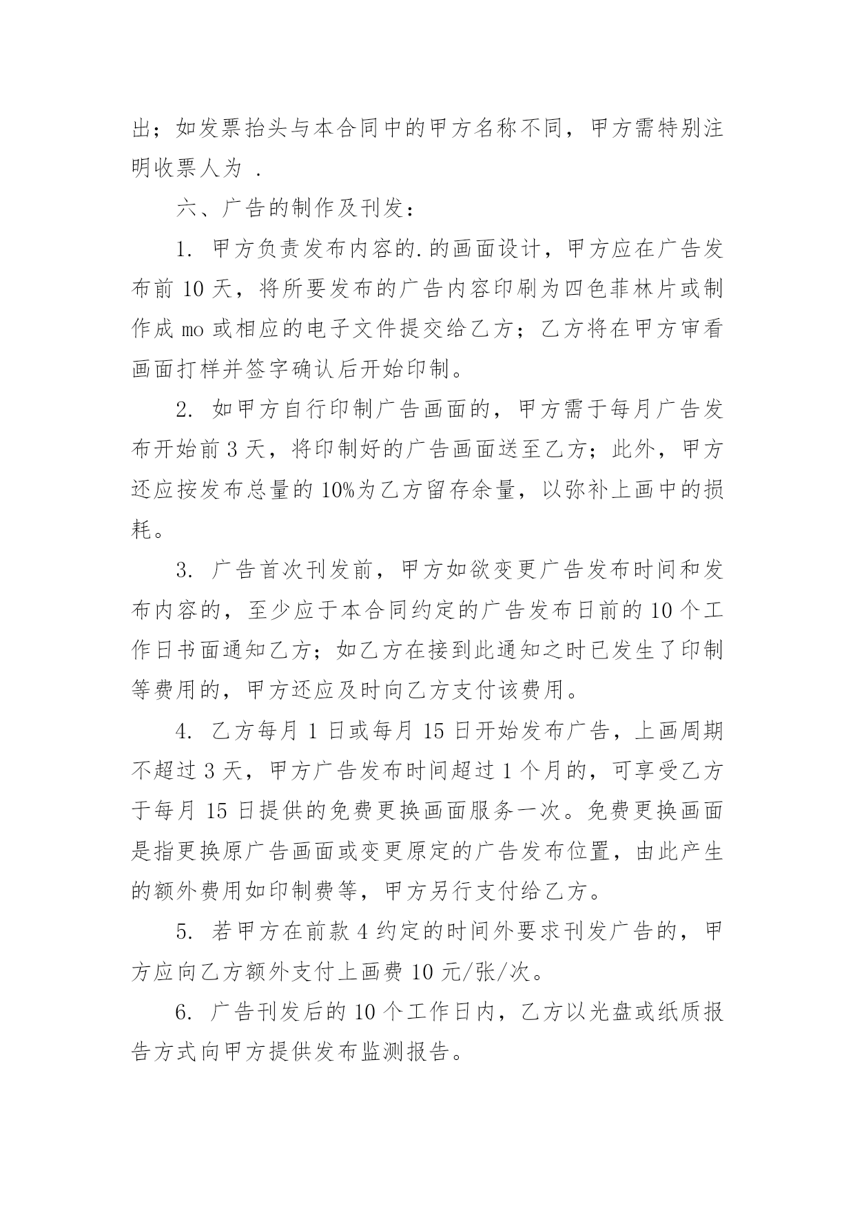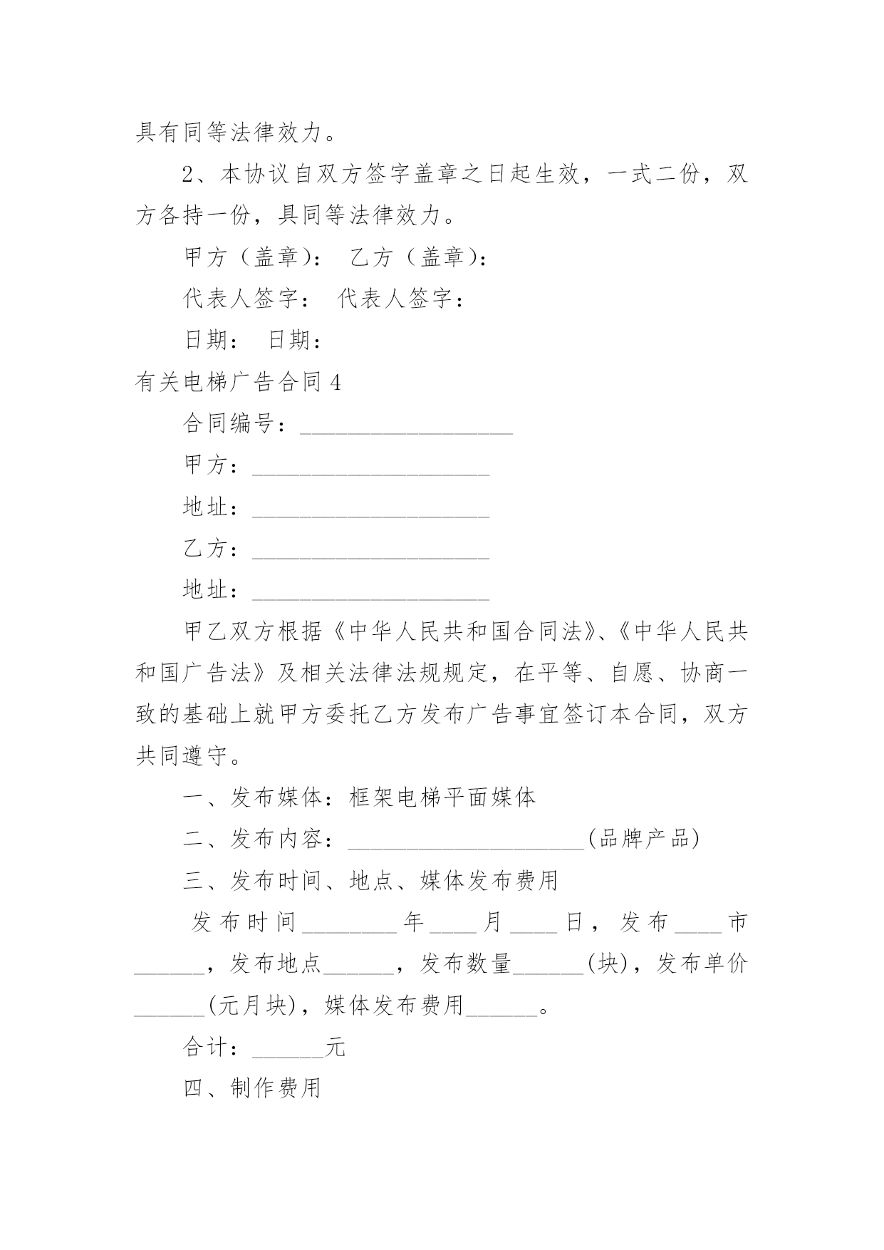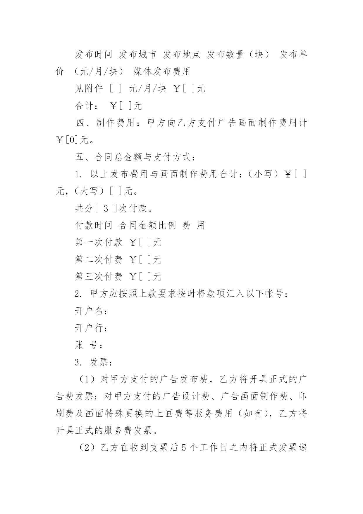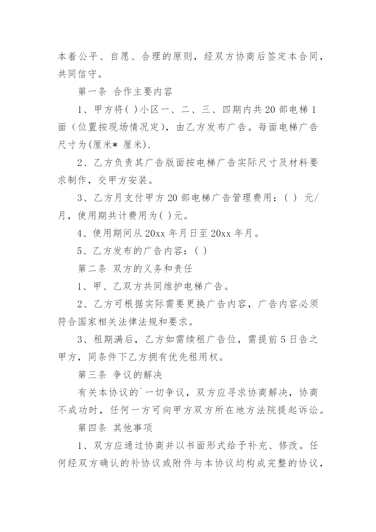 电梯广告合同有关电梯广告合同10篇在当今不断发展的世界,合同的地位越来越不容忽视,签订合同可以明确双方当事人的权利和义务。那么合同要怎么拟定?想必这让大家都很苦恼吧,以下是小编精心整理的有关电梯广告合同,供大家参考借鉴,希望可以帮助到有需要的朋友。有关电梯广告合同1甲方:______________(以下简称甲方)乙方:______________(以下简称乙方)根据《合同法》和《广告法》以及其它相关规定,甲、乙双方本着友好协商、互惠互利的原则,就关于租赁消防挂图广告位一事达成一致意见,并自愿签订本合同。第一条:广告位位置、面积、租赁期限及付款方式。1、位置:甲方租赁广告位于______________;2、面积与租金:______________;上述广告位每面每月为元,共有______________面(¥______________元)(以上价格不含税)3、租期:租赁期为______________,自_______年____月____日起至_______年____月____日止。4、付款方式:乙方需在合同签订时支付预付款_______________________给甲方。广告位全部完成后乙方应当即付清全部余款。第二条:甲方的权利与义务。1、乙方需在合同签订5天内向甲方提交有关广告宣传背景资料或样板,自行拟订的图文内容需经过甲方审核。2、乙方履行正常合法的租赁手续之后,于本合同约定期限内享有此广告位使用权,但不享有此广告位所有权,不得以任何形式将此广告位转让、转租或赠送给其他单位或个人。3乙方广告内容应当合法和合乎国家有关商业广告的相关规定,不得用于政治目的,不得发布违法信息。4、乙方不得擅自挪动广告位位置、朝向或更改广告位面积的大小。5、乙方广告图文内容必须遵守《广告法》的相关规定,如有内容违反《广告法》或给予其他载体造成不良影响,其责任由乙方承担。第三条:乙方权利与义务。1、负责该广告位的提供,乙方不得擅自更改约定广告位的位置、面积的.大小、朝向等,应当向甲方保证约定广告位的质量。2、甲方有监督、管理广告位及发布在广告位上之广告的权利,并负责与此相关的审核、维护、调整等相关工作。3、该广告的制作、安装、维护及所发生的费用由甲方负责。第四条:其他事项。1、如因地震、火灾等不可抗力造成广告位严重损毁不可使用的,甲、乙双方均不承担违约责任,本合同自然终止。2、租赁期满,若甲方需要续租上述广告位,在同等条件下,甲方享有此广告位的优先租赁权,须另行签订书面广告合同。3、本合同一式贰份,具有同等法律效力。本合同经双方签字之日起生效。甲方:______________(盖章)乙方:______________(盖章)代表:______________代表:______________签约时间:________年___月___日有关电梯广告合同2甲方:地址:乙方:广告有限公司(以下简称:乙方)地址:甲乙双方根据《中华人民共和国合同法》、《中华人民共和国广告法》及相关法律法规规定,在平等、自愿、协商一致的基础上就甲方委托乙方发布广告事宜签订本合同,双方共同遵守。一、发布媒体:框架电梯平面媒体二、发布内容:(品牌/产品)三、发布时间、地点、媒体发布费用发布时间发布城市发布地点发布数量(块)发布单价(元/月/块)媒体发布费用见附件[]元/月/块¥[]元合计:¥[]元四、制作费用:甲方向乙方支付广告画面制作费用计¥[0]元。五、合同总金额与支付方式:1.以上发布费用与画面制作费用合计:(小写)¥[]元,(大写)[]元。共分[3]次付款。付款时间合同金额比例费用第一次付款¥[]元第二次付费¥[]元第三次付费¥[]元2.甲方应按照上款要求按时将款项汇入以下帐号:开户名:开户行:账号:3.发票:(1)对甲方支付的广告发布费,乙方将开具正式的广告费发票;对甲方支付的广告设计费、广告画面制作费、印刷费及画面特殊更换的上画费等服务费用(如有),乙方将开具正式的服务费发票。(2)乙方在收到支票后5个工作日之内将正式发票递出;如发票抬头与本合同中的甲方名称不同,甲方需特别注明收票人为.六、广告的制作及刊发:1.甲方负责发布内容的.的画面设计,甲方应在广告发布前10天,将所要发布的广告内容印刷为四色菲林片或制作成mo或相应的电子文件提交给乙方;乙方将在甲方审看画面打样并签字确认后开始印制。2.如甲方自行印制广告画面的,甲方需于每月广告发布开始前3天,将印制好的广告画面送至乙方;此外,甲方还应按发布总量的10%为乙方留存余量,以弥补上画中的损耗。3.广告首次刊发前,甲方如欲变更广告发布时间和发布内容的,至少应于本合同约定的广告发布日前的10个工作日书面通知乙方;如乙方在接到此通知之时已发生了印制等费用的,甲方还应及时向乙方支付该费用。4.乙方每月1日或每