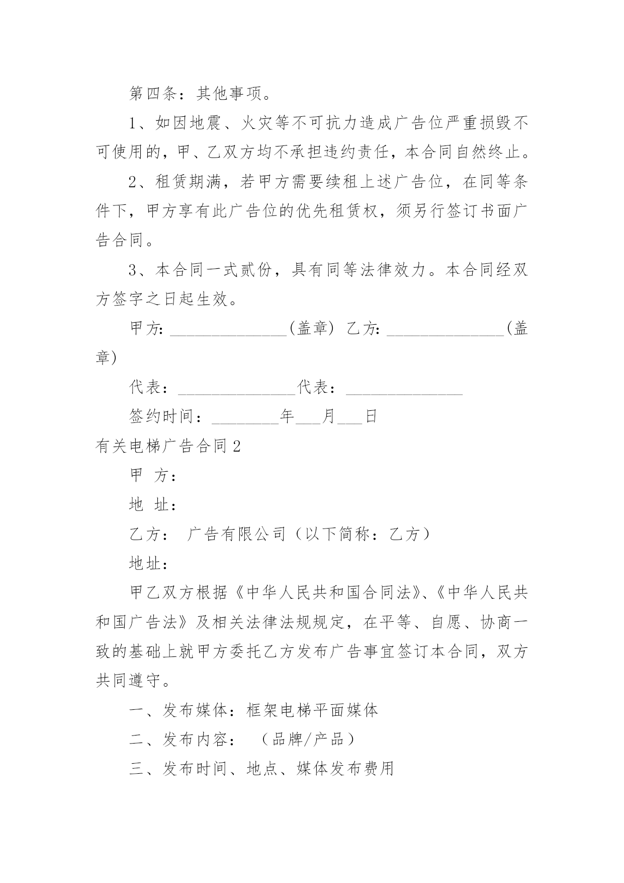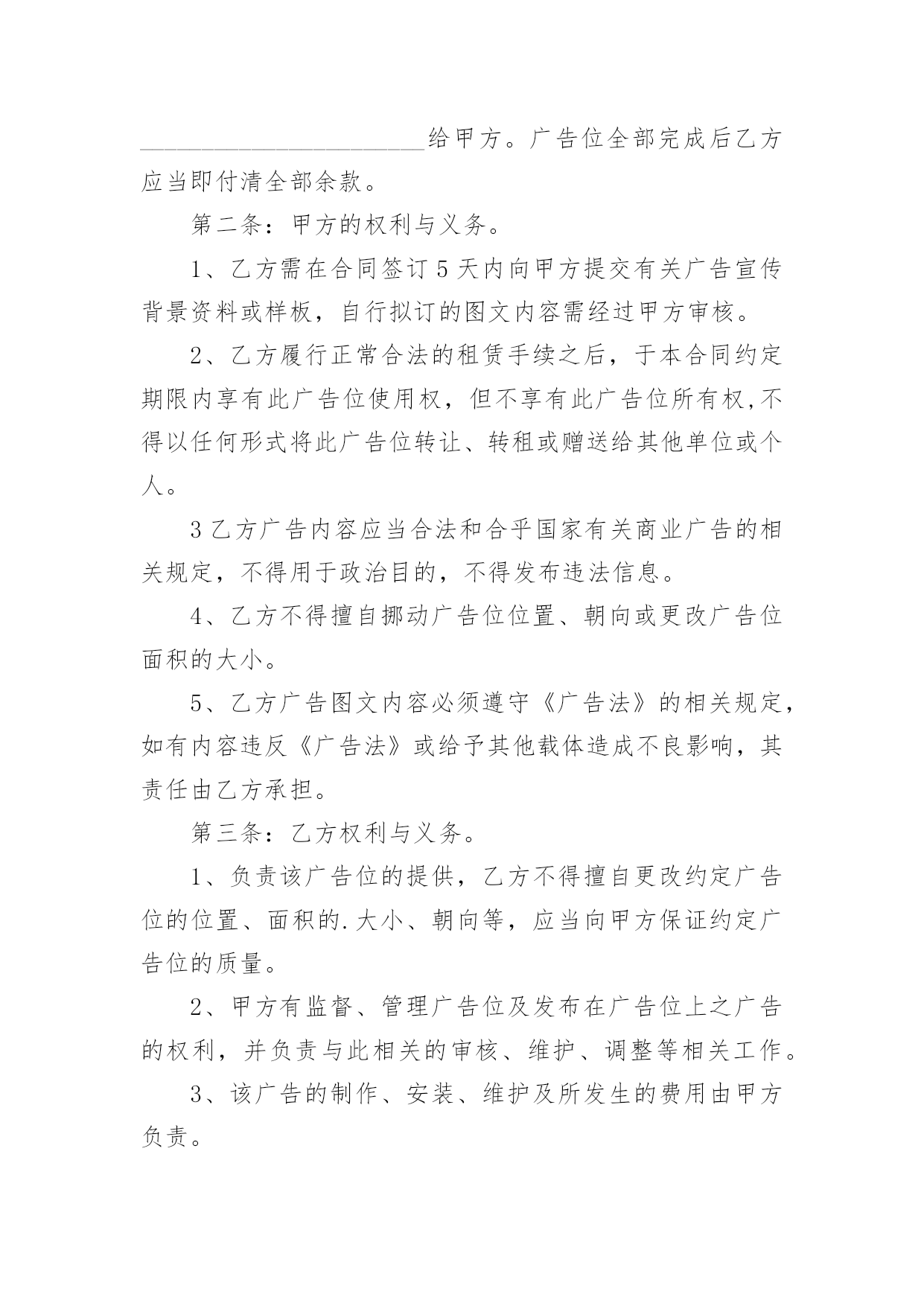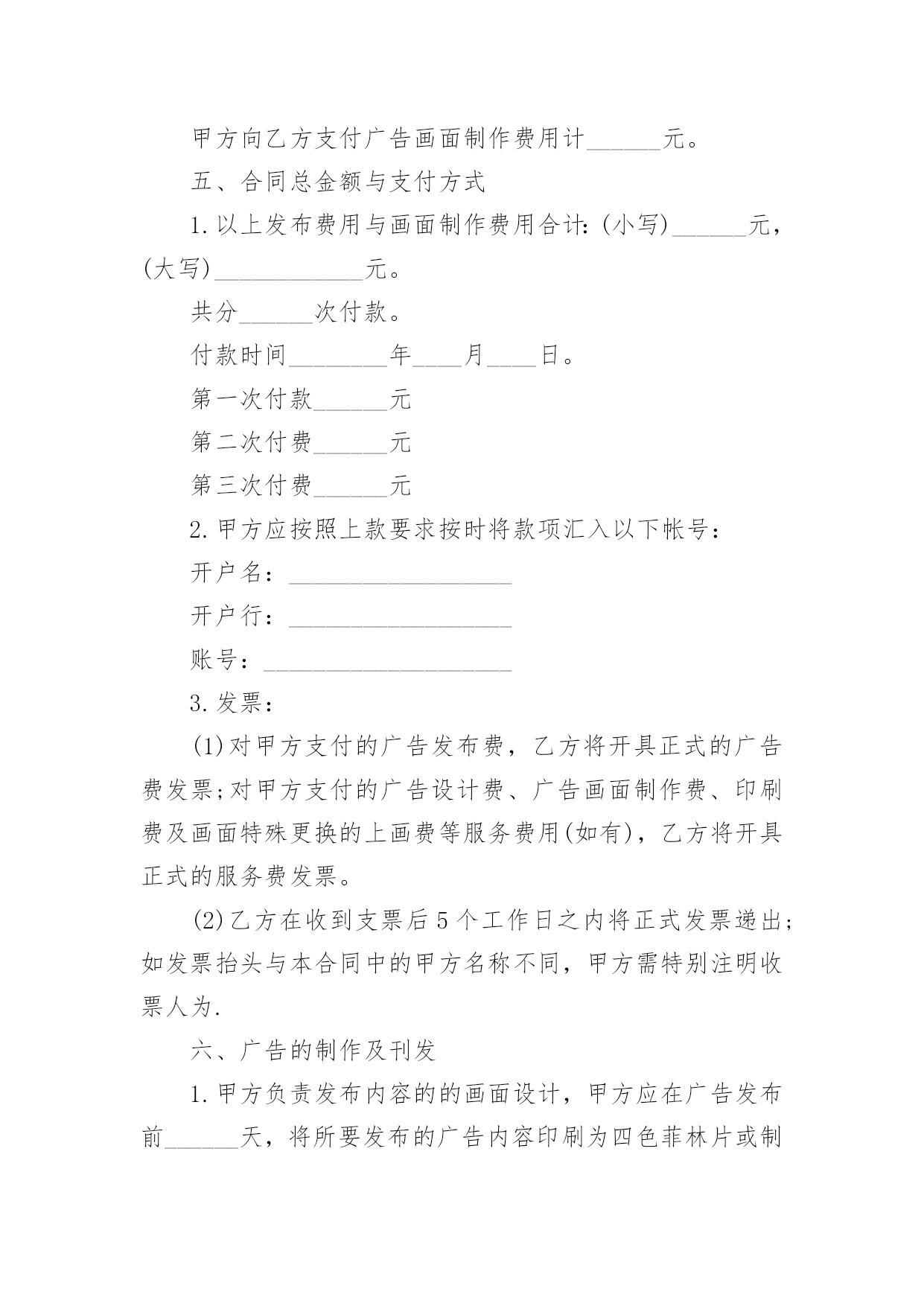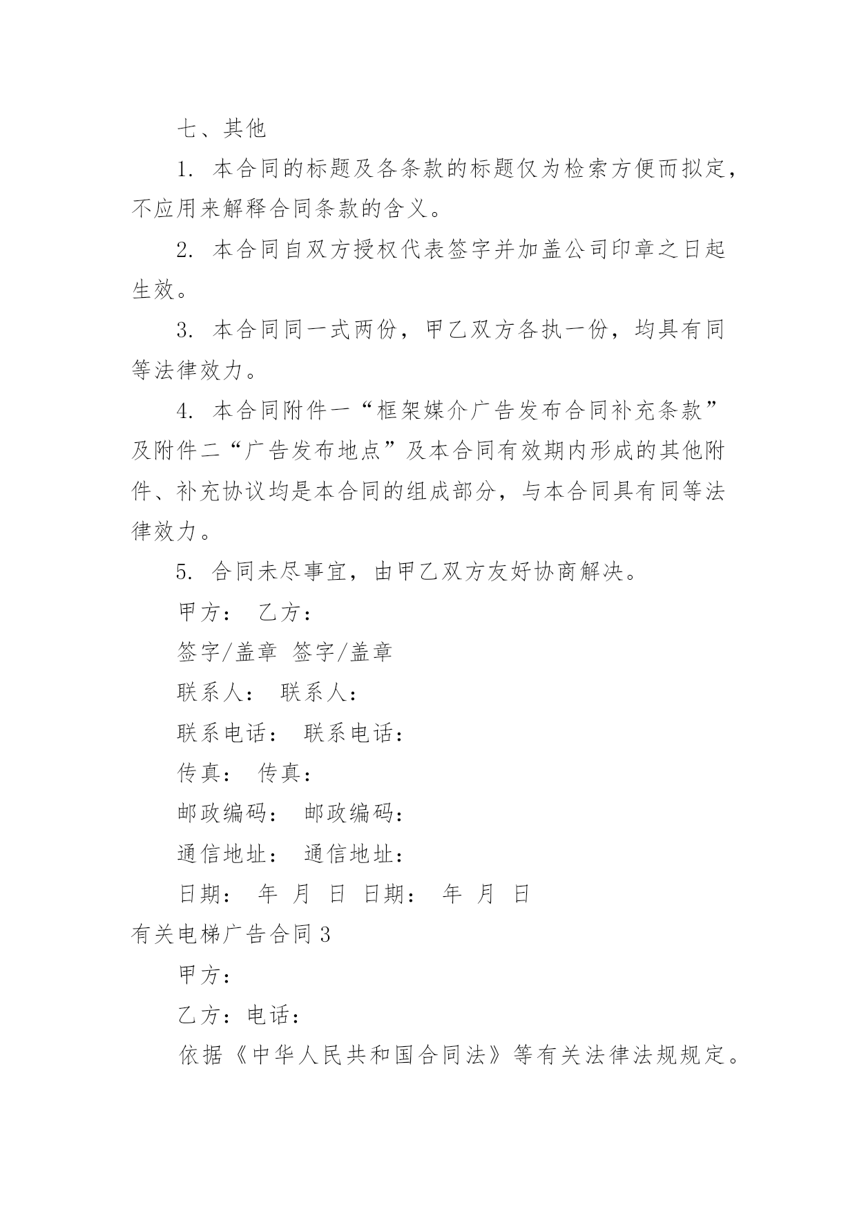 电梯广告合同有关电梯广告合同10篇在当今不断发展的世界,合同的地位越来越不容忽视,签订合同可以明确双方当事人的权利和义务。那么合同要怎么拟定?想必这让大家都很苦恼吧,以下是小编精心整理的有关电梯广告合同,供大家参考借鉴,希望可以帮助到有需要的朋友。有关电梯广告合同1甲方:______________(以下简称甲方)乙方:______________(以下简称乙方)根据《合同法》和《广告法》以及其它相关规定,甲、乙双方本着友好协商、互惠互利的原则,就关于租赁消防挂图广告位一事达成一致意见,并自愿签订本合同。第一条:广告位位置、面积、租赁期限及付款方式。1、位置:甲方租赁广告位于______________;2、面积与租金:______________;上述广告位每面每月为元,共有______________面(¥______________元)(以上价格不含税)3、租期:租赁期为______________,自_______年____月____日起至_______年____月____日止。4、付款方式:乙方需在合同签订时支付预付款_______________________给甲方。广告位全部完成后乙方应当即付清全部余款。第二条:甲方的权利与义务。1、乙方需在合同签订5天内向甲方提交有关广告宣传背景资料或样板,自行拟订的图文内容需经过甲方审核。2、乙方履行正常合法的租赁手续之后,于本合同约定期限内享有此广告位使用权,但不享有此广告位所有权,不得以任何形式将此广告位转让、转租或赠送给其他单位或个人。3乙方广告内容应当合法和合乎国家有关商业广告的相关规定,不得用于政治目的,不得发布违法信息。4、乙方不得擅自挪动广告位位置、朝向或更改广告位面积的大小。5、乙方广告图文内容必须遵守《广告法》的相关规定,如有内容违反《广告法》或给予其他载体造成不良影响,其责任由乙方承担。第三条:乙方权利与义务。1、负责该广告位的提供,乙方不得擅自更改约定广告位的位置、面积的.大小、朝向等,应当向甲方保证约定广告位的质量。2、甲方有监督、管理广告位及发布在广告位上之广告的权利,并负责与此相关的审核、维护、调整等相关工作。3、该广告的制作、安装、维护及所发生的费用由甲方负责。第四条:其他事项。1、如因地震、火灾等不可抗力造成广告位严重损毁不可使用的,甲、乙双方均不承担违约责任,本合同自然终止。2、租赁期满,若甲方需要续租上述广告位,在同等条件下,甲方享有此广告位的优先租赁权,须另行签订书面广告合同。3、本合同一式贰份,具有同等法律效力。本合同经双方签字之日起生效。甲方:______________(盖章)乙方:______________(盖章)代表:______________代表:______________签约时间:________年___月___日有关电梯广告合同2甲方:地址:乙方:广告有限公司(以下简称:乙方)地址:甲乙双方根据《中华人民共和国合同法》、《中华人民共和国广告法》及相关法律法规规定,在平等、自愿、协商一致的基础上就甲方委托乙方发布广告事宜签订本合同,双方共同遵守。一、发布媒体:框架电梯平面媒体二、发布内容:(品牌/产品)三、发布时间、地点、媒体发布费用发布时间发布城市发布地点发布数量(块)发布单价(元/月/块)媒体发布费用见附件[]元/月/块¥[]元合计:¥[]元四、制作费用:甲方向乙方支付广告画面制作费用计¥[0]元。五、合同总金额与支付方式:1.以上发布费用与画面制作费用合计:(小写)¥[]元,(大写)[]元。共分[3]次付款。付款时间合同金额比例费用第一次付款¥[]元第二次付费¥[]元第三次付费¥[]元2.甲方应按照上款要求按时将款项汇入以下帐号:开户名:开户行:账号:3.发票:(1)对甲方支付的广告发布费,乙方将开具正式的广告费发票;对甲方支付的广告设计费、广告画面制作费、印刷费及画面特殊更换的上画费等服务费用(如有),乙方将开具正式的服务费发票。(2)乙方在收到支票后5个工作日之内将正式发票递出;如发票抬头与本合同中的甲方名称不同,甲方需特别注明收票人为.六、广告的制作及刊发:1.甲方负责发布内容的.的画面设计,甲方应在广告发布前10天,将所要发布的广告内容印刷为四色菲林片或制作成mo或相应的电子文件提交给乙方;乙方将在甲方审看画面打样并签字确认后开始印制。2.如甲方自行印制广告画面的,甲方需于每月广告发布开始前3天,将印制好的广告画面送至乙方;此外,甲方还应按发布总量的10%为乙方留存余量,以弥补上画中的损耗。3.广告首次刊发前,甲方如欲变更广告发布时间和发布内容的,至少应于本合同约定的广告发布日前的10个工作日书面通知乙方;如乙方在接到此通知之时已发生了印制等费用的,甲方还应及时向乙方支付该费用。4.乙方每月1日或每