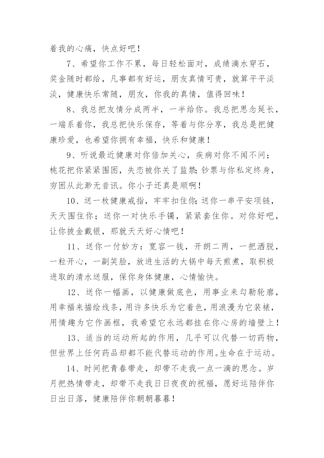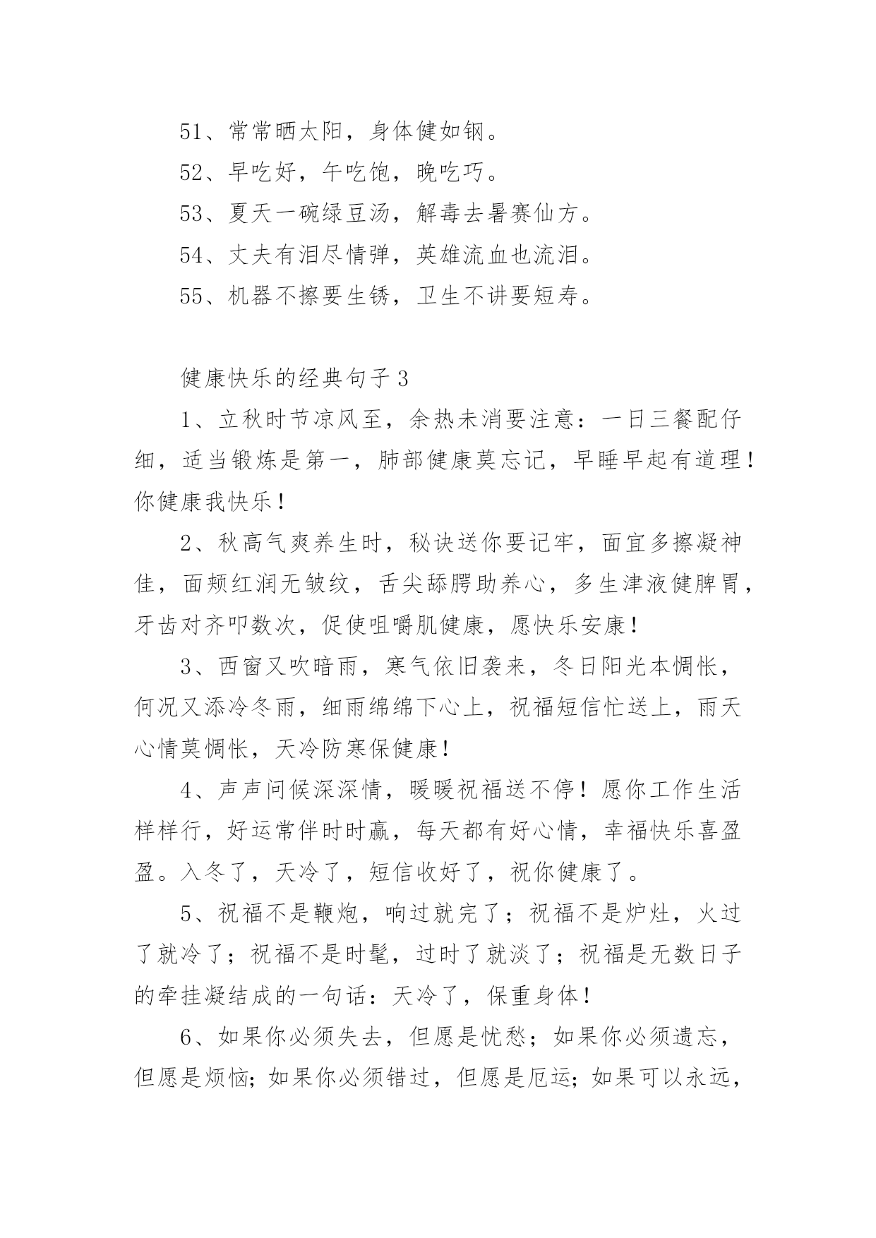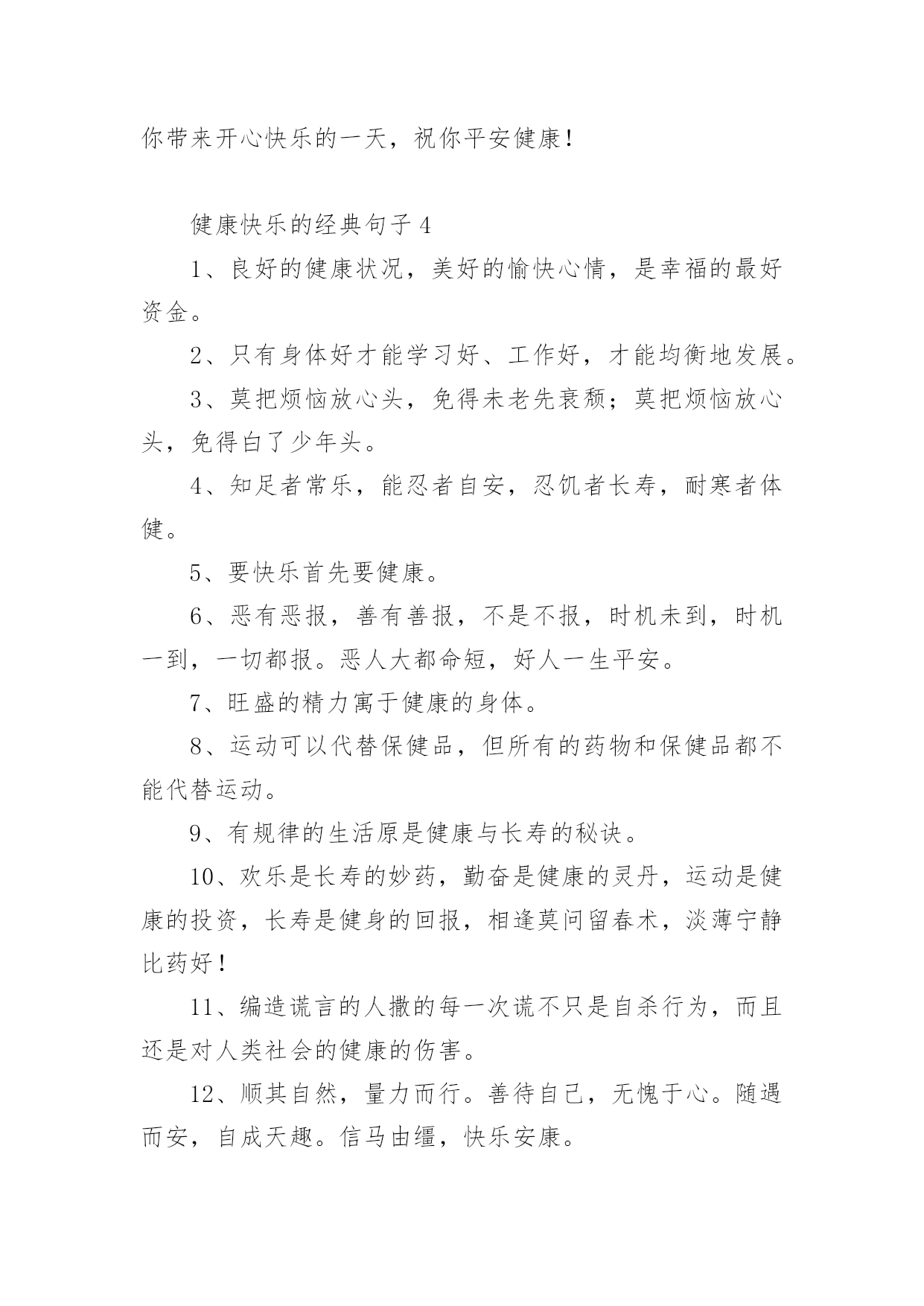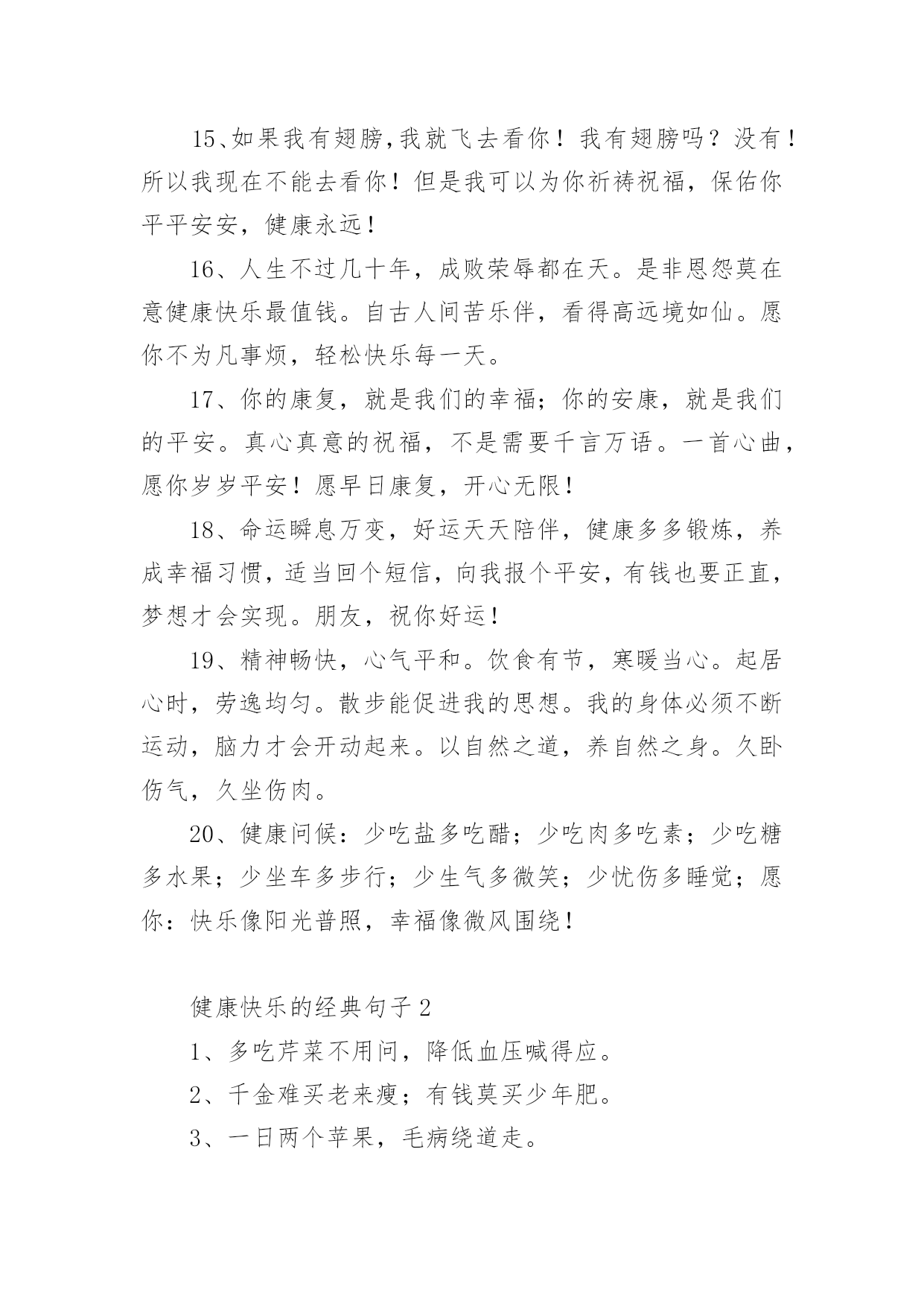 健康快乐的经典句子在平平淡淡的日常中,大家对句子都再熟悉不过了吧,不同的句子在语言环境中的意义和作用大有不同。究竟什么样的句子才是好的句子呢?下面是小编整理的健康快乐的经典句子,欢迎大家分享。健康快乐的经典句子11、愿身边所有爱你的人和你爱的人平安,用我们的信念战胜灾难,用我们的爱感动上天,请把这祝福发给你的朋友,你们都会健康、幸福、平安!2、愿健康快乐像阳光普照大地般环绕在你身边,愿幸运幸福像春雨滋润万物般飘洒在你左右。3、有空的话多约几个朋友一起喝喝茶叙叙旧,没空的时候自己打盆热水好好烫烫脚。钱是赚不完的,但是健康是自己的。好好呵护自己,否则没人爱你。4、淡淡的一个微笑消散烦忧,柔柔的一缕微风抚平烦躁,轻轻的一声问候温暖心田,深深的一句祝福满含真诚,愿你快乐健康,愿你幸福平安!5、一个人,有至纯的灵魂,原本就是一件憾人心魄的深刻,这样的简单,让人敬仰,让我们在雪灾、地震、洪水后,更加珍惜健康和生命。6、想想父母,吃药不苦;想想亲朋,打针不痛;想想自己美好的爱情、友情,病就会好啦!你的病痛,也同样引着我的心痛,快点好吧!7、希望你工作不累,每日轻松面对,成绩滴水穿石,奖金随时都给,凡事都有好运,朋友真情可贵,就算平平淡淡,健康快乐常随,朋友,你我的真情,值得回味!8、我总把友情分成两半,一半给你。我总把思念延长,一端系着你,我总把快乐保存,等着与你分享,我总是把健康珍爱,也希望你拥有幸福,快乐和健康!9、听说最近健康对你倍加关心,疾病对你不闻不问;桃花把你紧紧围困,失恋被你关了监禁;钞票与你私定终身,穷困从此渺无音讯。你小子还真是顺啊!10、送一枚健康戒指,牢牢扣住你;送你一串平安项链,天天围住你;送你一对快乐手镯,紧紧套住你。对你好吧,让你披金戴银,那就天天好心情吧!11、送你一付妙方:宽容一钱,开朗二两,一把洒脱,一粒开心,一副笑脸,放进生活的大锅中每天煎煮,取积极进取的清水送服,保你身体健康,心情愉快。12、送你一幅画,以健康做底色,用事业来勾勒轮廓,用幸福来描绘线条,用许多快乐为它着色,用浪漫为它装裱,用情趣为它作画框,我希望它永远都挂在你心房的墙壁上!13、适当的运动所起的作用,几乎可以代替一切药物,但世界上任何药品却都不能代替运动的作用。生命在于运动。14、时间把青春带走,却带不走我一点一滴的思念。岁月把热情带走,却带不走我日日夜夜的祝福,愿好运陪伴你日出日落,健康陪伴你朝朝暮暮!15、如果我有翅膀,我就飞去看你!我有翅膀吗?没有!所以我现在不能去看你!但是我可以为你祈祷祝福,保佑你平平安安,健康永远!16、人生不过几十年,成败荣辱都在天。是非恩怨莫在意健康快乐最值钱。自古人间苦乐伴,看得高远境如仙。愿你不为凡事烦,轻松快乐每一天。17、你的康复,就是我们的幸福;你的安康,就是我们的平安。真心真意的祝福,不是需要千言万语。一首心曲,愿你岁岁平安!愿早日康复,开心无限!18、命运瞬息万变,好运天天陪伴,健康多多锻炼,养成幸福习惯,适当回个短信,向我报个平安,有钱也要正直,梦想才会实现。朋友,祝你好运!19、精神畅快,心气平和。饮食有节,寒暖当心。起居心时,劳逸均匀。散步能促进我的思想。我的身体必须不断运动,脑力才会开动起来。以自然之道,养自然之身。久卧伤气,久坐伤肉。20、健康问候:少吃盐多吃醋;少吃肉多吃素;少吃糖多水果;少坐车多步行;少生气多微笑;少忧伤多睡觉;愿你:快乐像阳光普照,幸福像微风围绕!健康快乐的经典句子21、多吃芹菜不用问,降低血压喊得应。2、千金难买老来瘦;有钱莫买少年肥。3、一日两个苹果,毛病绕道走。4、快乐有度,失度则乐极生悲。5、小小黄瓜是个宝,减肥美容少不了。6、人说苦瓜苦,我话苦瓜甜。7、暴饮暴食会生病,定时定量可安宁。8、寒从脚下起,病从口中入。9、怒伤肝,喜伤心,悲忧惊恐伤命根。10、情极百病生,情舒百病除。11、胡萝卜,小人参;经常吃,长精神。12、笑一笑,十年少;愁一愁,白了头。13、要得身体好,常把秧歌跳。14、睡多容易病,少睡亦伤身。15、吃药不忌嘴,跑断医生腿。16、常洗衣服常洗澡,常晒被褥疾病少。17、常开窗,透阳光;通空气,保健康。18、娱乐有制,失制则精疲力竭。19、铁不冶炼不成钢,人不运动不健康。20、人是铁,饭是钢,一顿不吃饿得慌。21、竹从叶上枯,人从脚上老;天天跑步走,药铺不用找。22、吃得慌,咽得忙,伤了胃口害了肠。23、白水沏茶喝,能活一百多。24、粗粮杂粮营养全,既保身体又省钱。25、有泪尽情流,疾病自然愈。26、萝卜出了地,郎中没生意。27、人生血脉似长江,一处不到一处伤。28、最好的医生是自己,最好的运动是步行。29、三分医,七分养,十分防。30、一日两苹果,毛病绕道过。31、宁可锅中存放,不让肚子饱胀。32、吃饭先喝汤,到老不受伤。33、坐有