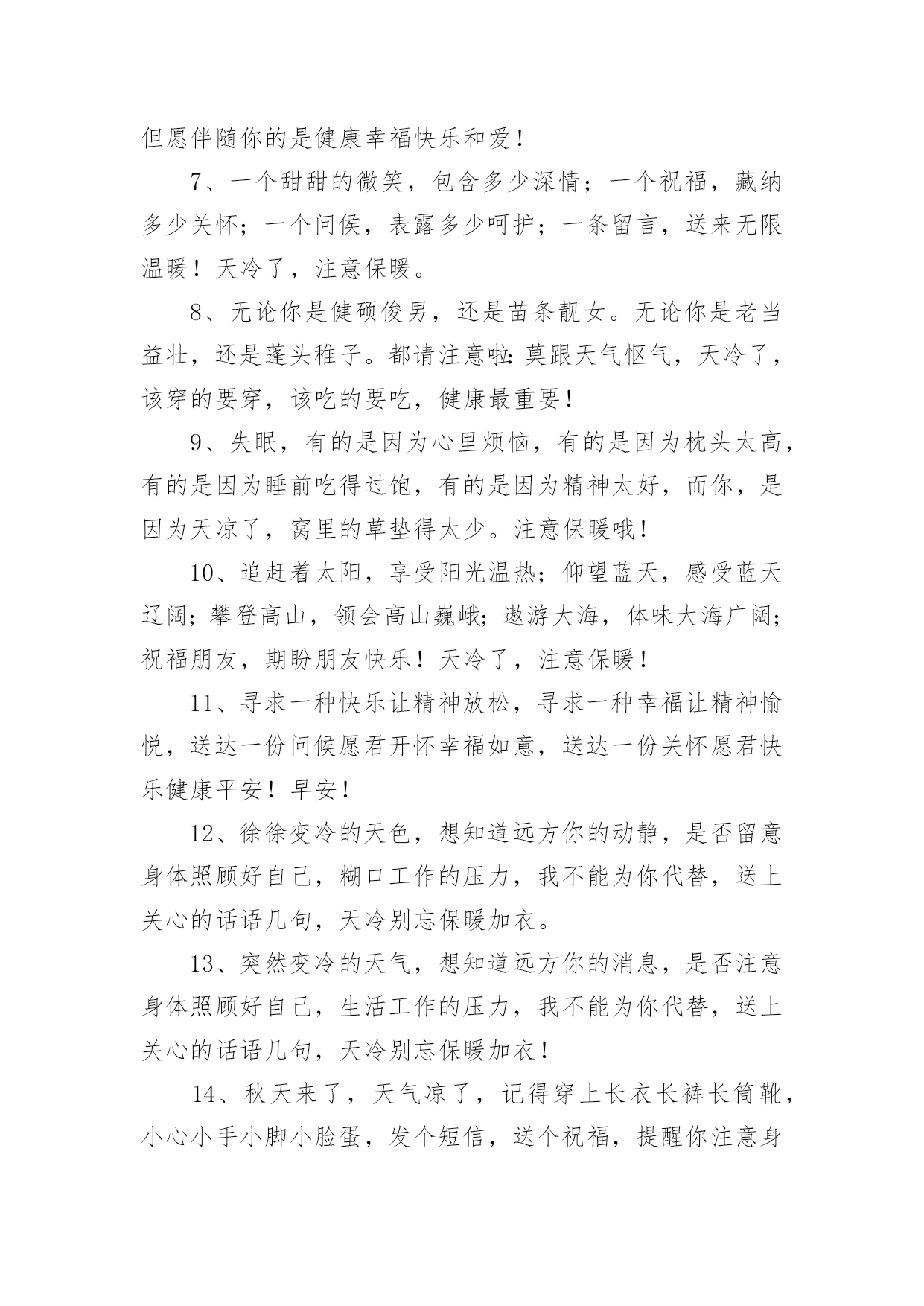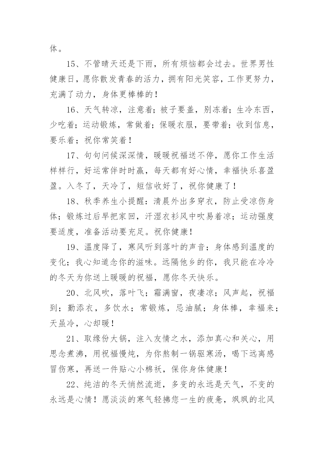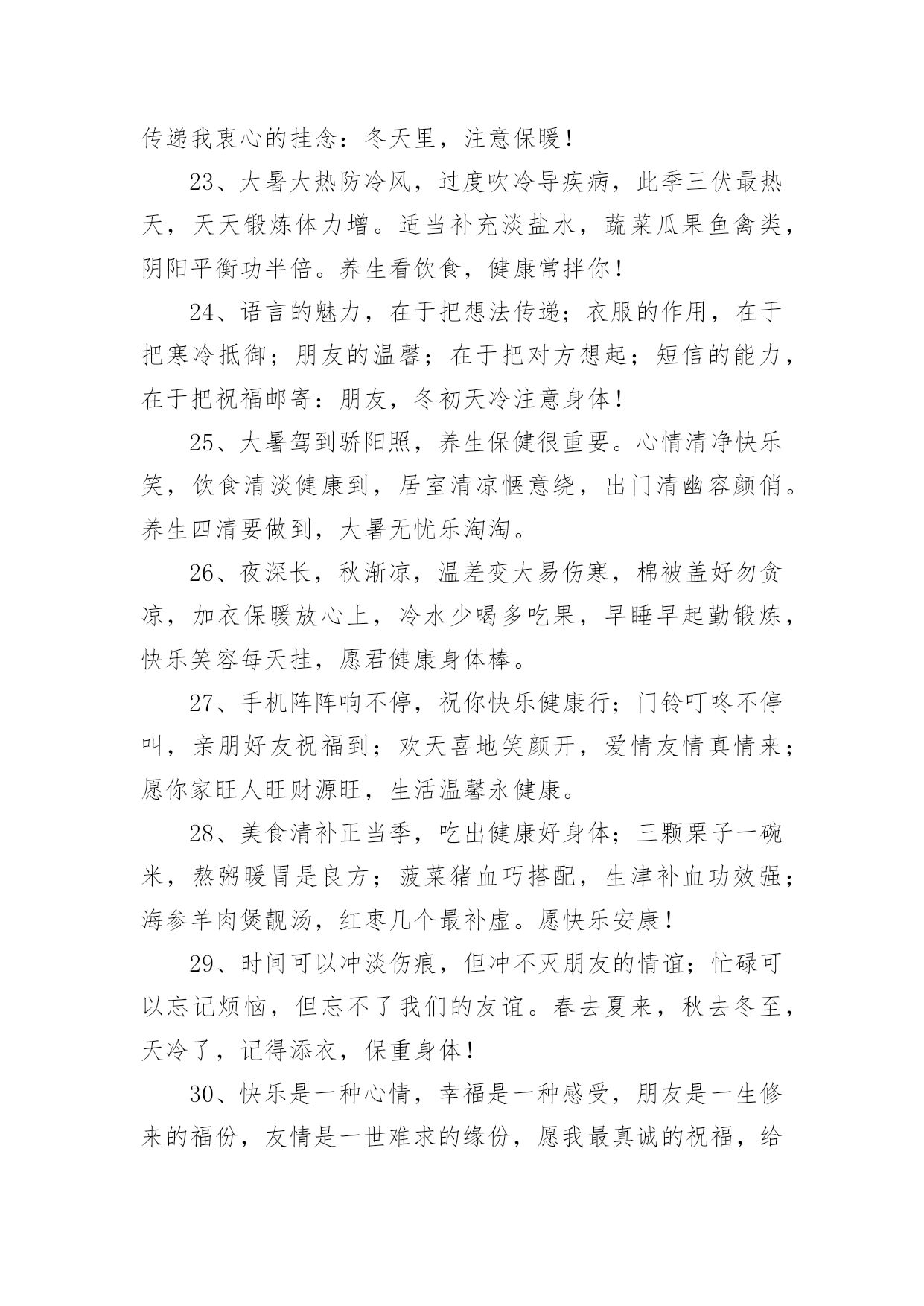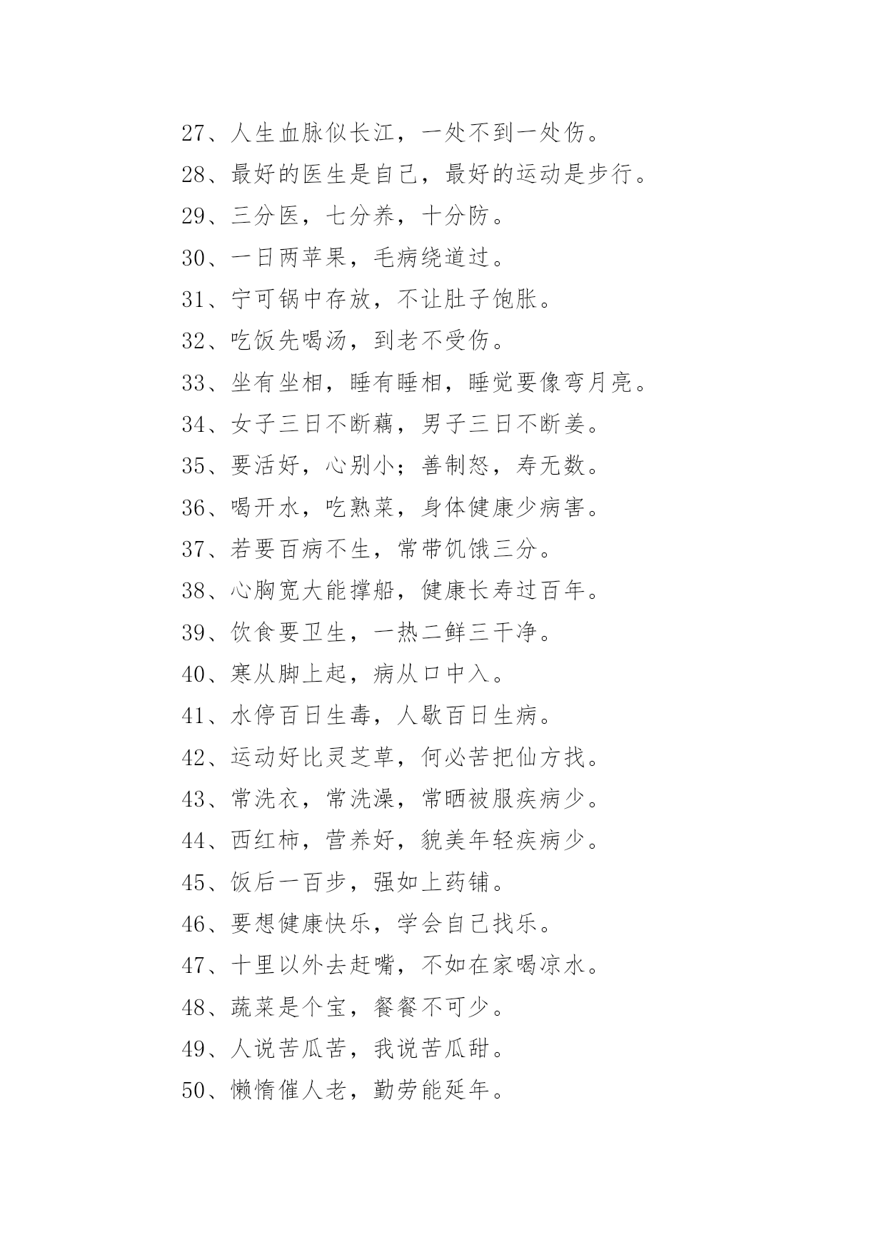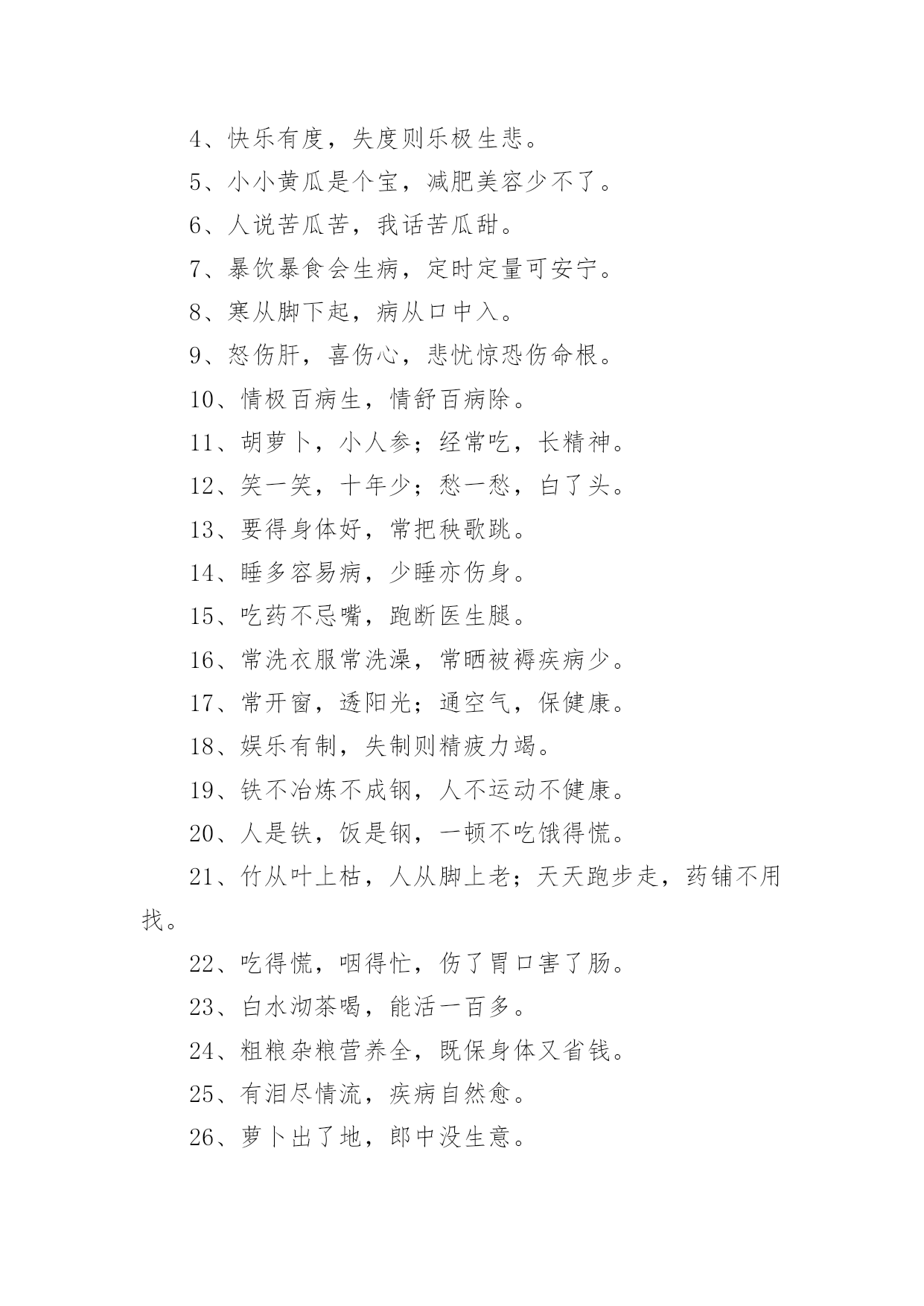 健康快乐的经典句子在平平淡淡的日常中,大家对句子都再熟悉不过了吧,不同的句子在语言环境中的意义和作用大有不同。究竟什么样的句子才是好的句子呢?下面是小编整理的健康快乐的经典句子,欢迎大家分享。健康快乐的经典句子11、愿身边所有爱你的人和你爱的人平安,用我们的信念战胜灾难,用我们的爱感动上天,请把这祝福发给你的朋友,你们都会健康、幸福、平安!2、愿健康快乐像阳光普照大地般环绕在你身边,愿幸运幸福像春雨滋润万物般飘洒在你左右。3、有空的话多约几个朋友一起喝喝茶叙叙旧,没空的时候自己打盆热水好好烫烫脚。钱是赚不完的,但是健康是自己的。好好呵护自己,否则没人爱你。4、淡淡的一个微笑消散烦忧,柔柔的一缕微风抚平烦躁,轻轻的一声问候温暖心田,深深的一句祝福满含真诚,愿你快乐健康,愿你幸福平安!5、一个人,有至纯的灵魂,原本就是一件憾人心魄的深刻,这样的简单,让人敬仰,让我们在雪灾、地震、洪水后,更加珍惜健康和生命。6、想想父母,吃药不苦;想想亲朋,打针不痛;想想自己美好的爱情、友情,病就会好啦!你的病痛,也同样引着我的心痛,快点好吧!7、希望你工作不累,每日轻松面对,成绩滴水穿石,奖金随时都给,凡事都有好运,朋友真情可贵,就算平平淡淡,健康快乐常随,朋友,你我的真情,值得回味!8、我总把友情分成两半,一半给你。我总把思念延长,一端系着你,我总把快乐保存,等着与你分享,我总是把健康珍爱,也希望你拥有幸福,快乐和健康!9、听说最近健康对你倍加关心,疾病对你不闻不问;桃花把你紧紧围困,失恋被你关了监禁;钞票与你私定终身,穷困从此渺无音讯。你小子还真是顺啊!10、送一枚健康戒指,牢牢扣住你;送你一串平安项链,天天围住你;送你一对快乐手镯,紧紧套住你。对你好吧,让你披金戴银,那就天天好心情吧!11、送你一付妙方:宽容一钱,开朗二两,一把洒脱,一粒开心,一副笑脸,放进生活的大锅中每天煎煮,取积极进取的清水送服,保你身体健康,心情愉快。12、送你一幅画,以健康做底色,用事业来勾勒轮廓,用幸福来描绘线条,用许多快乐为它着色,用浪漫为它装裱,用情趣为它作画框,我希望它永远都挂在你心房的墙壁上!13、适当的运动所起的作用,几乎可以代替一切药物,但世界上任何药品却都不能代替运动的作用。生命在于运动。14、时间把青春带走,却带不走我一点一滴的思念。岁月把热情带走,却带不走我日日夜夜的祝福,愿好运陪伴你日出日落,健康陪伴你朝朝暮暮!15、如果我有翅膀,我就飞去看你!我有翅膀吗?没有!所以我现在不能去看你!但是我可以为你祈祷祝福,保佑你平平安安,健康永远!16、人生不过几十年,成败荣辱都在天。是非恩怨莫在意健康快乐最值钱。自古人间苦乐伴,看得高远境如仙。愿你不为凡事烦,轻松快乐每一天。17、你的康复,就是我们的幸福;你的安康,就是我们的平安。真心真意的祝福,不是需要千言万语。一首心曲,愿你岁岁平安!愿早日康复,开心无限!18、命运瞬息万变,好运天天陪伴,健康多多锻炼,养成幸福习惯,适当回个短信,向我报个平安,有钱也要正直,梦想才会实现。朋友,祝你好运!19、精神畅快,心气平和。饮食有节,寒暖当心。起居心时,劳逸均匀。散步能促进我的思想。我的身体必须不断运动,脑力才会开动起来。以自然之道,养自然之身。久卧伤气,久坐伤肉。20、健康问候:少吃盐多吃醋;少吃肉多吃素;少吃糖多水果;少坐车多步行;少生气多微笑;少忧伤多睡觉;愿你:快乐像阳光普照,幸福像微风围绕!健康快乐的经典句子21、多吃芹菜不用问,降低血压喊得应。2、千金难买老来瘦;有钱莫买少年肥。3、一日两个苹果,毛病绕道走。4、快乐有度,失度则乐极生悲。5、小小黄瓜是个宝,减肥美容少不了。6、人说苦瓜苦,我话苦瓜甜。7、暴饮暴食会生病,定时定量可安宁。8、寒从脚下起,病从口中入。9、怒伤肝,喜伤心,悲忧惊恐伤命根。10、情极百病生,情舒百病除。11、胡萝卜,小人参;经常吃,长精神。12、笑一笑,十年少;愁一愁,白了头。13、要得身体好,常把秧歌跳。14、睡多容易病,少睡亦伤身。15、吃药不忌嘴,跑断医生腿。16、常洗衣服常洗澡,常晒被褥疾病少。17、常开窗,透阳光;通空气,保健康。18、娱乐有制,失制则精疲力竭。19、铁不冶炼不成钢,人不运动不健康。20、人是铁,饭是钢,一顿不吃饿得慌。21、竹从叶上枯,人从脚上老;天天跑步走,药铺不用找。22、吃得慌,咽得忙,伤了胃口害了肠。23、白水沏茶喝,能活一百多。24、粗粮杂粮营养全,既保身体又省钱。25、有泪尽情流,疾病自然愈。26、萝卜出了地,郎中没生意。27、人生血脉似长江,一处不到一处伤。28、最好的医生是自己,最好的运动是步行。29、三分医,七分养,十分防。30、一日两苹果,毛病绕道过。31、宁可锅中存放,不让肚子饱胀。32、吃饭先喝汤,到老不受伤。33、坐有