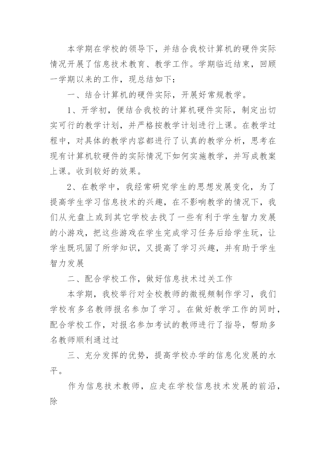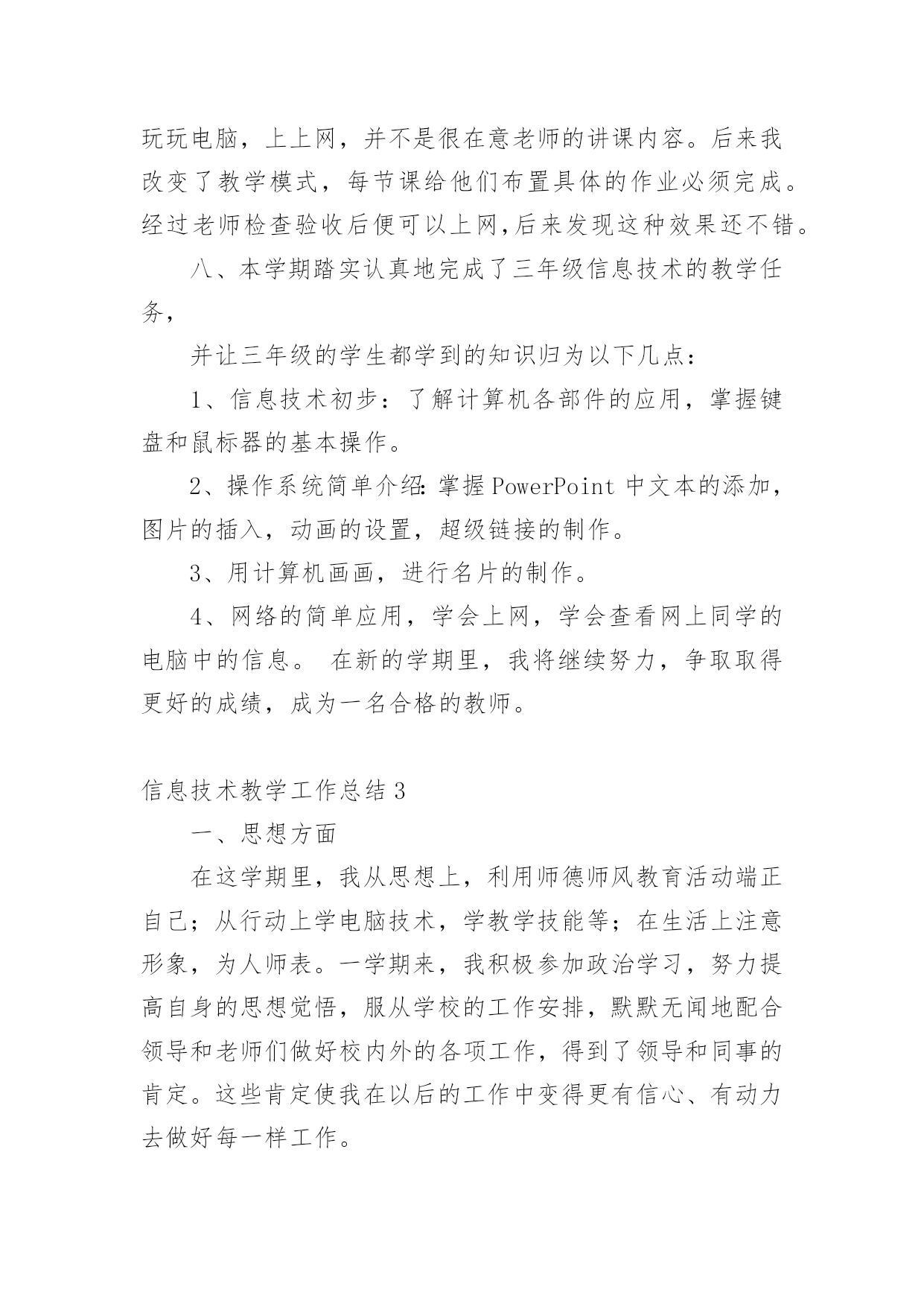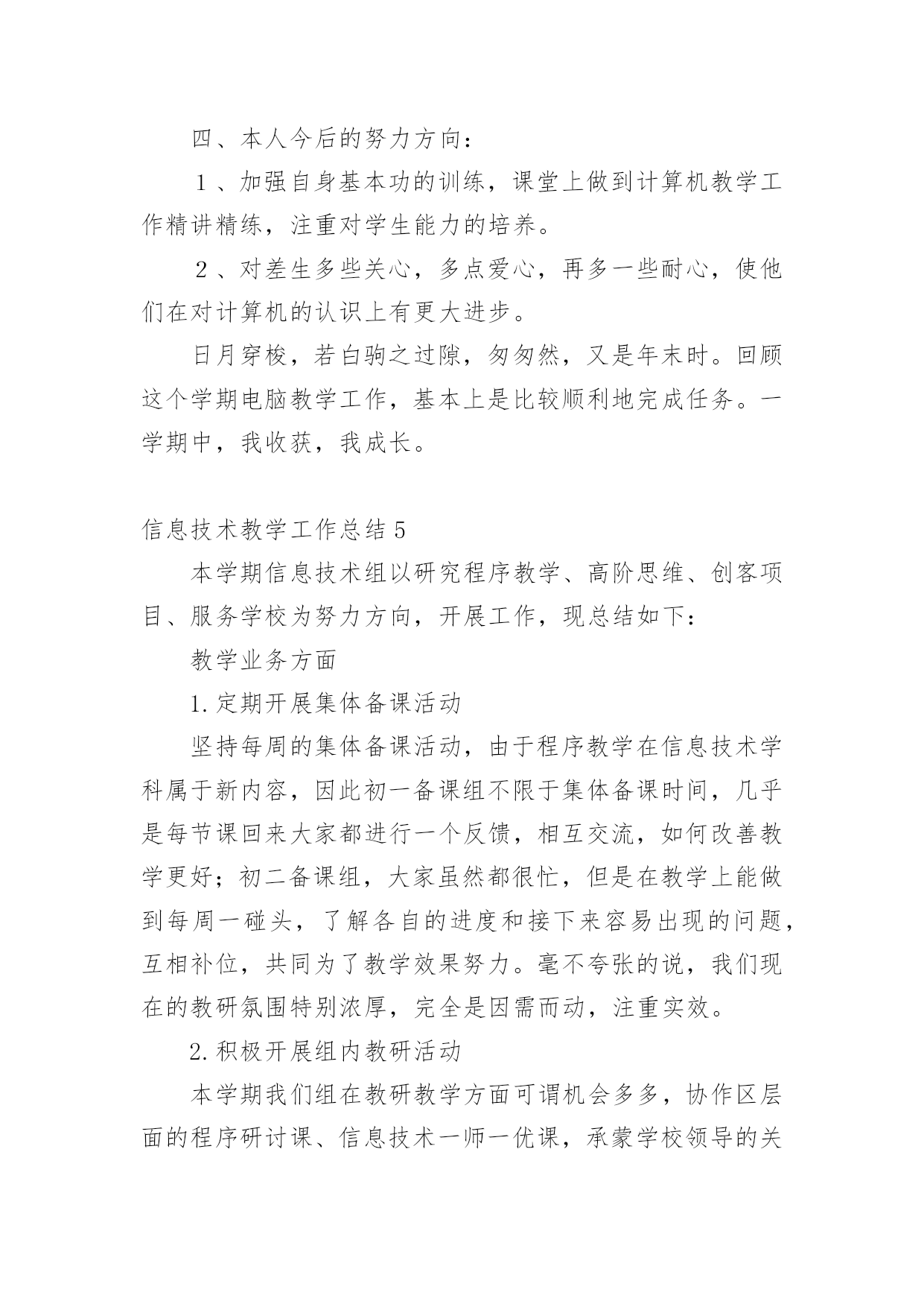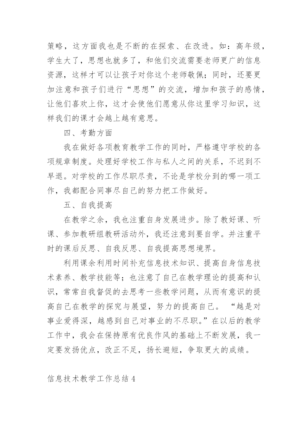 信息技术教学工作总结信息技术教学工作总结15篇总结是对某一特定时间段内的学习和工作生活等表现情况加以回顾和分析的一种书面材料,它可以给我们下一阶段的学习和工作生活做指导,不如静下心来好好写写总结吧。总结怎么写才能发挥它的作用呢?下面是小编精心整理的信息技术教学工作总结,欢迎大家分享。信息技术教学工作总结1第一学期即将结束,有辛勤的耕耘,有收获的喜悦,也有不足与遗憾,按照教学计划和教学纲要的要求,已经如期地完成了教学任务.现总结如下:一、思想认识思想上严于律己,热爱党的教育事业。一直来,努力提高自己的教学水平。服从学校的工作安排,做好各项工作。二、教学方面1、备课根据学校要求,认真写好教学计划,提前备好课,写好教案。平时做到周前备课。备课时认真钻研教材,虚心向老教师学习、请教。力求吃透教材,找准重点、难点,寻找适合学生的教学方法。我特别注意做好以下几点:1.以情景教学引入课堂教学,激发学生学习兴趣。2.及时总结课堂上的不足,不断改进教学模式。2、上课由于本学科大多都要上机完成,每节都要认真做好上机备课,检查机器状态,有无“不可用机器”,从学生的实际出发,注意调动学生学习的积极性和创造性思维。在学生完成上机任务时,在各台计算机前巡视,注意对学困生进行手把手的辅导,课后及时做课后记,找出不足。三、个人学习:积极学习各种理论,以充实自己,以便在工作中以坚实的理论作为指导,更好地进行教育教学。我还利用业余时间认真学习网络知识,同时负责本学期微机室的日常管理工作。四、考勤方面严格遵守学校的各项规章制度,不迟到、不早退。在工作中,尊敬领导、团结同事,能正确处理好与领导同事之间的关系。平时任劳任怨、对人真诚、热爱学生、人际关系和谐融洽,时刻以一名人民教师的要求来规范自己的言行,毫不松懈地培养自己的综合素质和能力。五、努力方向:1.加强自身基本功的训练,注重对学生能力的培养。2.对差生多些关心,多点爱心,再多一些耐心,使他们在对计算机的认识上有更大进步。3.加强机房纪律和机器使用道德方面的教育,使学生不仅在班级集中注意力学习,在机房上机时也要按规定严格约束自己。4.利用各种方法,训练学生提高、集中注意力。教书育人是塑造灵魂的综合性艺术。在课程改革推进的今天,社会对教师的素质要求更高,在今后的教育教学工作中,我将立足实际,认真分析和研究好教材、大纲,使信息技术课的工作有所开拓,有所进取,更加严格要求自己,努力工作,我将继续努力,争取取得更好的成绩,成为一名合格的教师。信息技术教学工作总结2时间过的飞快,转眼间一个学期过去了,回顾这个学期所从事的信息技术教学工作,基本上是比较顺利地完成任务。我从各方面严格要求自己,积极向老教师请教,结合本校的实际条件和学生的实际情况,勤勤恳恳,兢兢业业,使教学工作有计划,有组织,有步骤地开展。立足现在,放眼未来,为使今后的工作取得更大的进步,现对本学期教学工作作出总结,希望能发扬优点,克服不足,总结检验教训,继往开来,以促进教训工作更上一层楼。一、认真备课不但备学生而且备教材备教法,根据教材内容及学生的实际,设计课的类型,拟定采用的教学方法,并对教学过程的程序及时间安排都作了详细的记录,认真写好教案。每一课都做到“有备而来”,每堂课都在课前做好充分的准备,我还要查阅各种资料,能上因特网时还上网寻找好的教学材料,教学课件,把它们和我所从事的工作结合起来,为我所用。二、增强上课技能提高教学质量,使讲解清晰化,条理化,准确化,条理化,准确化,情感化,生动化,做到线索清晰,层次分明,言简意赅,深入浅出。在课堂上特别注意调动学生的积极性,加强师生交流,充分体现学生的主作用,让学生学得容易,学得轻松,学得愉快;注意精讲精练,在课堂上老师讲得尽量少,学生动口动手动脑尽量多;同时在每一堂课上都充分考虑每一个层次的学生学习需求和学习能力,让各个层次的学生都得到提高。三、虚心请教其他老师在教学上,有疑必问。在各个章节的学习上都积极征求其他老师的意见,学习他们的方法,同时,多听老师的课,做到边听边讲,学习别人的优点,克服自己的不足,并常常邀请其他老师来听课,征求他们的意见,改进工作。四、当堂点评学生作业根据我们学部的打造博文课堂新模式的要求,对于每节课,要坚决实行堂堂清,对于电脑课这样注重实际操作的课程就具有更重要的意义,所以我一直坚决执行着,而且当堂对每个完成作业的同学随堂点评,使学生能更好的学好知识,使学习效率也大大提高了。五、做好课后辅导工作注意分层教学。在课后,为不同层次的学生进行相应的辅导,以满足不同层次的学生的需求,避免了一刀切的弊端,同时加大了后进生的辅导力度。对后进生的辅导,并不限于学习知识性的辅导,更重要的是学习思想的辅导,要提高后进生的成绩,首先要解决他们心结,让他们意识到学习的重要性和必要性,使之对学习萌发兴趣
