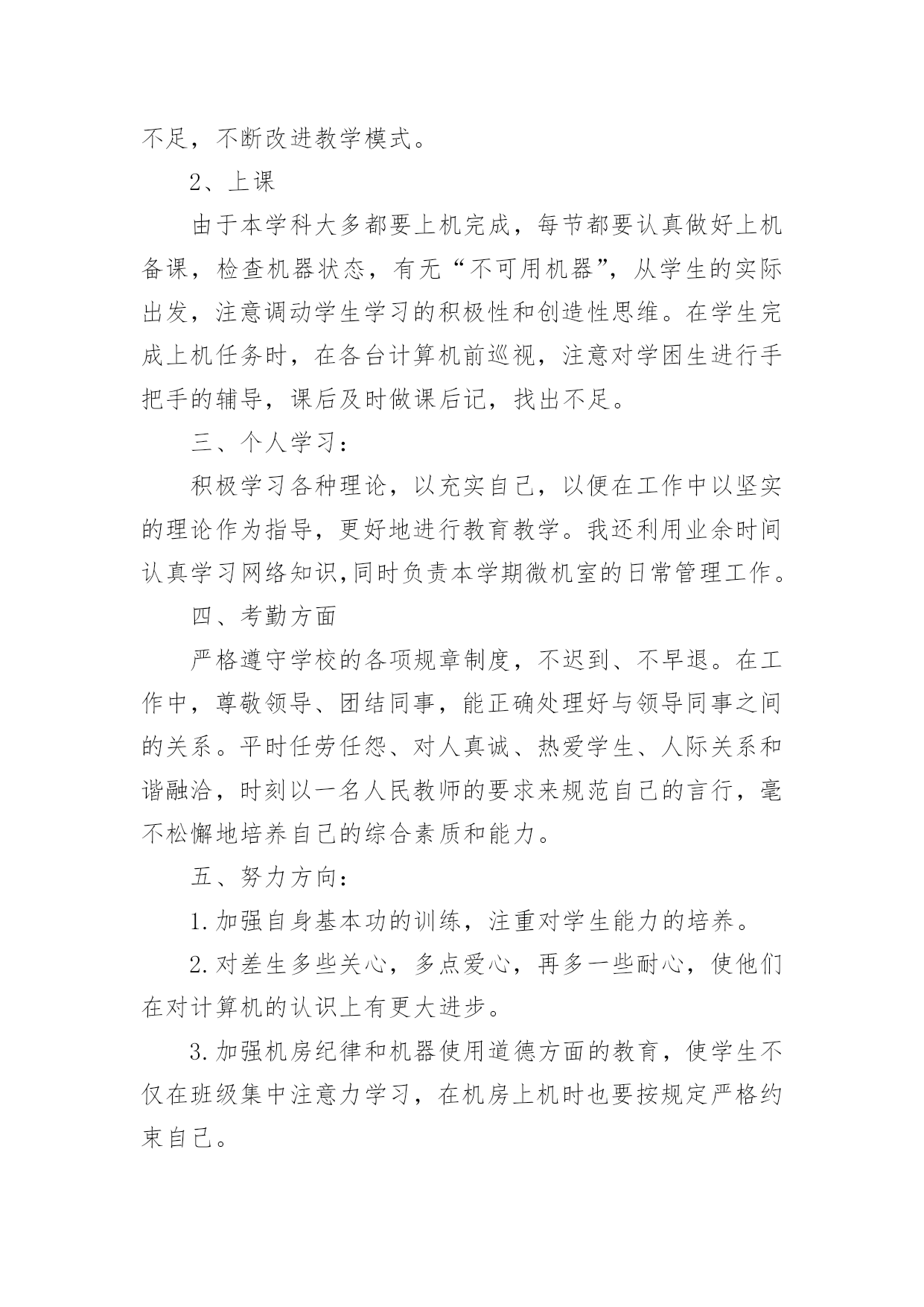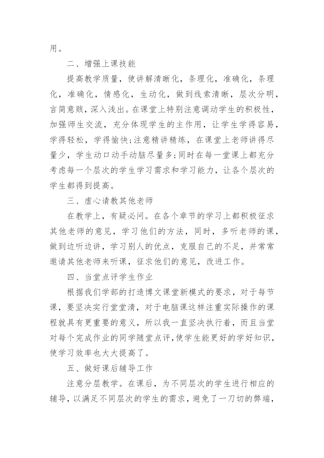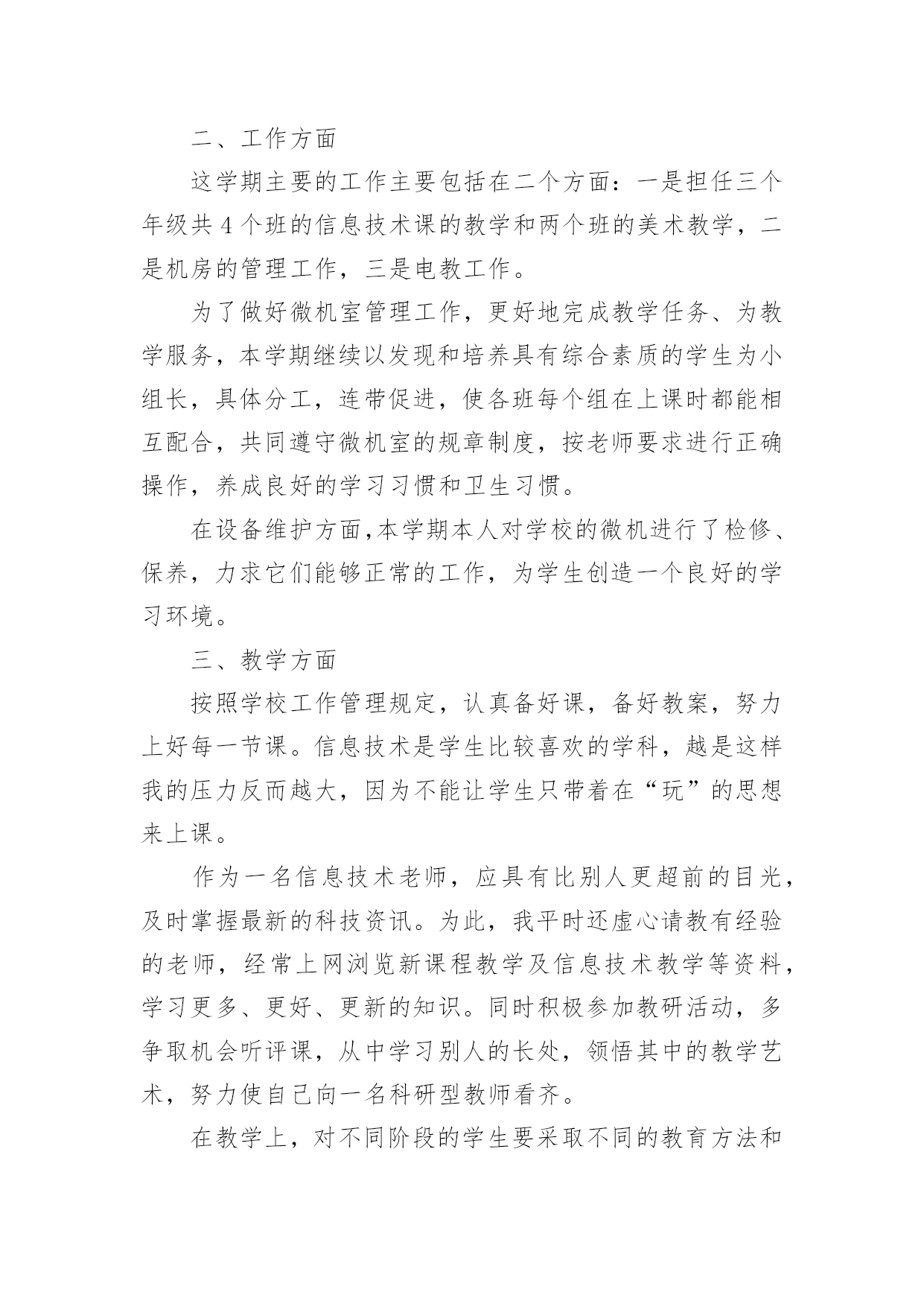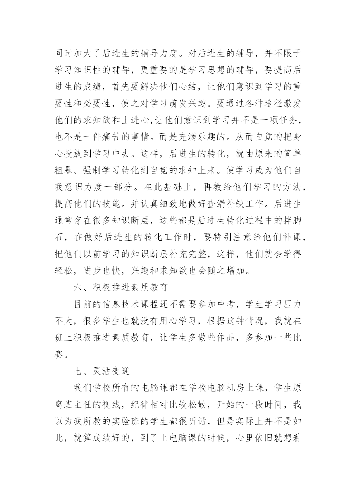 信息技术教学工作总结信息技术教学工作总结15篇总结是对某一特定时间段内的学习和工作生活等表现情况加以回顾和分析的一种书面材料,它可以给我们下一阶段的学习和工作生活做指导,不如静下心来好好写写总结吧。总结怎么写才能发挥它的作用呢?下面是小编精心整理的信息技术教学工作总结,欢迎大家分享。信息技术教学工作总结1第一学期即将结束,有辛勤的耕耘,有收获的喜悦,也有不足与遗憾,按照教学计划和教学纲要的要求,已经如期地完成了教学任务.现总结如下:一、思想认识思想上严于律己,热爱党的教育事业。一直来,努力提高自己的教学水平。服从学校的工作安排,做好各项工作。二、教学方面1、备课根据学校要求,认真写好教学计划,提前备好课,写好教案。平时做到周前备课。备课时认真钻研教材,虚心向老教师学习、请教。力求吃透教材,找准重点、难点,寻找适合学生的教学方法。我特别注意做好以下几点:1.以情景教学引入课堂教学,激发学生学习兴趣。2.及时总结课堂上的不足,不断改进教学模式。2、上课由于本学科大多都要上机完成,每节都要认真做好上机备课,检查机器状态,有无“不可用机器”,从学生的实际出发,注意调动学生学习的积极性和创造性思维。在学生完成上机任务时,在各台计算机前巡视,注意对学困生进行手把手的辅导,课后及时做课后记,找出不足。三、个人学习:积极学习各种理论,以充实自己,以便在工作中以坚实的理论作为指导,更好地进行教育教学。我还利用业余时间认真学习网络知识,同时负责本学期微机室的日常管理工作。四、考勤方面严格遵守学校的各项规章制度,不迟到、不早退。在工作中,尊敬领导、团结同事,能正确处理好与领导同事之间的关系。平时任劳任怨、对人真诚、热爱学生、人际关系和谐融洽,时刻以一名人民教师的要求来规范自己的言行,毫不松懈地培养自己的综合素质和能力。五、努力方向:1.加强自身基本功的训练,注重对学生能力的培养。2.对差生多些关心,多点爱心,再多一些耐心,使他们在对计算机的认识上有更大进步。3.加强机房纪律和机器使用道德方面的教育,使学生不仅在班级集中注意力学习,在机房上机时也要按规定严格约束自己。4.利用各种方法,训练学生提高、集中注意力。教书育人是塑造灵魂的综合性艺术。在课程改革推进的今天,社会对教师的素质要求更高,在今后的教育教学工作中,我将立足实际,认真分析和研究好教材、大纲,使信息技术课的工作有所开拓,有所进取,更加严格要求自己,努力工作,我将继续努力,争取取得更好的成绩,成为一名合格的教师。信息技术教学工作总结2时间过的飞快,转眼间一个学期过去了,回顾这个学期所从事的信息技术教学工作,基本上是比较顺利地完成任务。我从各方面严格要求自己,积极向老教师请教,结合本校的实际条件和学生的实际情况,勤勤恳恳,兢兢业业,使教学工作有计划,有组织,有步骤地开展。立足现在,放眼未来,为使今后的工作取得更大的进步,现对本学期教学工作作出总结,希望能发扬优点,克服不足,总结检验教训,继往开来,以促进教训工作更上一层楼。一、认真备课不但备学生而且备教材备教法,根据教材内容及学生的实际,设计课的类型,拟定采用的教学方法,并对教学过程的程序及时间安排都作了详细的记录,认真写好教案。每一课都做到“有备而来”,每堂课都在课前做好充分的准备,我还要查阅各种资料,能上因特网时还上网寻找好的教学材料,教学课件,把它们和我所从事的工作结合起来,为我所用。二、增强上课技能提高教学质量,使讲解清晰化,条理化,准确化,条理化,准确化,情感化,生动化,做到线索清晰,层次分明,言简意赅,深入浅出。在课堂上特别注意调动学生的积极性,加强师生交流,充分体现学生的主作用,让学生学得容易,学得轻松,学得愉快;注意精讲精练,在课堂上老师讲得尽量少,学生动口动手动脑尽量多;同时在每一堂课上都充分考虑每一个层次的学生学习需求和学习能力,让各个层次的学生都得到提高。三、虚心请教其他老师在教学上,有疑必问。在各个章节的学习上都积极征求其他老师的意见,学习他们的方法,同时,多听老师的课,做到边听边讲,学习别人的优点,克服自己的不足,并常常邀请其他老师来听课,征求他们的意见,改进工作。四、当堂点评学生作业根据我们学部的打造博文课堂新模式的要求,对于每节课,要坚决实行堂堂清,对于电脑课这样注重实际操作的课程就具有更重要的意义,所以我一直坚决执行着,而且当堂对每个完成作业的同学随堂点评,使学生能更好的学好知识,使学习效率也大大提高了。五、做好课后辅导工作注意分层教学。在课后,为不同层次的学生进行相应的辅导,以满足不同层次的学生的需求,避免了一刀切的弊端,同时加大了后进生的辅导力度。对后进生的辅导,并不限于学习知识性的辅导,更重要的是学习思想的辅导,要提高后进生的成绩,首先要解决他们心结,让他们意识到学习的重要性和必要性,使之对学习萌发兴趣