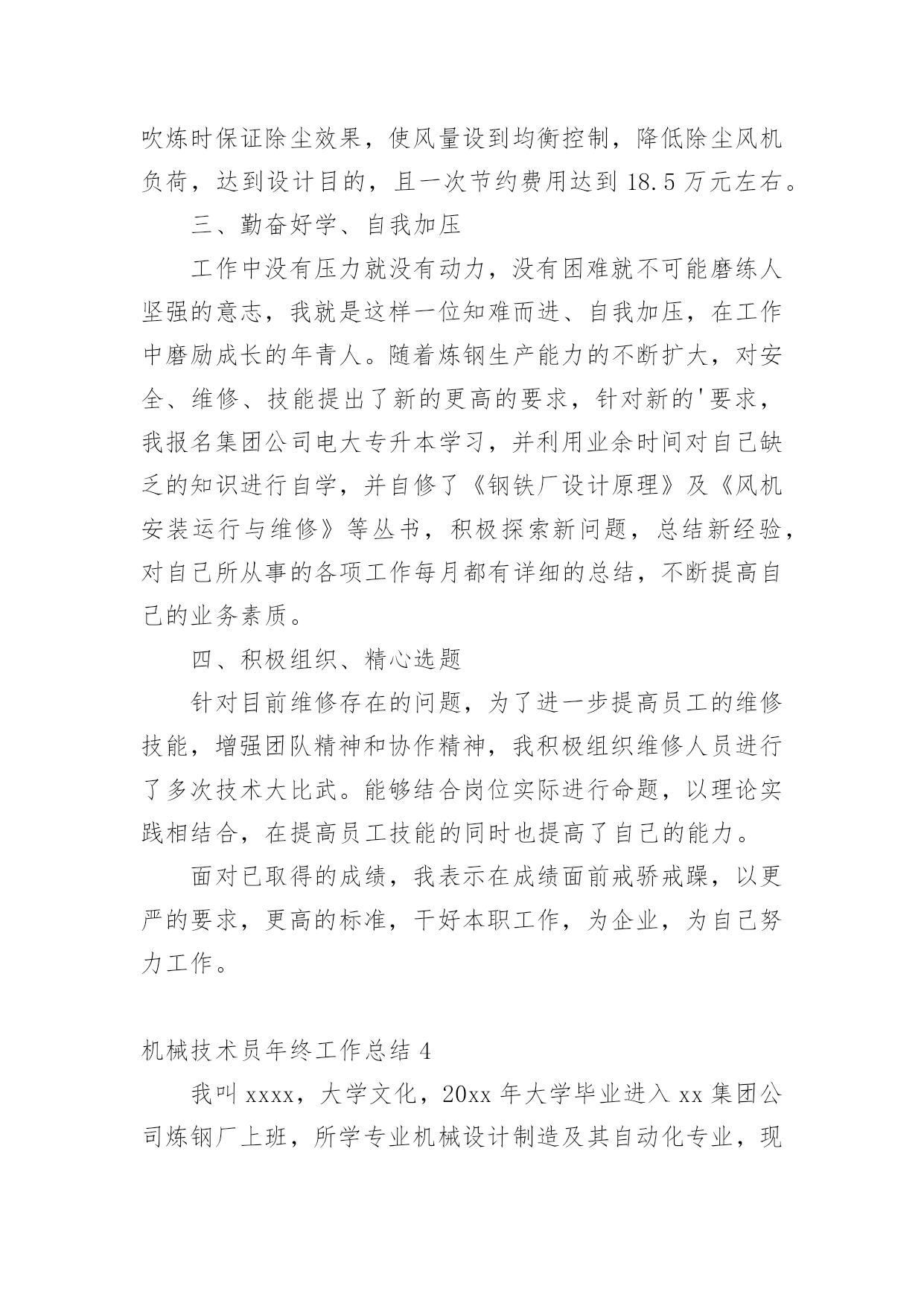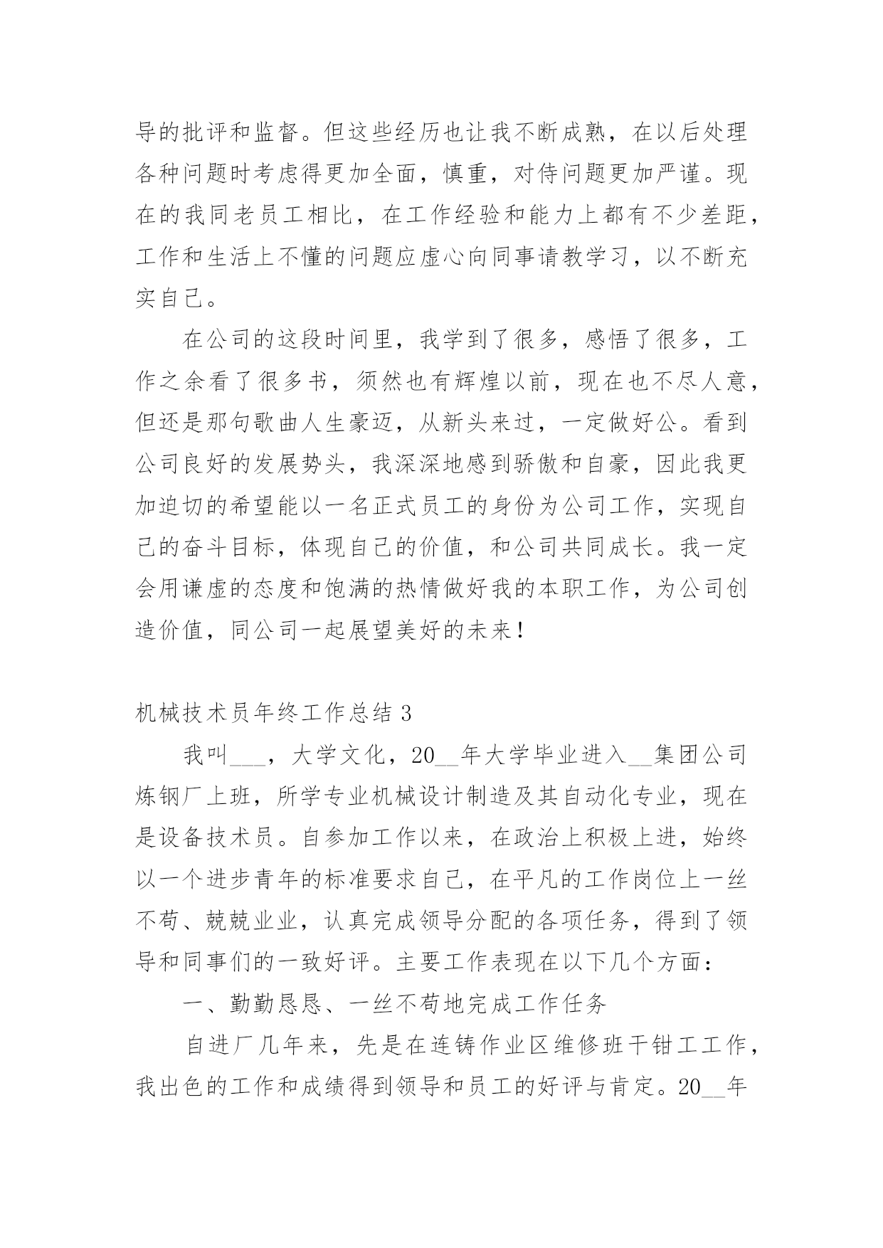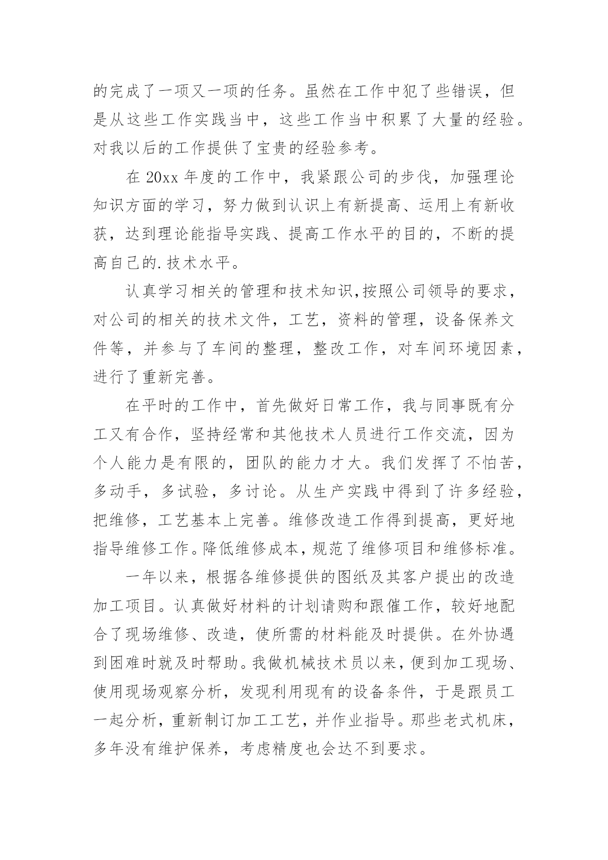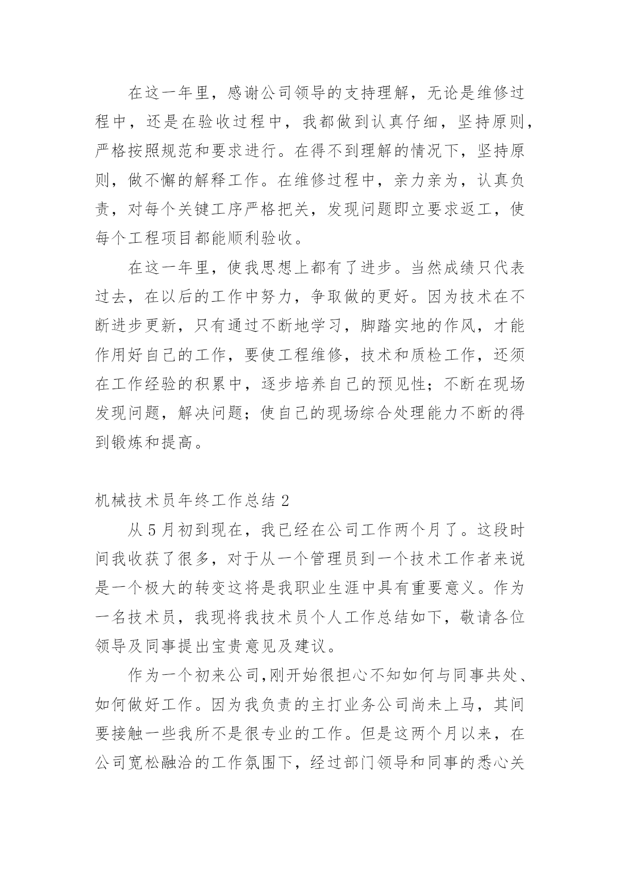 机械技术员年终工作总结机械技术员年终工作总结8篇总结是对某一特定时间段内的学习和工作生活等表现情况加以回顾和分析的一种书面材料,它可使零星的、肤浅的、表面的感性认知上升到全面的、系统的、本质的理性认识上来,不如静下心来好好写写总结吧。但是总结有什么要求呢?以下是小编精心整理的机械技术员年终工作总结,仅供参考,希望能够帮助到大家。机械技术员年终工作总结120xx年即将结束。这一年是不平凡进出,对公司来说也是不平凡的一年,也是我个人专业技能进步的一年。在这一年之中作为一名技术员,在公司领导和工友们的关心和支持下,为公司做出了应有的贡献,也有许多做得不足的一面。工作总结如下:作为一名x月份进厂的员工,得到公司的领导都非常的信任我,支持我,给与我这个空间。20xx年我主要负责加工工艺及外部维修相关技术工作。包括新图纸的画图、审核、工艺、产品的难度加工,维修的一线操作、现场的技术指导,有时材料零件的准备,零部件的请购等。面对在理论和生产实践中遇到难解决的技术工作。我和全体同事以及生产工人一起共同探讨,在工作中找方法,从资料中找答案,以慎重的完成了一项又一项的任务。虽然在工作中犯了些错误,但是从这些工作实践当中,这些工作当中积累了大量的经验。对我以后的工作提供了宝贵的经验参考。在20xx年度的工作中,我紧跟公司的步伐,加强理论知识方面的学习,努力做到认识上有新提高、运用上有新收获,达到理论能指导实践、提高工作水平的目的,不断的提高自己的.技术水平。认真学习相关的管理和技术知识,按照公司领导的要求,对公司的相关的技术文件,工艺,资料的管理,设备保养文件等,并参与了车间的整理,整改工作,对车间环境因素,进行了重新完善。在平时的工作中,首先做好日常工作,我与同事既有分工又有合作,坚持经常和其他技术人员进行工作交流,因为个人能力是有限的,团队的能力才大。我们发挥了不怕苦,多动手,多试验,多讨论。从生产实践中得到了许多经验,把维修,工艺基本上完善。维修改造工作得到提高,更好地指导维修工作。降低维修成本,规范了维修项目和维修标准。一年以来,根据各维修提供的图纸及其客户提出的改造加工项目。认真做好材料的计划请购和跟催工作,较好地配合了现场维修、改造,使所需的材料能及时提供。在外协遇到困难时就及时帮助。我做机械技术员以来,便到加工现场、使用现场观察分析,发现利用现有的设备条件,于是跟员工一起分析,重新制订加工工艺,并作业指导。那些老式机床,多年没有维护保养,考虑精度也会达不到要求。在这一年里,感谢公司领导的支持理解,无论是维修过程中,还是在验收过程中,我都做到认真仔细,坚持原则,严格按照规范和要求进行。在得不到理解的情况下,坚持原则,做不懈的解释工作。在维修过程中,亲力亲为,认真负责,对每个关键工序严格把关,发现问题即立要求返工,使每个工程项目都能顺利验收。在这一年里,使我思想上都有了进步。当然成绩只代表过去,在以后的工作中努力,争取做的更好。因为技术在不断进步更新,只有通过不断地学习,脚踏实地的作风,才能作用好自己的工作,要使工程维修,技术和质检工作,还须在工作经验的积累中,逐步培养自己的预见性;不断在现场发现问题,解决问题;使自己的现场综合处理能力不断的得到锻炼和提高。机械技术员年终工作总结2从5月初到现在,我已经在公司工作两个月了。这段时间我收获了很多,对于从一个管理员到一个技术工作者来说是一个极大的转变这将是我职业生涯中具有重要意义。作为一名技术员,我现将我技术员个人工作总结如下,敬请各位领导及同事提出宝贵意见及建议。作为一个初来公司,刚开始很担心不知如何与同事共处、如何做好工作。因为我负责的主打业务公司尚未上马,其间要接触一些我所不是很专业的工作。但是这两个月以来,在公司宽松融洽的工作氛围下,经过部门领导和同事的悉心关怀和耐心指导,我很快的完成了两种工作的相互学习提高,在较短的时间内适应了公司的工作环境,也基本熟悉了部门的工作流程,最重要的是接触和学习了不少的相关业务知识,很好地完成了公司交予的任务,做好了自己的本职工作,使我的工作能力和为人处世方面都取得了不小的进步。在这里对两个月的工作和生活做一下总结,可从中发现自己的缺点和不足,在以后的工作中加以改进,以提高自己的工作水平。5月15日,我正式成为罗仕拿新员工,参加了公司组织的新员工入职培训。通过这次培训,了解了罗仕拿公司的发展历程、企业文化、产业结构和相关制度,学习如何成为一个优秀的技术指导人员。通过几个学时的培训,我感受到公司对每个员工的关怀,感谢公司领导们为帮助新员工走好踏上工作岗位所做的努力。5月份,我参加了公司新产品的开发,我极积配合公司领导和开发工程师们开发改良产品。并多次提住有效的意见并采纳。刚到公司,部门主管JACKY多次指导并给我推荐了大量的相关资料和文档,并指导我尽快