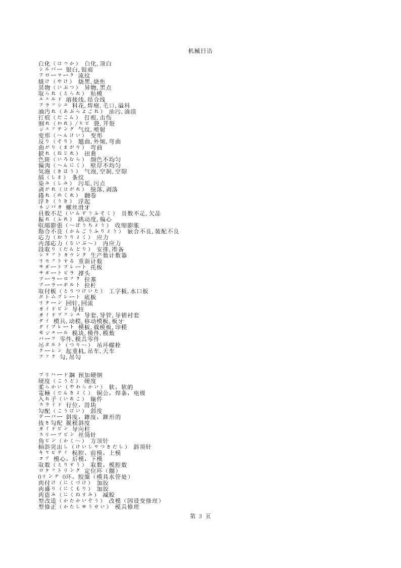 机械日语成形機(せいけいき)注塑机取出し機(とりだしき)机械手,产品取出机乾燥機(かんそうき)干燥箱ホッパードライヤ料(漏)斗干燥器粉砕機(ふんさいき)粉碎机ガス?インジェクション吹气成形,气辅成形機械(きかい)机械,机器スクリュー螺丝,螺杆,螺旋スクリューヘッド螺杆头ジョイント接头,接缝,接合射出(しゃしゅつ)注塑,注射フィーダー送料(加料)器コンパウンド化合物,混炼料ブレンド混合,调合ミキサー混合器,搅拌器ミキシング混合,搅拌冷却(れいきゃく)冷却クーリングタワー冷却塔チラー冷水机,冷水装置温調機(おんちょうき)温调机シリンダー料筒(注塑机)ヒーター加热器,发热器バンドヒーター加热圈,热器带熱電対(ねつでんつい)热电偶ノズル射嘴,喷嘴ノズルヘッド喷嘴头タイバー拉杆,拉扛タイバー間隔(~かんかく)拉杆间隔リミットスイッチ限位(限制)开关操作スイッチ(そうさ~)操作开关操作ガイド操作指南制御盤(せいぎょばん)控制盘,控制器全自動(ぜんじどう)全自动半自動(はん~)半自动手動(しゅどう)手动ハンドル手柄,把手,操纵押出し機(おしだしき)挤塑机,押出机押出し挤塑ブロー成形機吹塑机ブロー成形吹塑シャープ高感度,锋利ソフト低感度パージモード清料方式オープン开放スタンダード标准プログラム制御程序控制プロセス工艺,工序,过程インジェクトバイザー注塑工艺程序控制装置インジェクトロール結晶性高分子(けっしょうせいこうぶんし)结晶性聚合物ポリマー聚合物成形条件(~じょうけん)注塑条件成形サイクル注塑周期精密成形(せいみつ~)精密成形条件出し设定注塑条件金型取付(かながたとりつけ)安装模具,上模型卸(かたおろし)落模,下模圧力(あつりょく)压力低圧(ていあつ)低压低圧型締め(~かたじめ)低压锁模保圧時間(ほあつじかん)保压时间背圧(はいあつ)背压,返压型締力(かたじめりょく)合模力,锁模力型締圧力(~あつりょく)锁模压力型締ストローク合模行程型締装置(~そうち)锁模装置型開き(かたびらき)开模型閉じ合模スピード速度射出スピード射出速度射出量注塑量計量(けいりょう)计量計量ストローク计量行程リブ骨位,筋位,加强筋インサート嵌入,嵌件机械日语肉厚(にくあつ)胶厚,壁厚可塑化(かそか)塑化熱分解(ねつぶんかい)热分解収縮(しゅうしゅく)收缩樹脂(じゅし)树脂原料(げんりょう)原料,材料プラスチック塑料,塑胶制品ラバー橡胶マスターバッチ色母,注胶料パウダー色粉,粉末ドライカラー色粉,干色粉ペレット粒,塑胶粒ガラス繊維(~せんい)玻璃纤维ホース管,软管アニール退火,热处理オーバーパッキング过充填型傷(かたきず)模伤,模痕ショック冲击,打击ダメージ损坏,损伤引け(ひけ)缩水,收缩ショートショット充填不足,欠料バリ毛边,披峰糸バリ(いと~)胶丝コールドスラグ冷料,早凝料コールドスラグウエル冷料井凍結(とうけつ)冷凝油圧(ゆあつ)液压,油压油圧押出(~おしだし)液压顶出,油压脱模油圧ポンプ液压泵油圧モータ液压马达エアコンプレッサー空气压缩机,空压机油漏れ(あぶらもれ)漏油オイルタンク油箱,油槽ピストン活塞エアシリンダー气缸アラーム报警安全ドア(安全~)安全门非常停止(ひじょうていし)紧急停止色変え(いろかえ)换色パージ材(~ざい)清机胶料,过料樹脂温度(じゅしおんど)胶料温度型温(かたおん)模温ヒートアップ升温,升热空打ち(からうち)空打,空射胶試作(しさく)试模離型(りけい)脱模離型剤(りけいざい)脱模剂防錆剤(ぼうせいざい)防锈剂抜けない(ぬけない)粘模,无法脱模ショット注,射,啤,冲击ゲート浇口センターゲート中心浇口スプルーランナー注口,流道料クリアランス间隔,余隔スプルー主流道,注(塑)口エアベント散气孔,通风口ガス抜き排气,散气金型(かながた)模具マシニングセンター加工中心万能フライス盤铣床,锣床旋盤(せんばん)车床平面研削盤(へいめんけんさくばん)平面磨床ボール盤鑽床放電(ほうでん)火花机加工ワイヤーカット线切割窒化鋼(ちっかこう)氮化钢窒素ガス(ちっそ~)氮气窒化処理(ちっかしょり)氮化处理チタン钛熱処理热处理焼入れ(やきいれ)淬火焼戻し(やきもどし)回火アニーリング退火机械日语白化(はっか)白化,顶白シルバー银白,银痕フローマーク流纹焼け(やけ)烧黑,烧焦異物(いぶつ)异物,黑点取られ(とられ)粘模エェルド溶接线,结合线フ